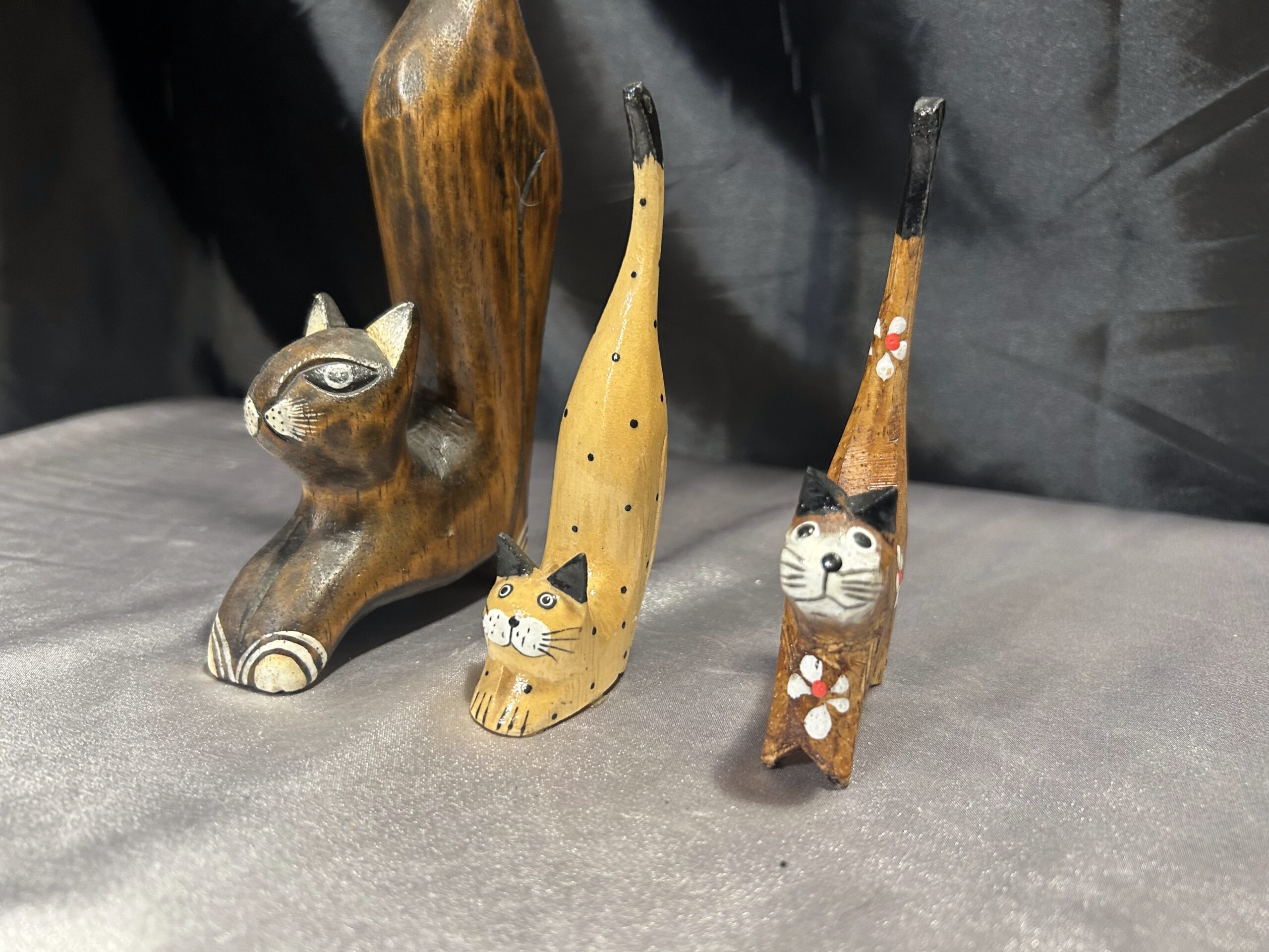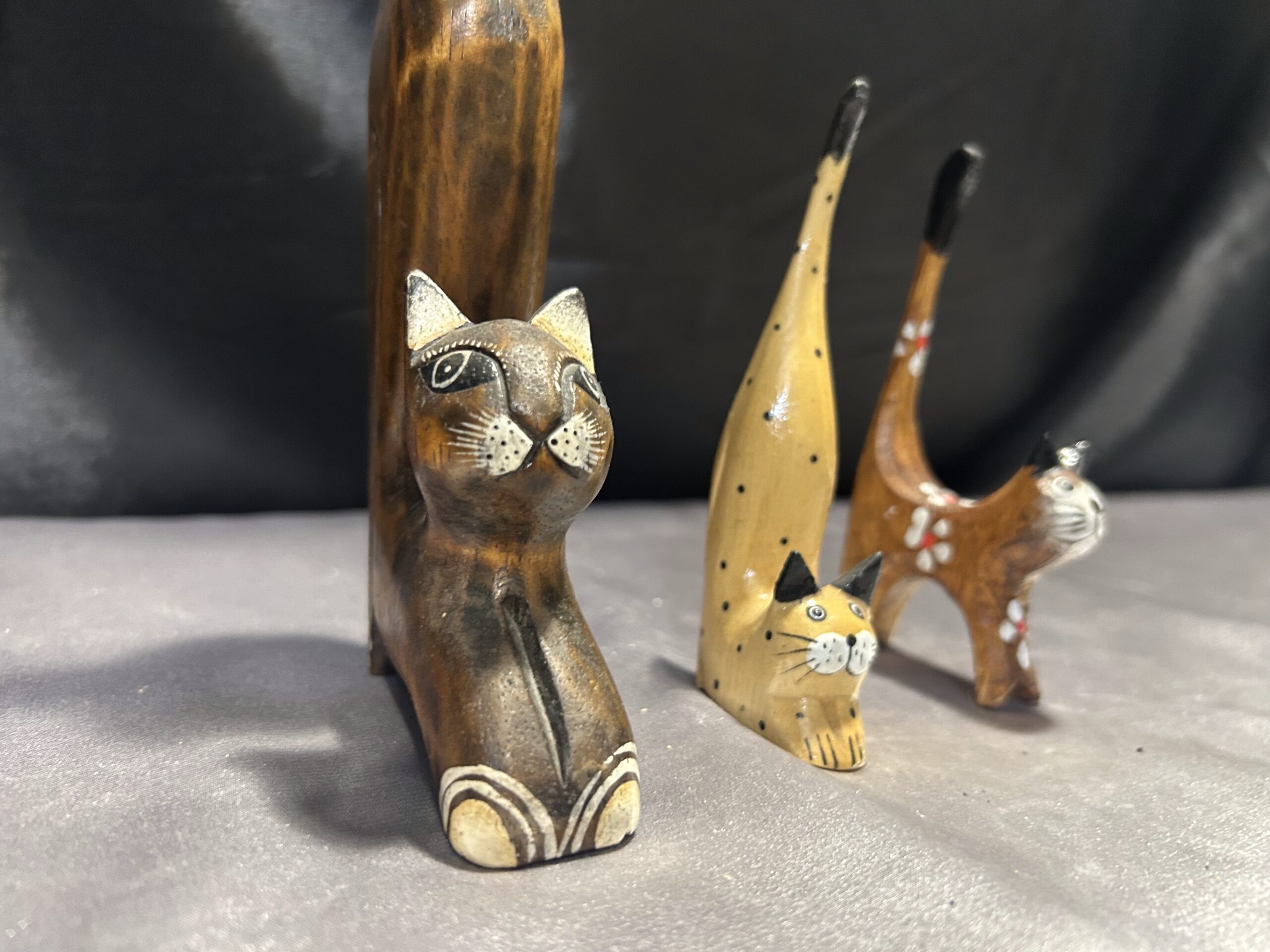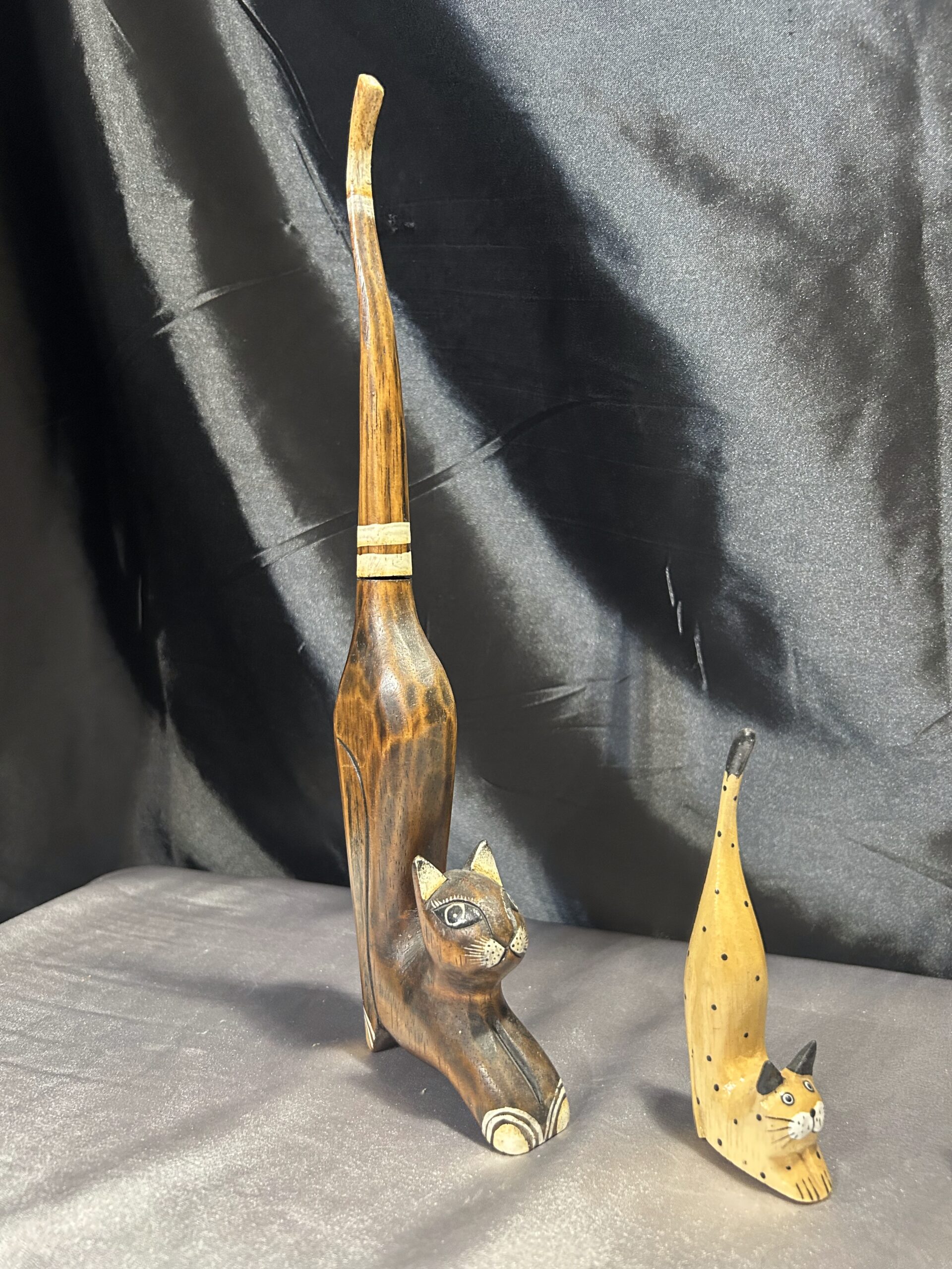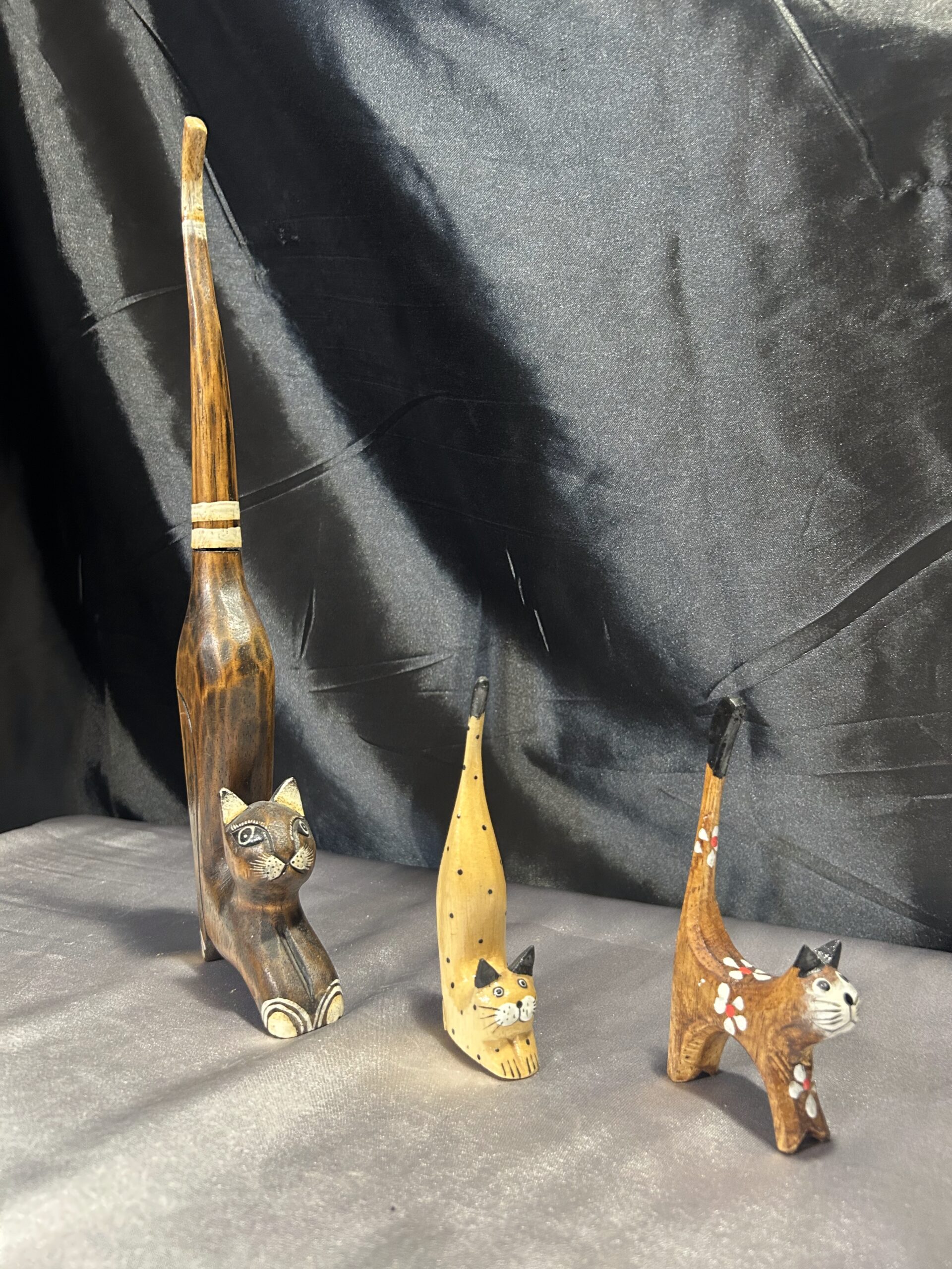 Przedstawiam zestaw trzech drewnianych kotków, wykonanych z lekkiego egzotycznego drewna, które zachwycają elegancją i subtelnym zdobieniem. Każdy z kotków ma długi ogonek skierowany do góry, co nadaje im wyjątkowego uroku i stylu.
