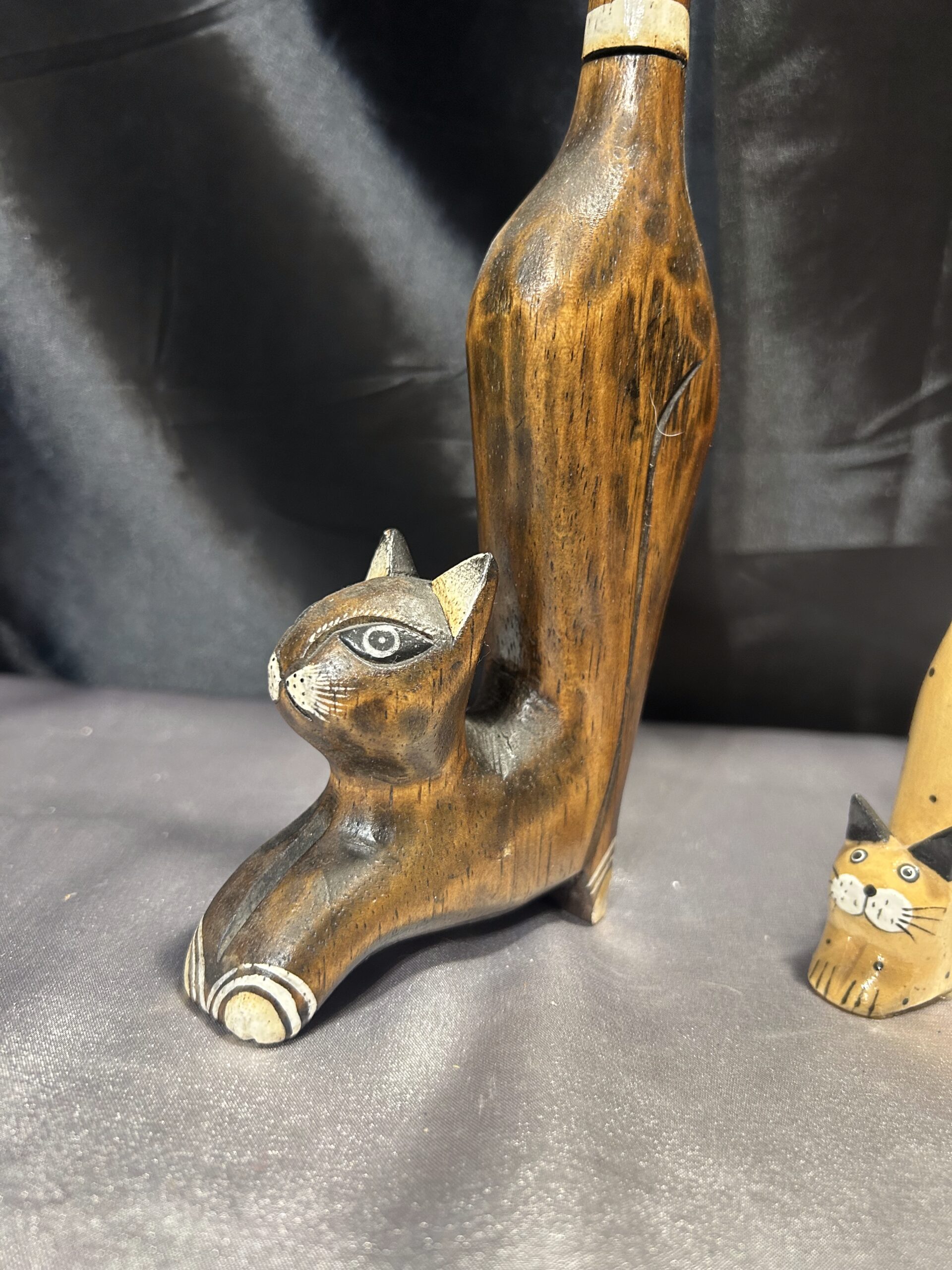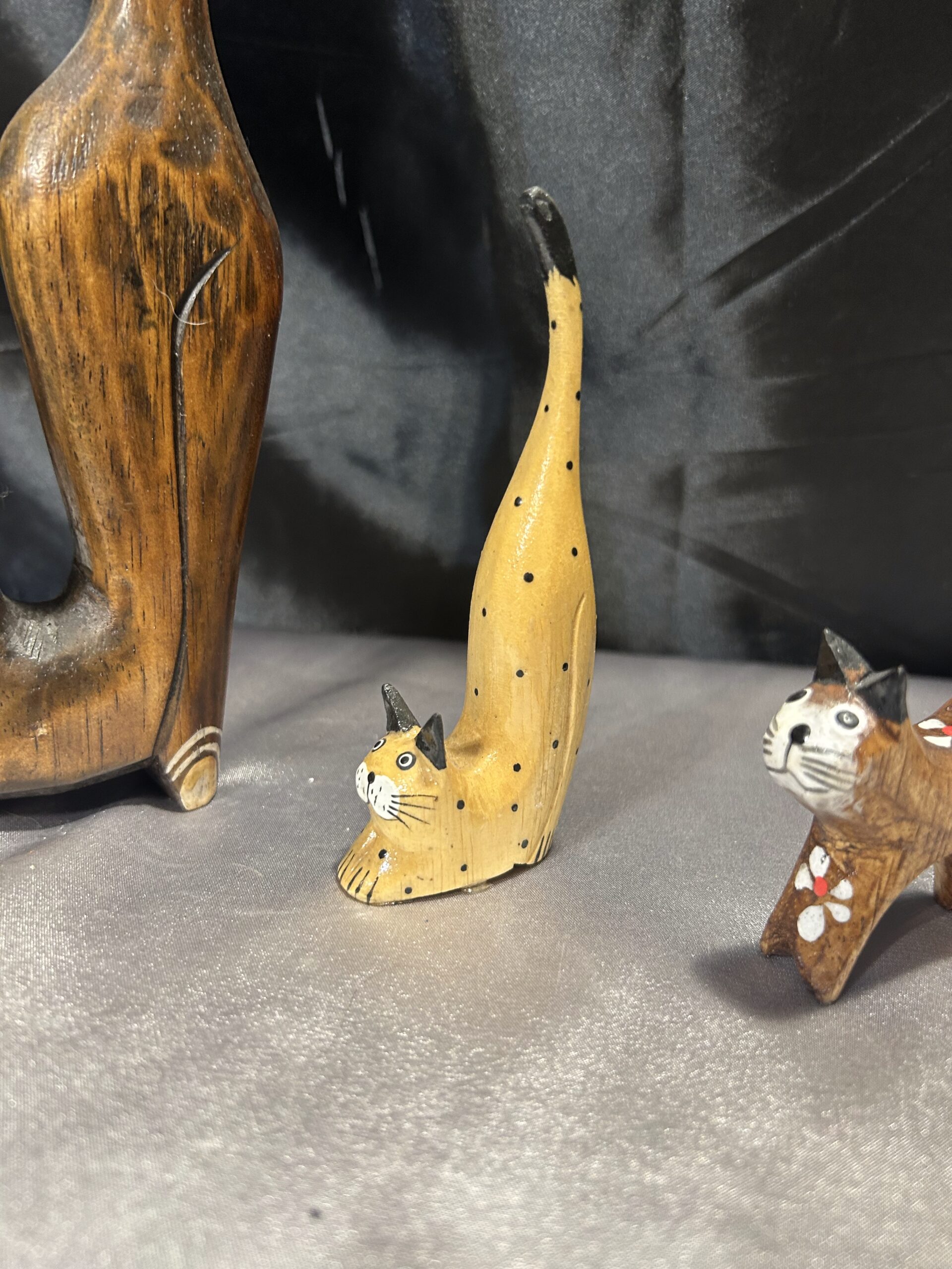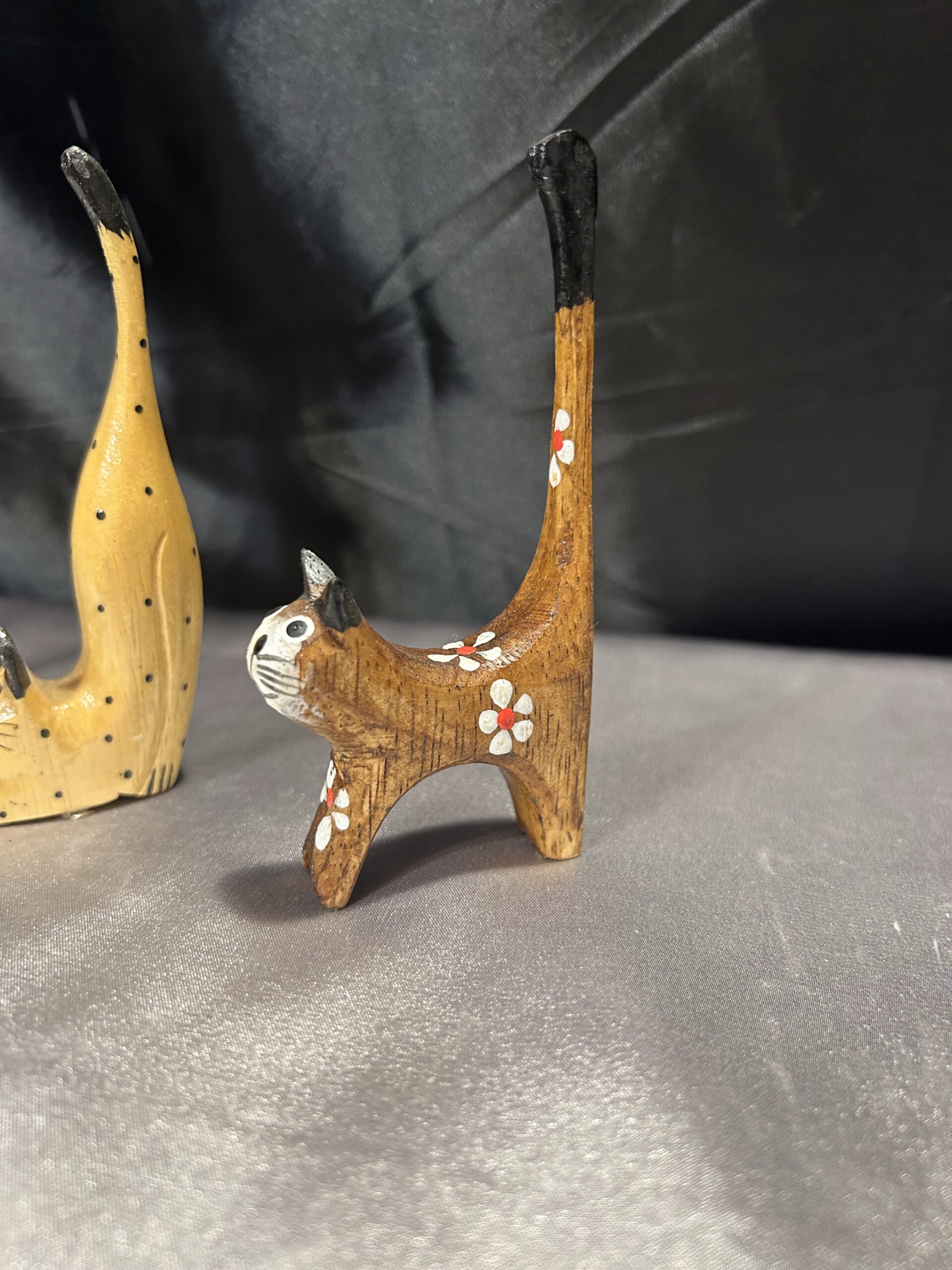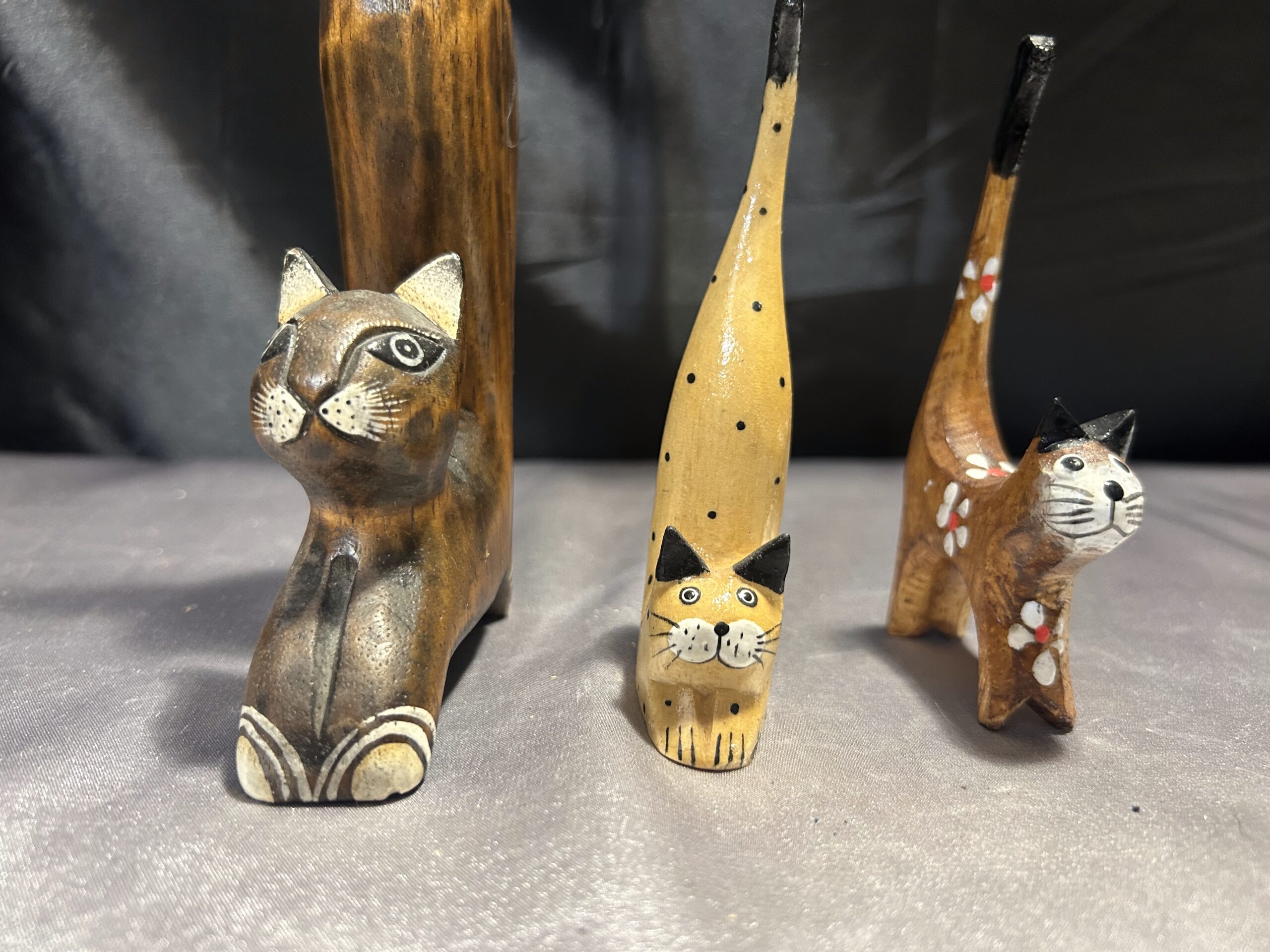 Przedstawiam zestaw trzech drewnianych kotków, wykonanych z lekkiego egzotycznego drewna, które zachwycają elegancją i subtelnym zdobieniem. Każdy z kotków ma długi ogonek skierowany do góry, co nadaje im wyjątkowego uroku i stylu.