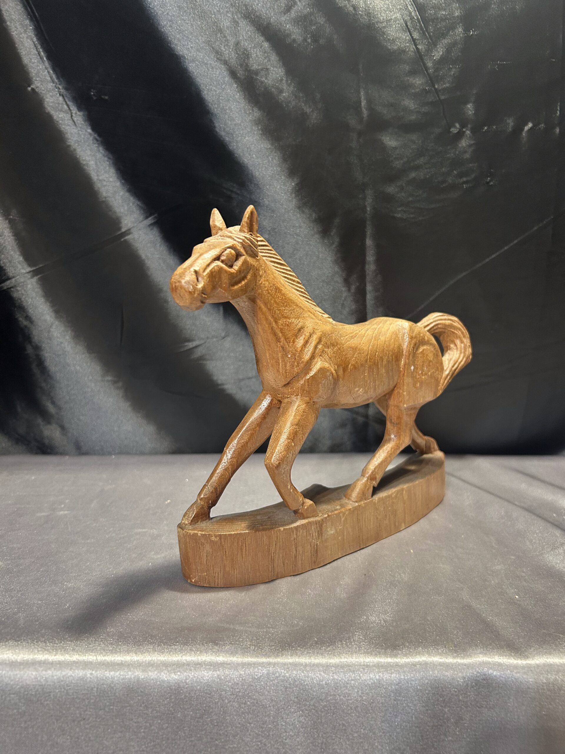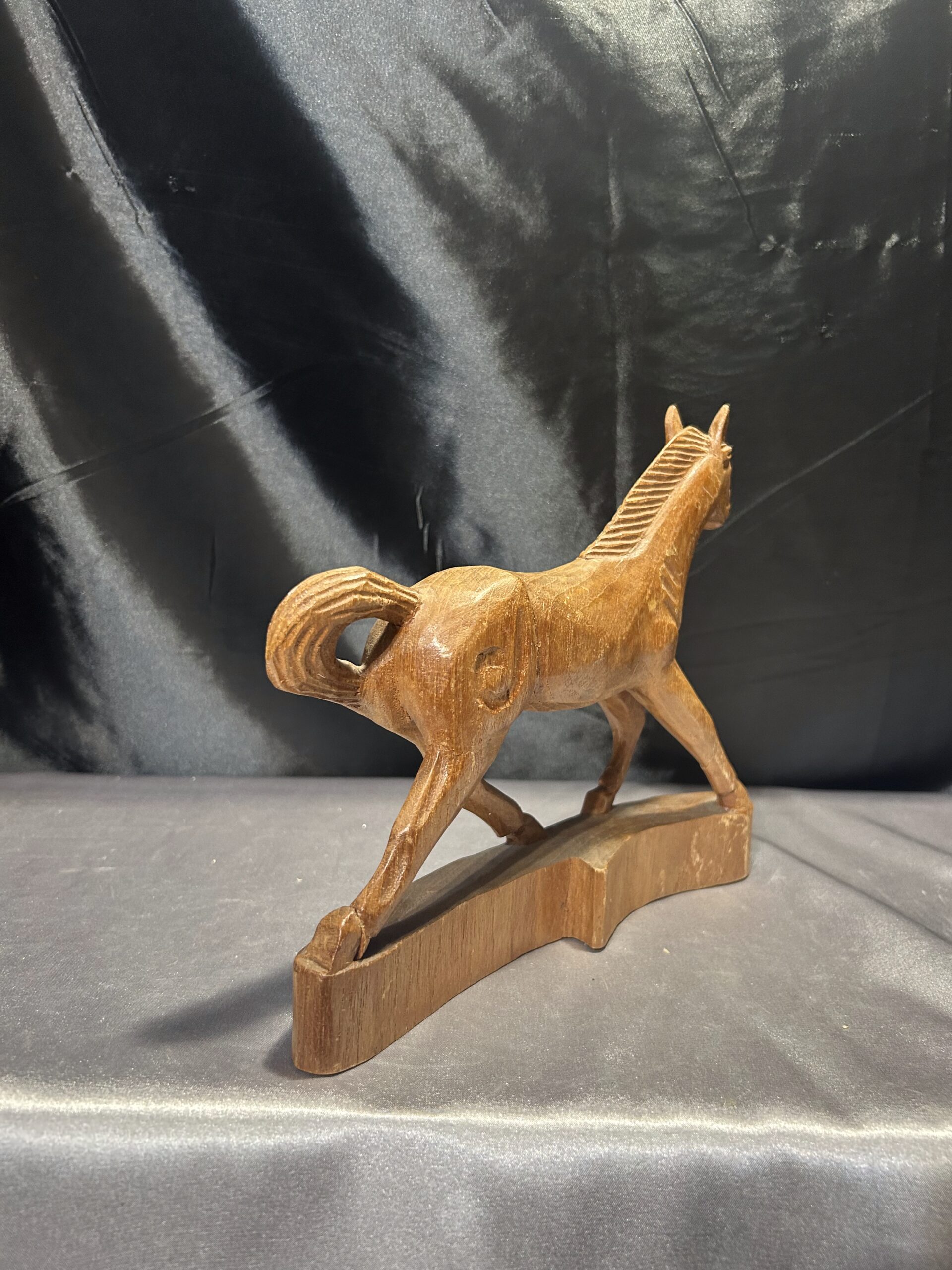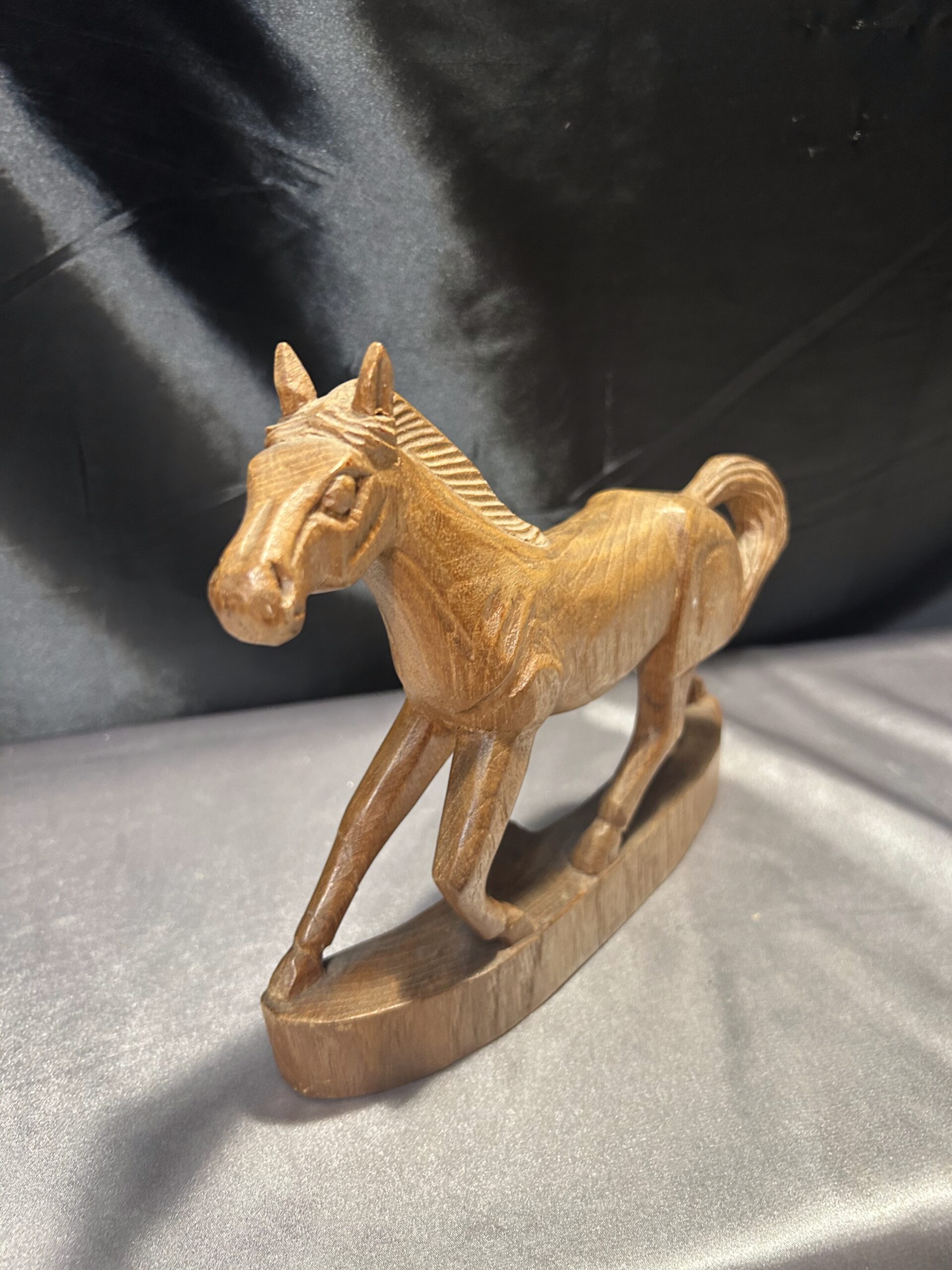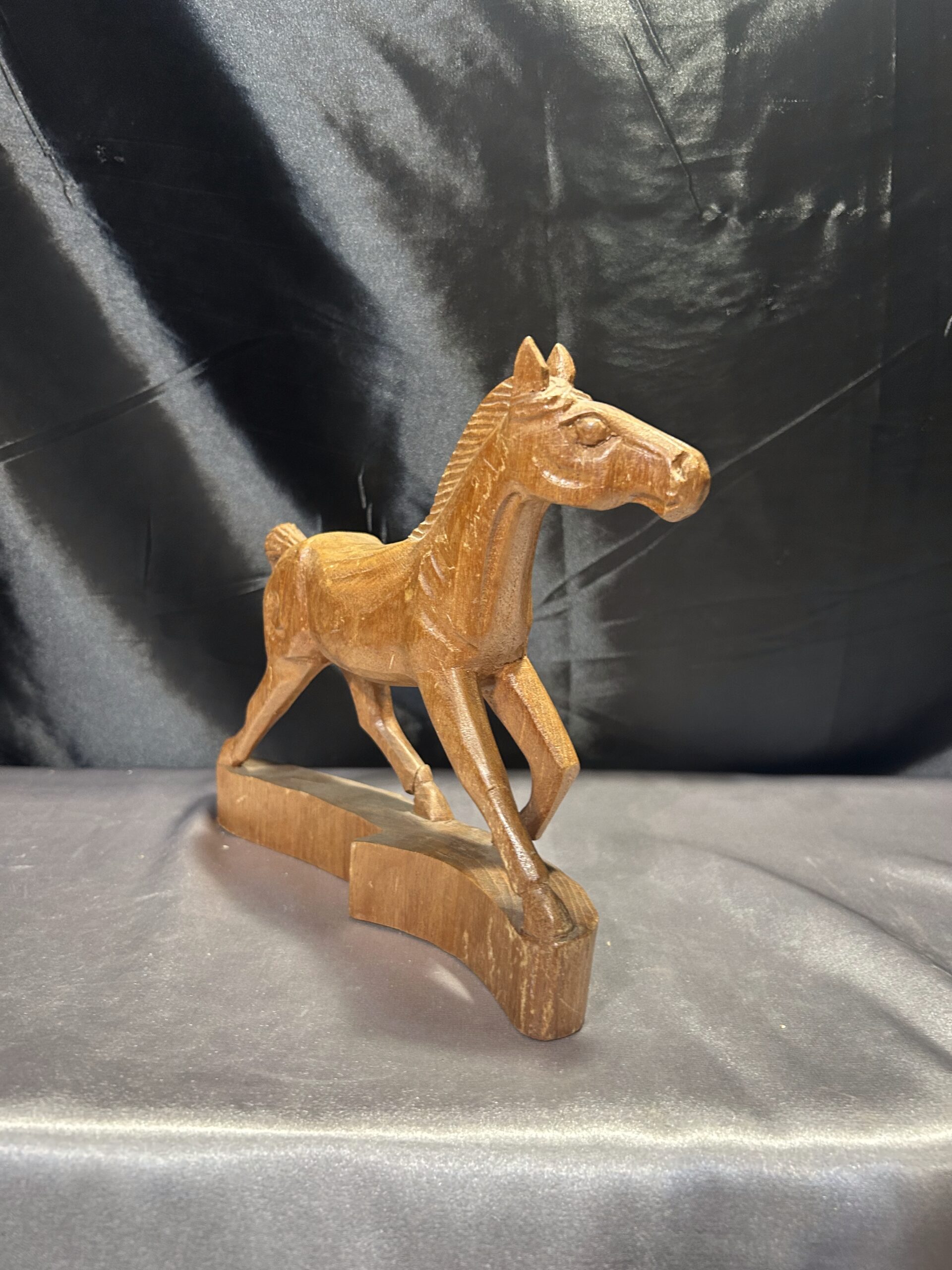 Przedstawiam drewnianą rzeźbę konia w biegu, wykonaną z dbałością o detale i realistyczne proporcje. Dynamiczna poza i precyzyjne wykończenie sprawiają, że rzeźba oddaje ruch i siłę galopującego konia, czyniąc ją wyjątkową dekoracją wnętrza.