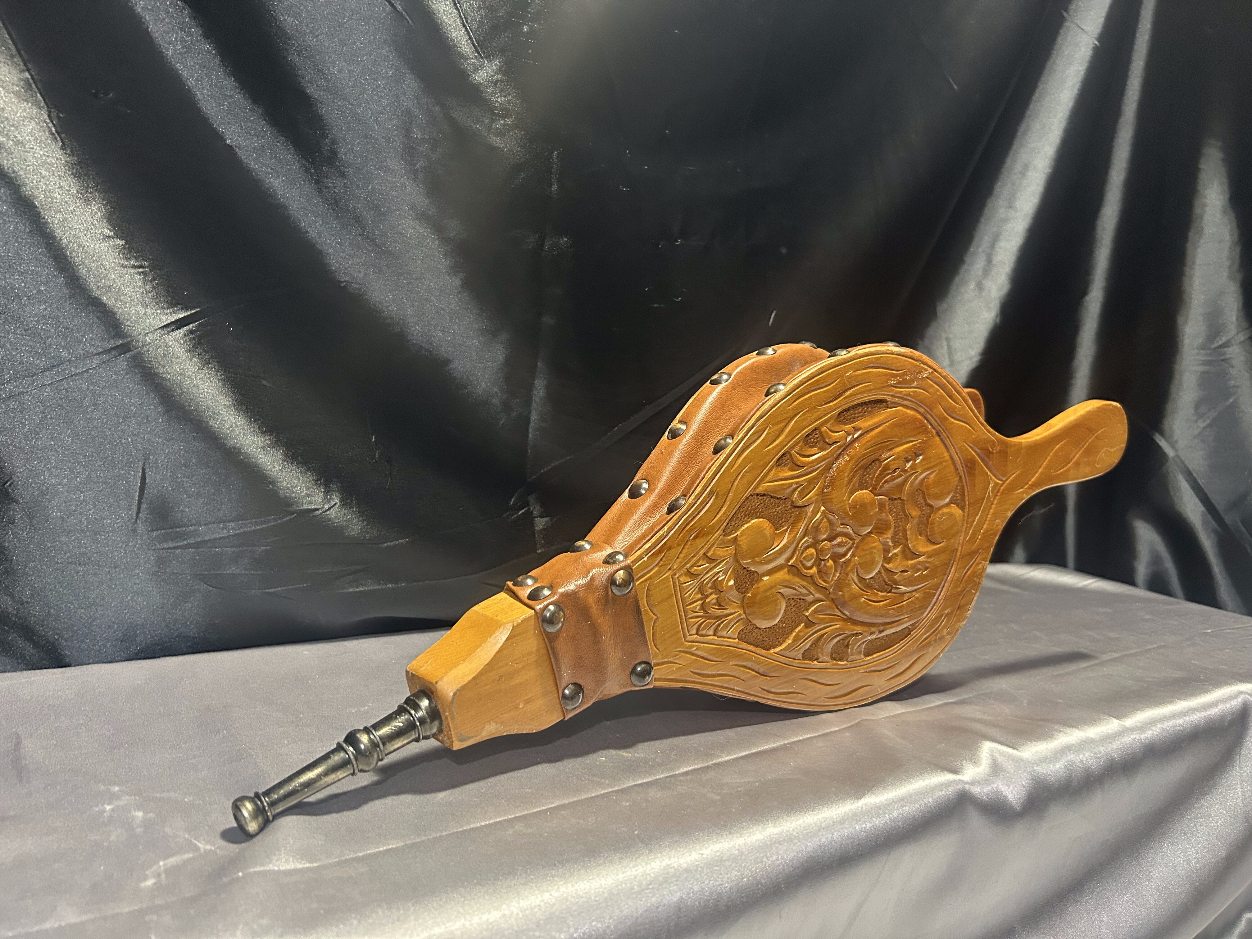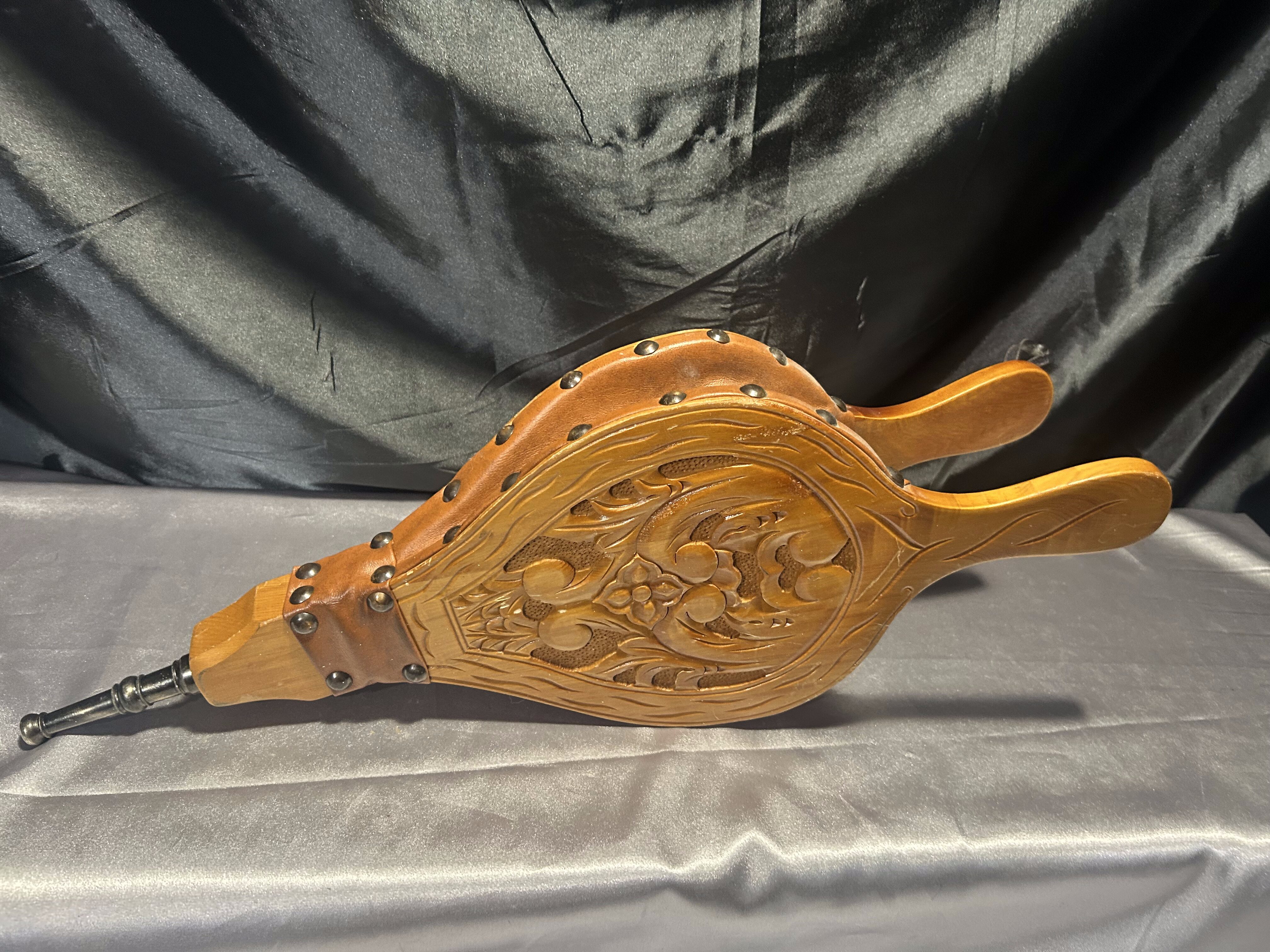 Stylowy miech kominkowy wykonany z litego drewna, ozdobiony precyzyjnym rzeźbieniem w motywie roślinnym. Skórzana (eko) powłoka w ciepłym brązowym odcieniu, wykończona eleganckimi ćwiekami z mosiądzu. Praktyczny i estetyczny dodatek do wnętrz rustykalnych, klasycznych i skandynawskich. Może służyć zarówno jako narzędzie do rozpalania ognia, jak i efektowna dekoracja przy kominku.