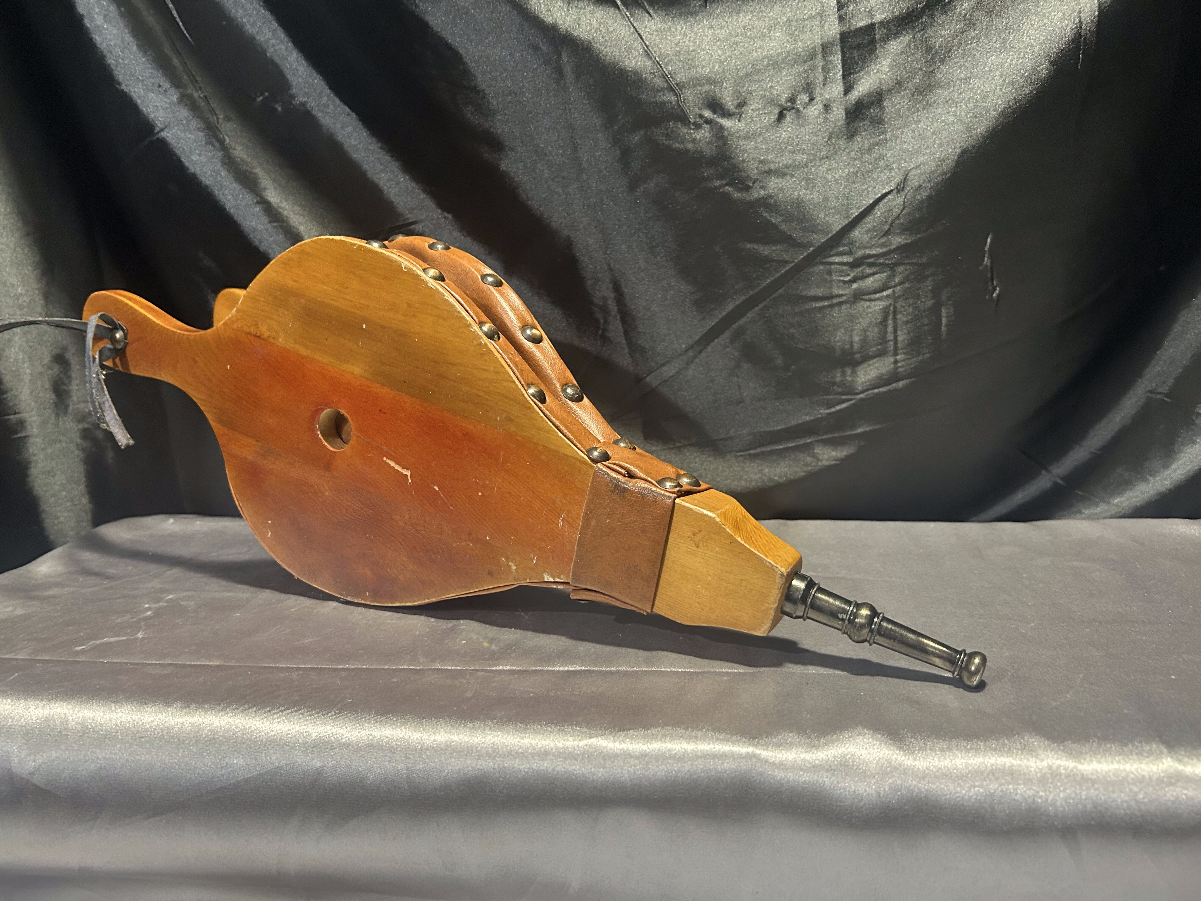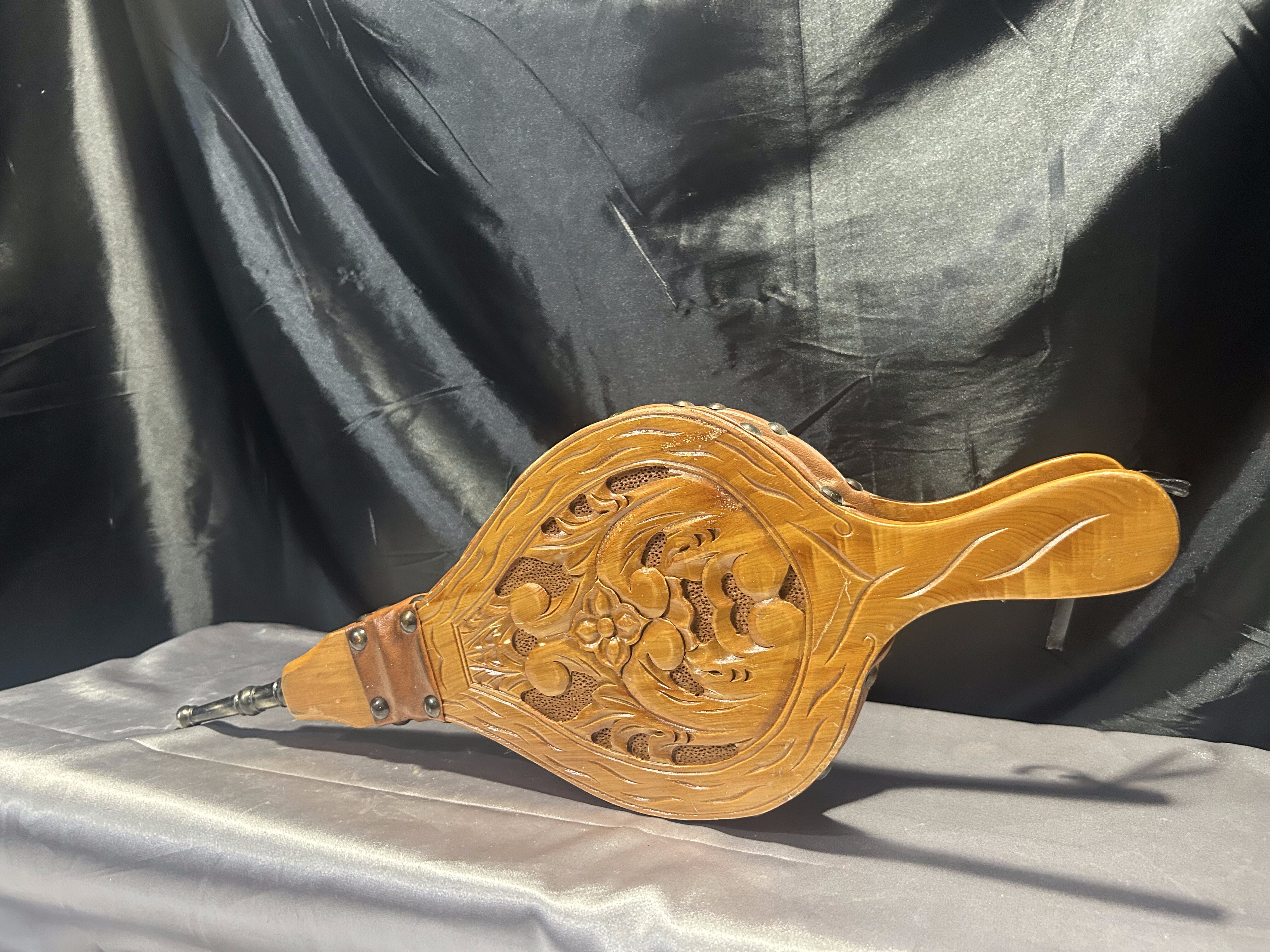 Drewniany miech kominkowy – rzeźbiony, z mosiężnymi ćwiekami – dekoracyjny i funkcjonalny