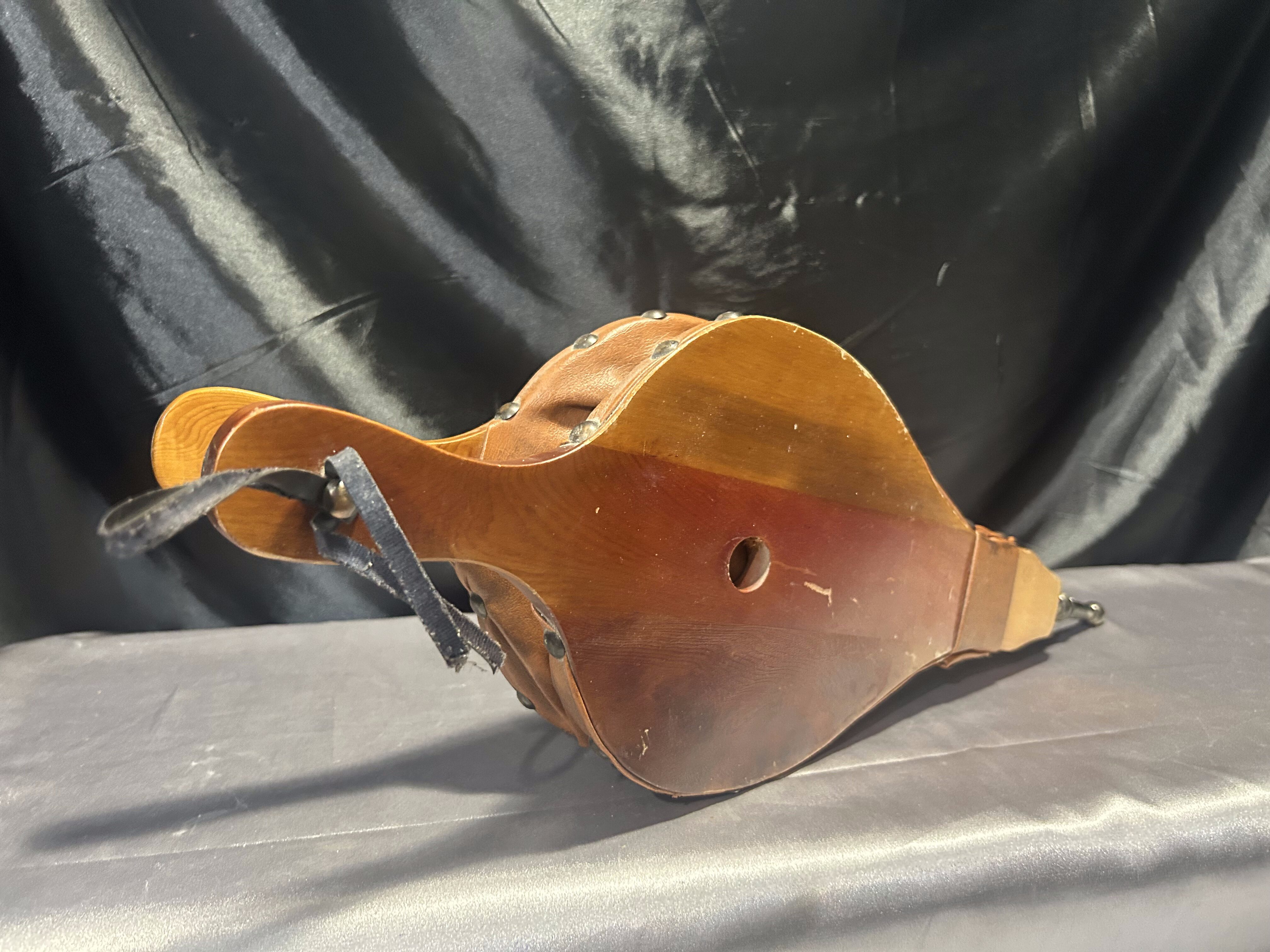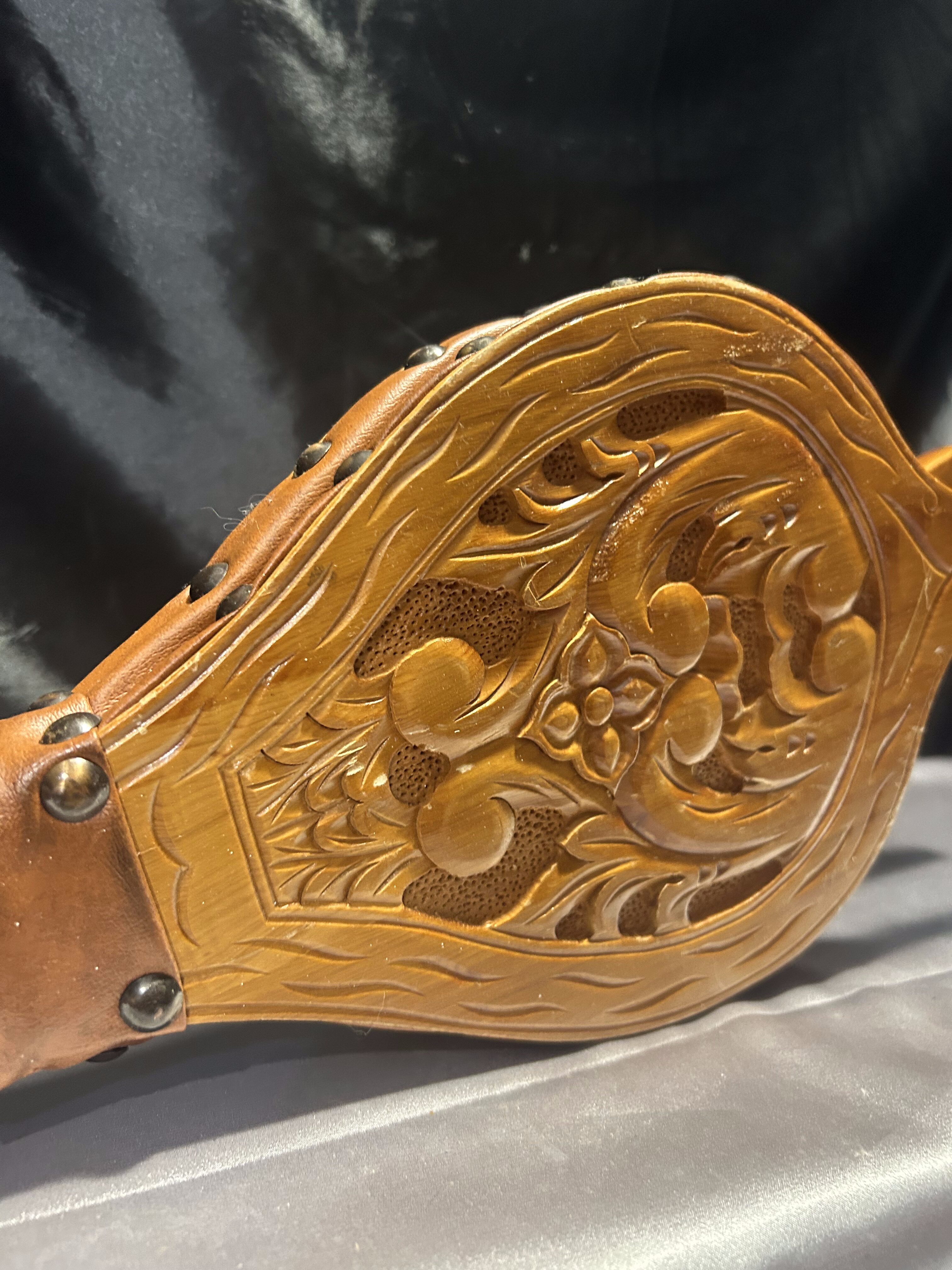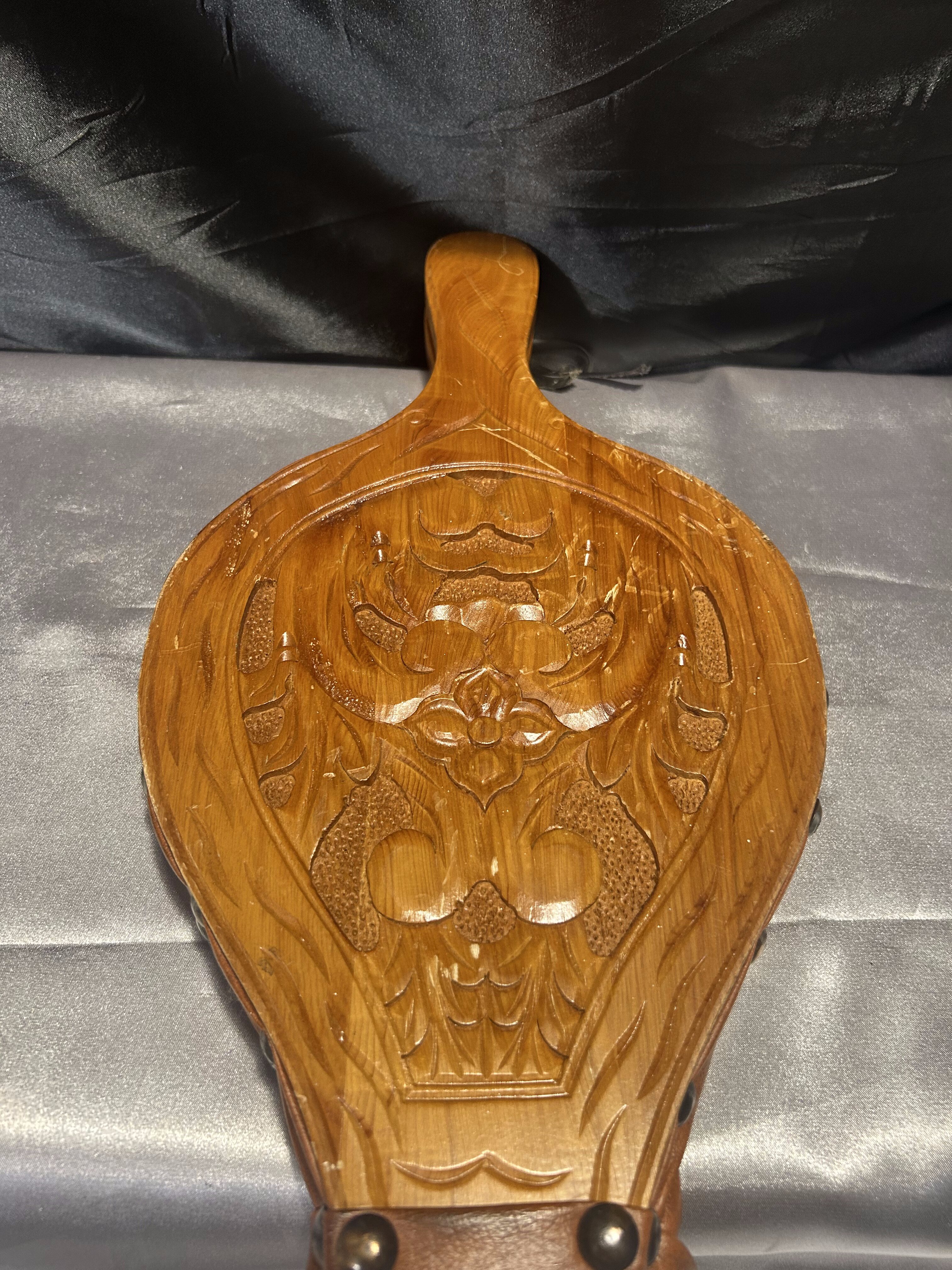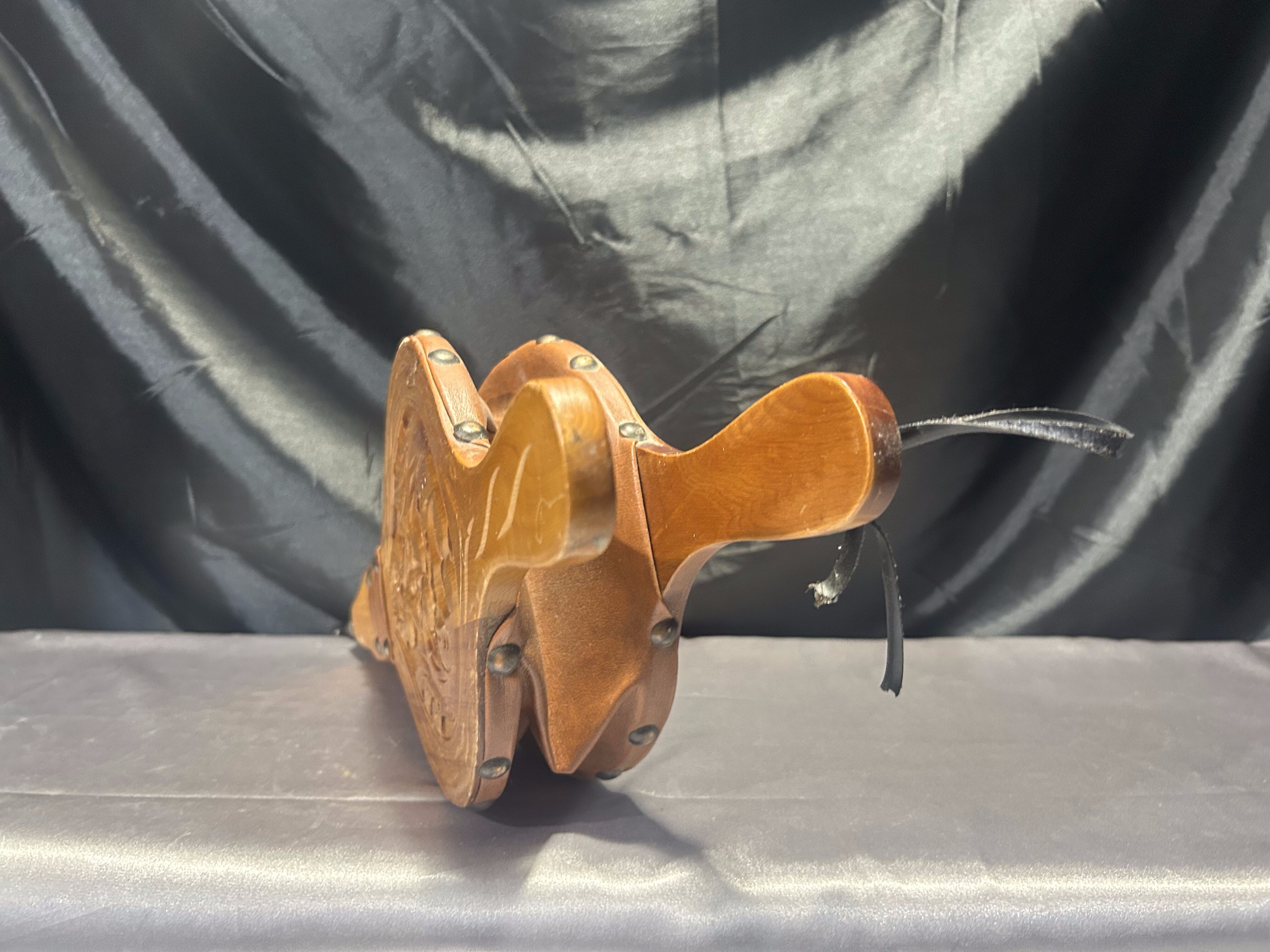 Materiał: drewno, eko-skóra, mosiężne ćwieki
