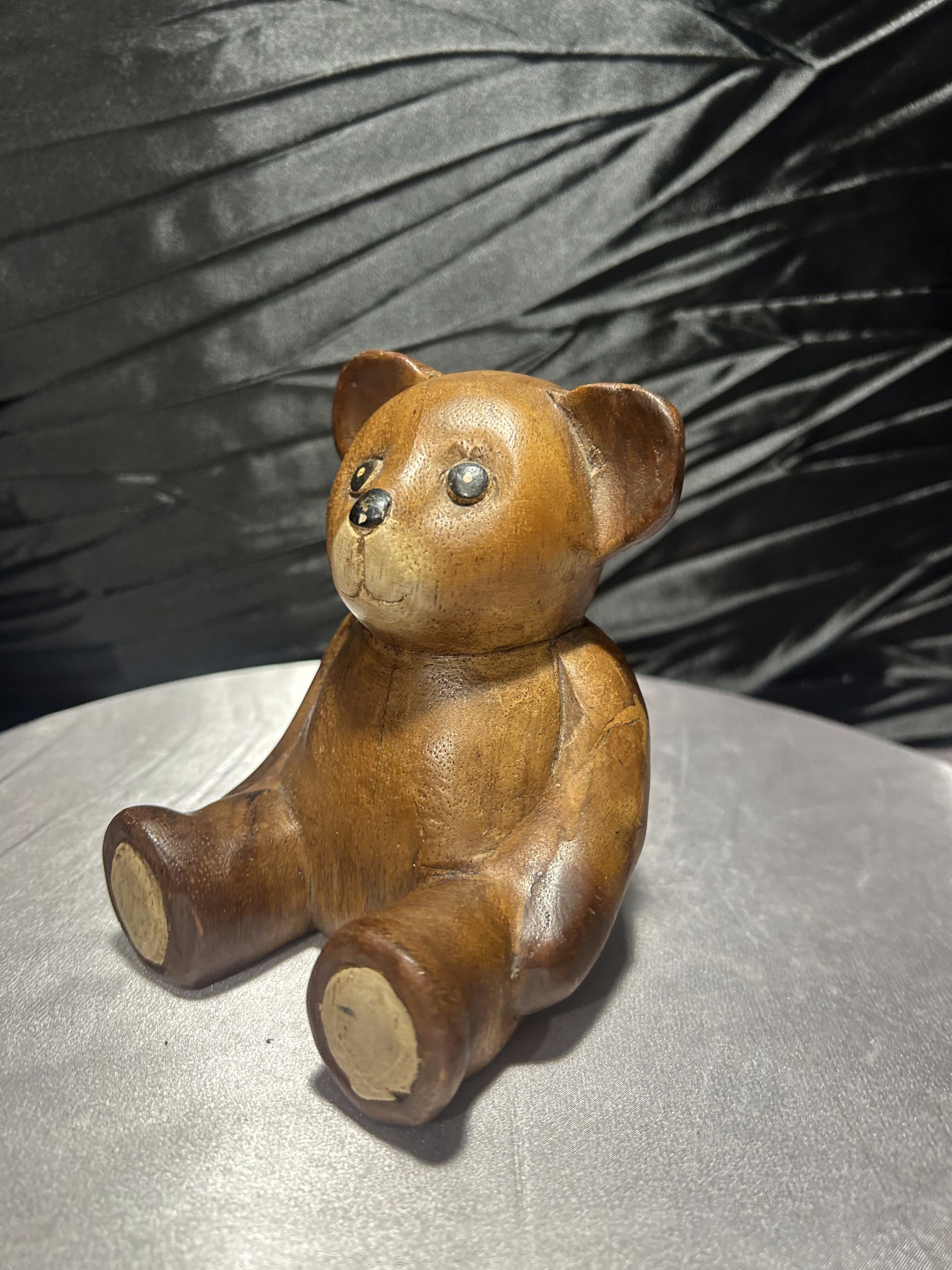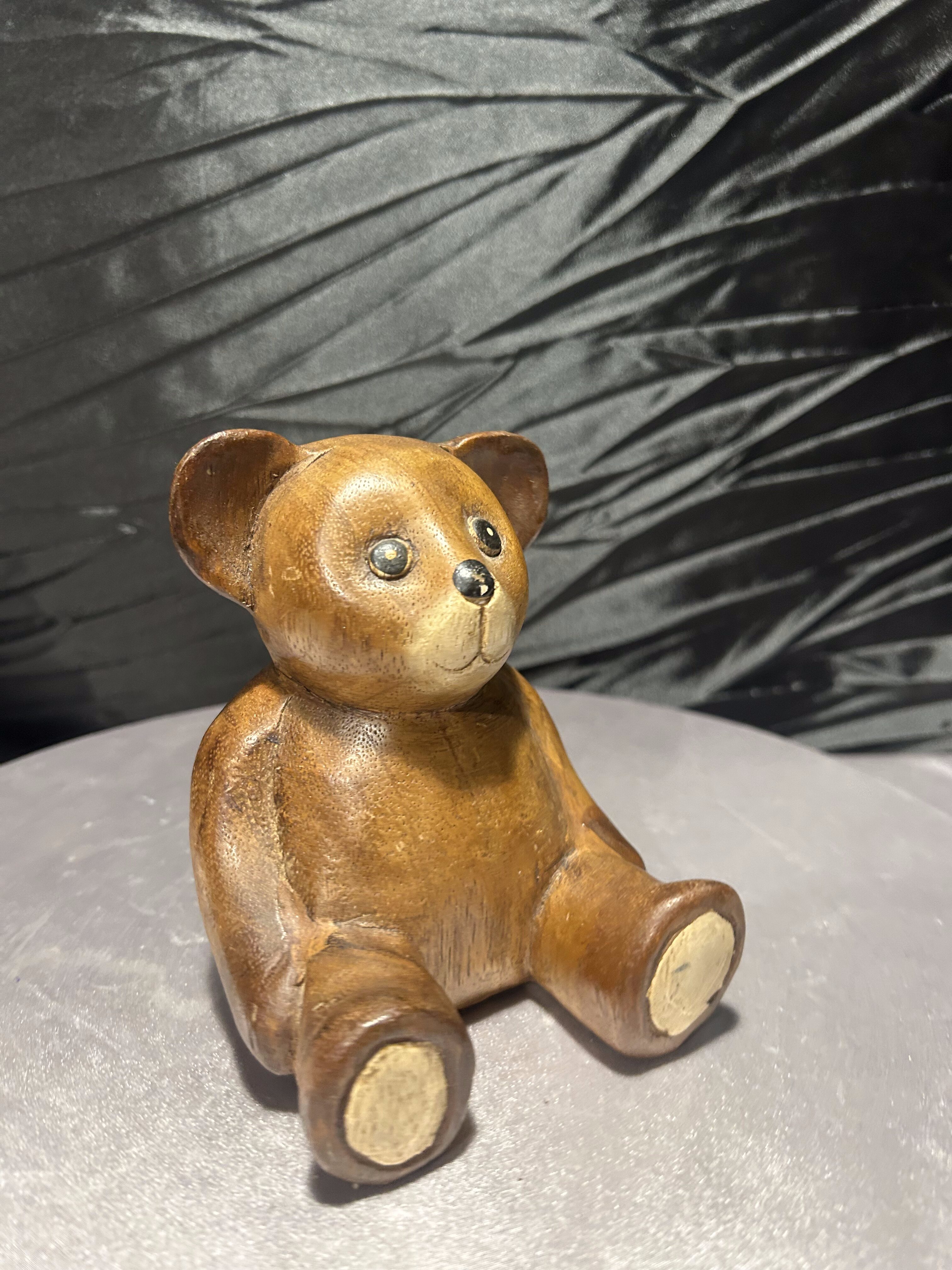 Uroczy drewniany miś w pozycji siedzącej, wykonany z wielką dbałością o detale. Jego łagodny wyraz twarzy, zaokrąglone kształty i naturalne wybarwienie drewna sprawiają, że emanuje ciepłem i spokojem. To dekoracja, która przyciąga wzrok swoją prostotą i naturalnym wdziękiem.