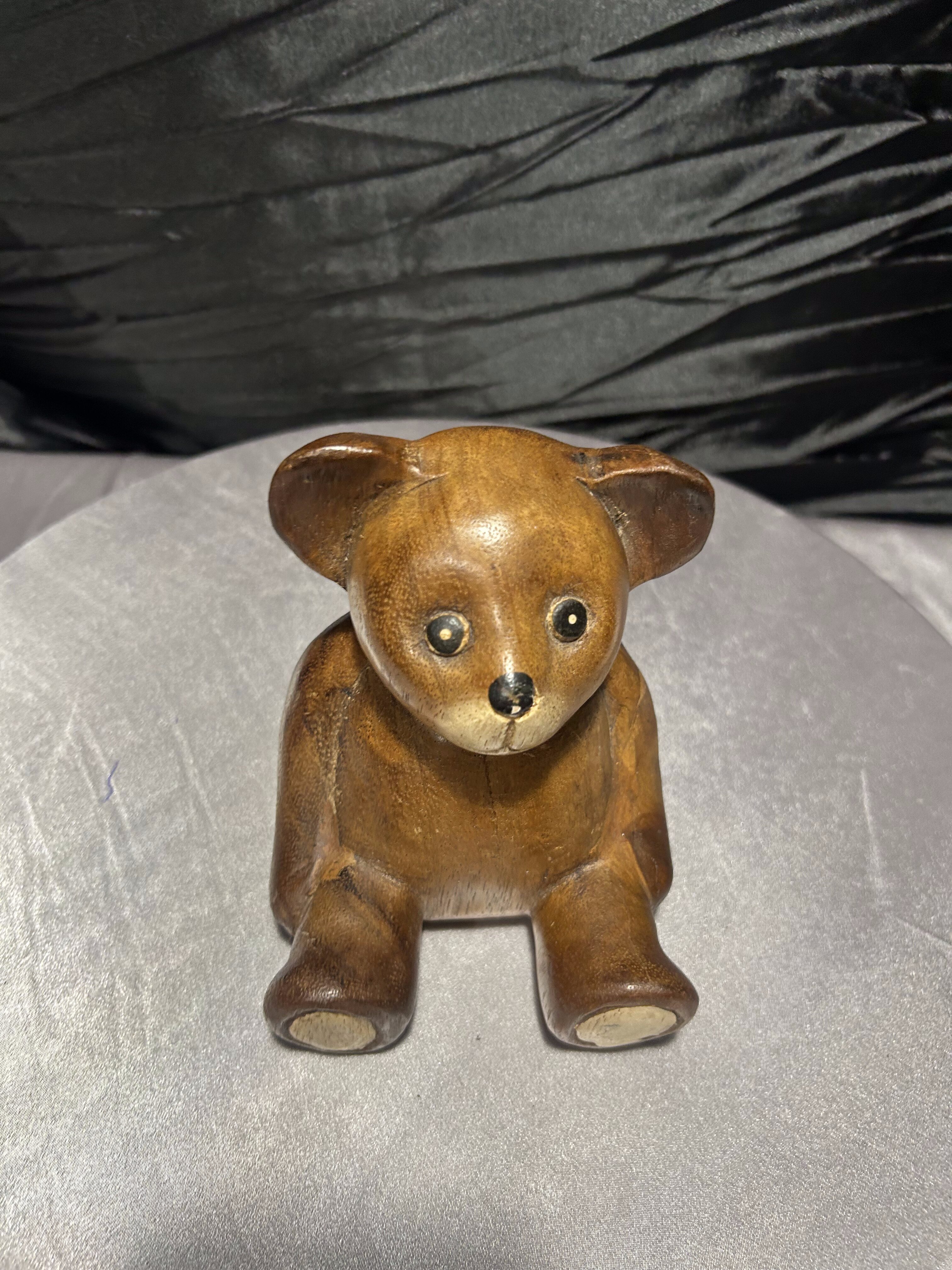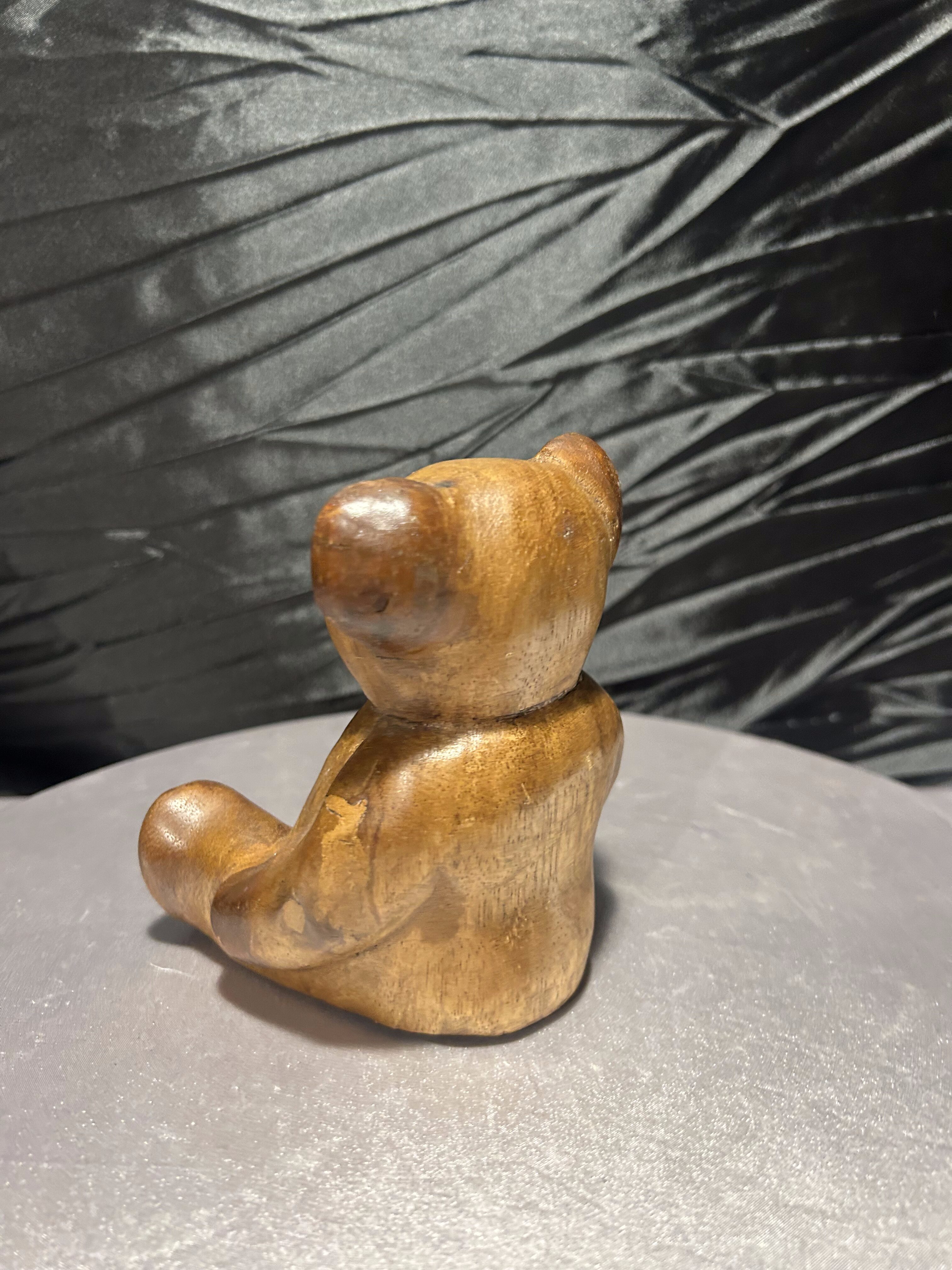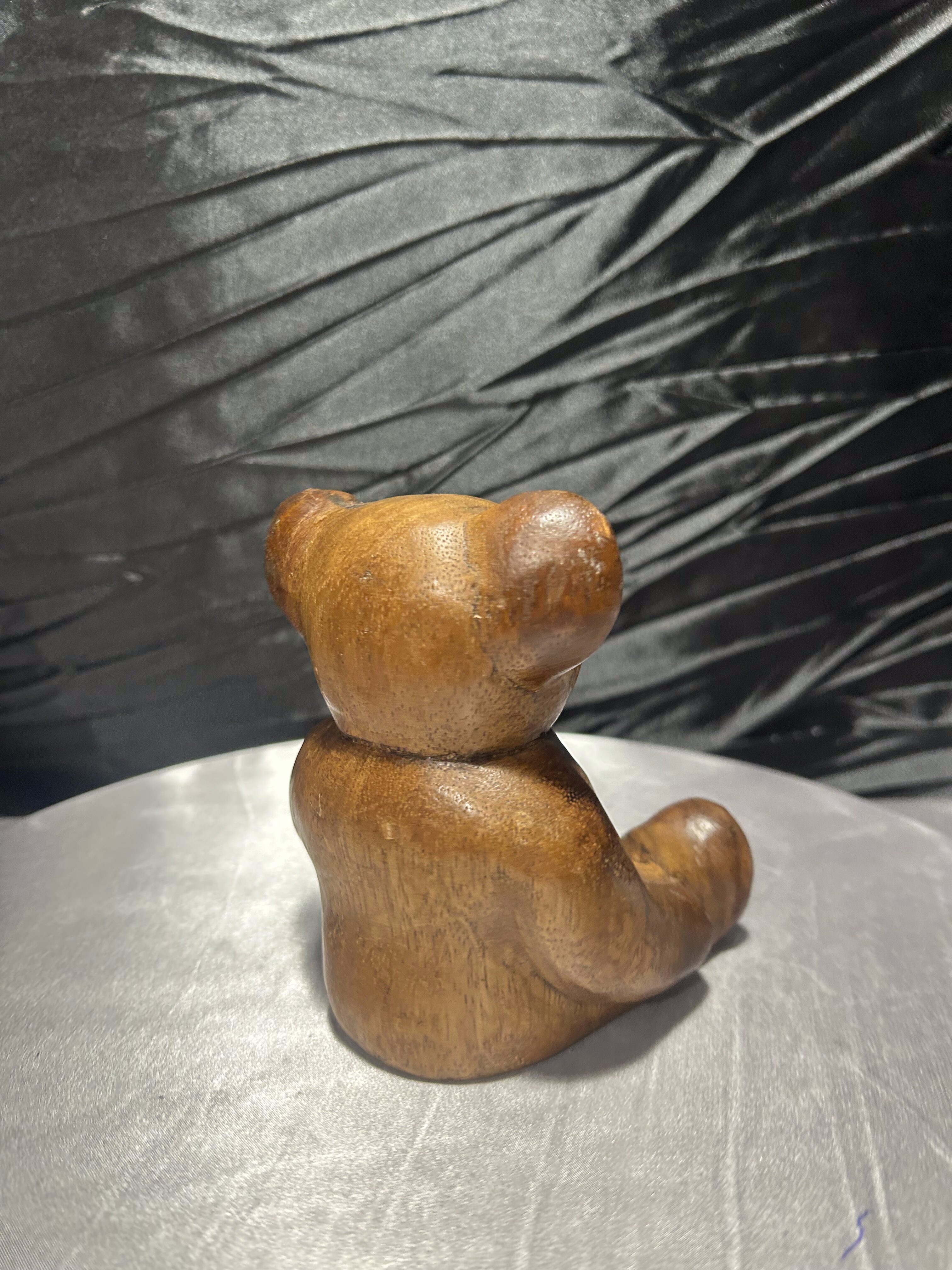Drewniany miś siedzący – urocza ręcznie rzeźbiona ozdoba, wysokość 13,5 cm