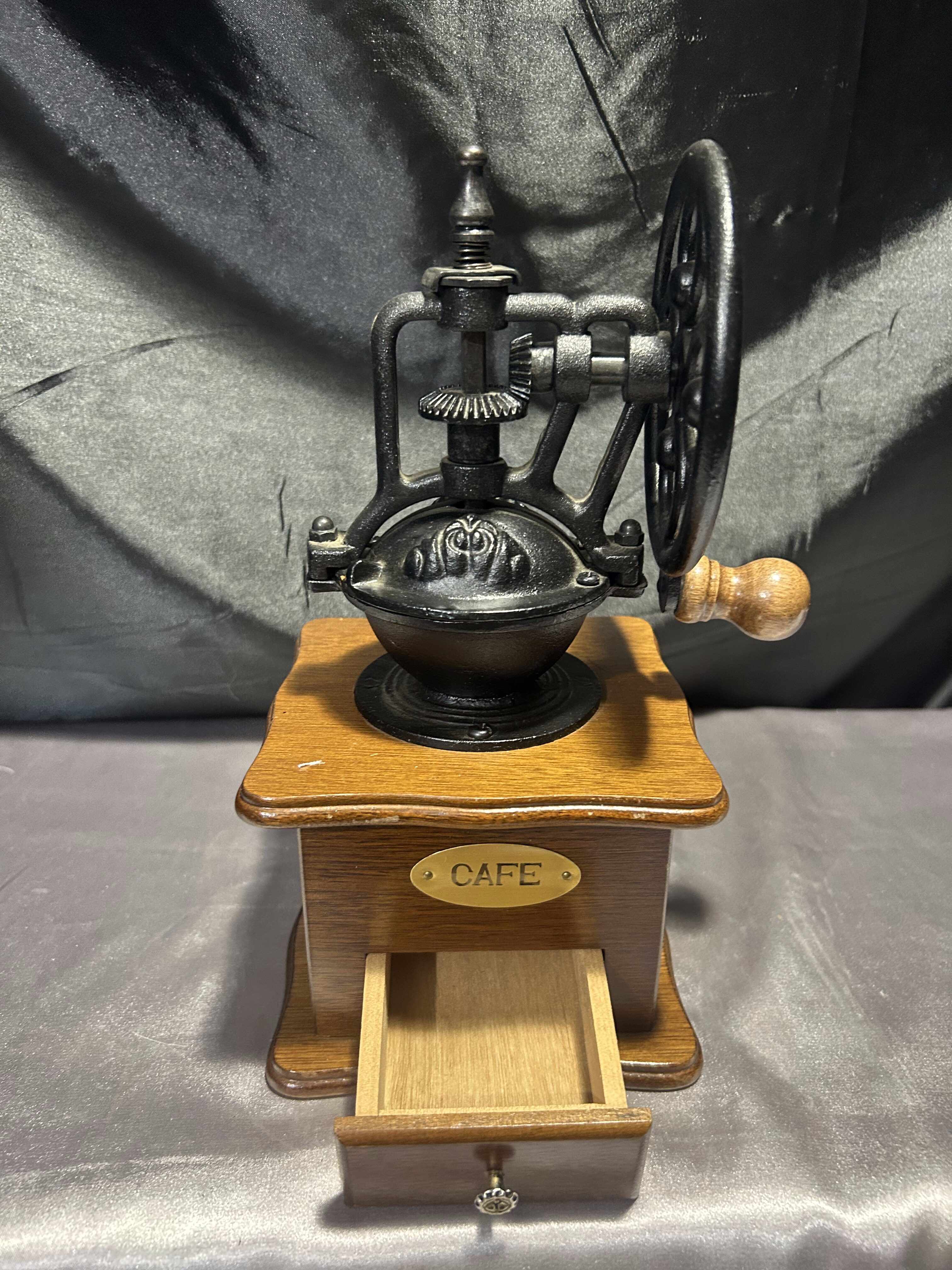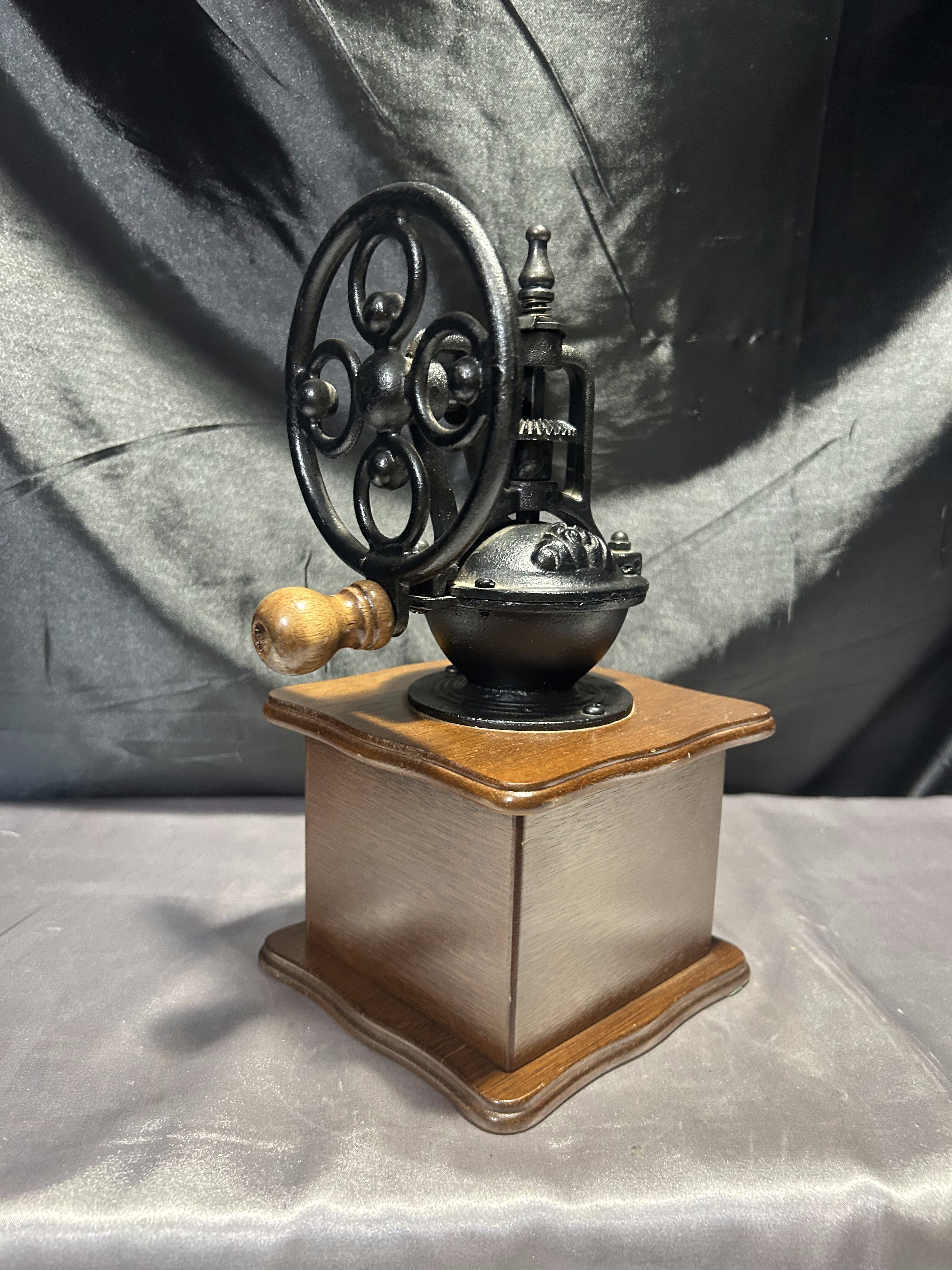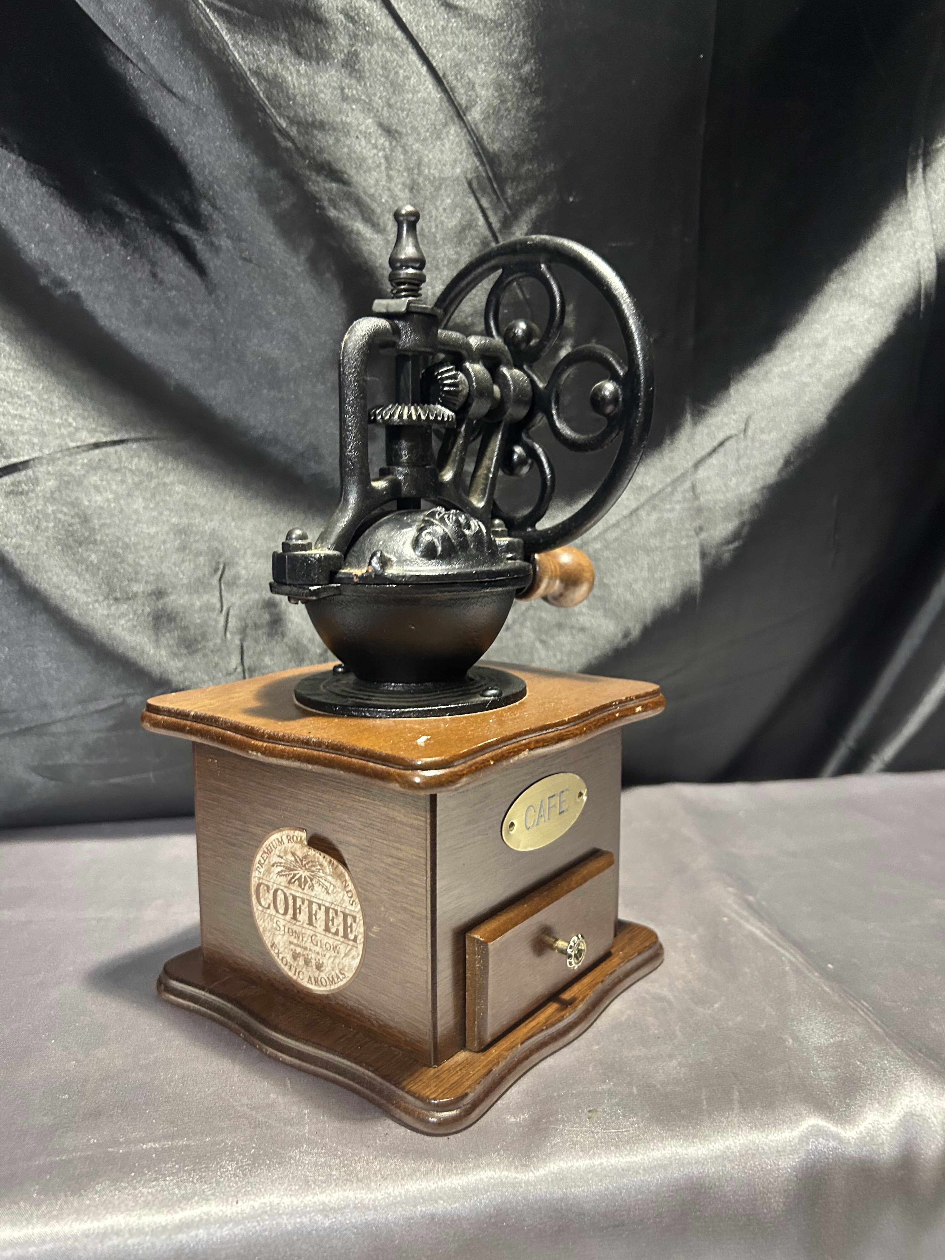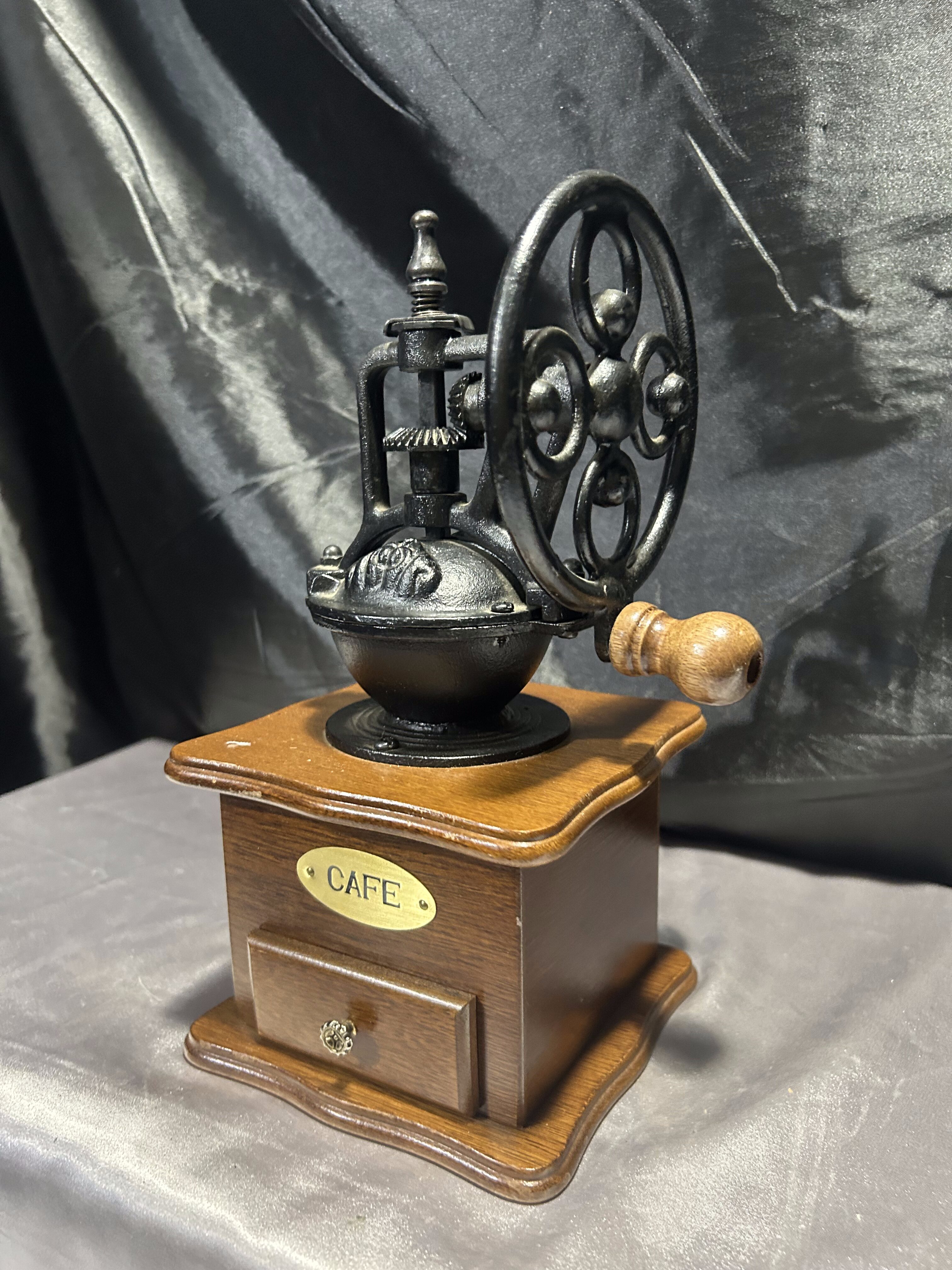 Elegancki, nowy młynek do kawy w klasycznym stylu retro, wykonany z drewna i metalu. Wyposażony w tradycyjną korbkę oraz szufladkę na zmieloną kawę. Metalowa część mieląca ma ozdobny kształt i solidne wykonanie – młynek jest nie tylko praktyczny, ale i dekoracyjny. Idealny dla miłośników rytuału parzenia kawy oraz wnętrz w stylu vintage, rustykalnym czy loftowym.