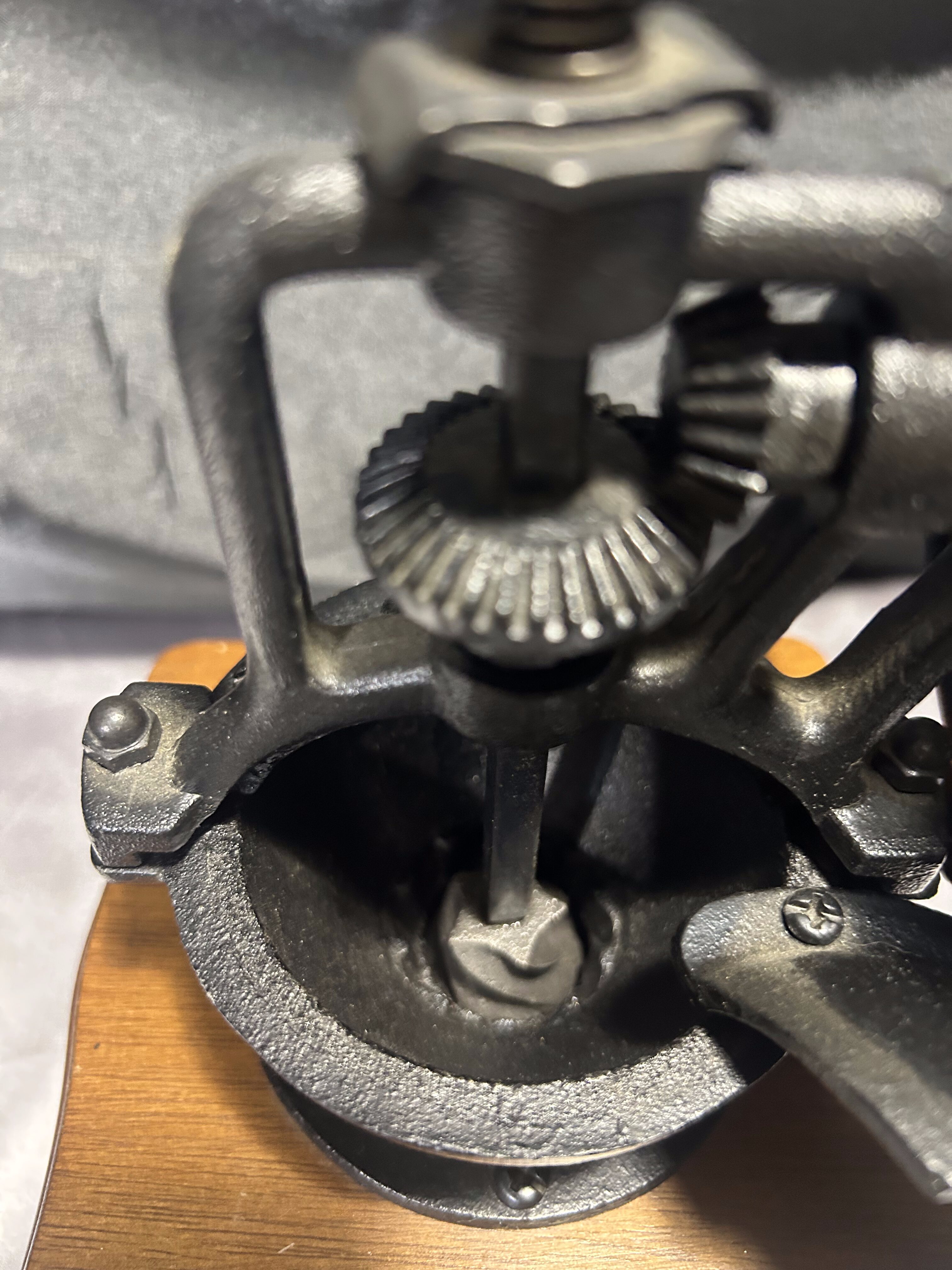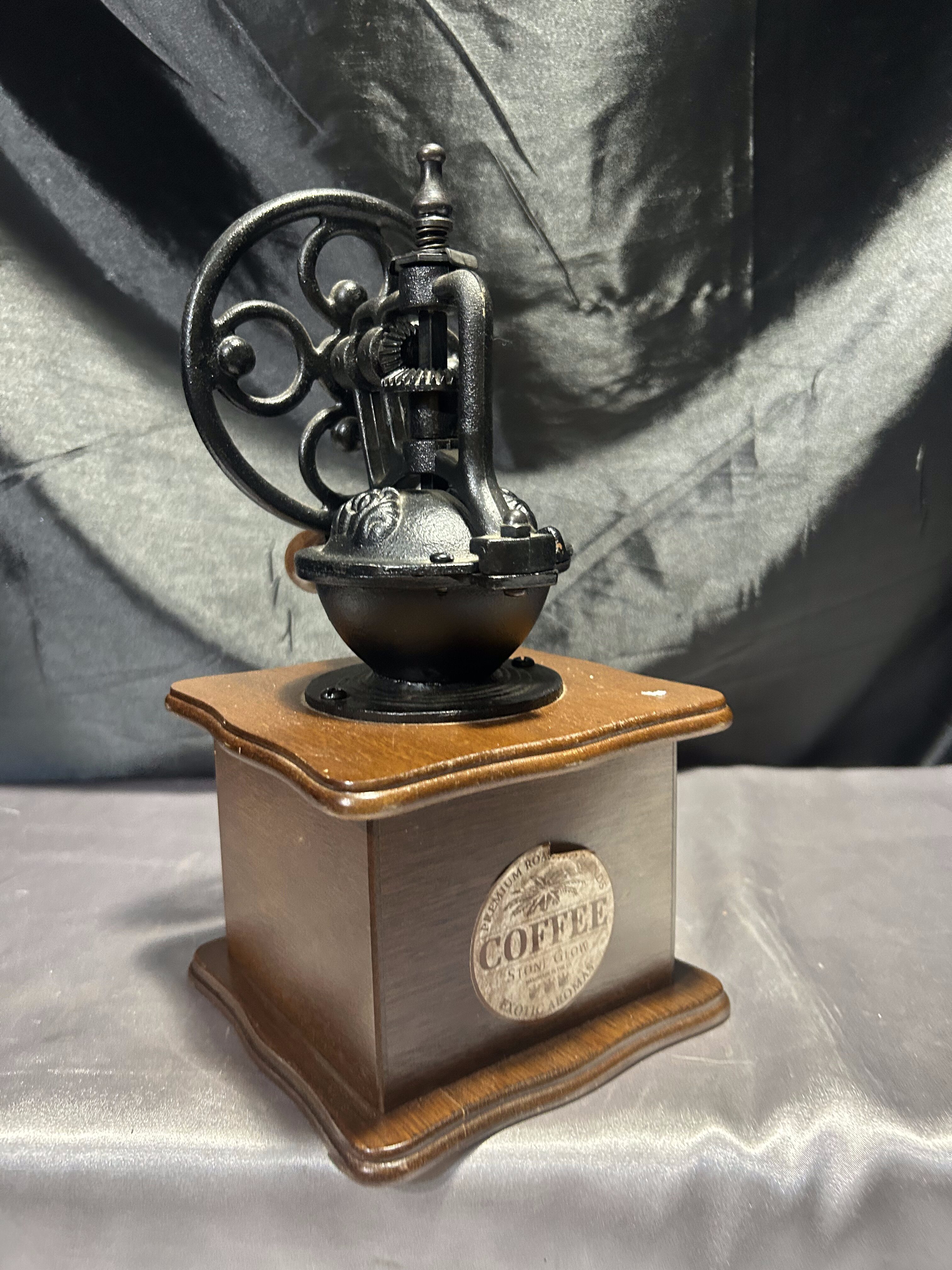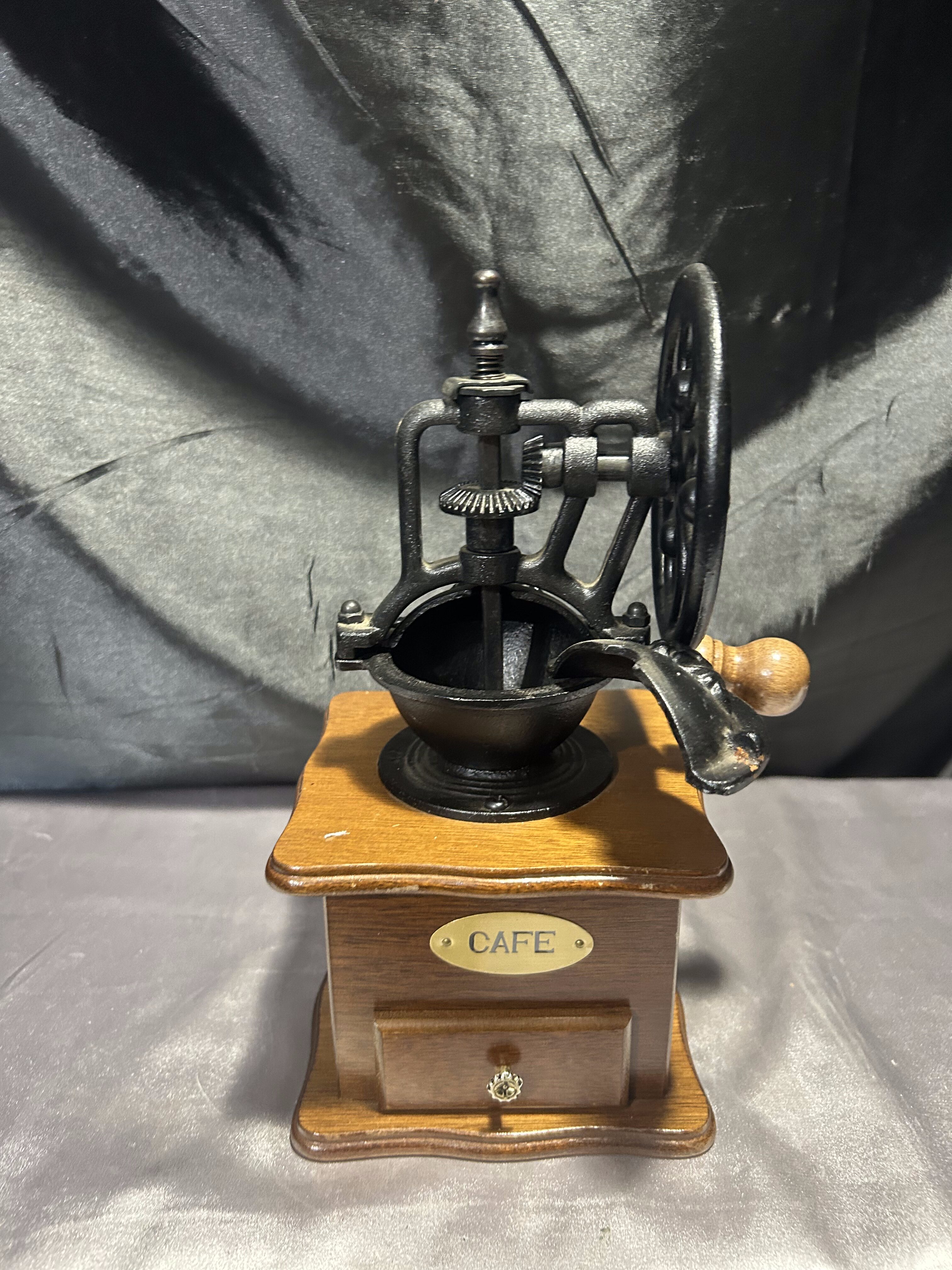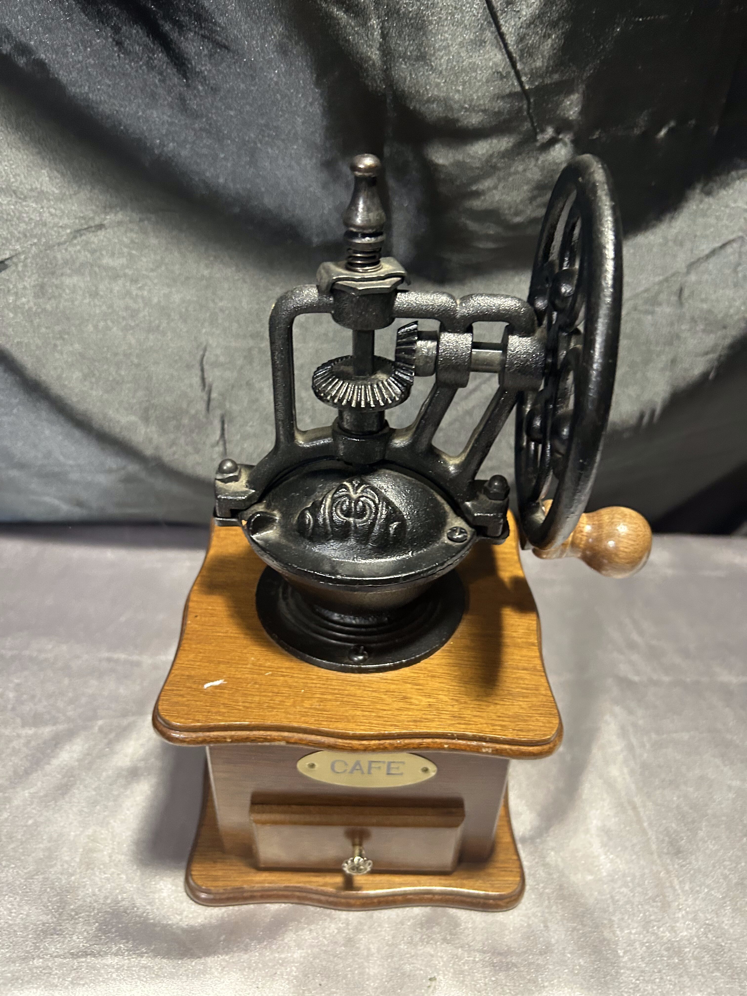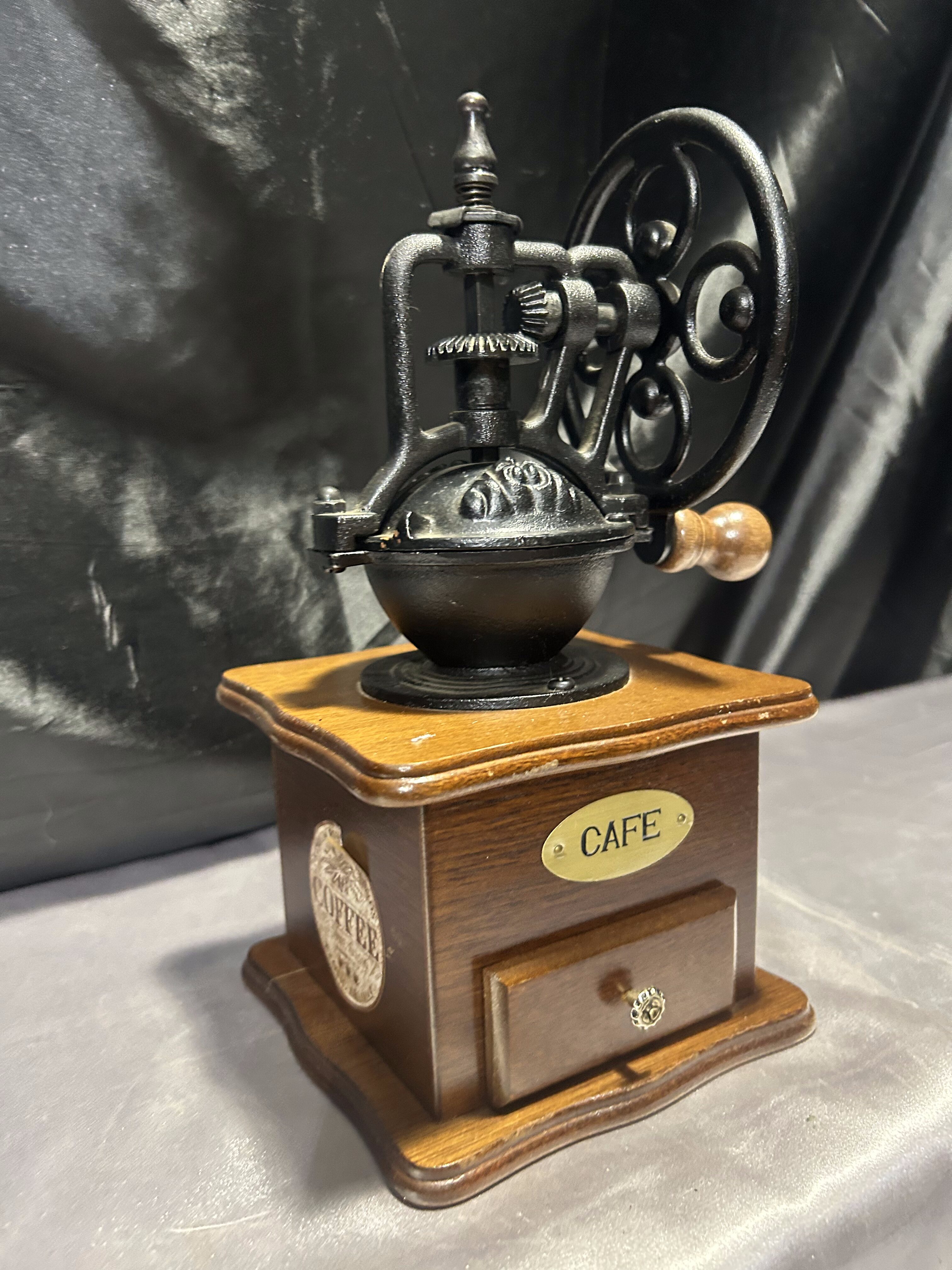 Elegancki, nowy młynek do kawy w klasycznym stylu retro, wykonany z drewna i metalu. Wyposażony w tradycyjną korbkę oraz szufladkę na zmieloną kawę. Metalowa część mieląca ma ozdobny kształt i solidne wykonanie – młynek jest nie tylko praktyczny, ale i dekoracyjny. Idealny dla miłośników rytuału parzenia kawy oraz wnętrz w stylu vintage, rustykalnym czy loftowym.