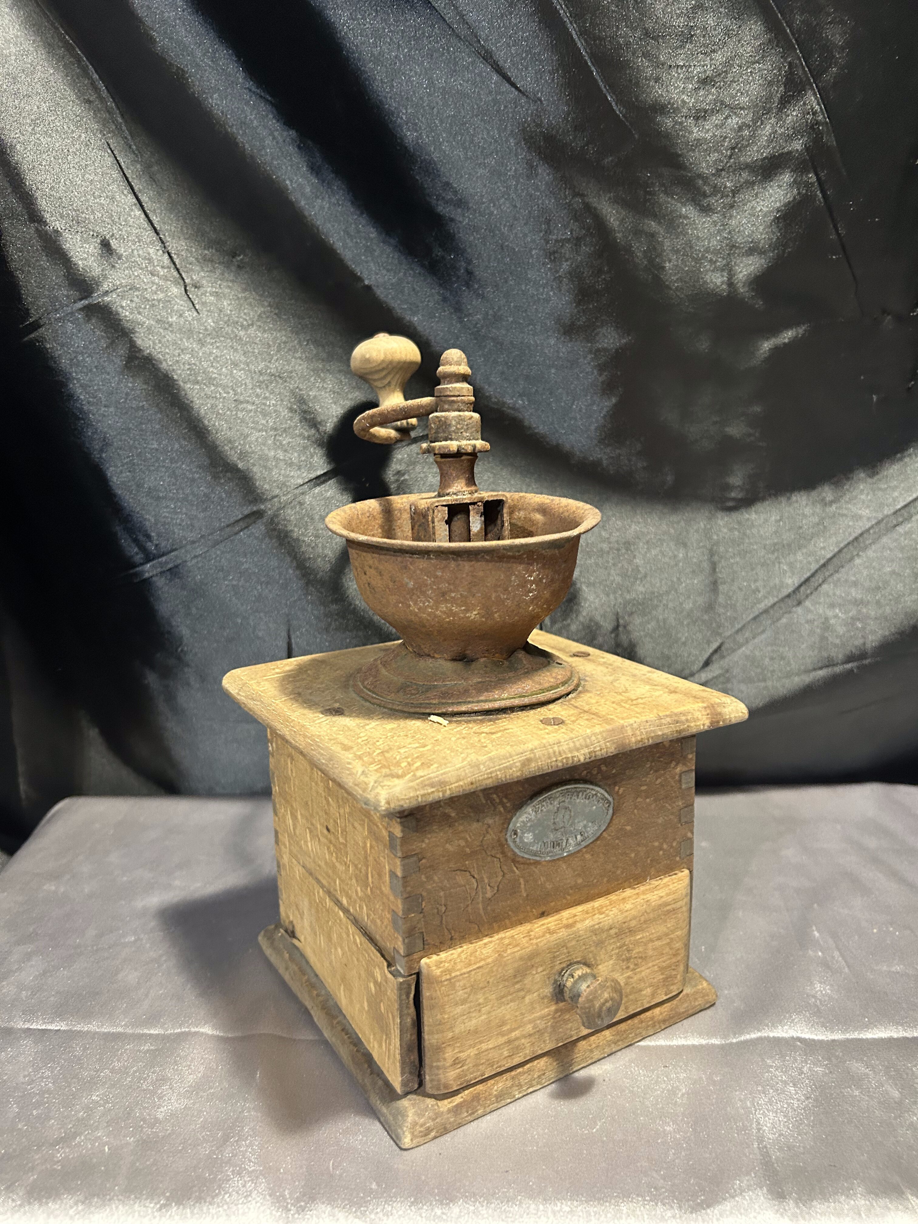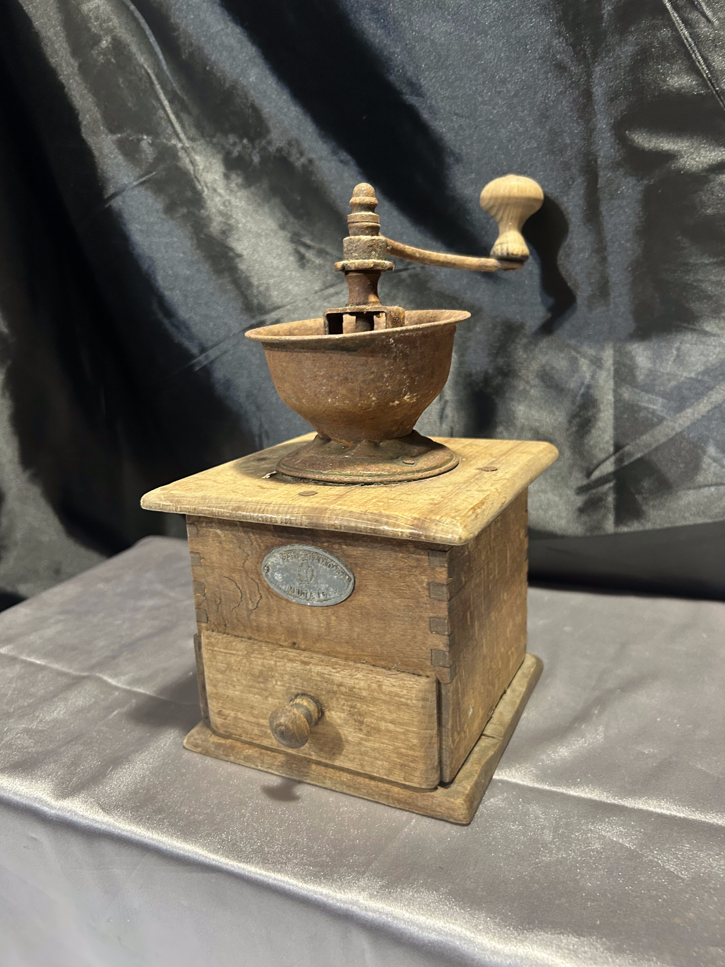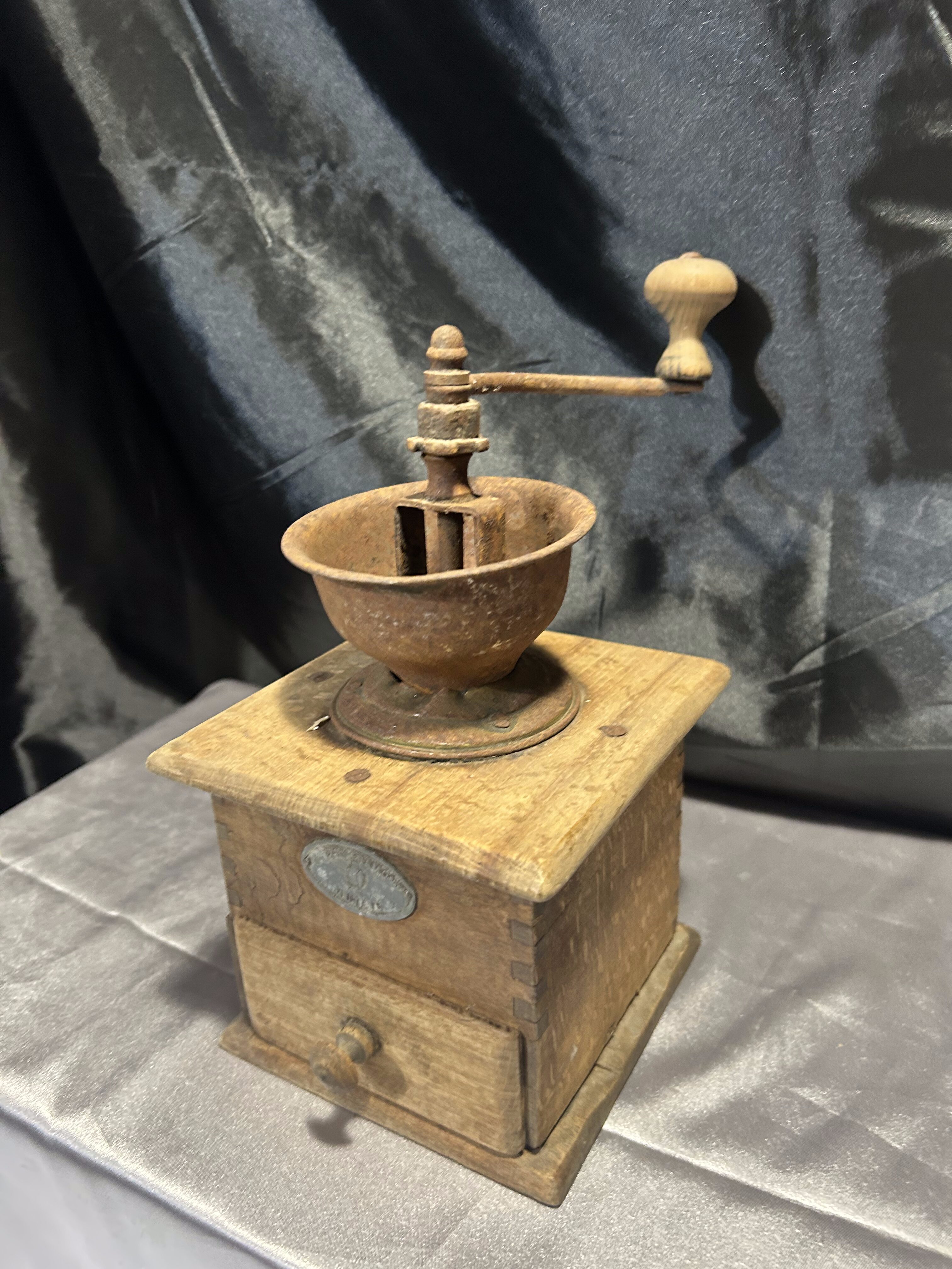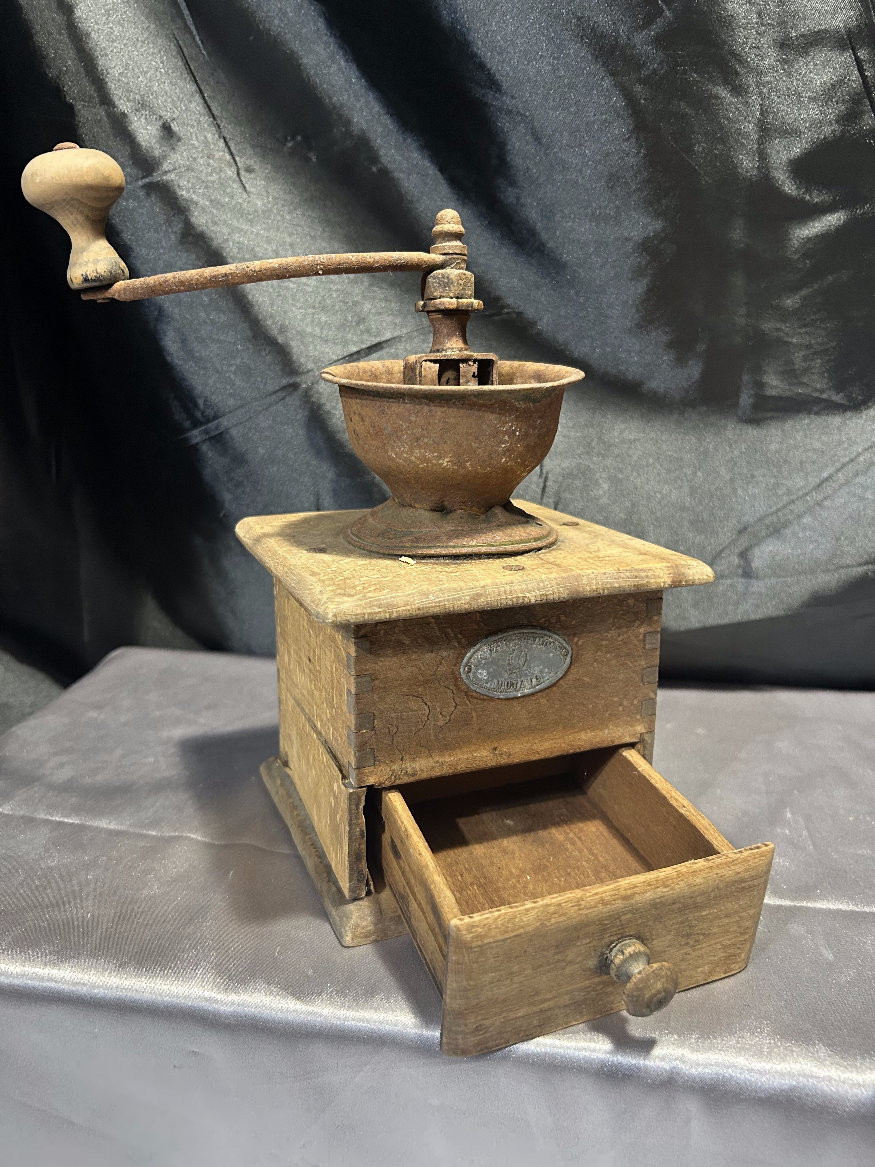 Drewniany młynek do kawy – Z szufladką – Sygnowany – Styl vintage