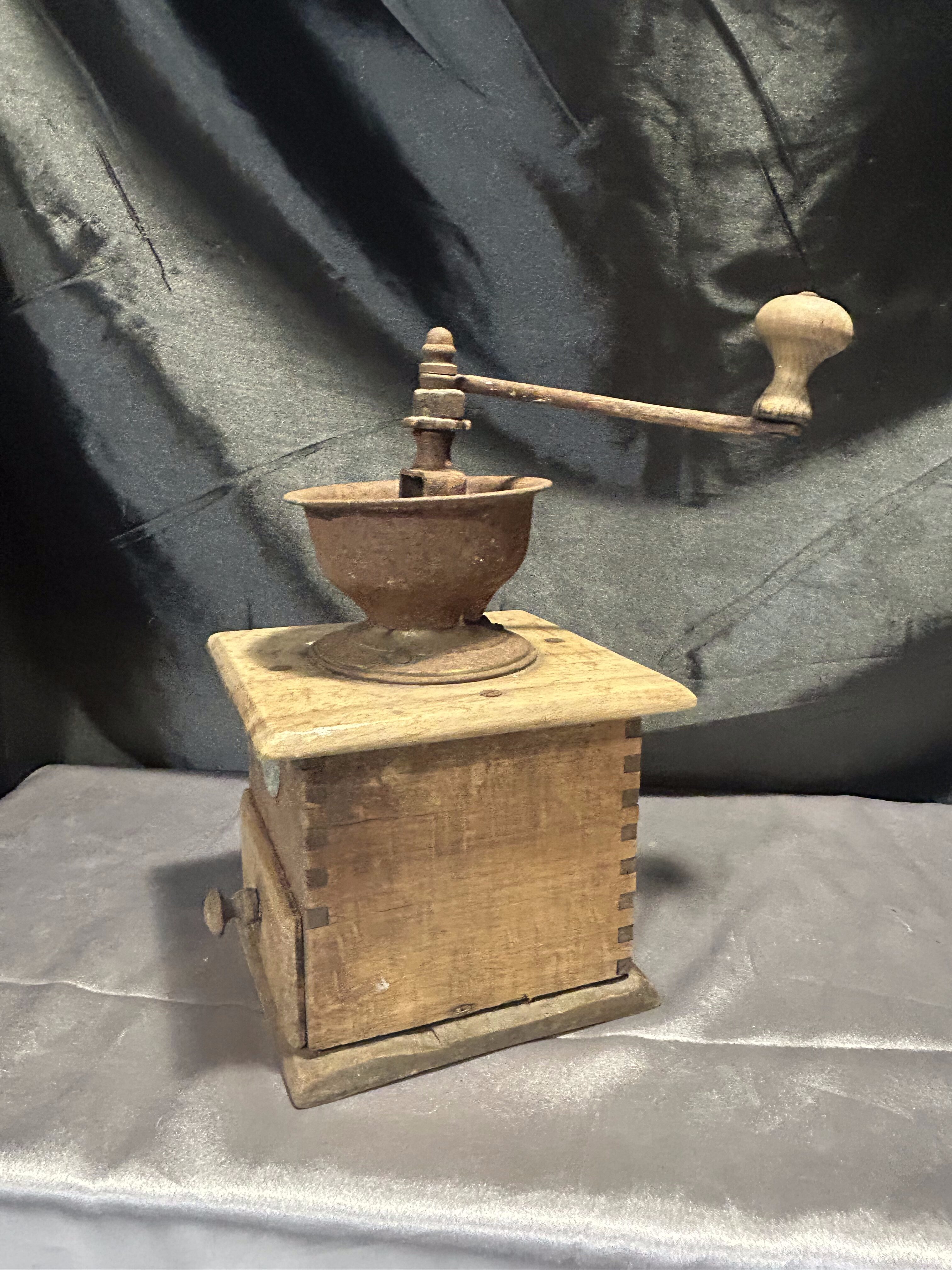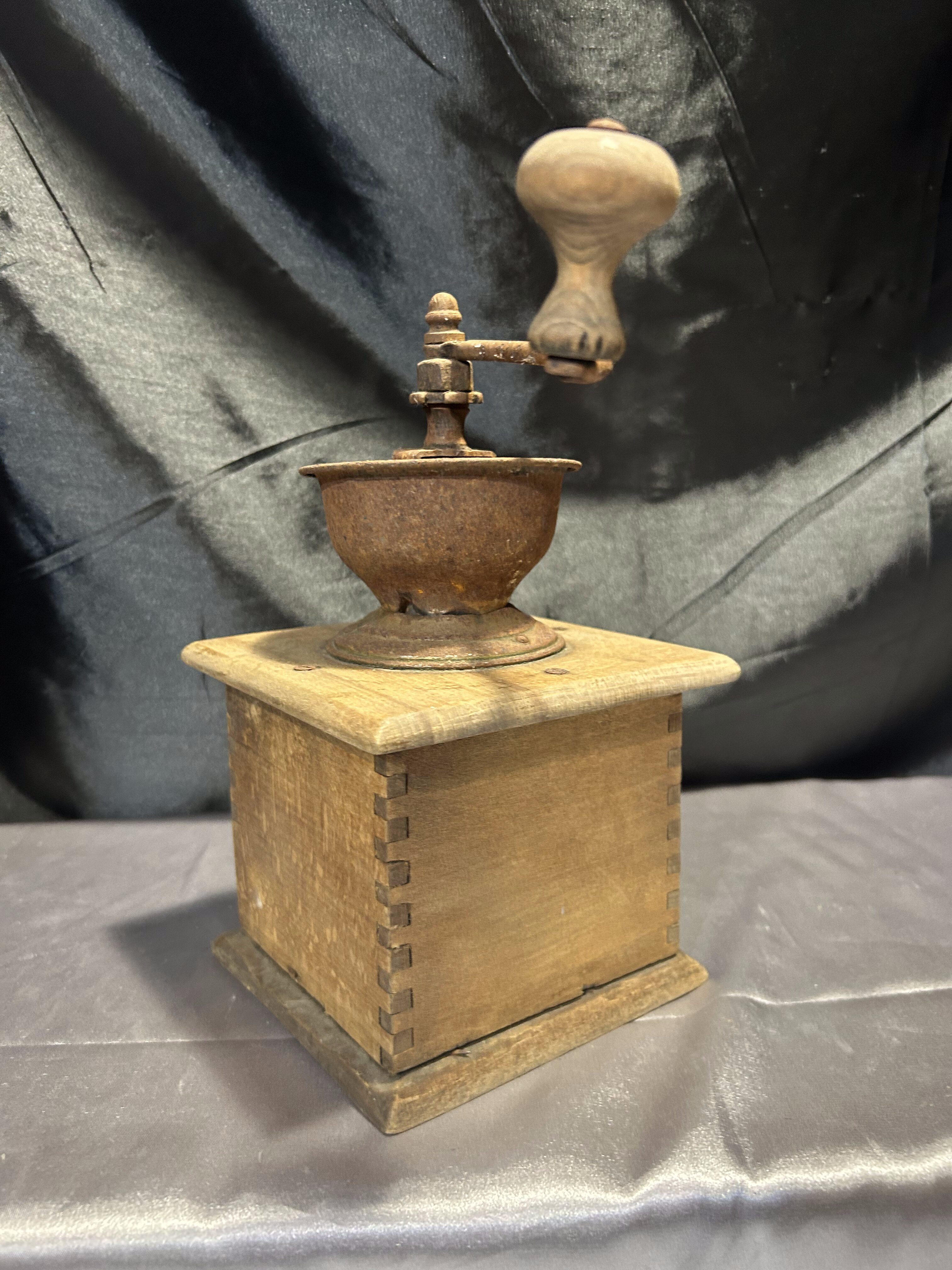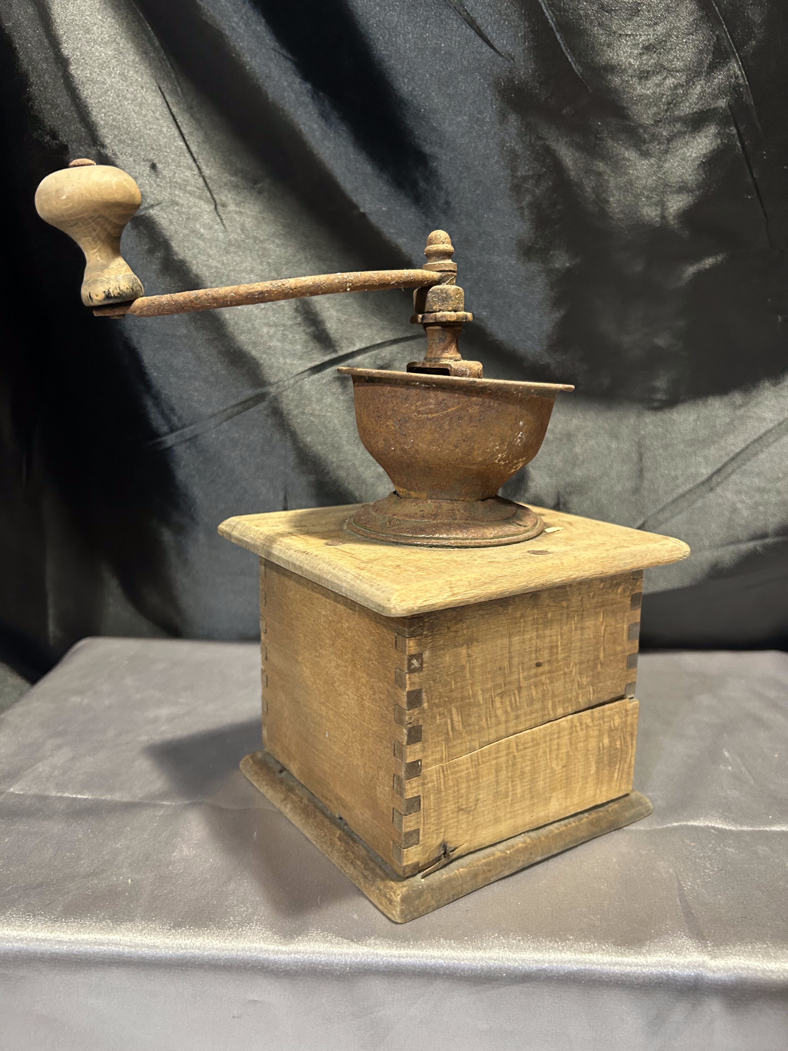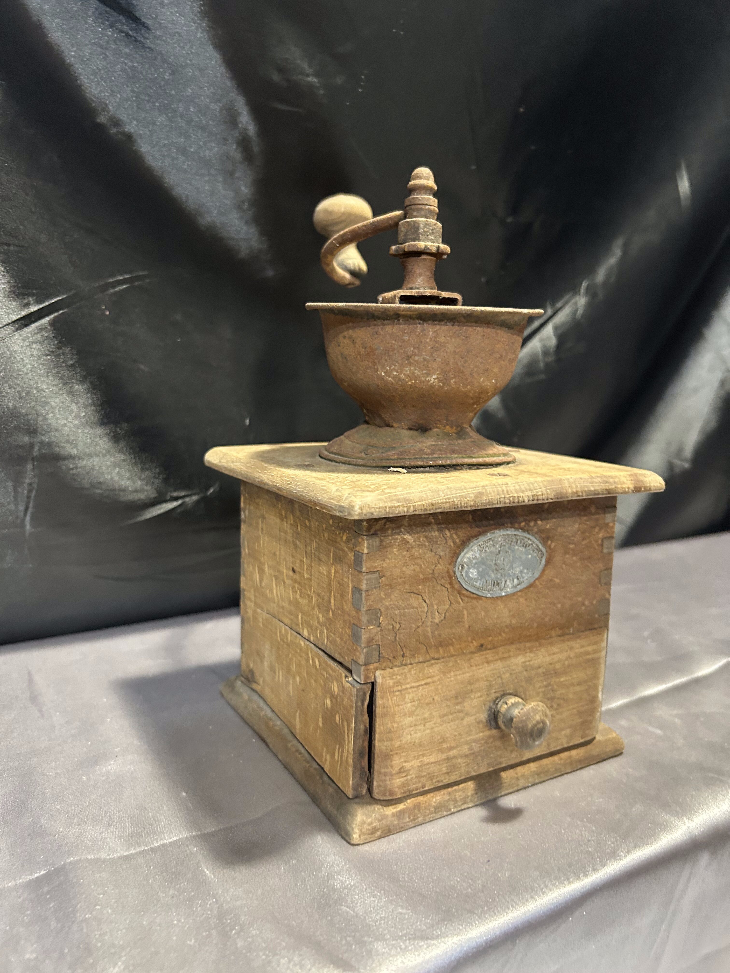 Drewniany młynek do kawy – Z szufladką – Sygnowany – Styl vintage