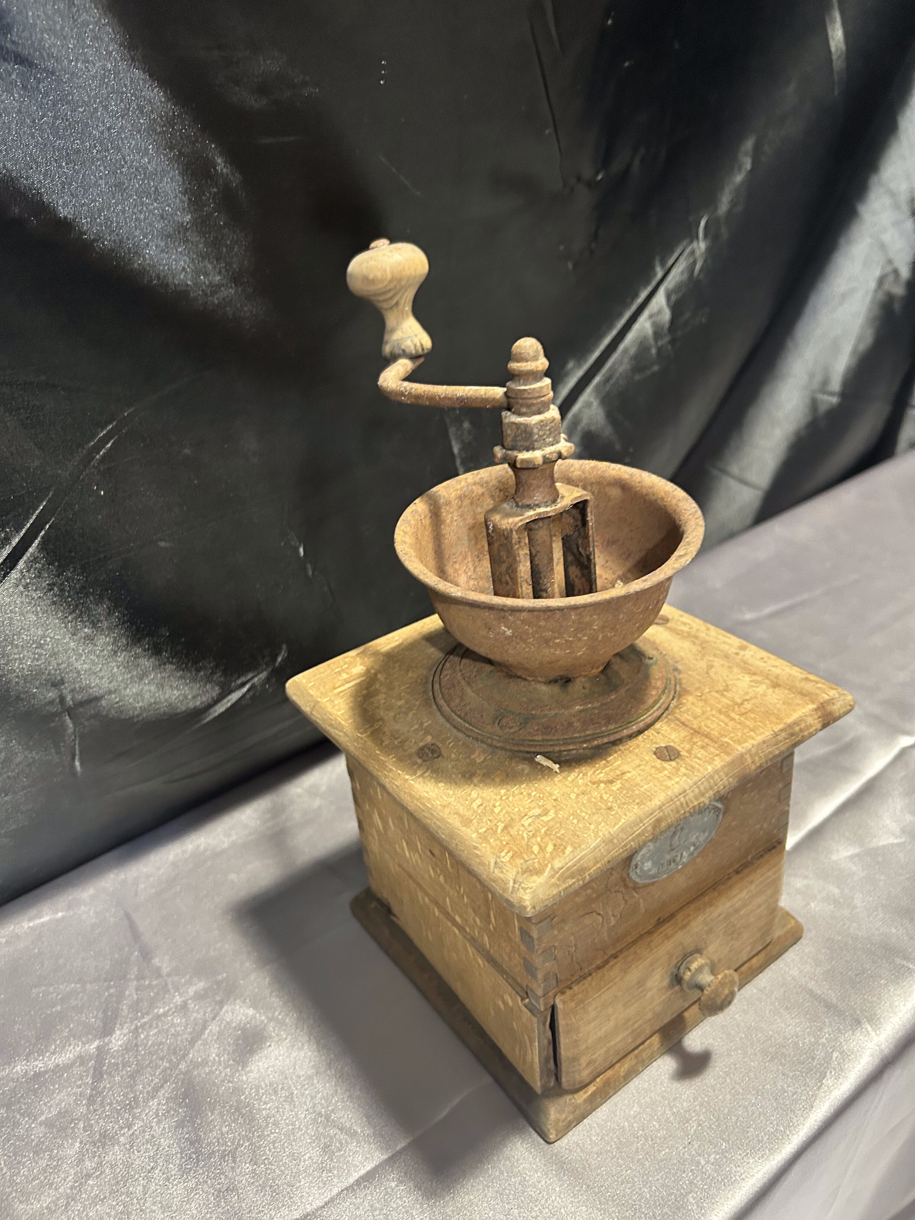 Na sprzedaż stary, klasyczny młynek do kawy wykonany z drewna, wyposażony w charakterystyczną szufladkę na zmielone ziarna. Sygnowany egzemplarz o solidnej konstrukcji i eleganckiej formie, idealny dla miłośników dawnych przedmiotów z duszą. Doskonale sprawdzi się jako funkcjonalny element kuchni lub stylowa dekoracja.