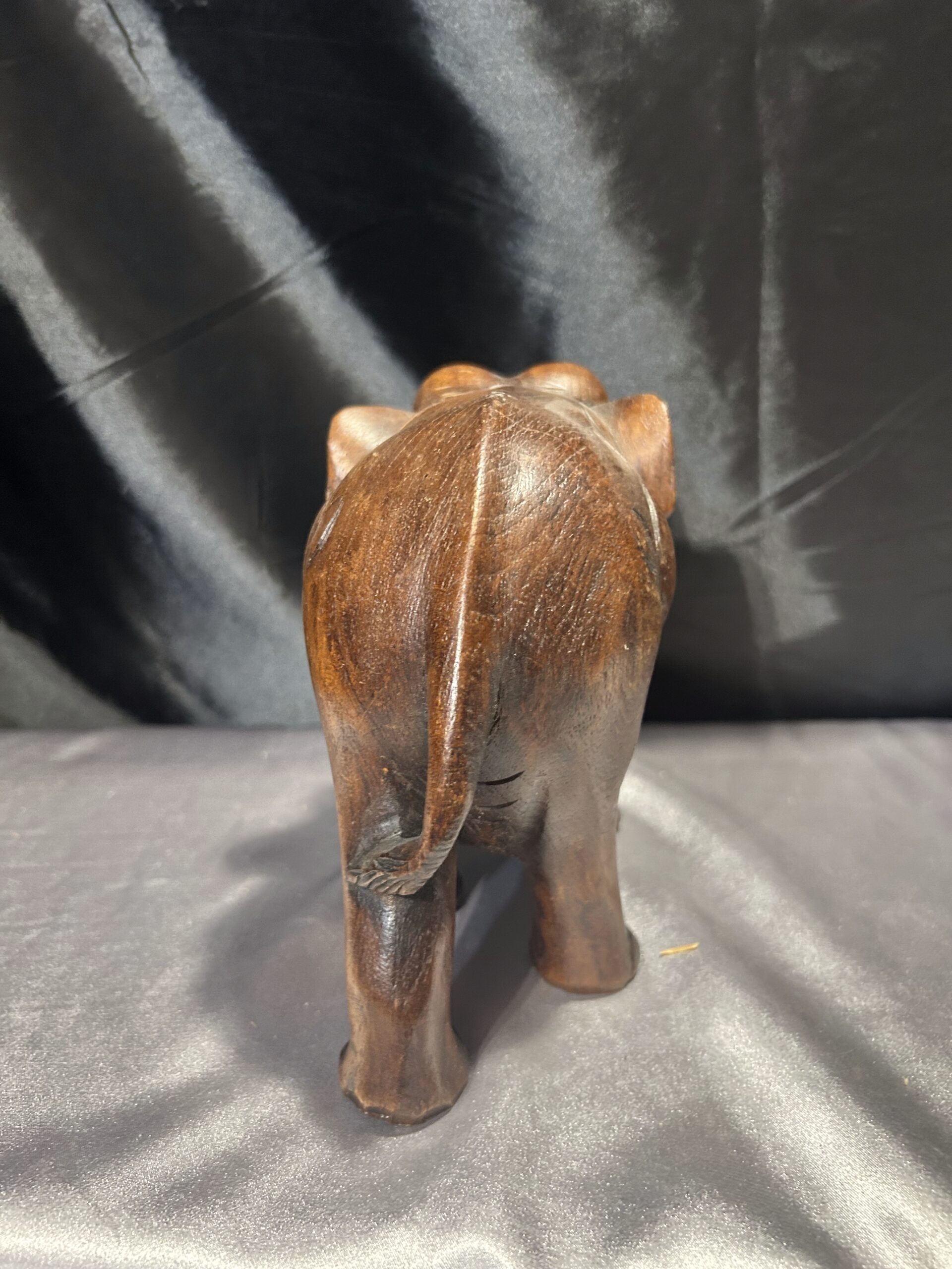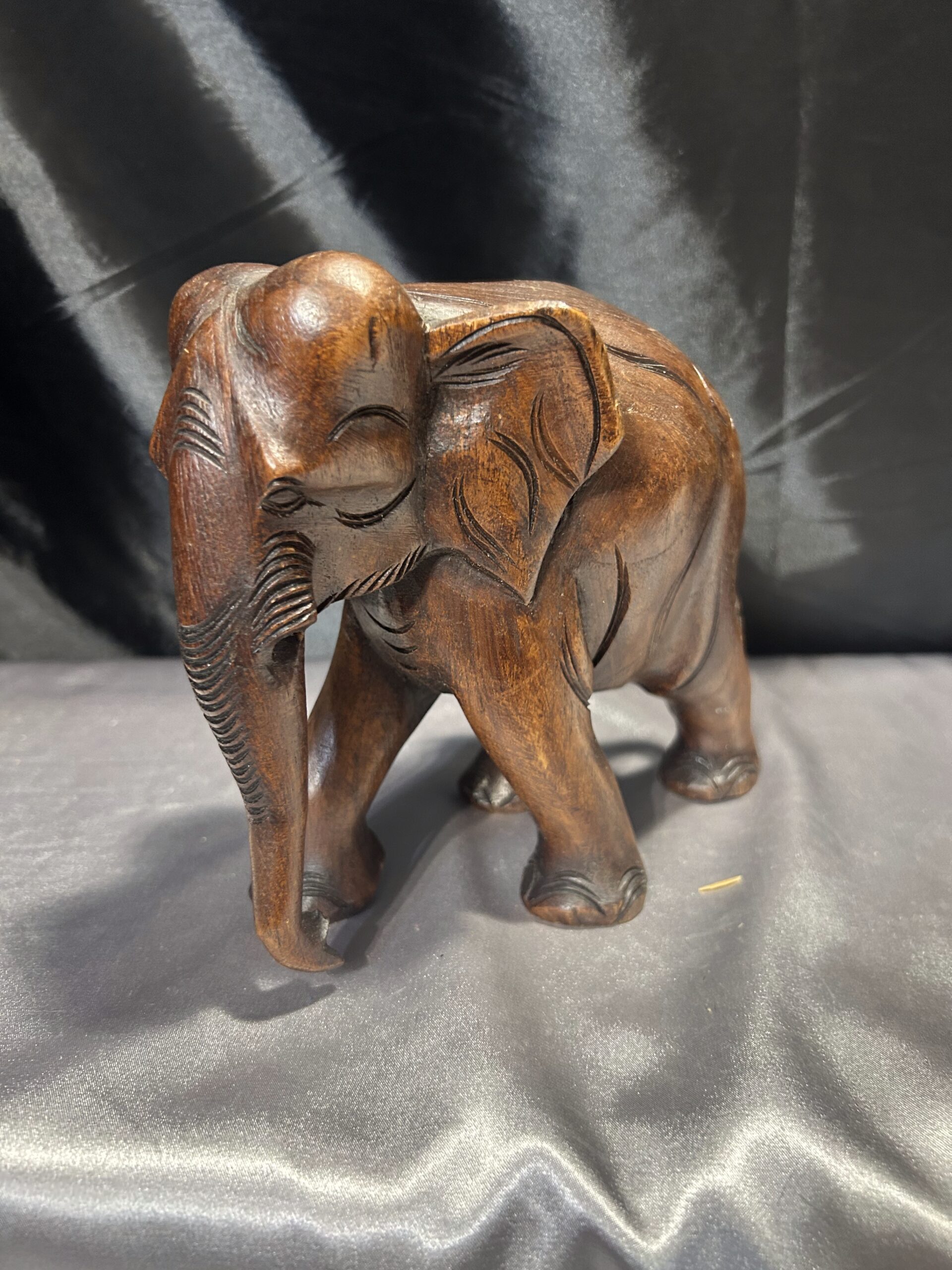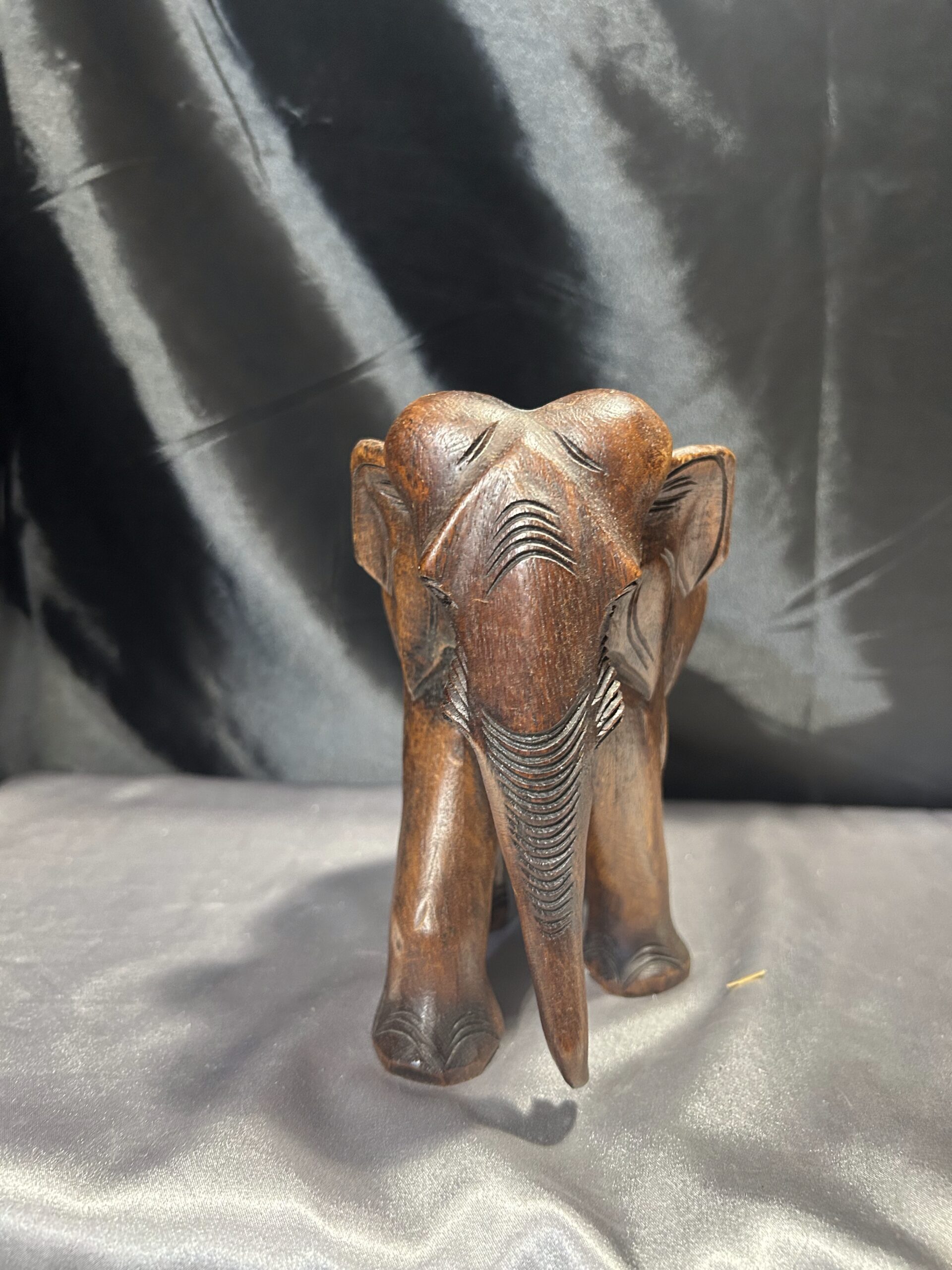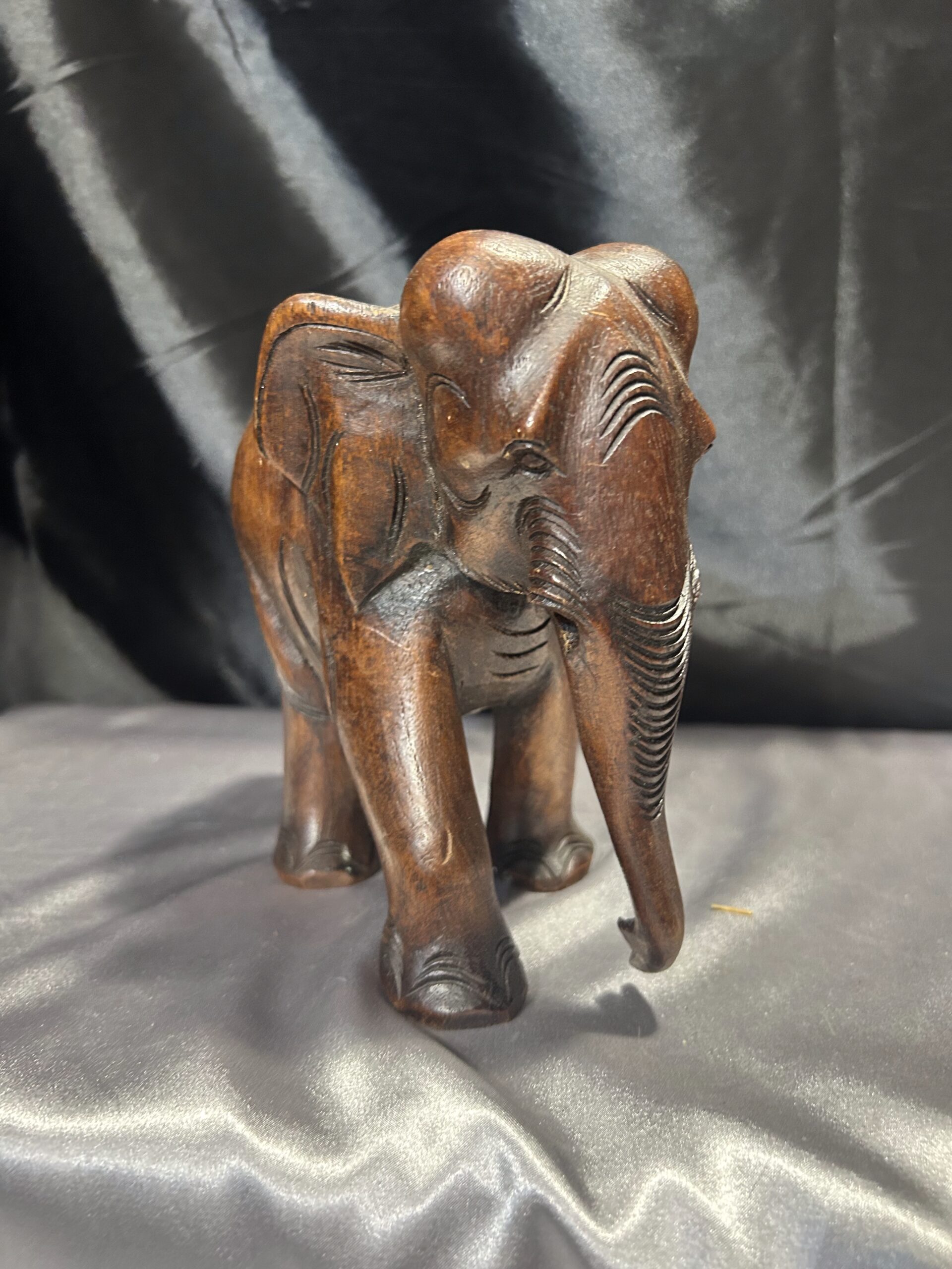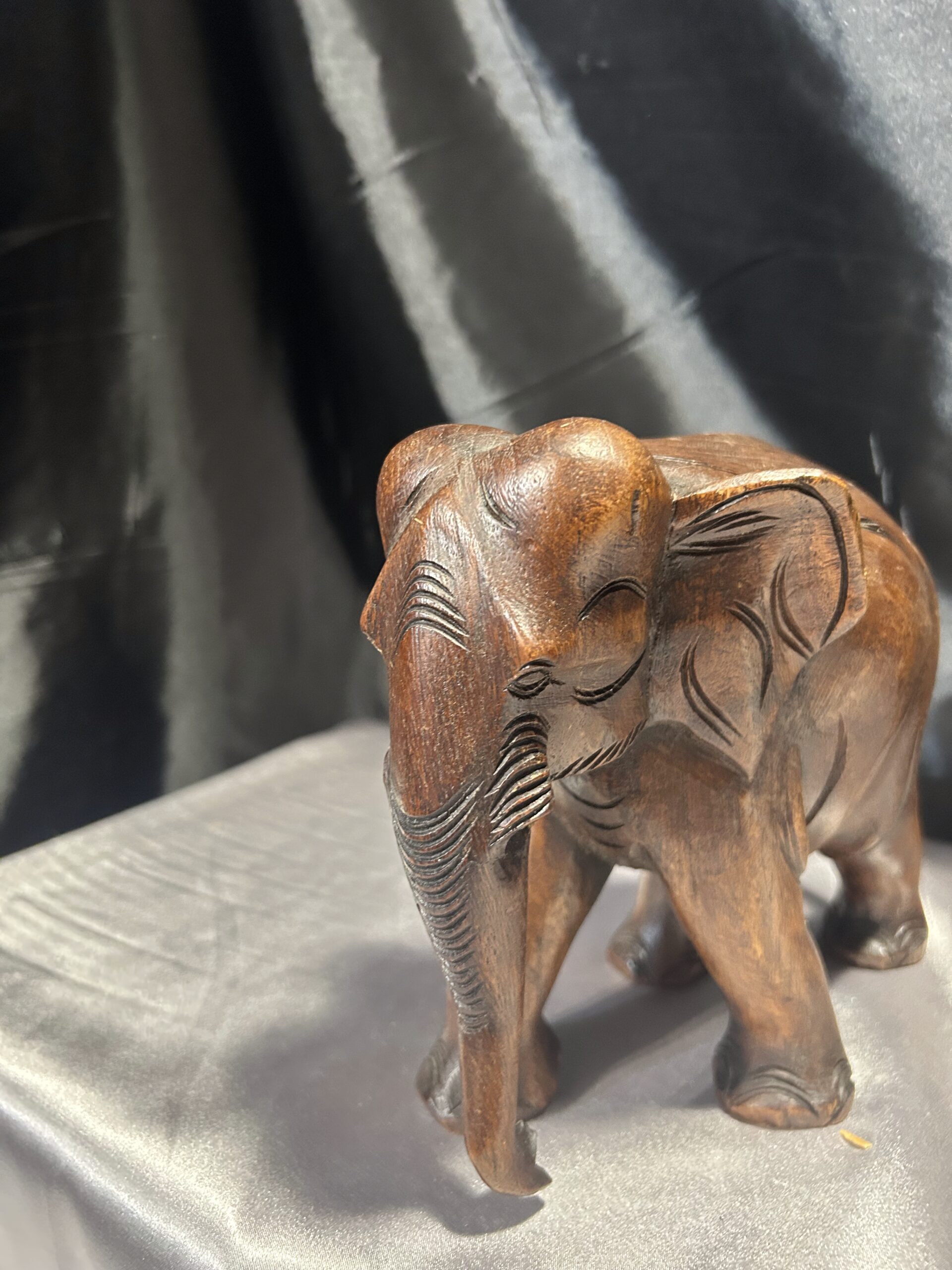 Drewniany słoń – ciemnobrązowa rzeźba z trąbą skierowaną w dół