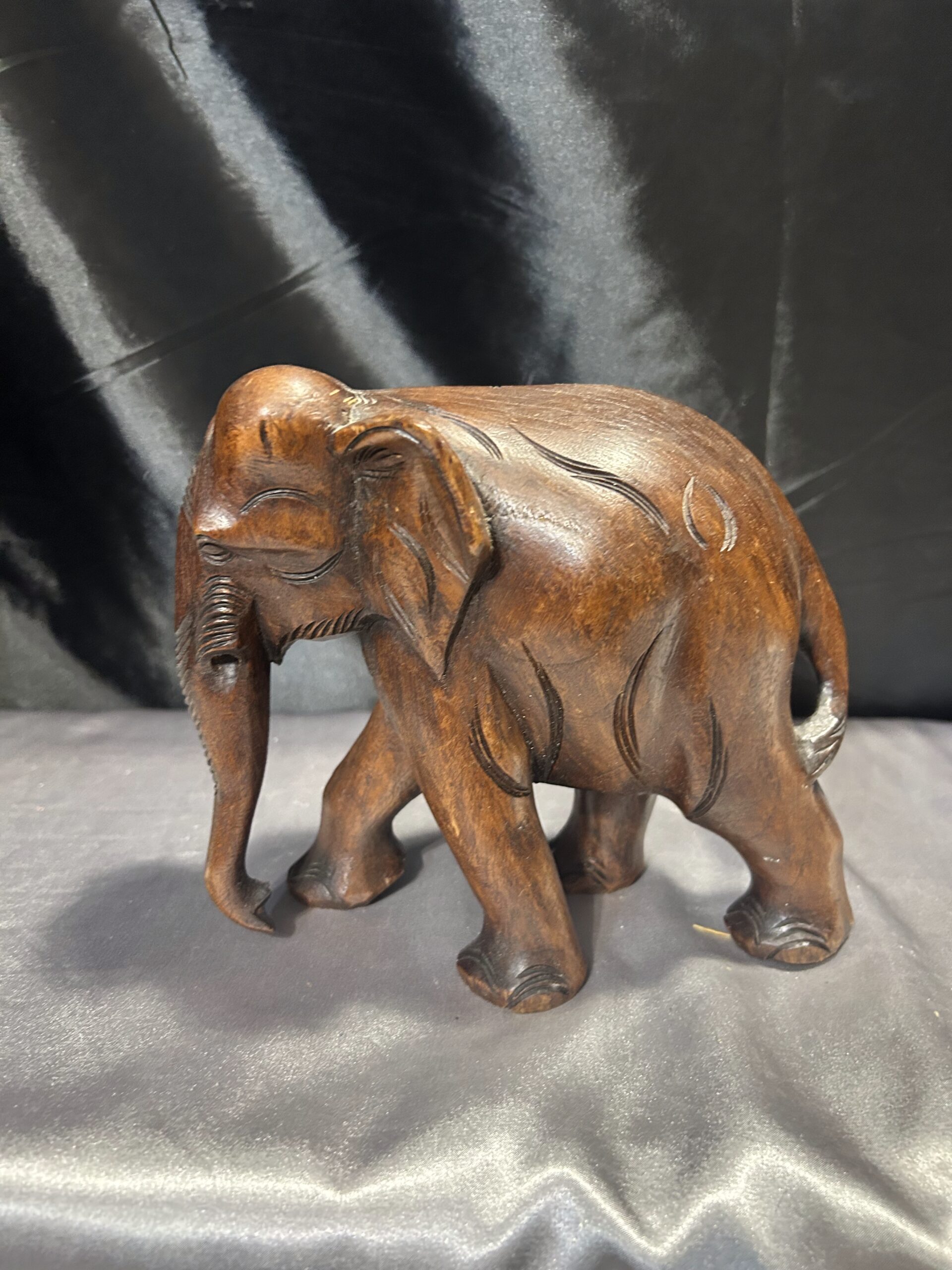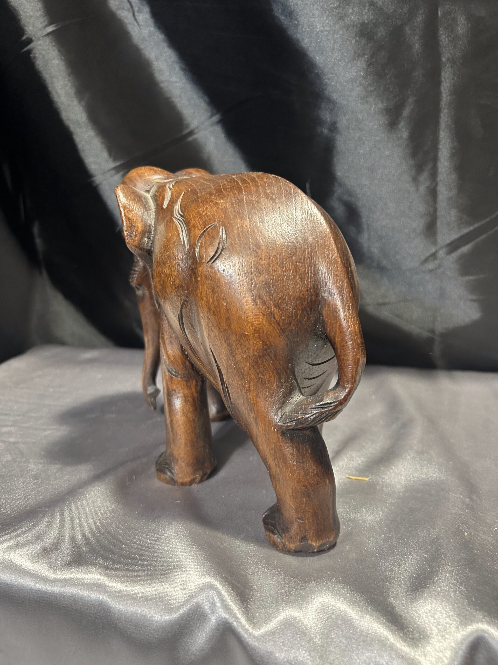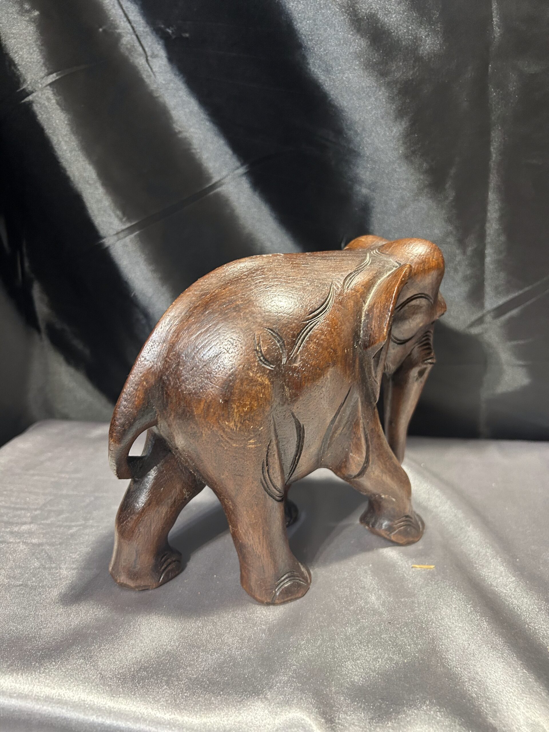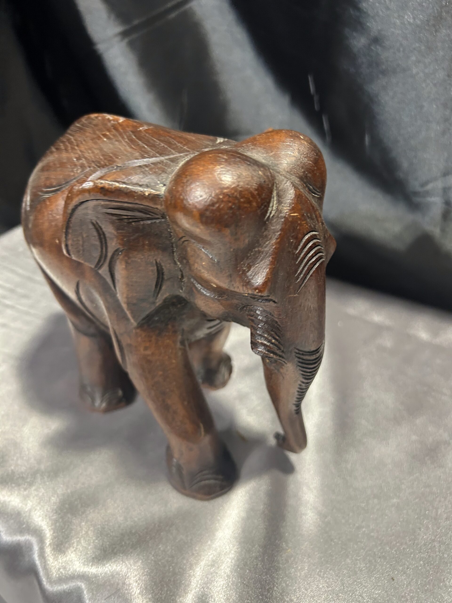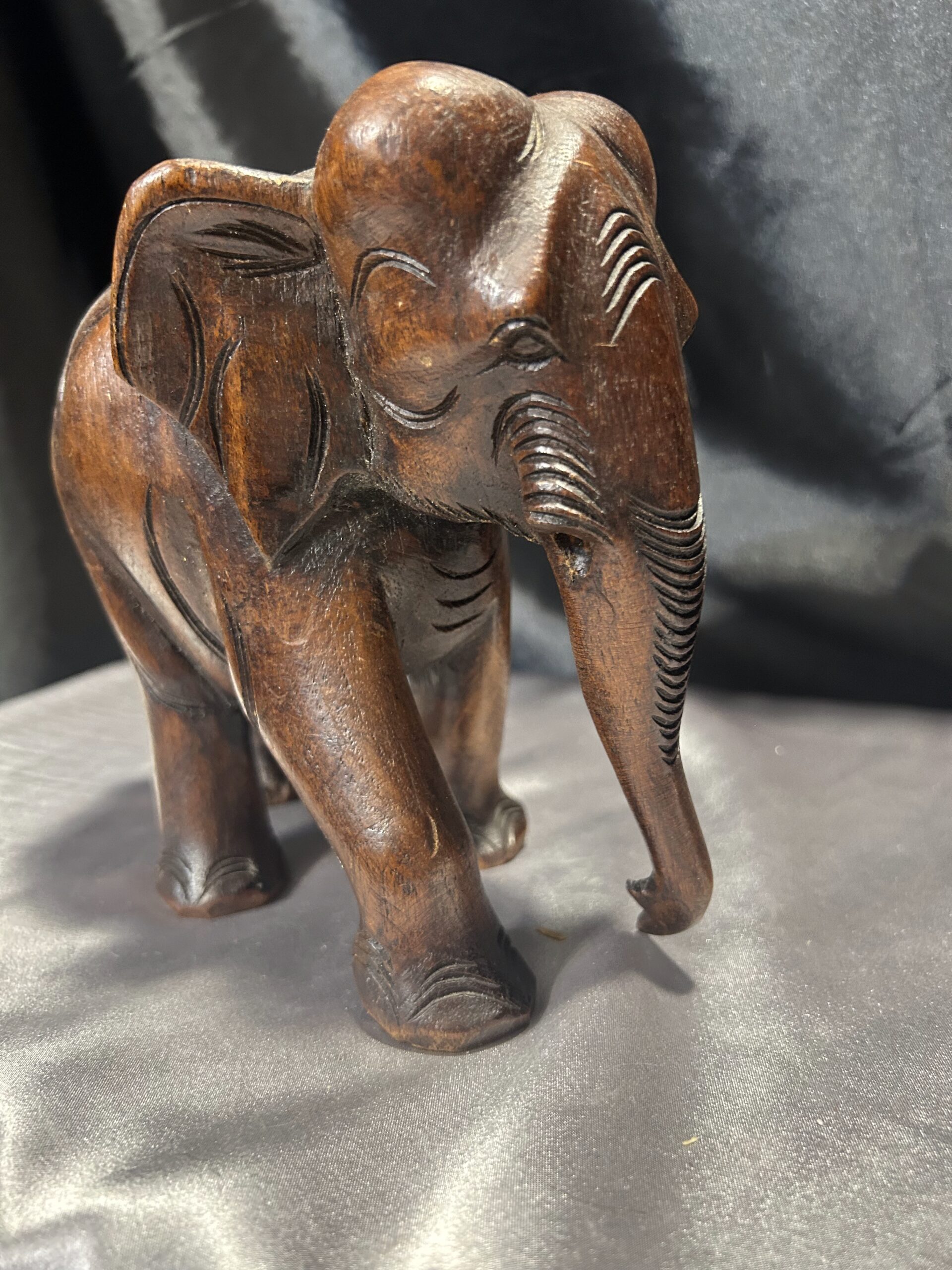 Drewniany słoń – ciemnobrązowa rzeźba z trąbą skierowaną w dół