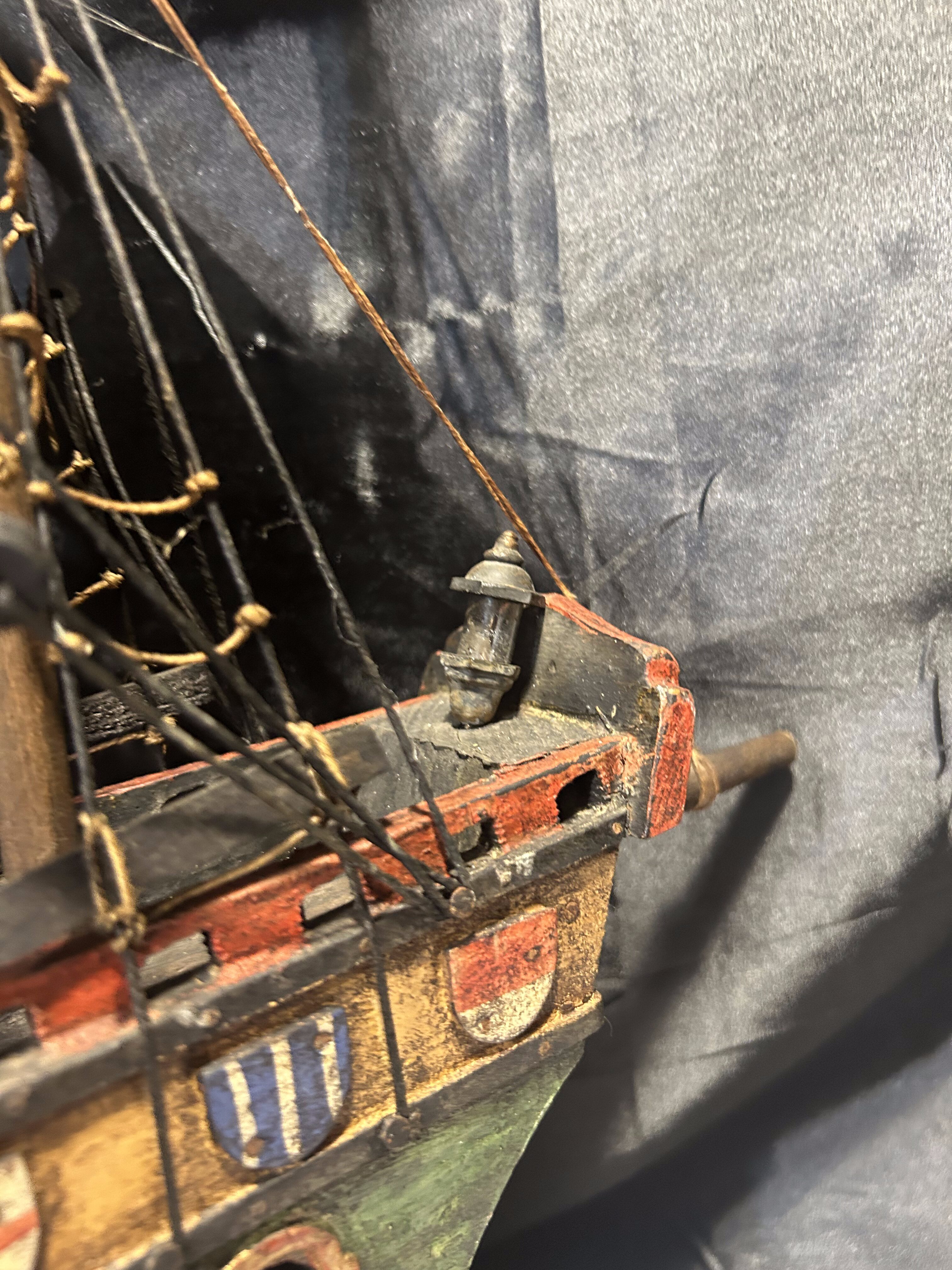 Imponujący statek żaglowy typu fregata, wykonany ręcznie z jednego kawałka drewna. Model wyróżnia się pięknym rzemiosłem, stonowaną kolorystyką oraz realistycznym odwzorowaniem detali. Wyposażony w trzy maszty, prezentuje się niezwykle efektownie. Osadzony na eleganckim, drewnianym stojaku, będzie wyjątkową ozdobą salonu, gabinetu czy biura.