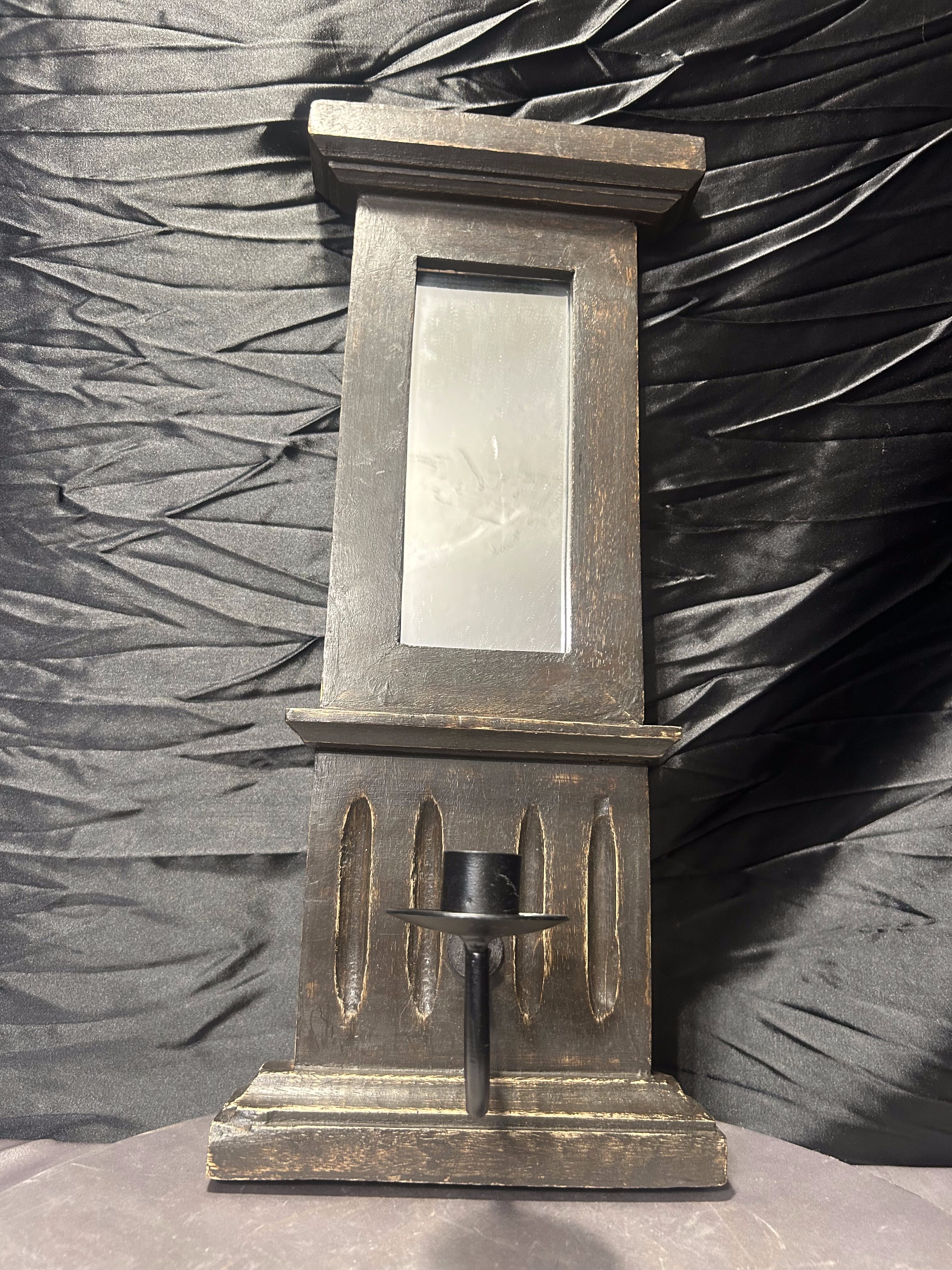 Drewniany świecznik ścienny z lusterkiem, przeznaczony do zawieszenia na ścianie. Solidna, masywna forma nawiązująca do klasycznych, dawnych dekoracji wnętrz. Połączenie naturalnego drewna z lustrem tworzy elegancki i ponadczasowy akcent dekoracyjny, który pięknie odbija światło świecy.