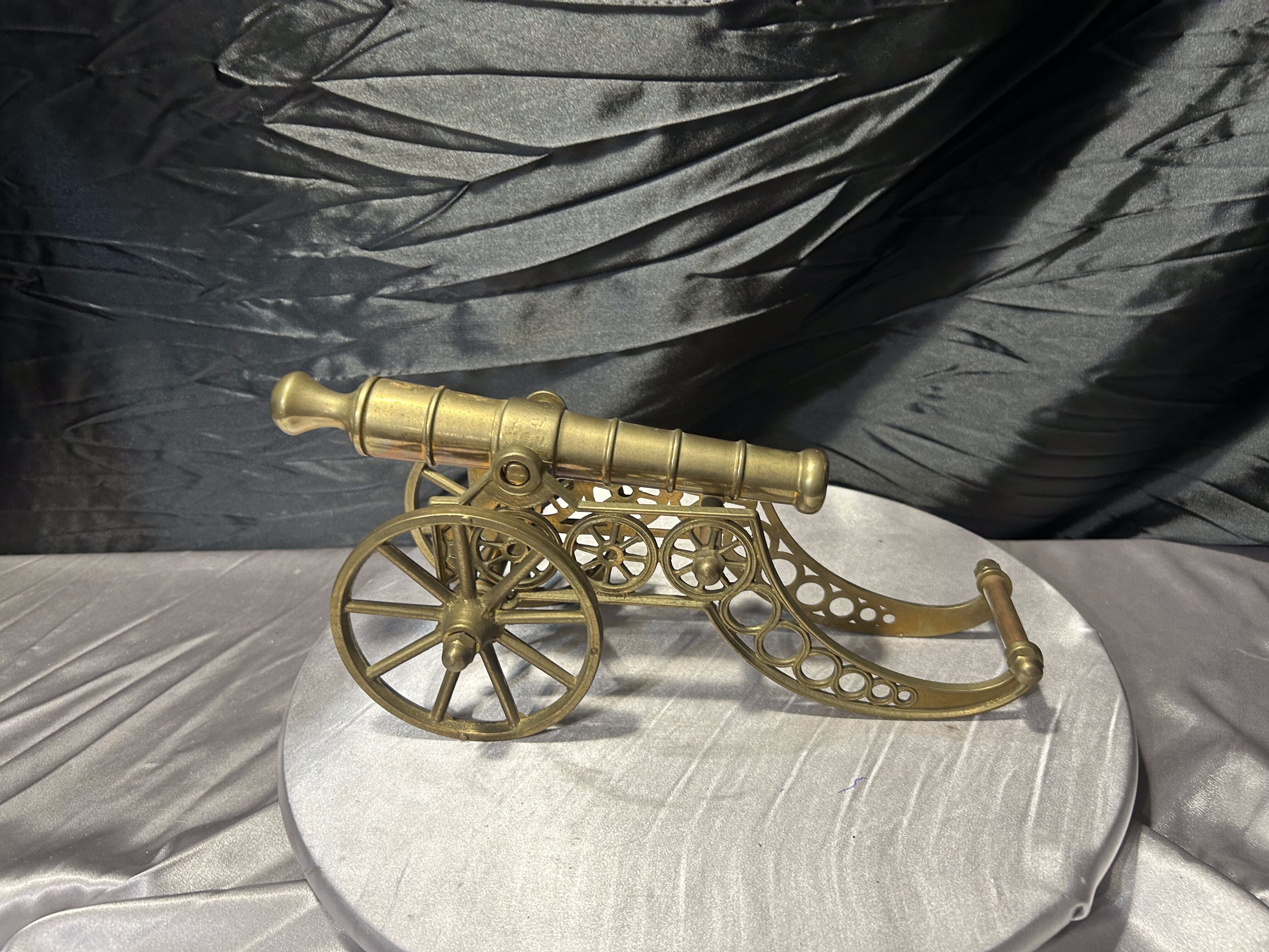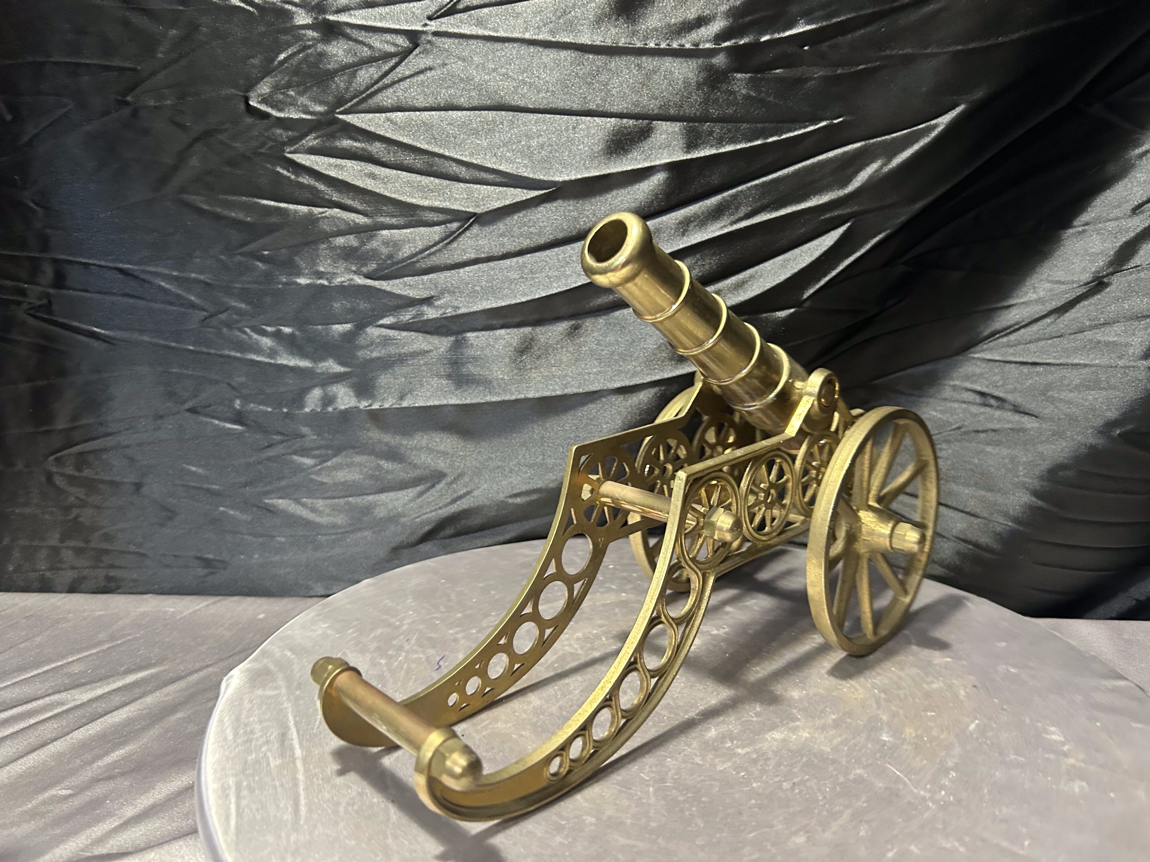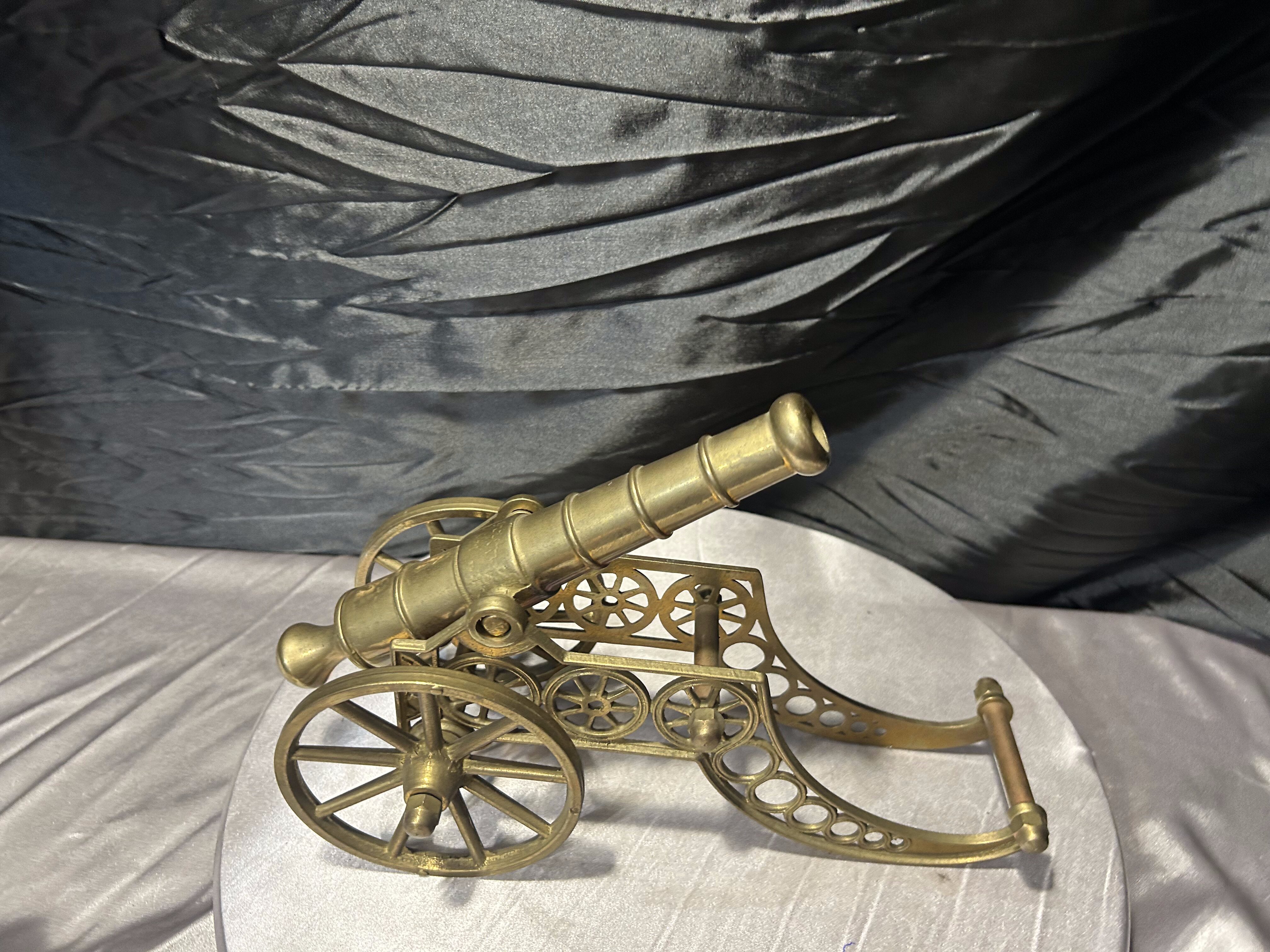 Efektowna, duża armata dekoracyjna wykonana z mosiądzu, osadzona na ozdobnej lawecie z ażurowymi detalami. To przedmiot o wyrazistym, kolekcjonerskim charakterze, który przyciąga uwagę swoją skalą oraz solidnym wykonaniem.