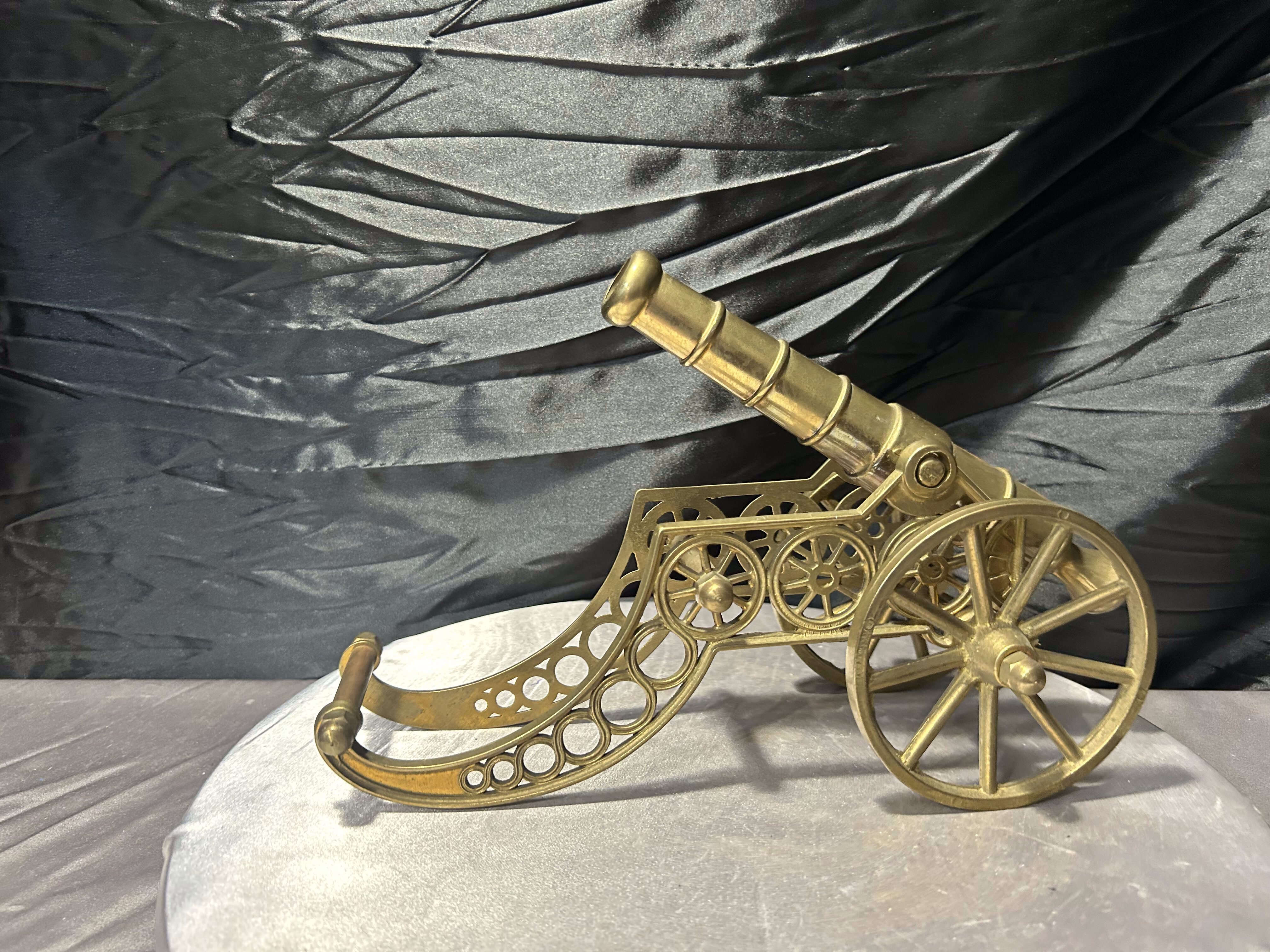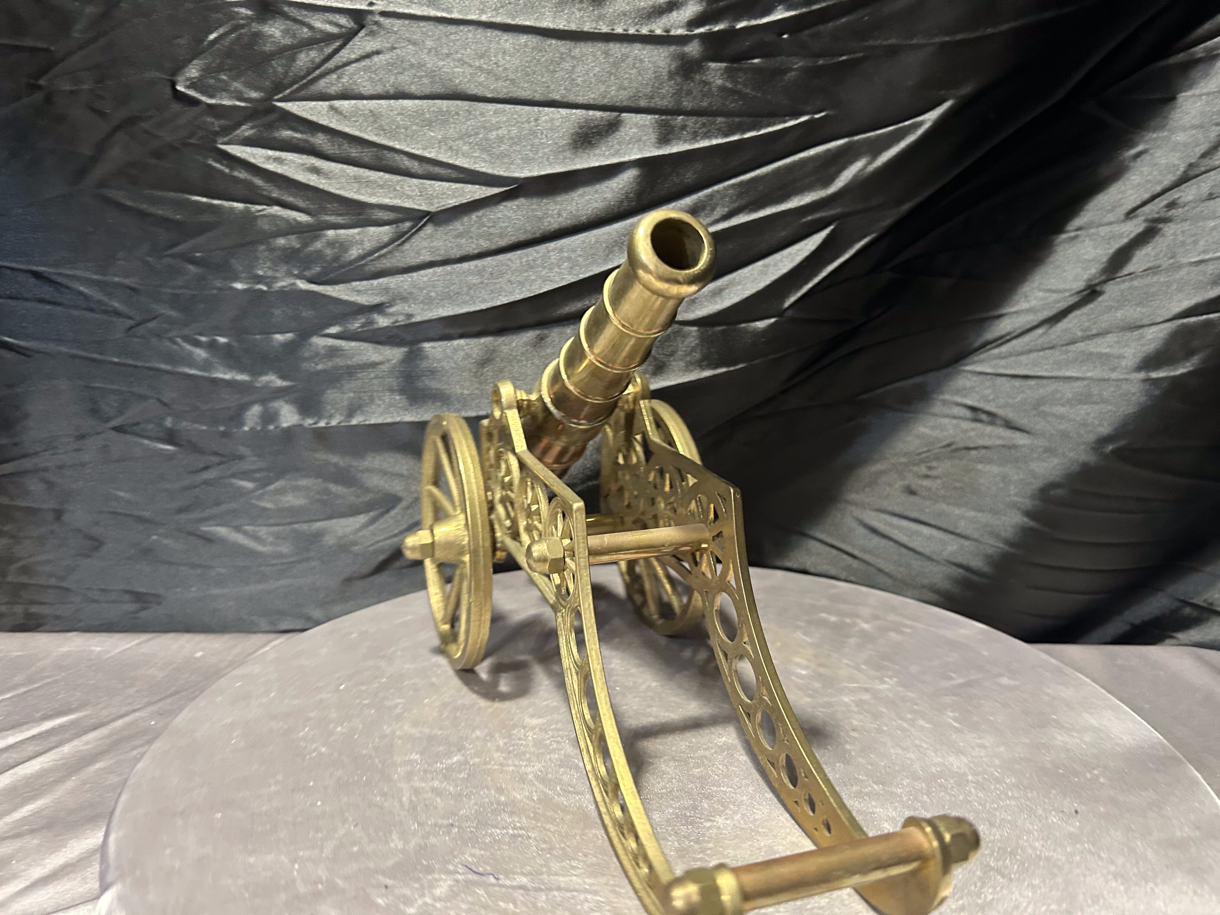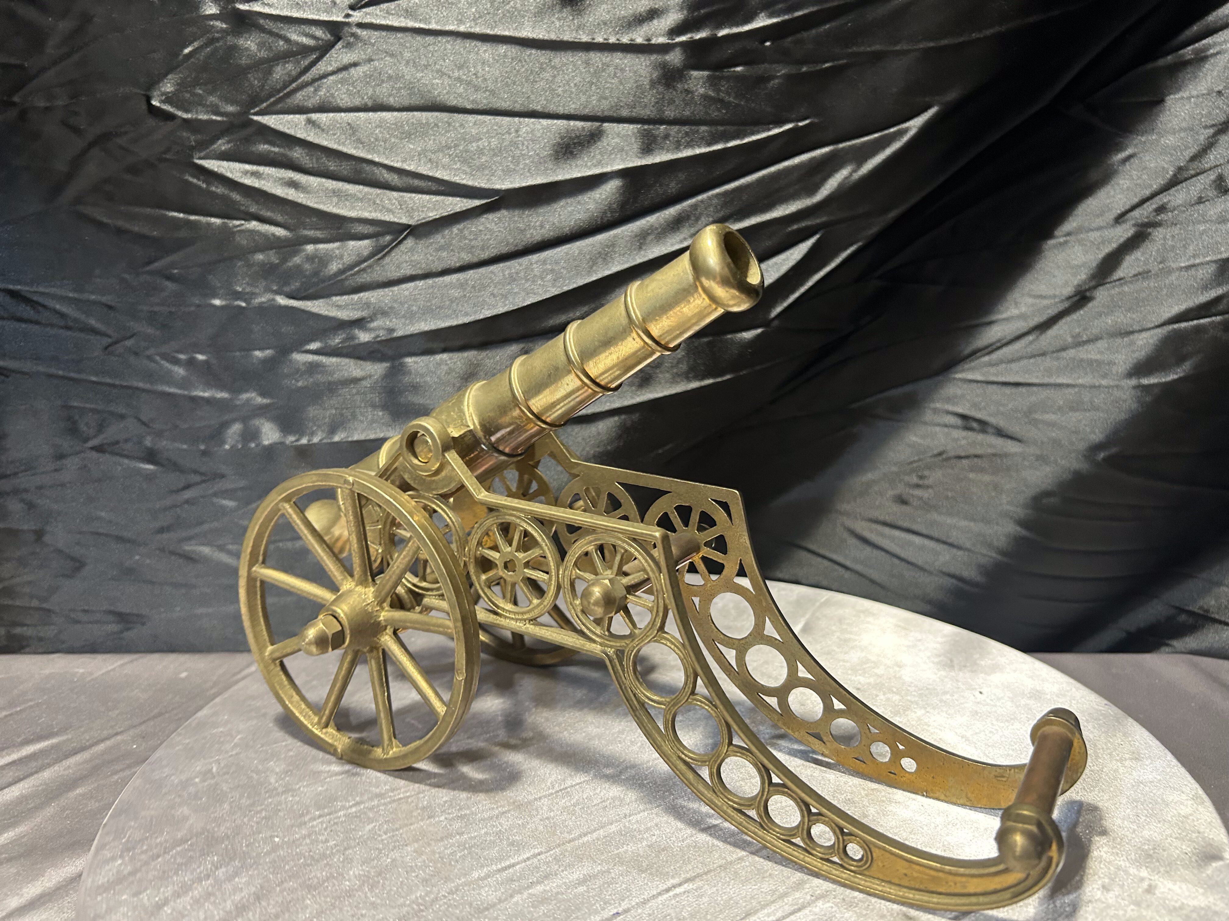 Efektowna, duża armata dekoracyjna wykonana z mosiądzu, osadzona na ozdobnej lawecie z ażurowymi detalami. To przedmiot o wyrazistym, kolekcjonerskim charakterze, który przyciąga uwagę swoją skalą oraz solidnym wykonaniem.