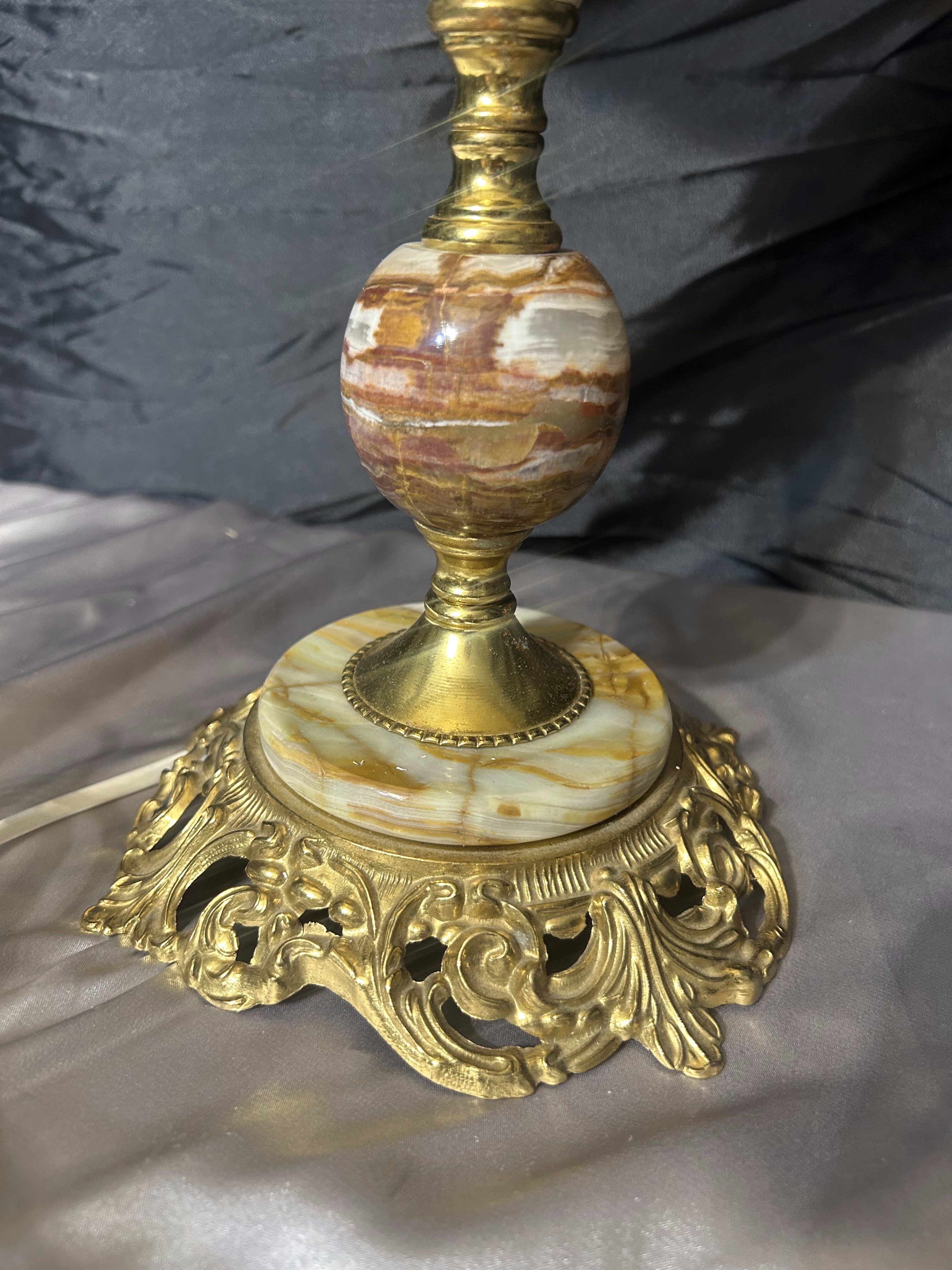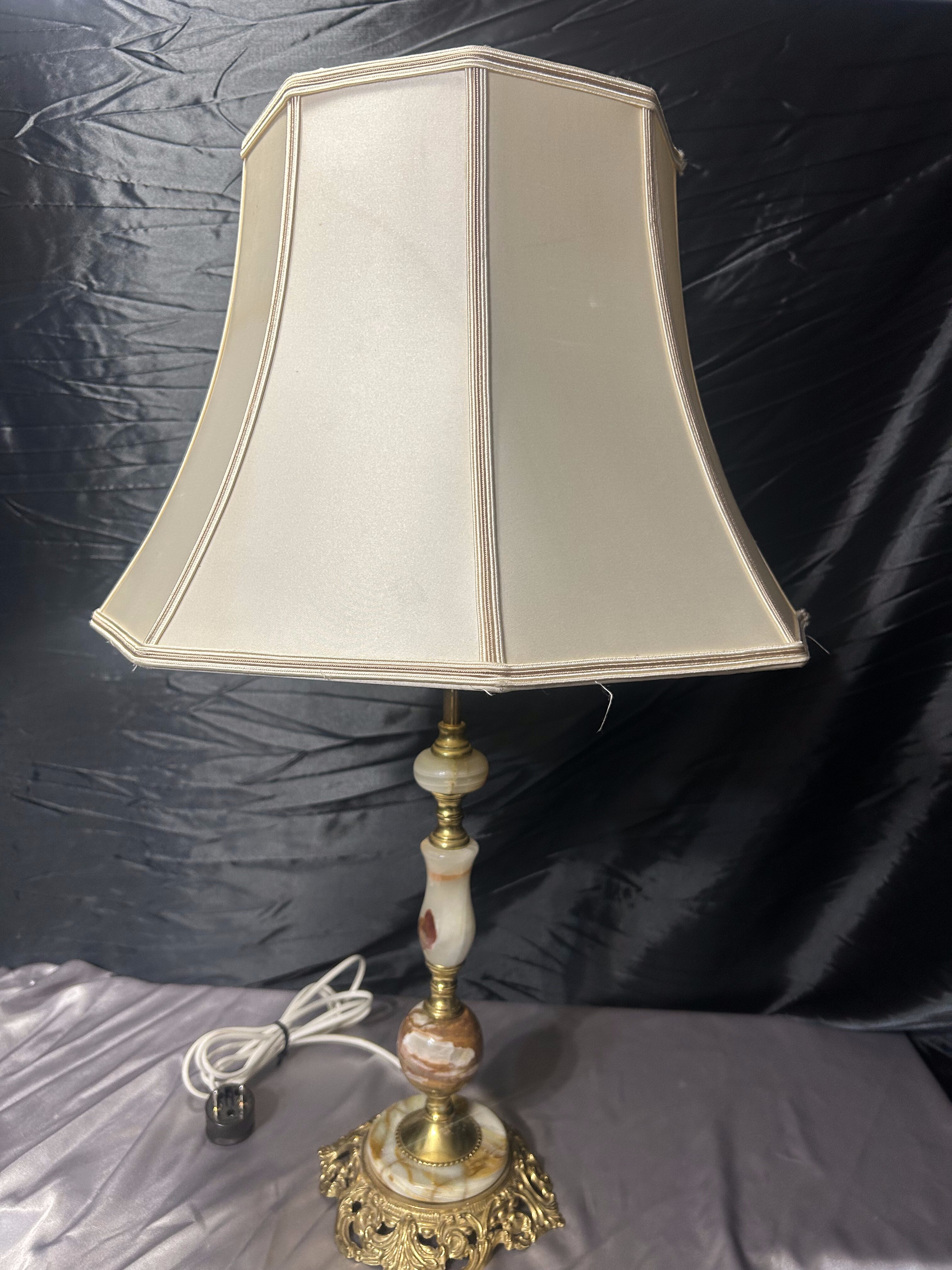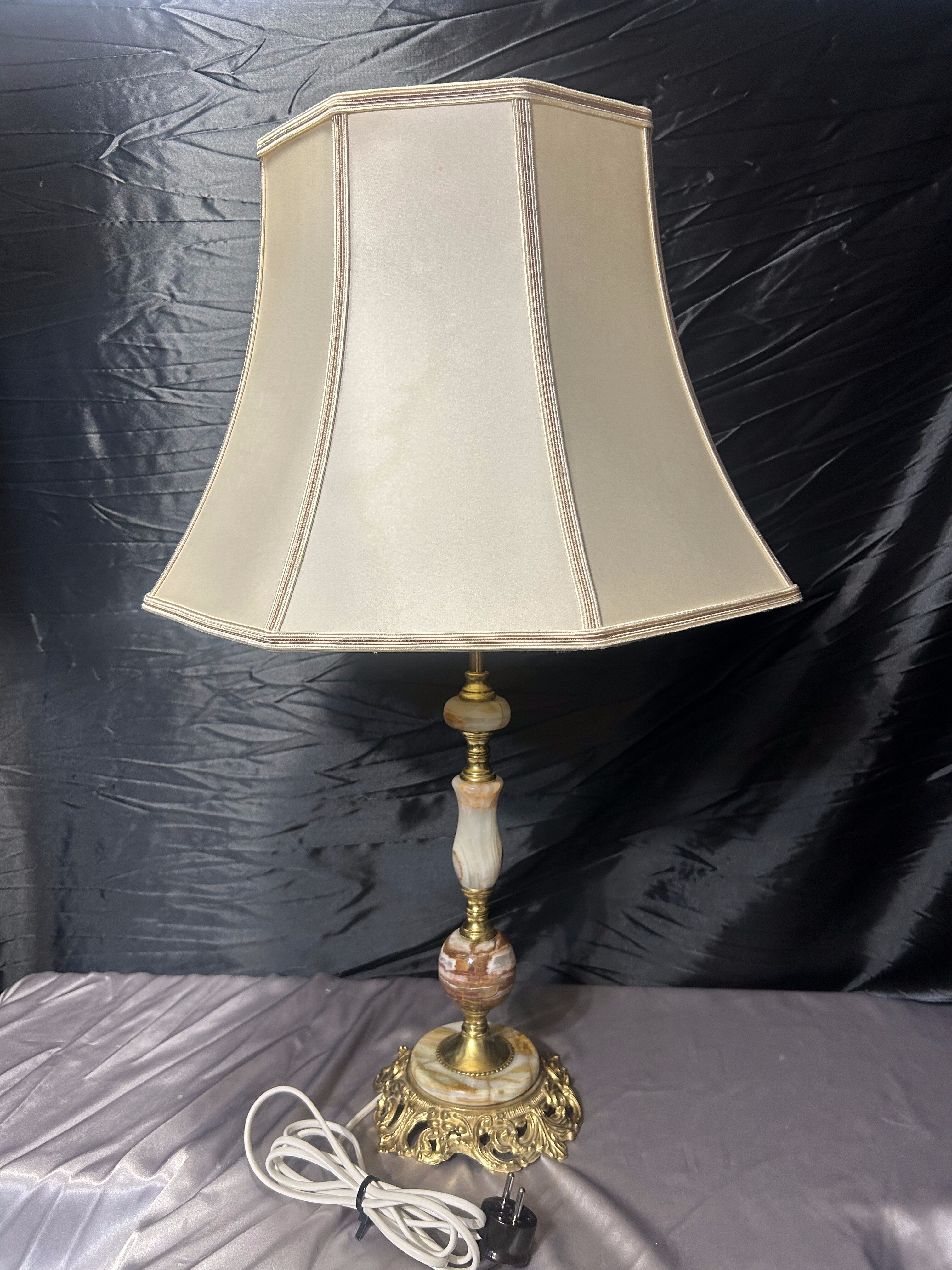 - Duża lampa stołowa z onyksu i zdobionego mosiądzu z abażurem – klasyczna elegancja