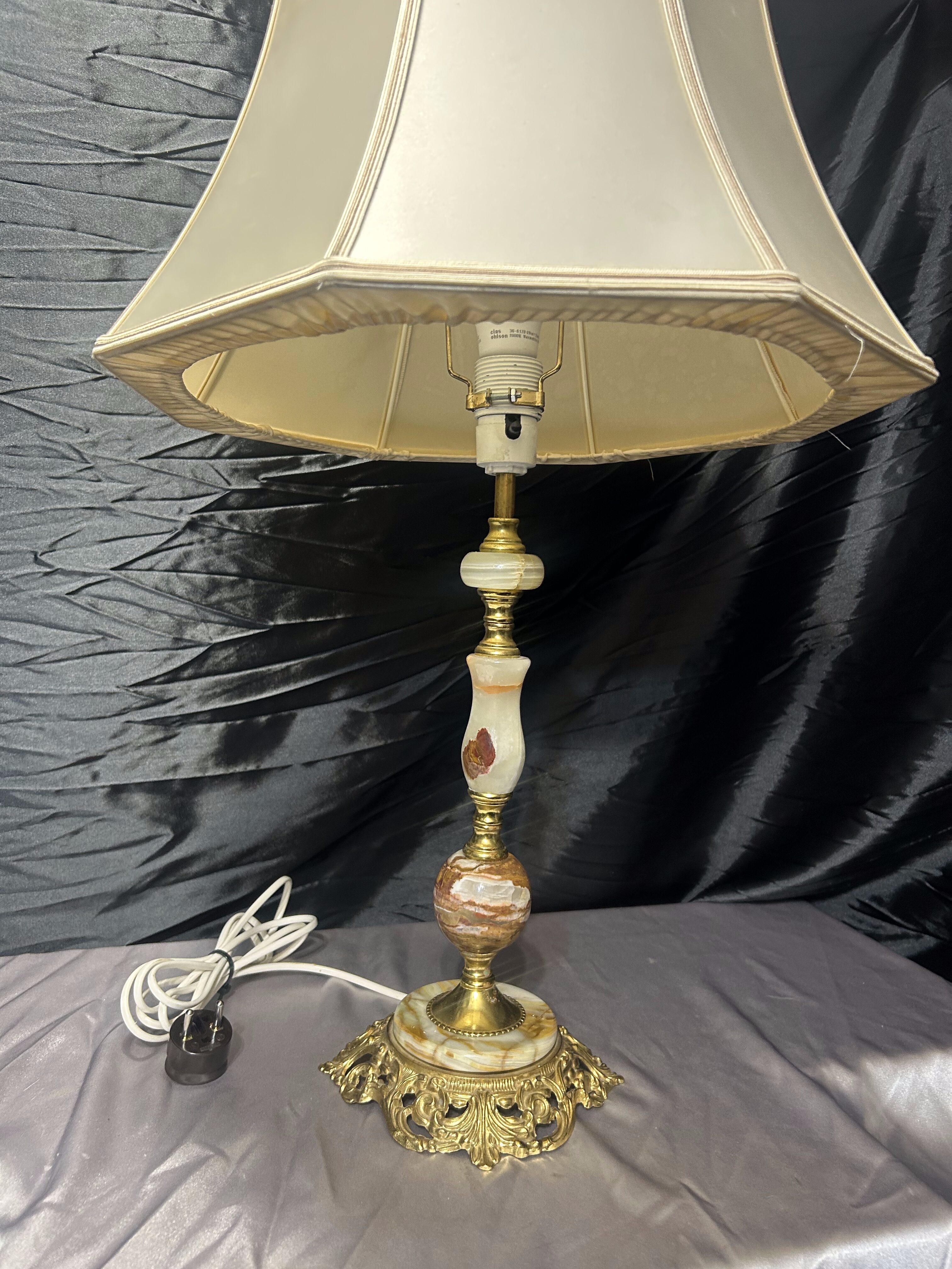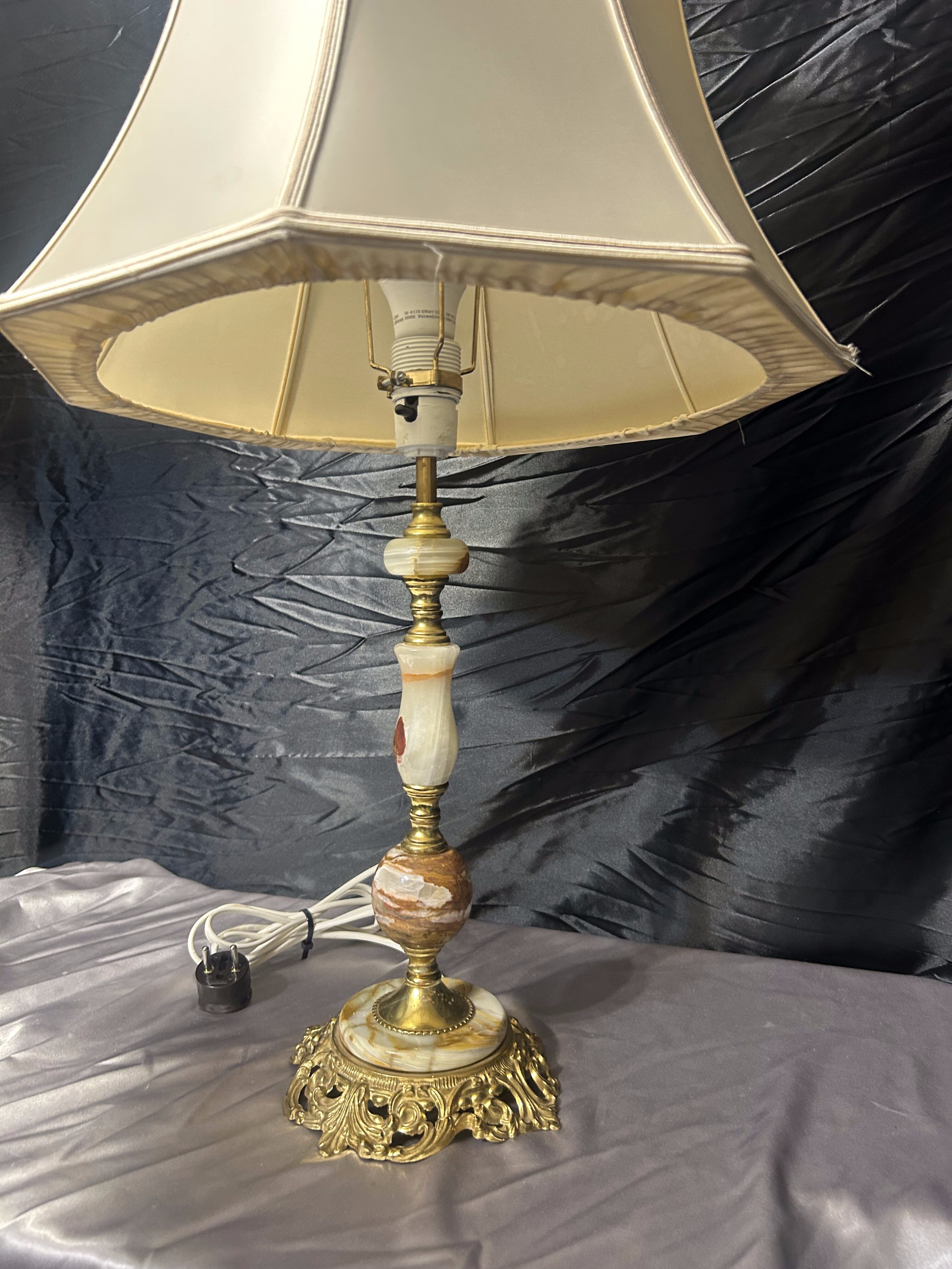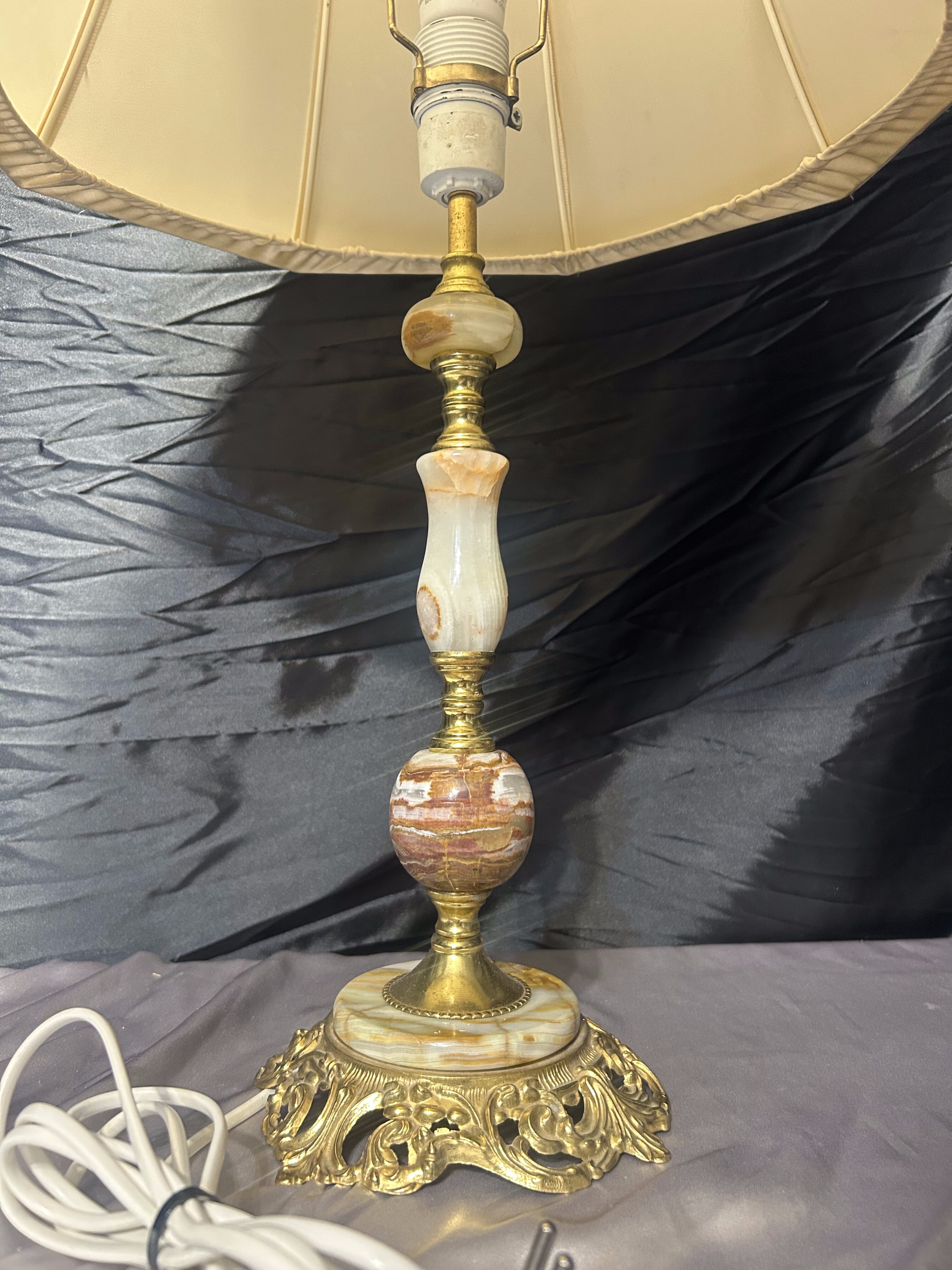 - Duża lampa stołowa z onyksu i zdobionego mosiądzu z abażurem – klasyczna elegancja