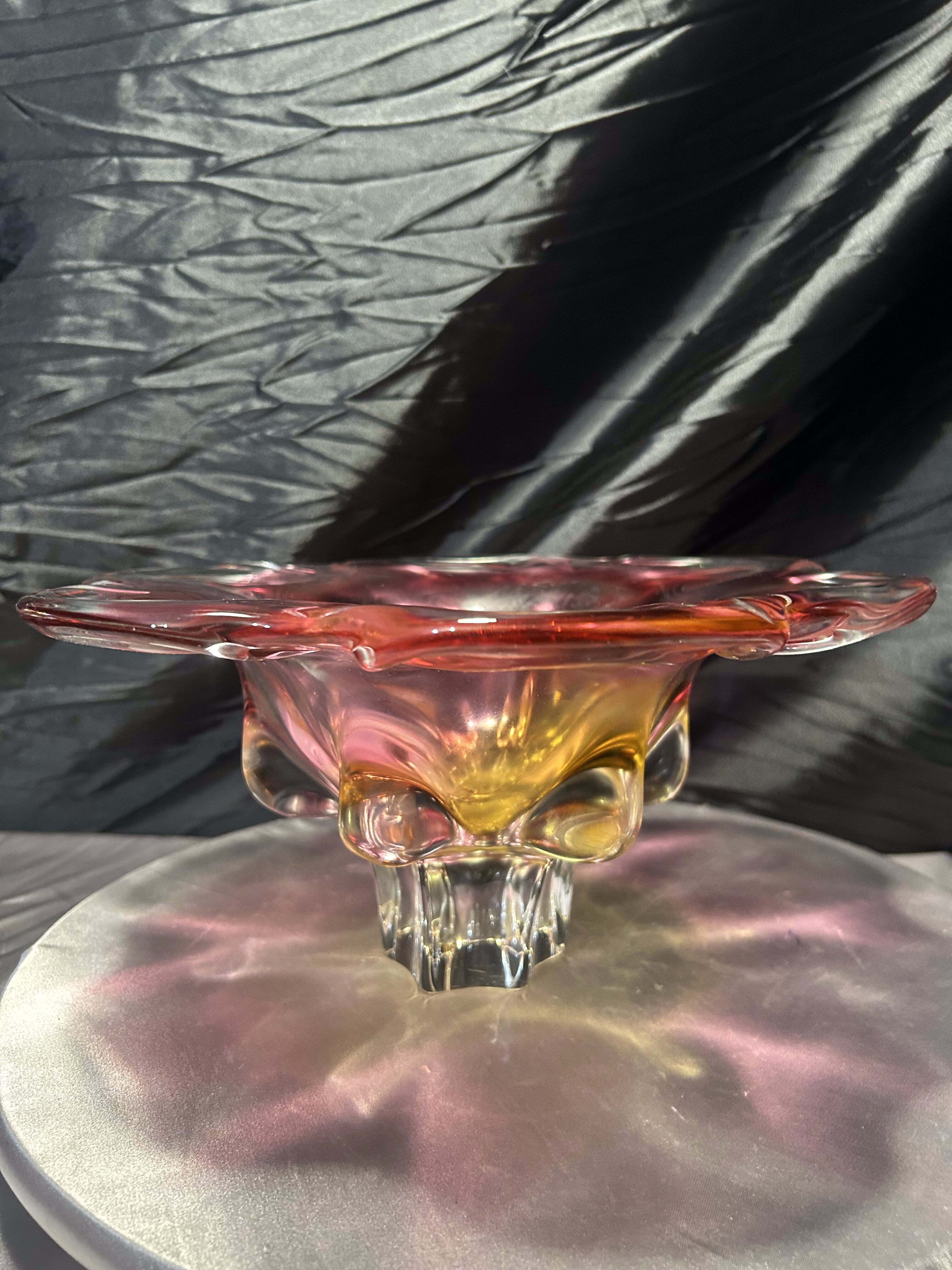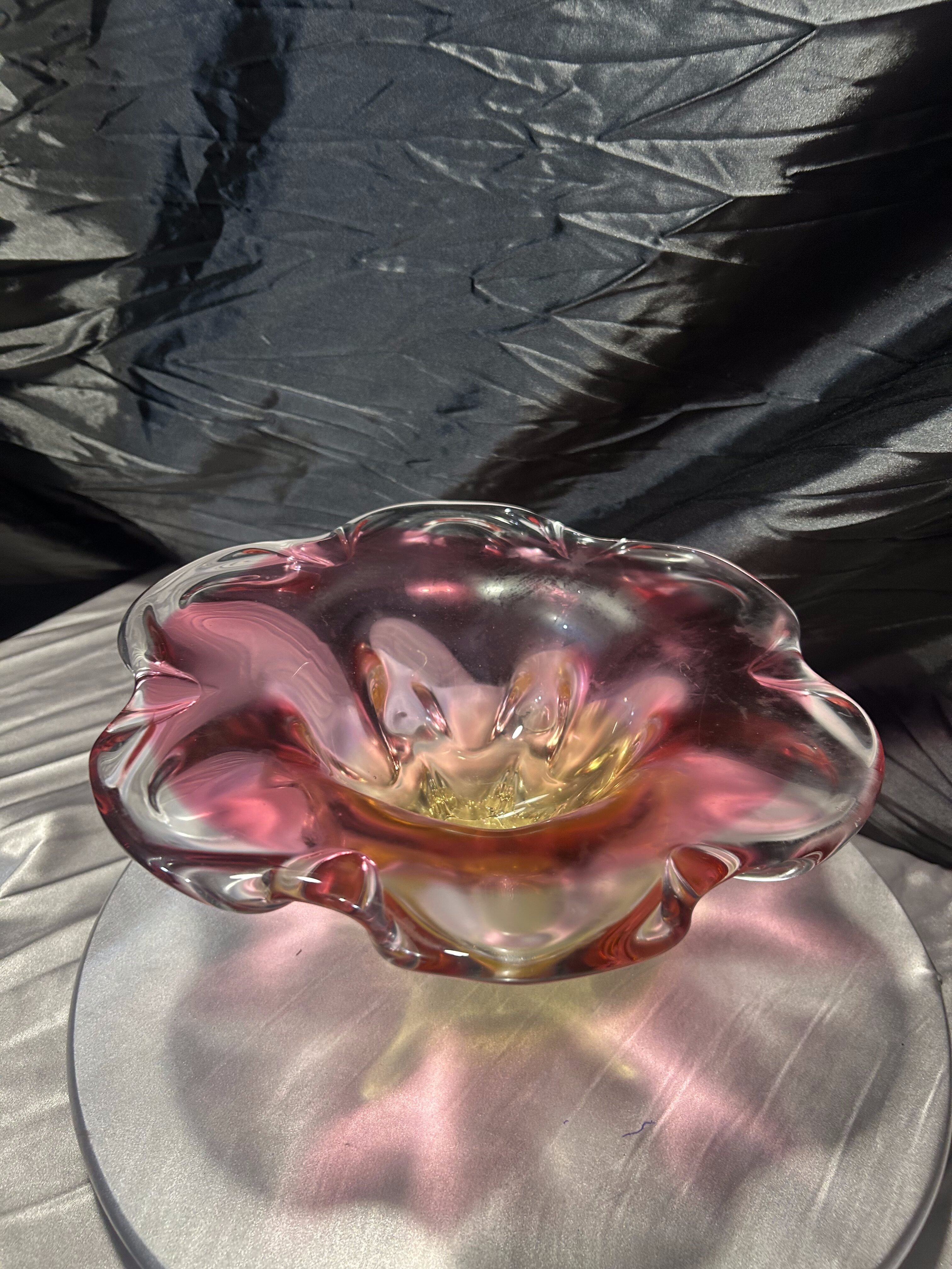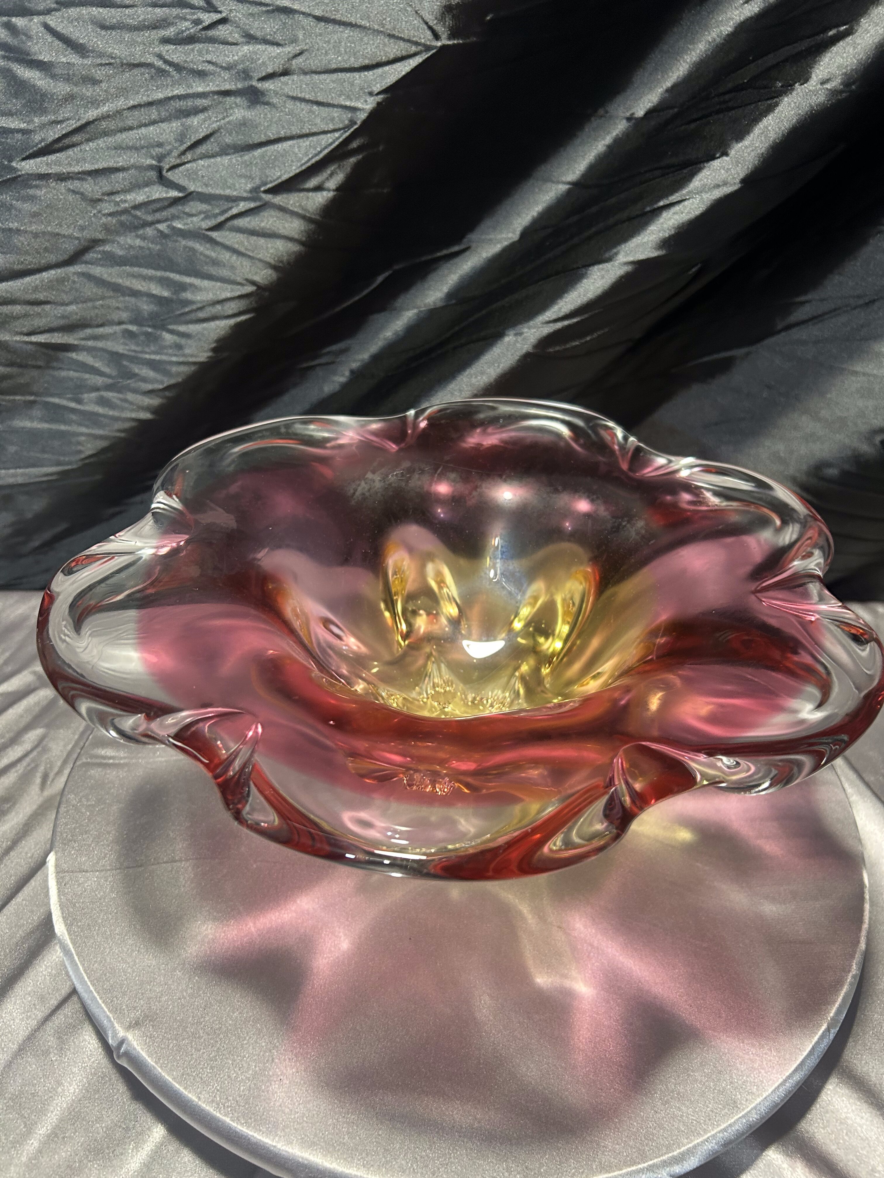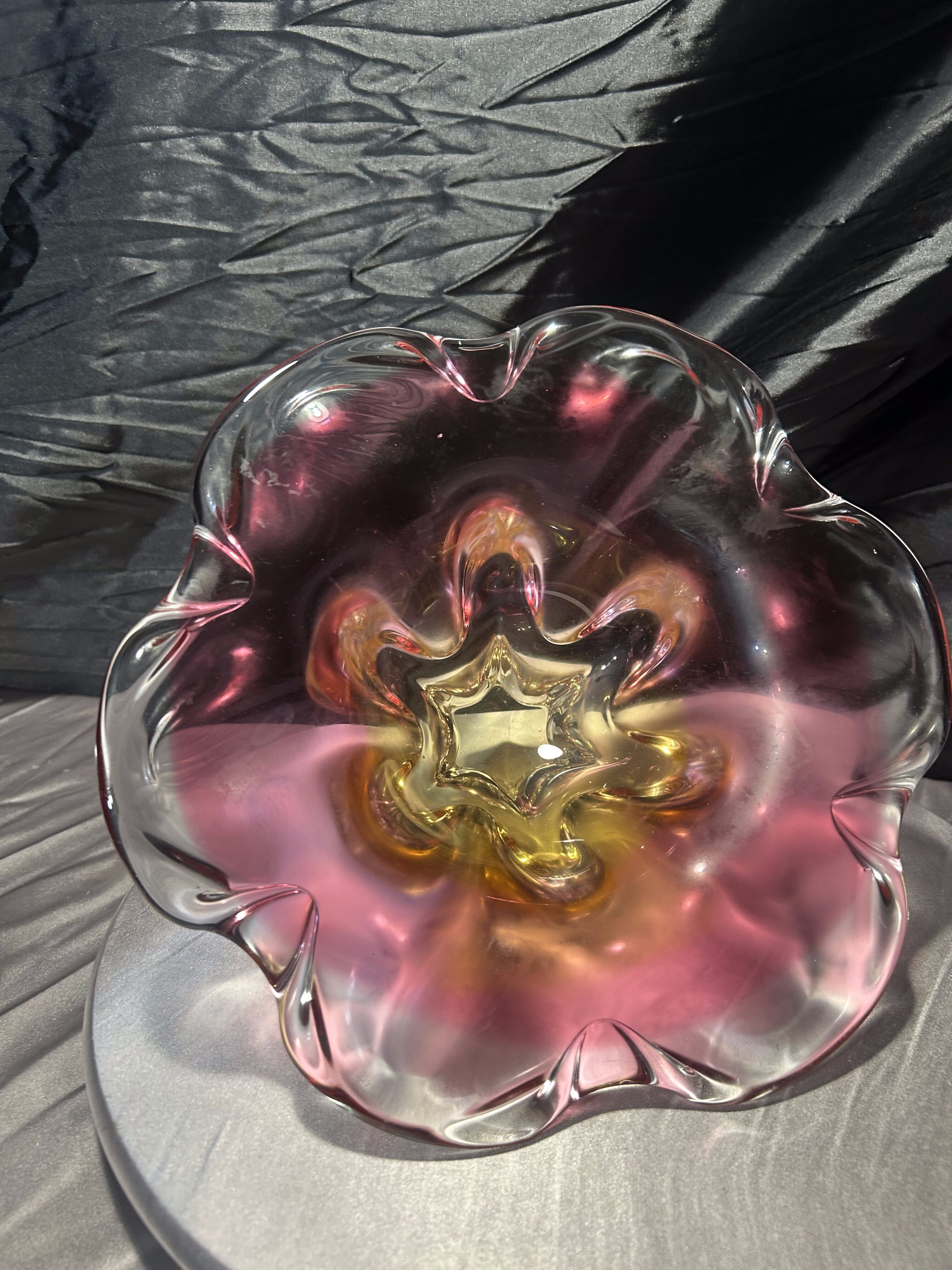 Zastosowane kolory – głęboki róż, przechodzący w złocistożółte tony – harmonijnie przenikają się w masie szkła, tworząc odbicia, które zmieniają się wraz z oświetleniem. To klasyczny przykład tzw. tłustego szkła, ciężkiego, masywnego, o pięknej bryle, która sama w sobie stanowi dekorację artystyczną.