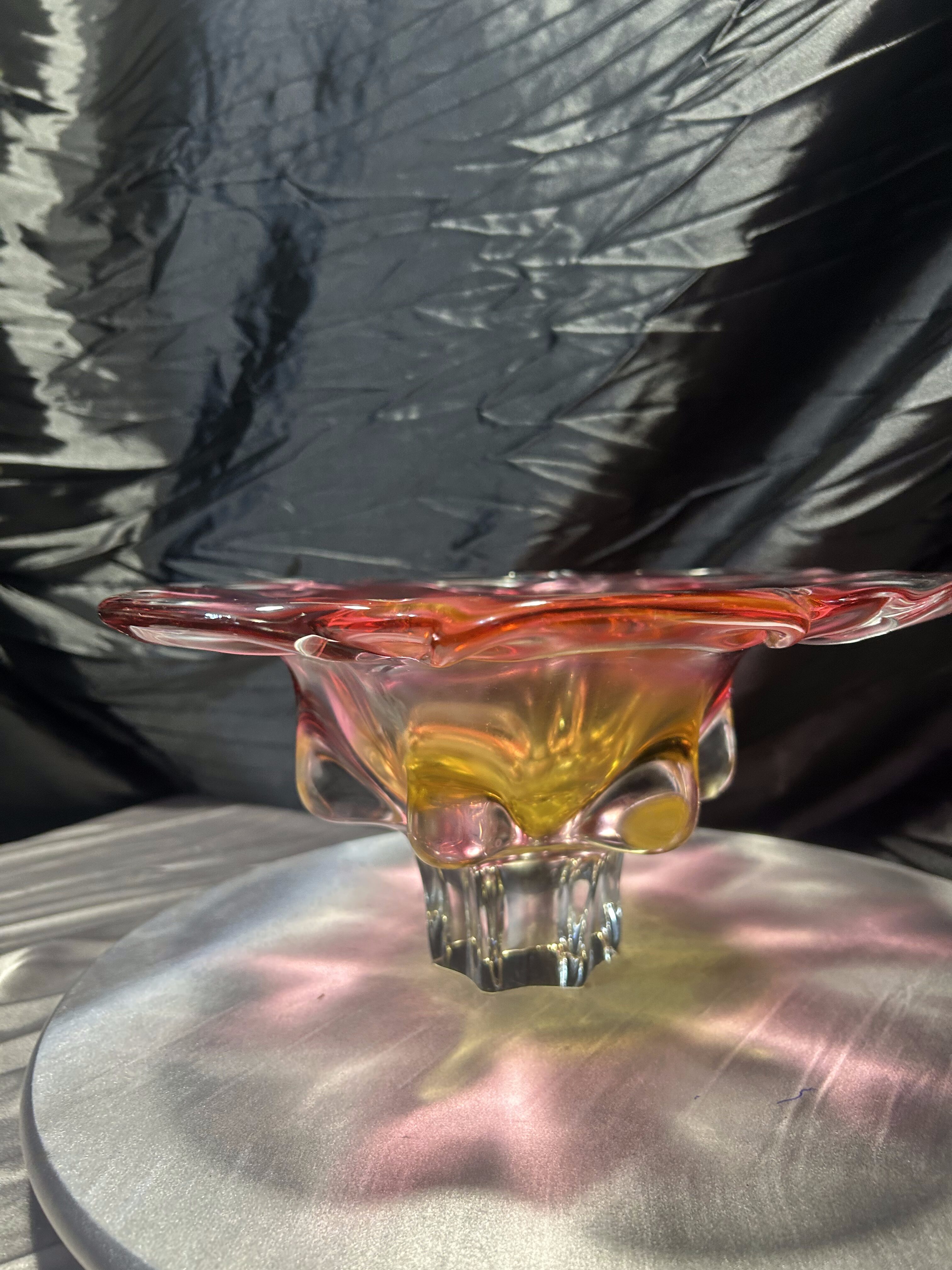 Spektakularna, wyjątkowo okazała patera z huty Bohemia, zaprojektowana przez słynnego czeskiego artystę Józefa Hospodkę – mistrza szkła artystycznego, którego prace cieszą się dużym uznaniem kolekcjonerów. Misa zachwyca swoją rzeźbiarską formą: szerokie, falowane krawędzie tworzą efekt rozchylającego się kwiatu, a centralna gwiaździsta struktura wnętrza podkreśla niezwykły charakter projektu.