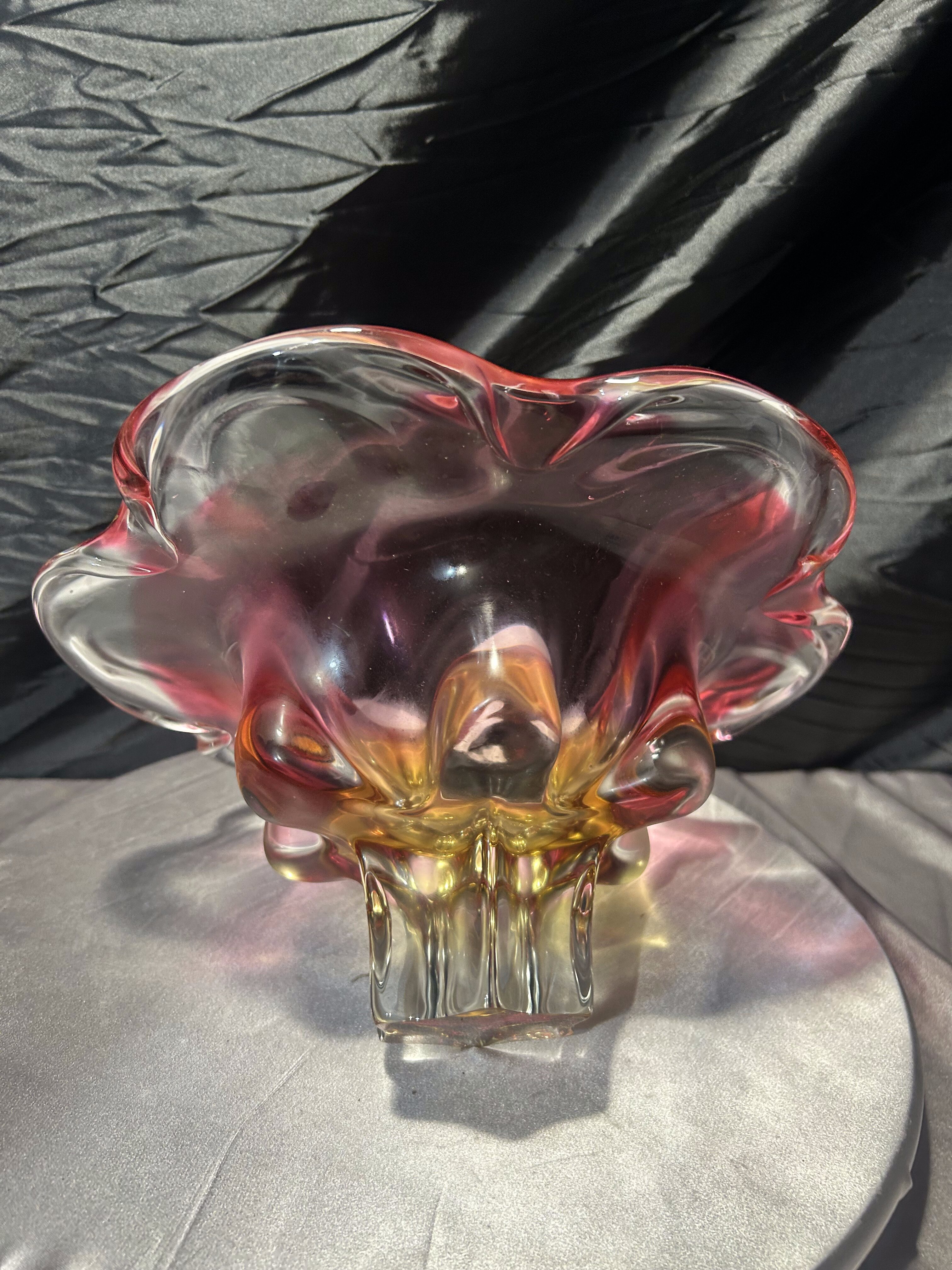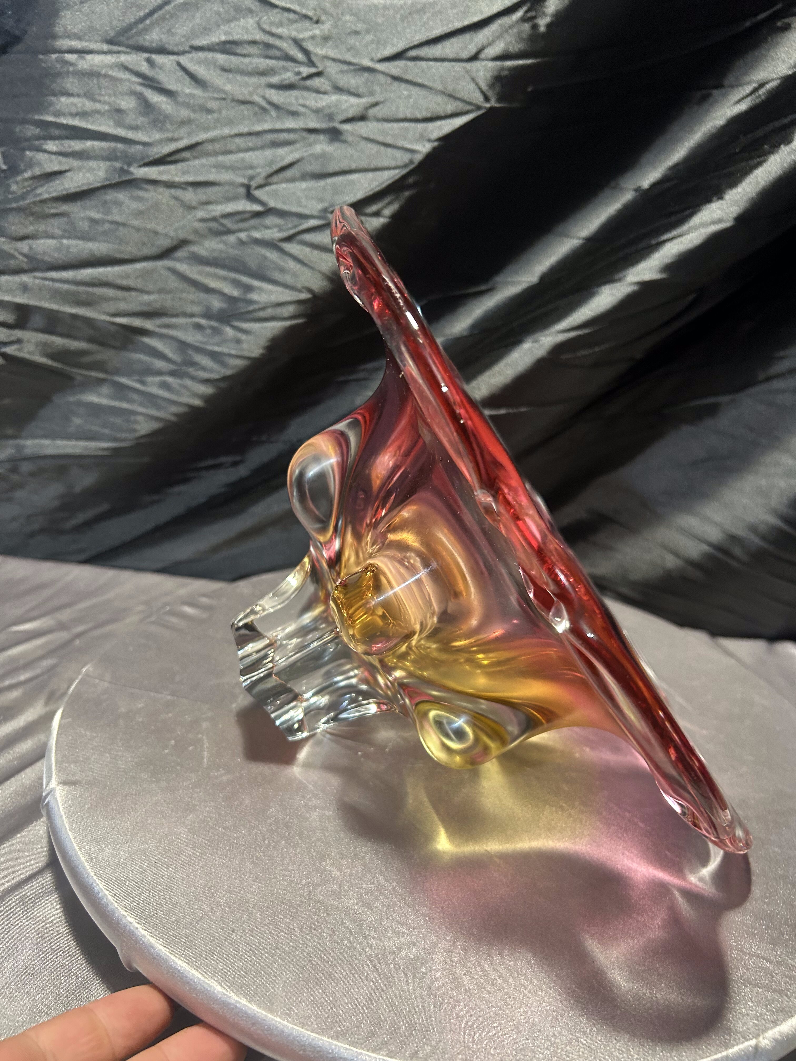 Ta masywna, artystyczna patera to prawdziwe dzieło sztuki użytkowej – intensywna kolorystyka, rzeźbiarska forma i mistrzowski projekt Hospodki nadają jej wyjątkowy, kolekcjonerski charakter. Zachwyca zarówno jako dekoracja, jak i element kolekcji czeskiego szkła.