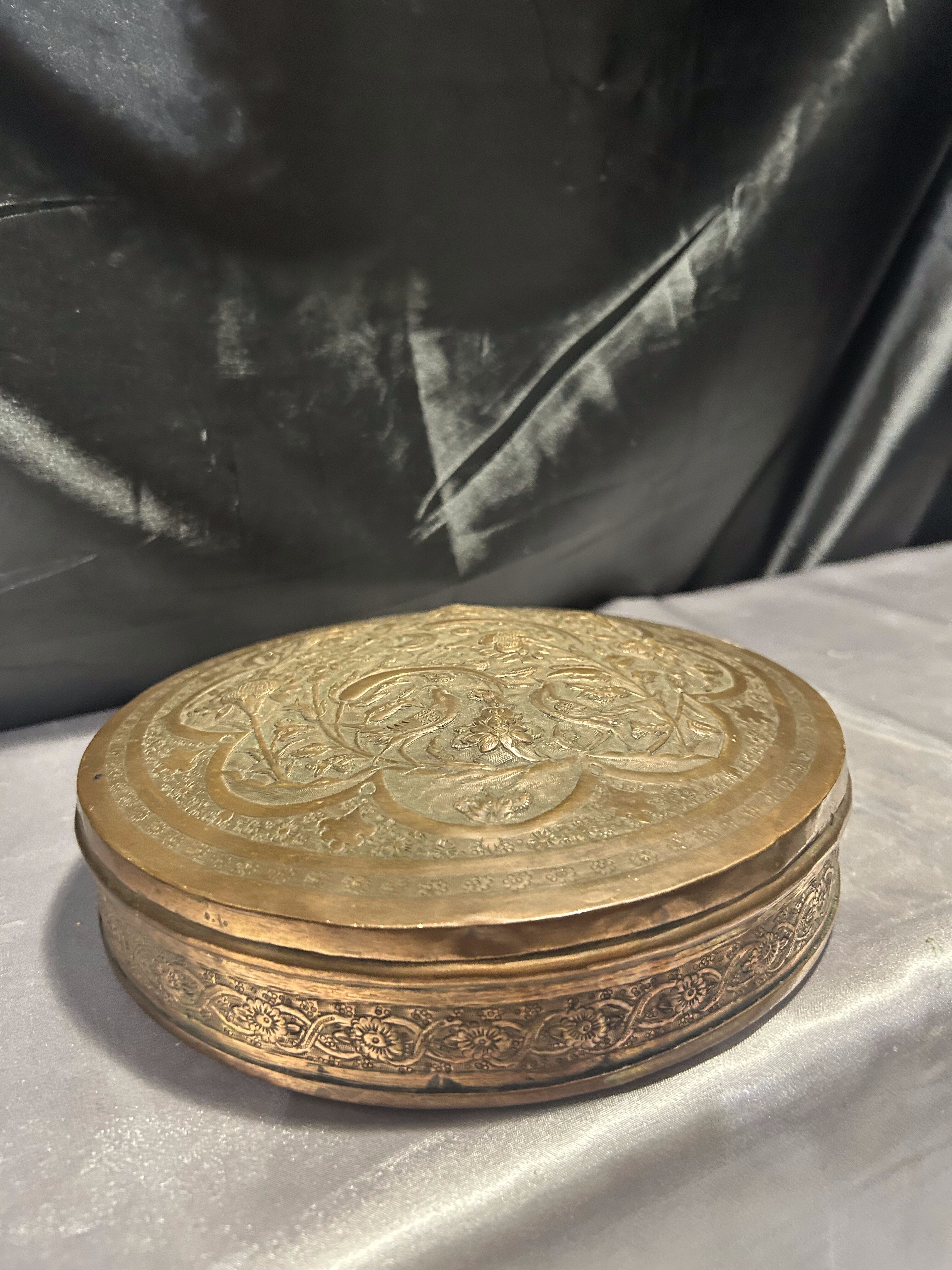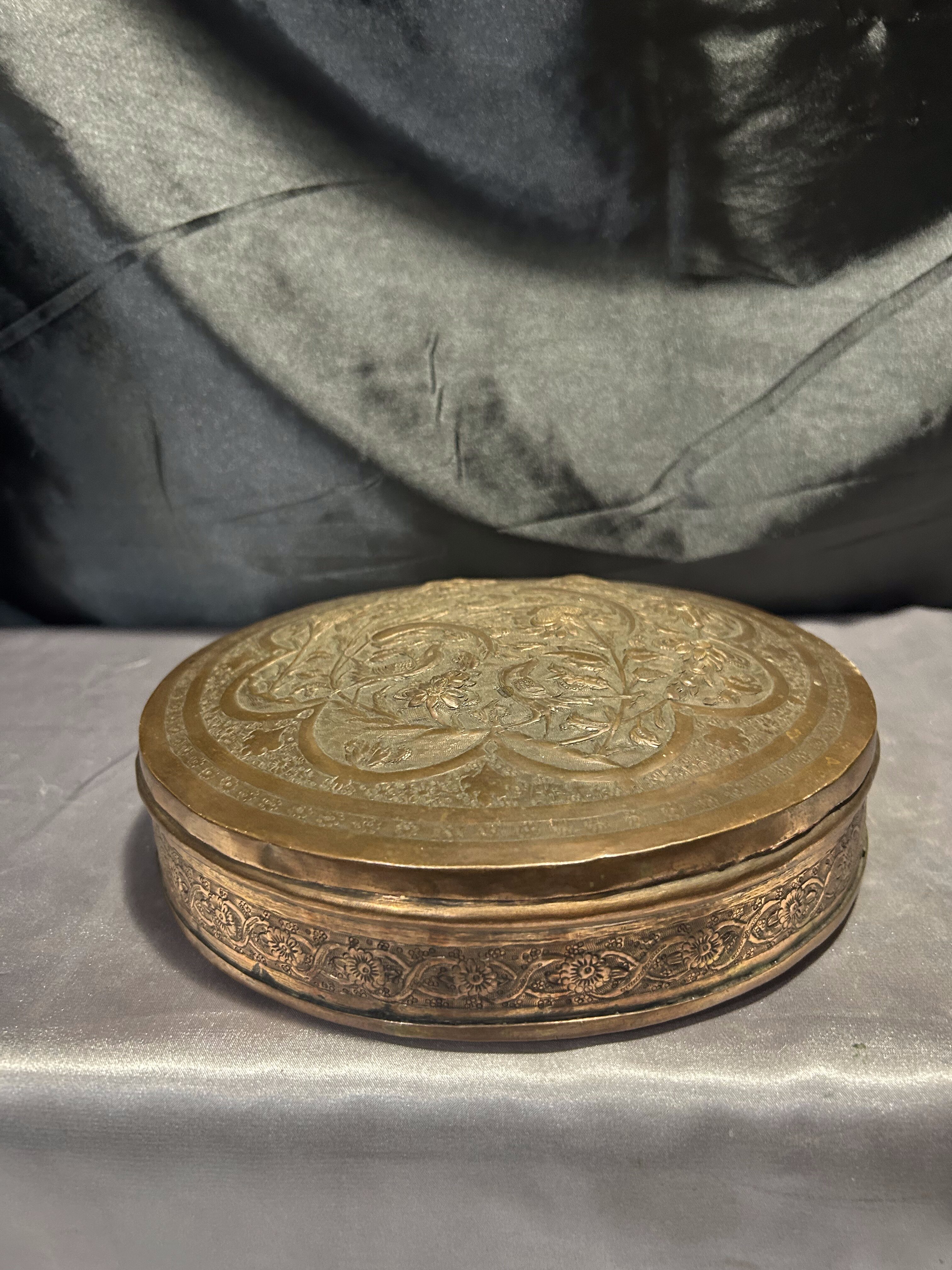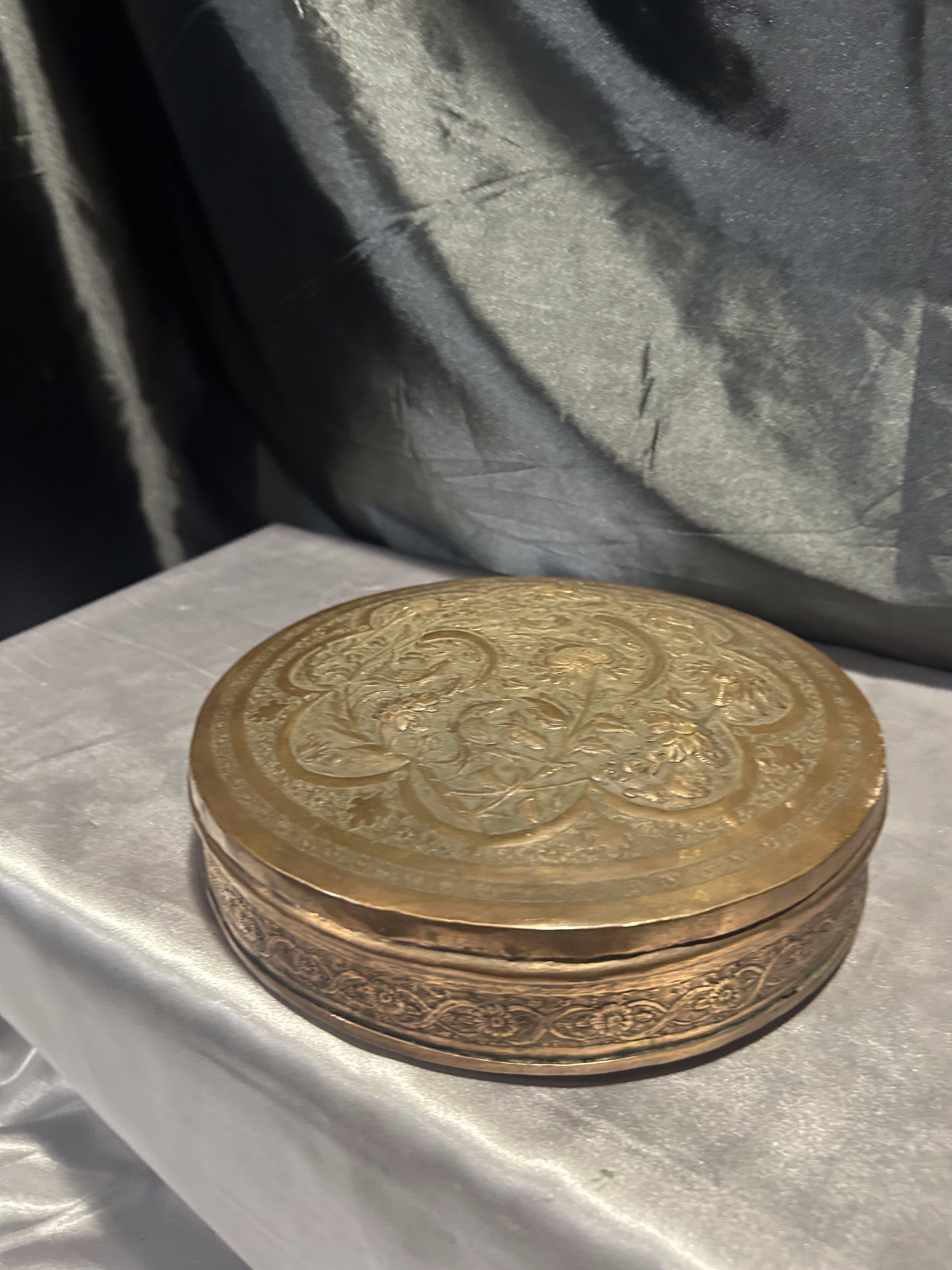 Przedmiotem sprzedaży jest wyjątkowa, duża szkatułka wykonana z mosiądzu, ozdobiona bogatym roślinnym ornamentem. Wieczko i boki szkatułki zostały misternie grawerowane, co świadczy o kunszcie ręcznej pracy. Szkatułka pochodzi prawdopodobnie z przełomu XIX i XX wieku lub z okresu kolonialnego, utrzymana w stylu orientalnym.