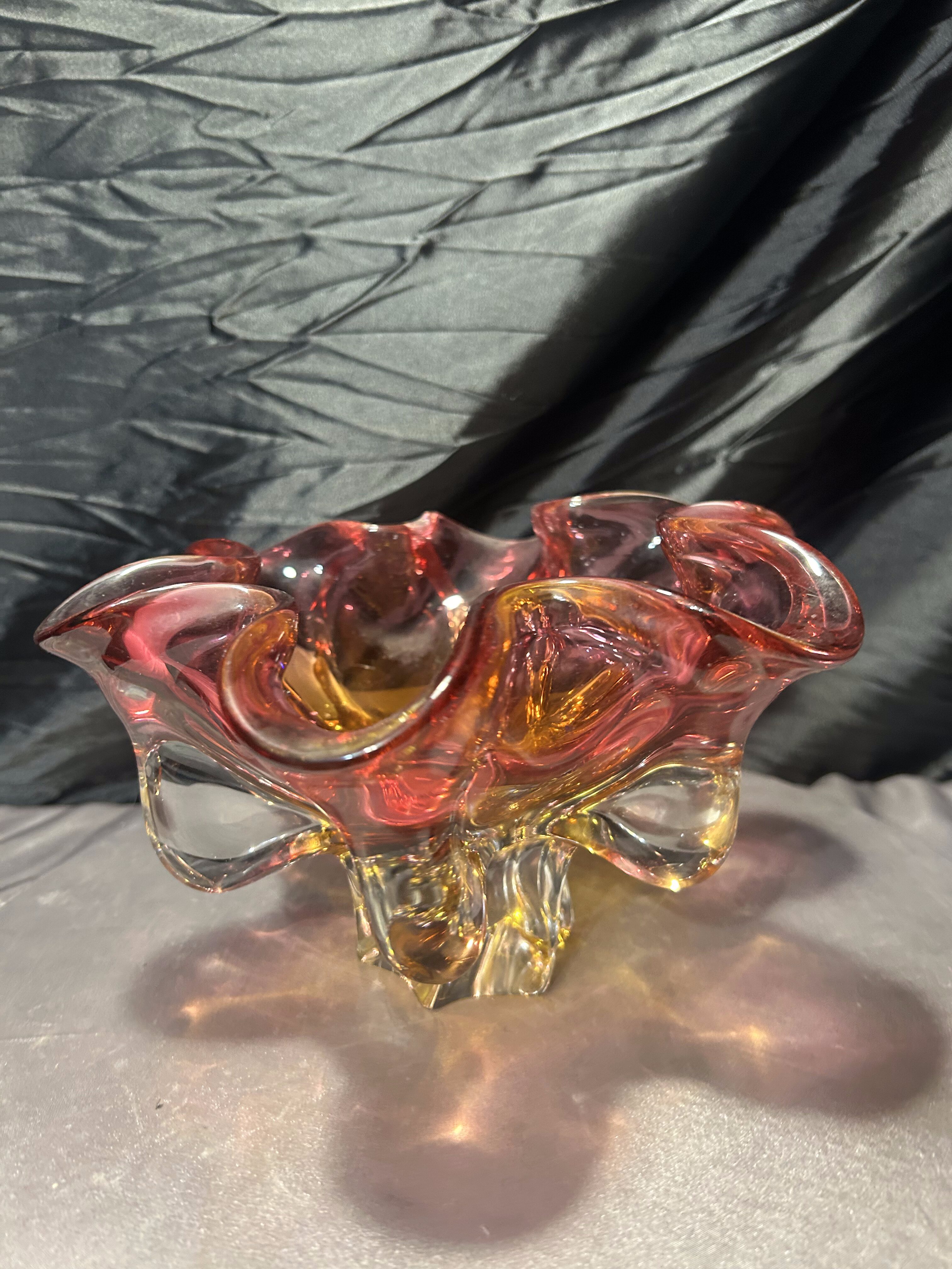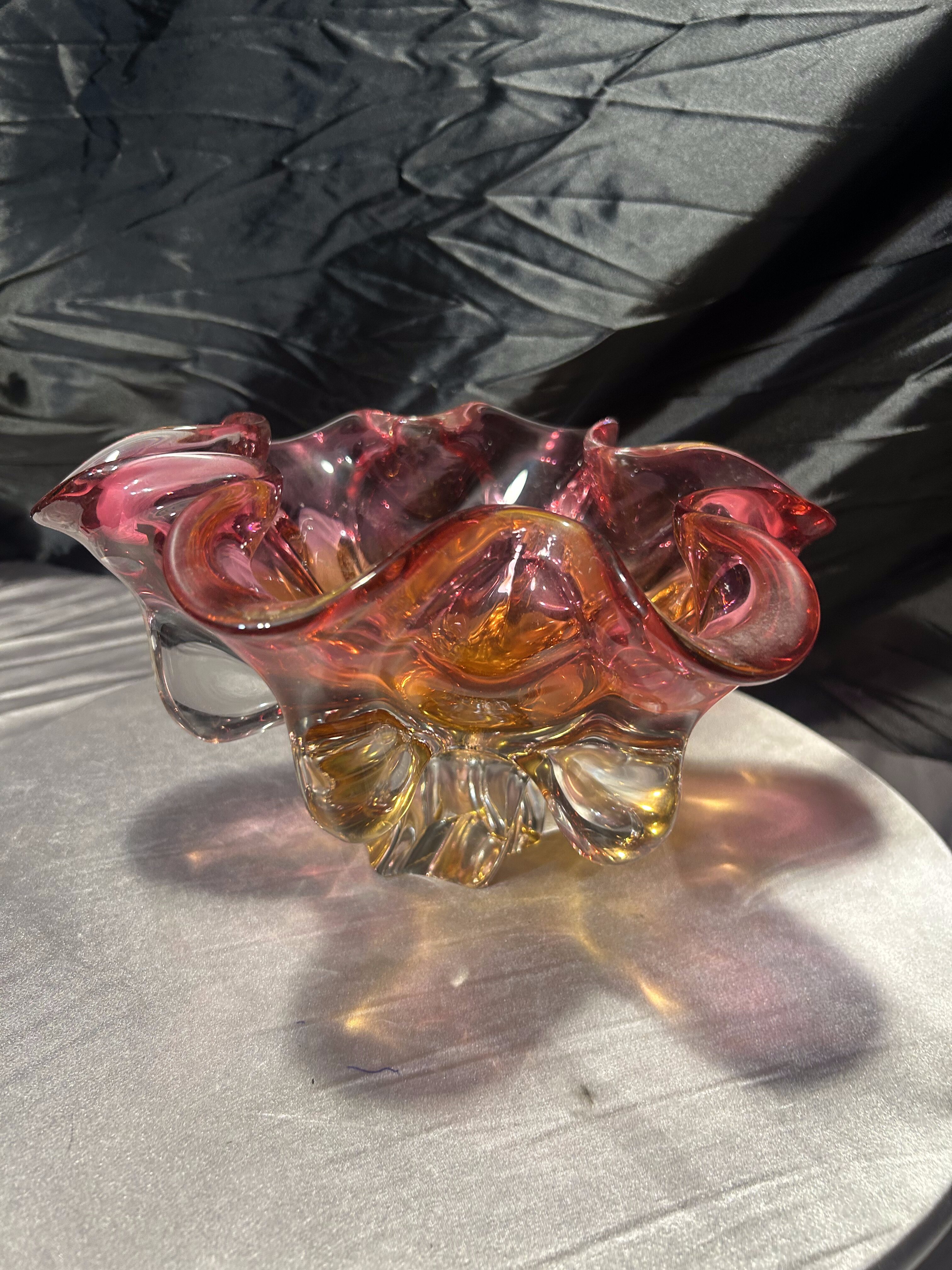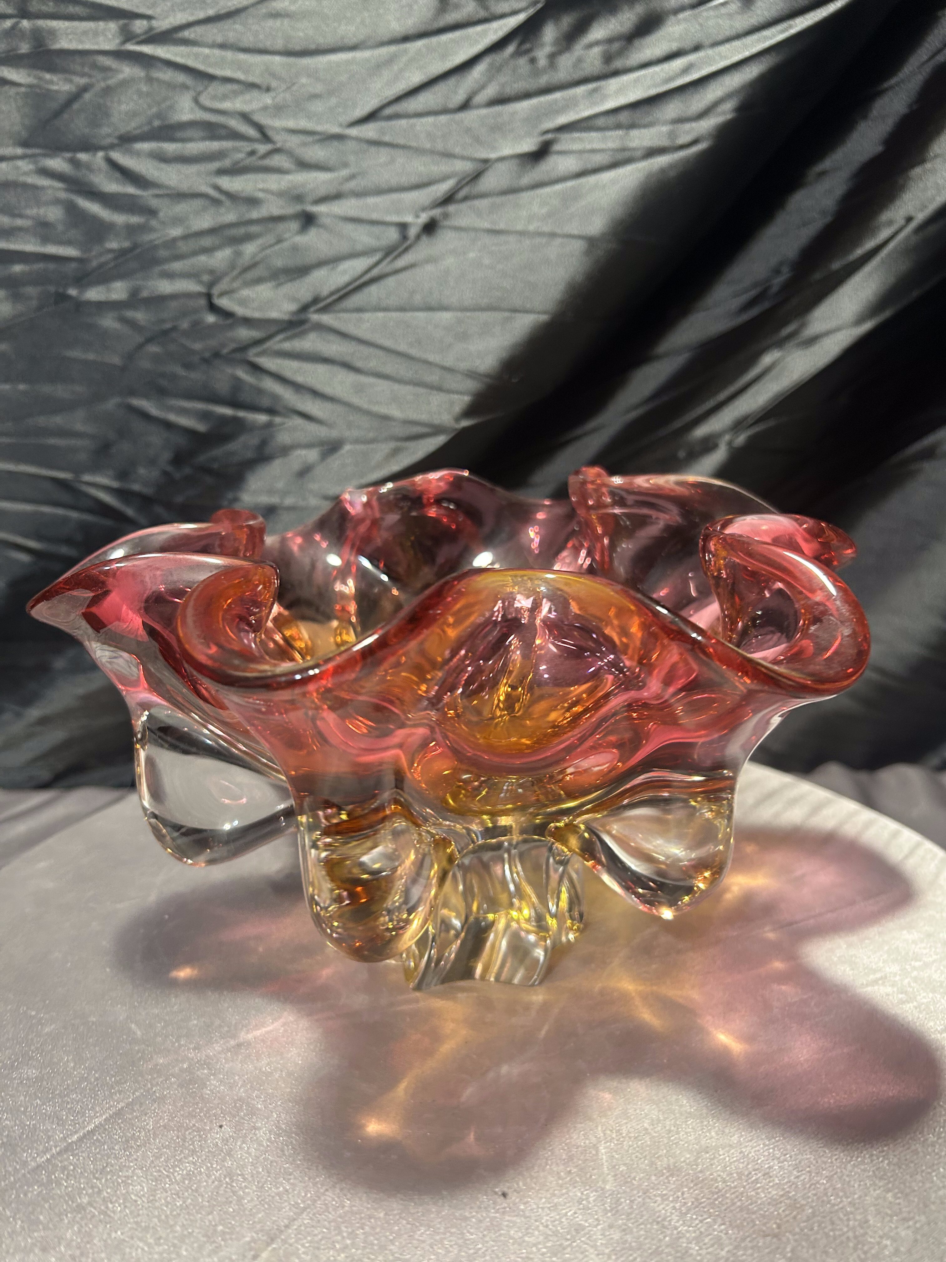 Imponująca, ręcznie formowana patera artystyczna z cenionej Huty Bohemia, zaprojektowana przez wybitnego czeskiego projektanta szkła – Józefa Hospodkę. Ten wyjątkowy egzemplarz zachwyca zjawiskową, kwietną formą oraz piękną grą kolorów, w której róż płynnie przechodzi w głęboką żółć, nadając całości efekt rozświetlonego szkła.