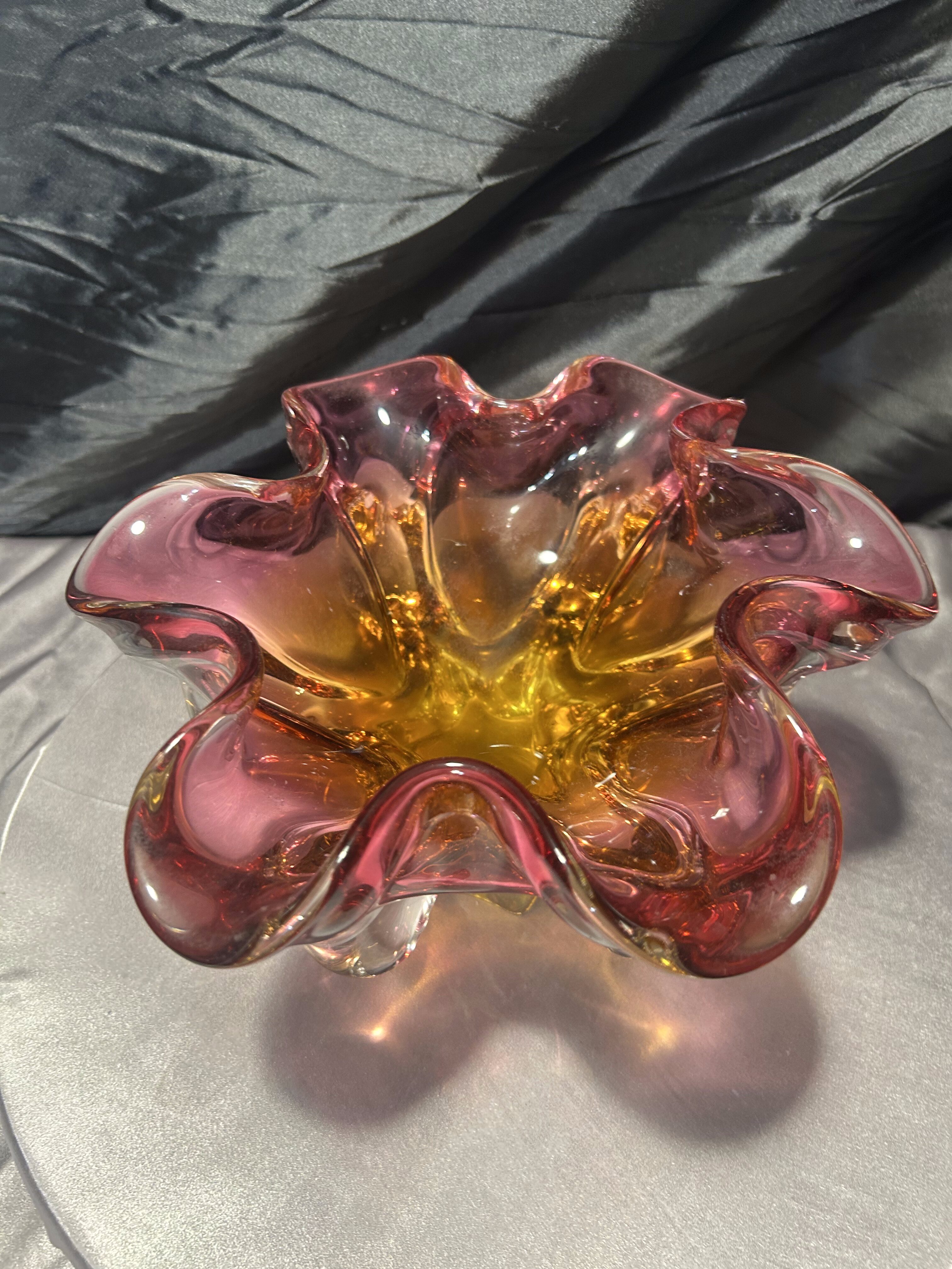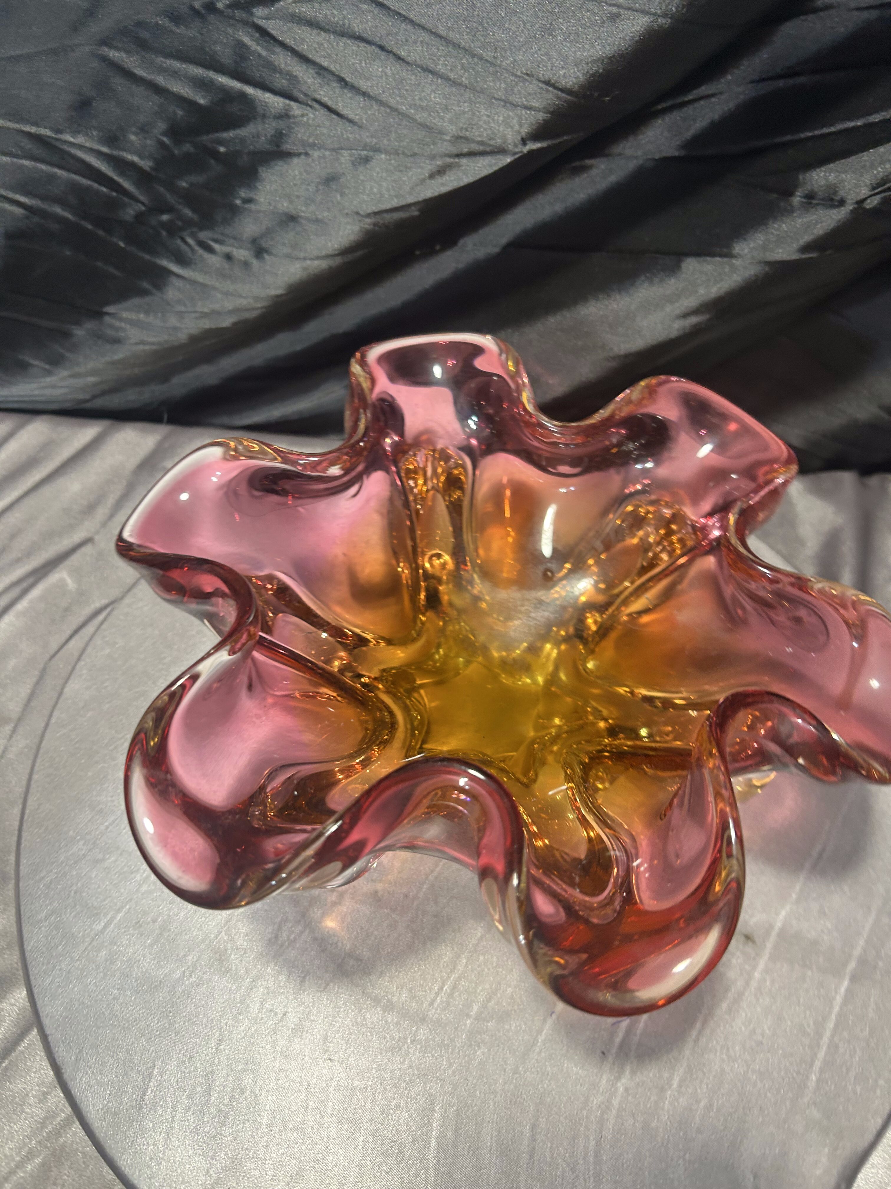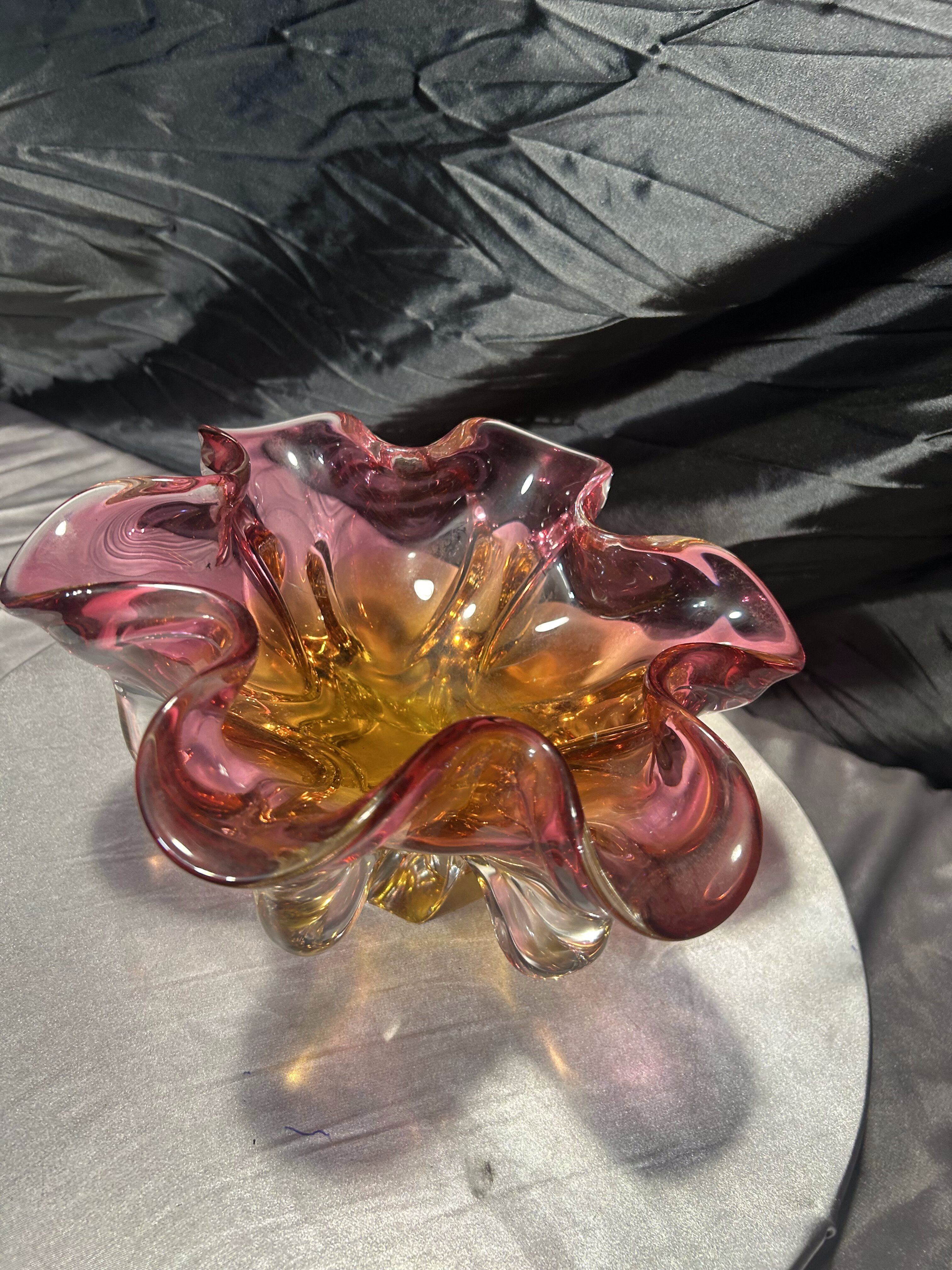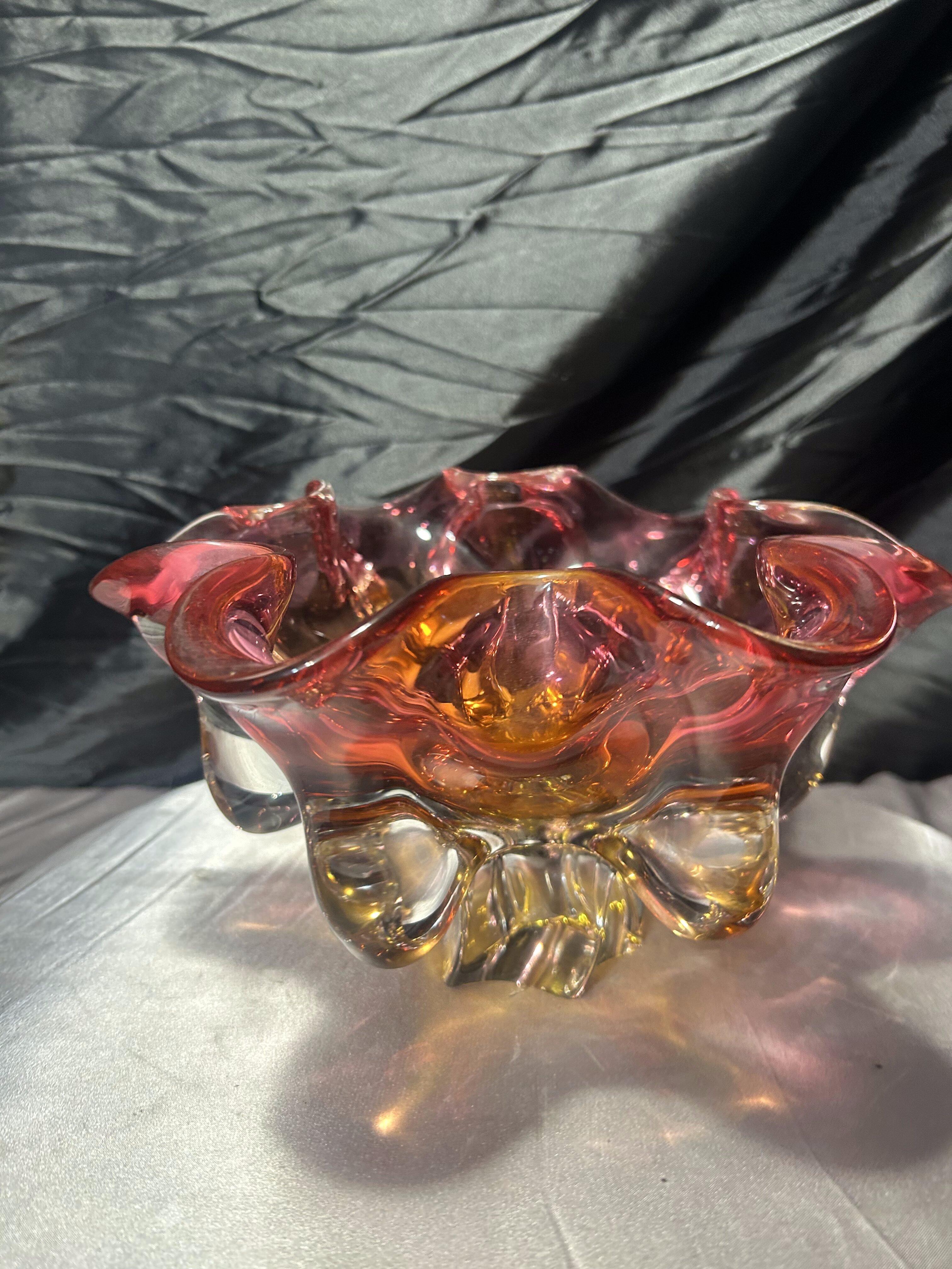 Imponująca, ręcznie formowana patera artystyczna z cenionej Huty Bohemia, zaprojektowana przez wybitnego czeskiego projektanta szkła – Józefa Hospodkę. Ten wyjątkowy egzemplarz zachwyca zjawiskową, kwietną formą oraz piękną grą kolorów, w której róż płynnie przechodzi w głęboką żółć, nadając całości efekt rozświetlonego szkła.