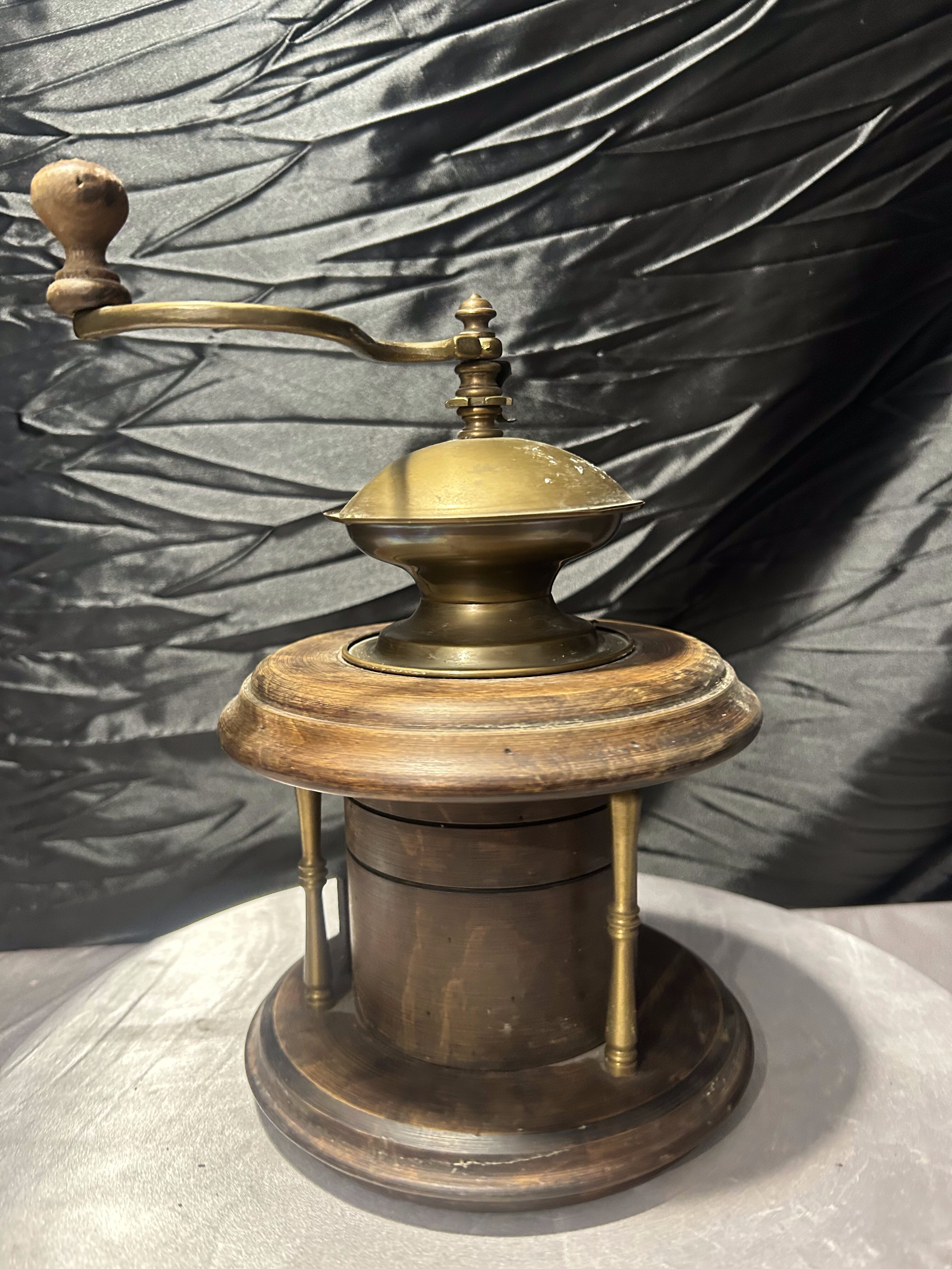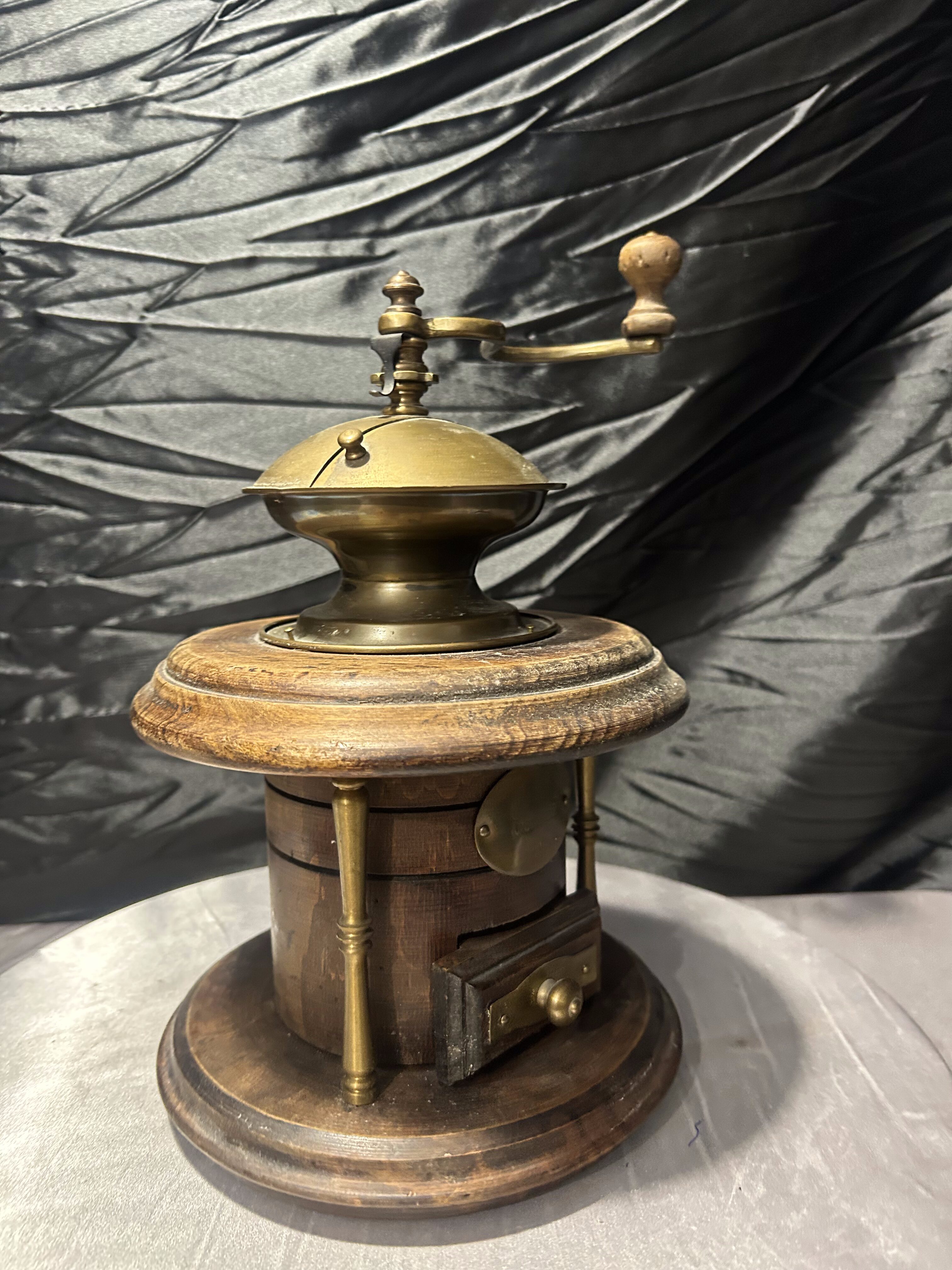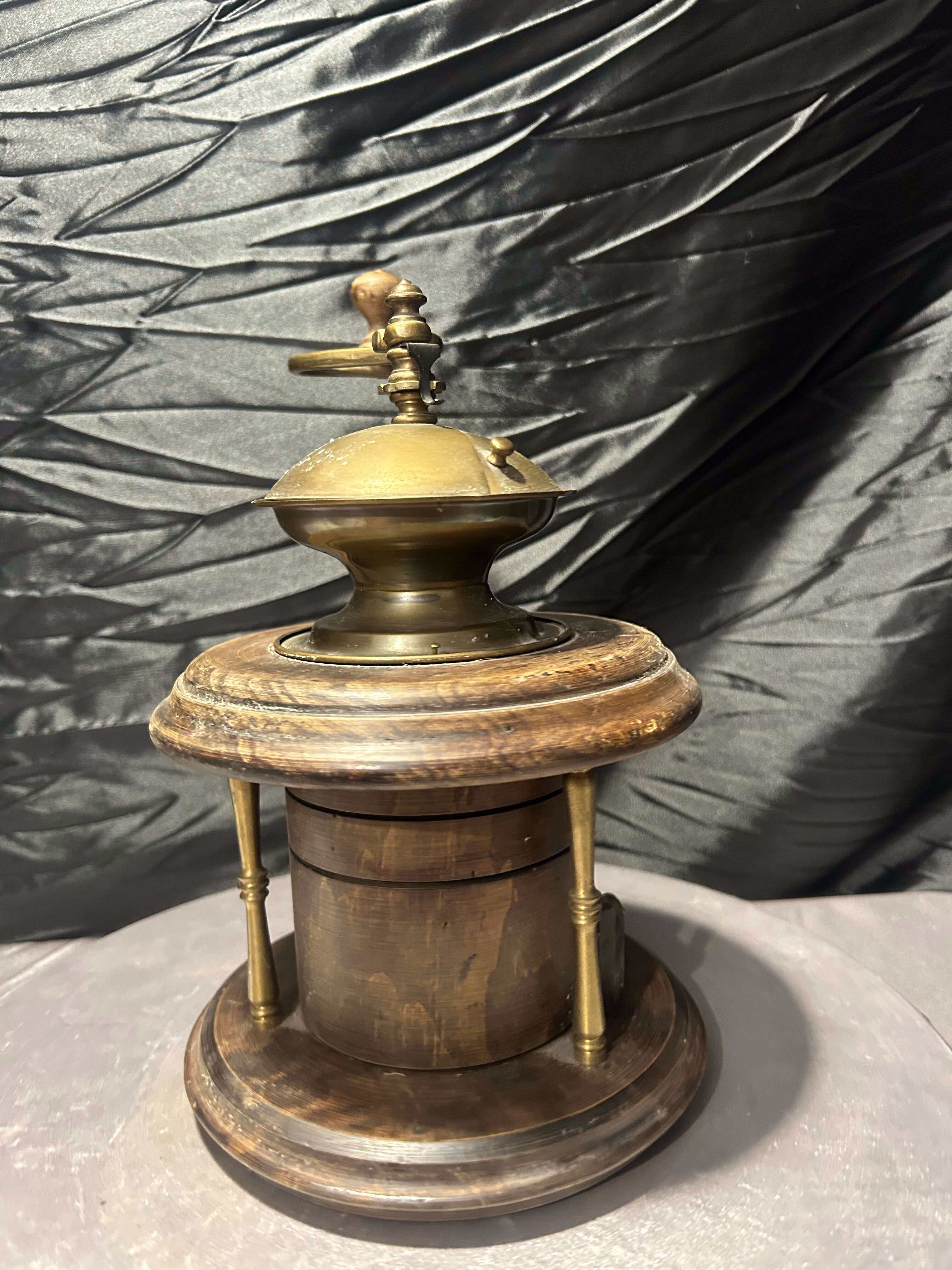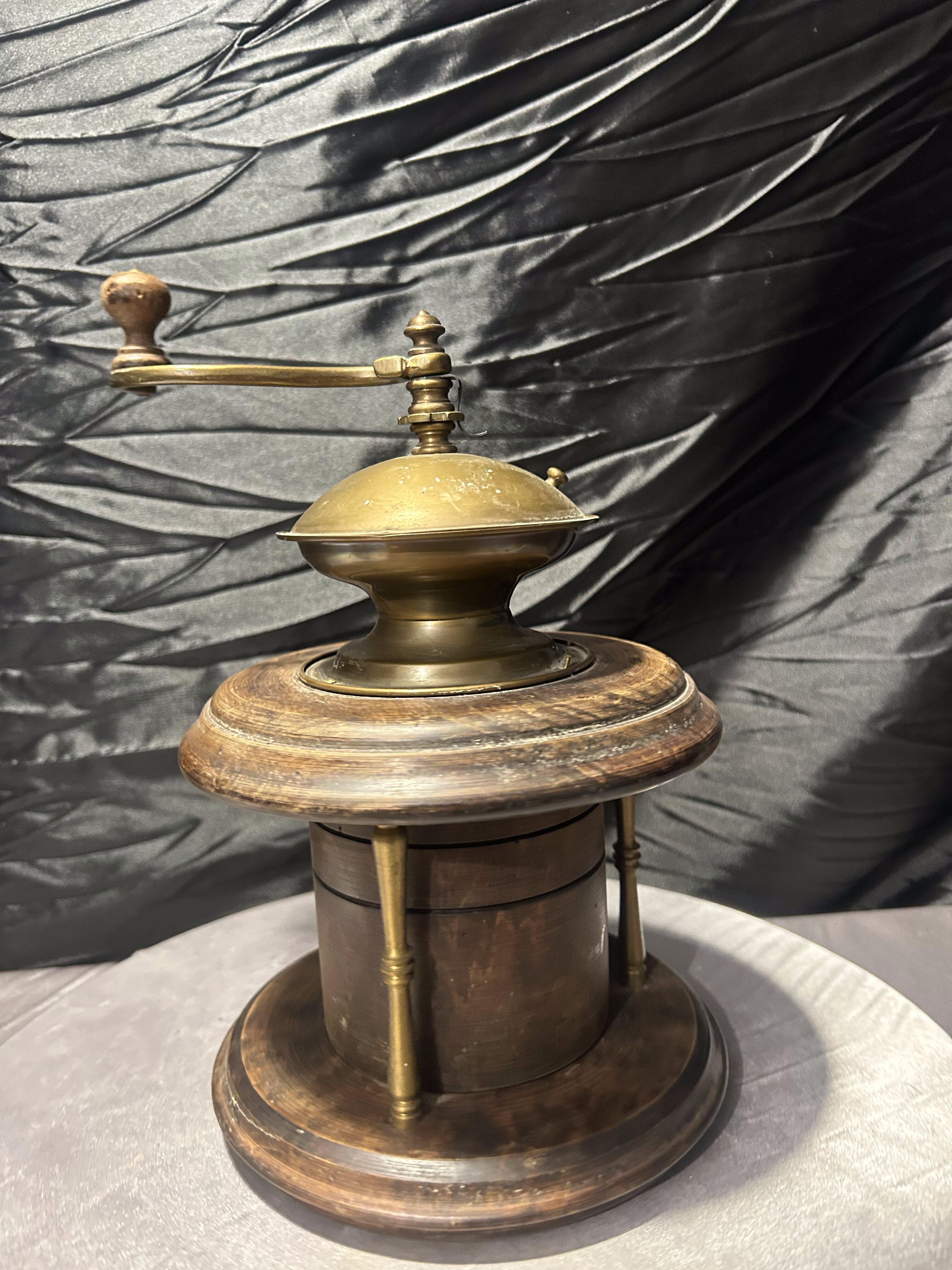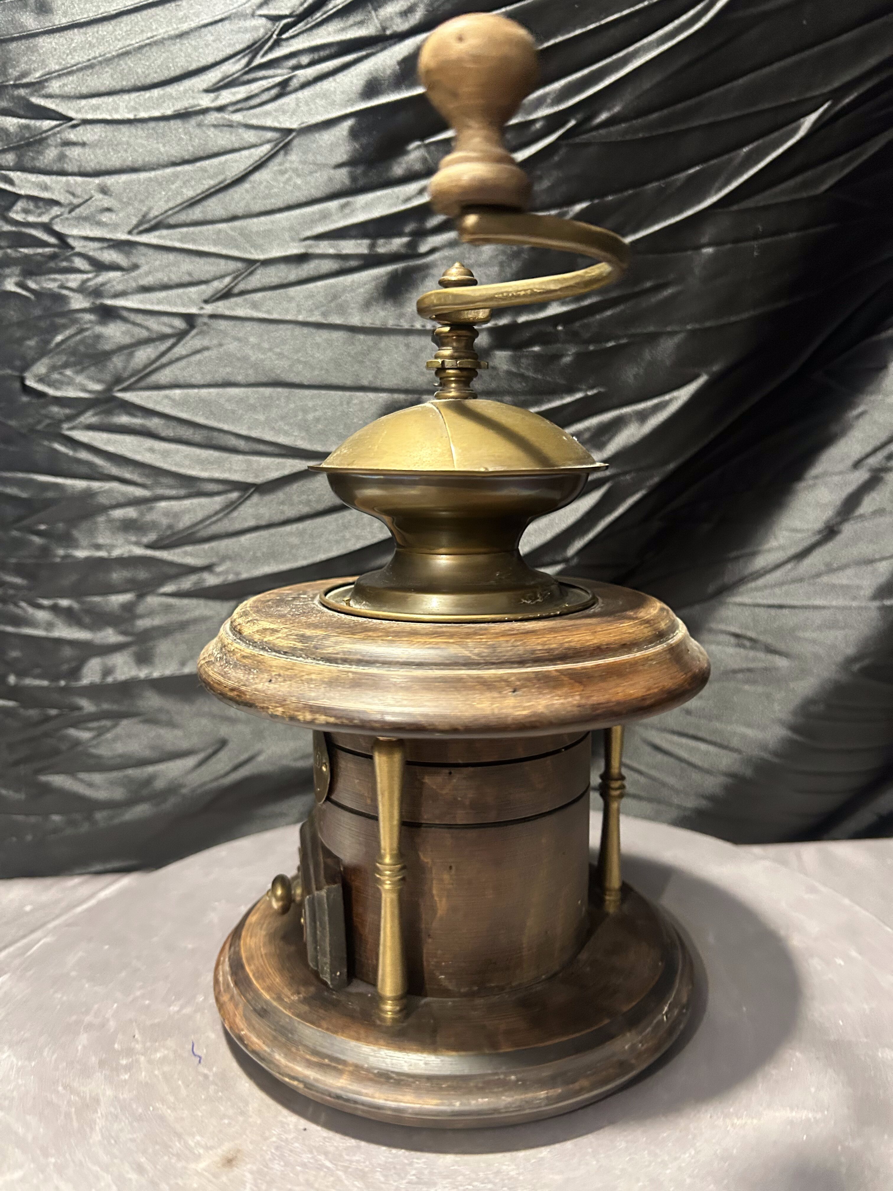 Wyjątkowy, duży młynek do kawy w formie kolumnowej, wykonany z drewna z efektownymi elementami mosiężnymi. To model o reprezentacyjnym charakterze, który przyciąga uwagę swoją masywną, okrągłą konstrukcją i dekoracyjną kopułą z ręczną korbą.