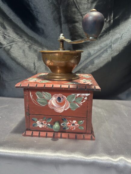 Młynek drewniany – Bordowy z ręcznie malowanymi kwiatami – Sygnowany vintage