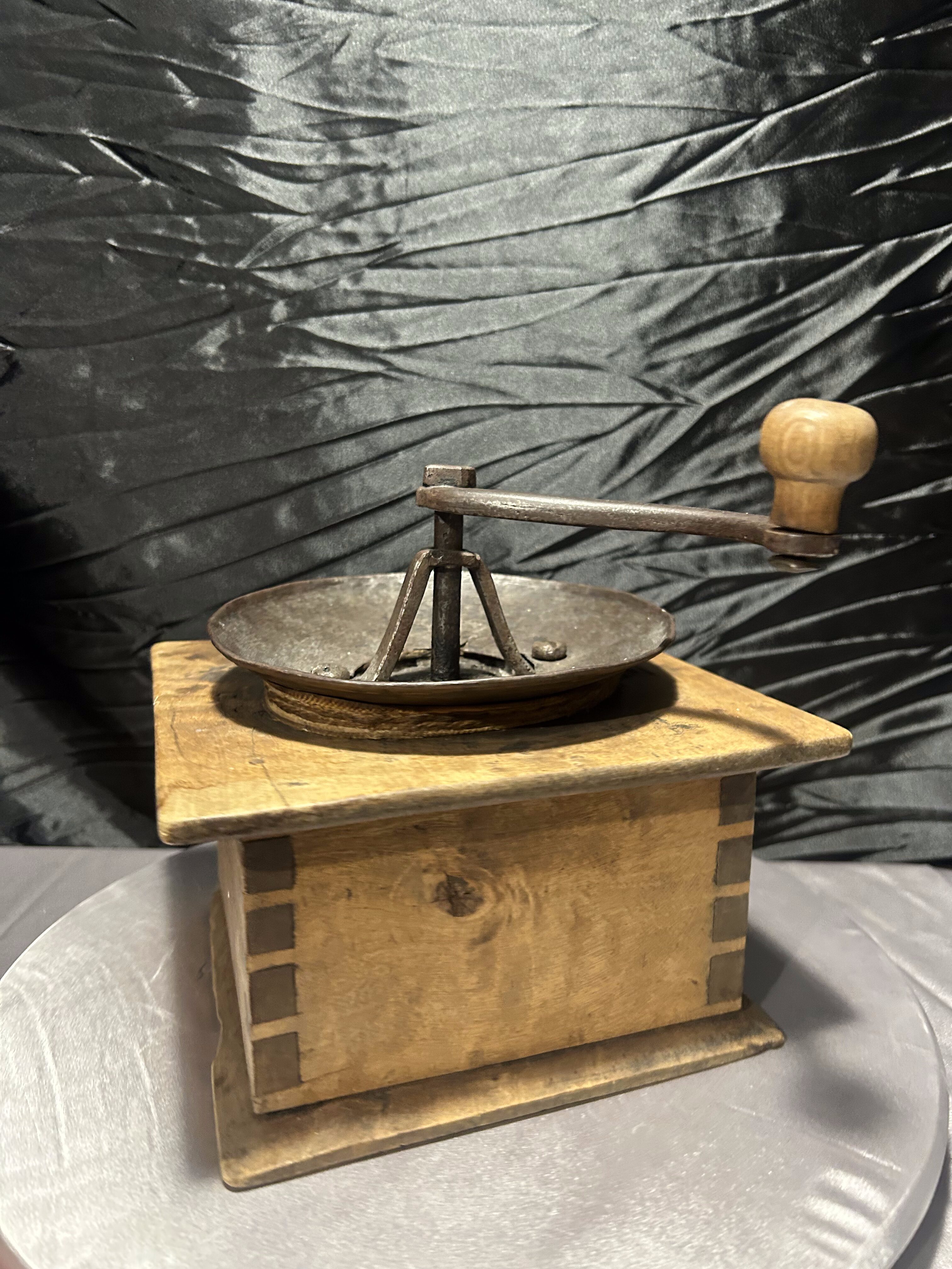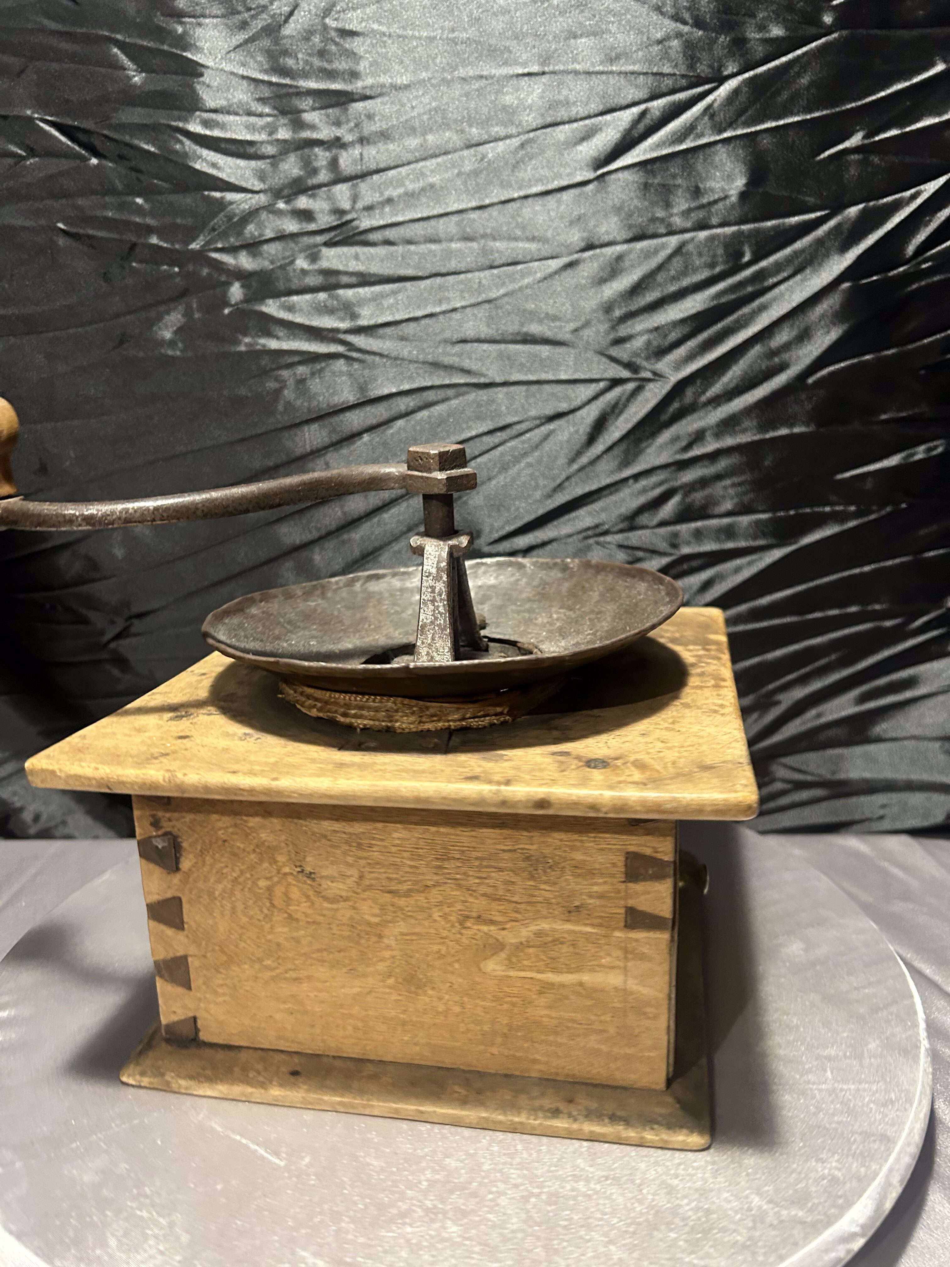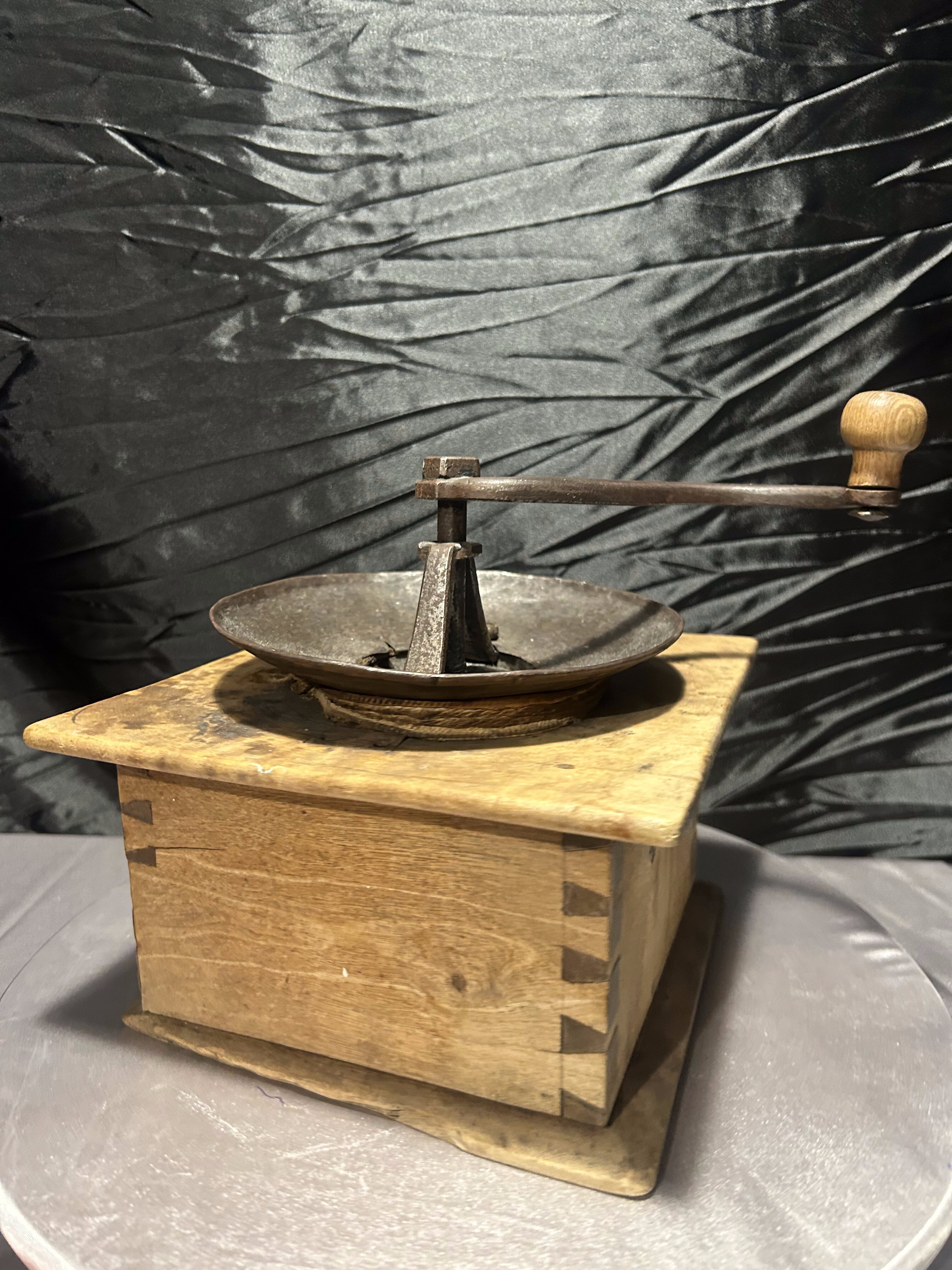 Imponujący, duży młynek do kawy typu XXL, wykonany z naturalnego drewna z metalowym mechanizmem mielącym. To klasyczny przykład dawnych młynków w stylu rustykalnym, których solidna konstrukcja i surowe wykończenie nadają im wyjątkowego charakteru.