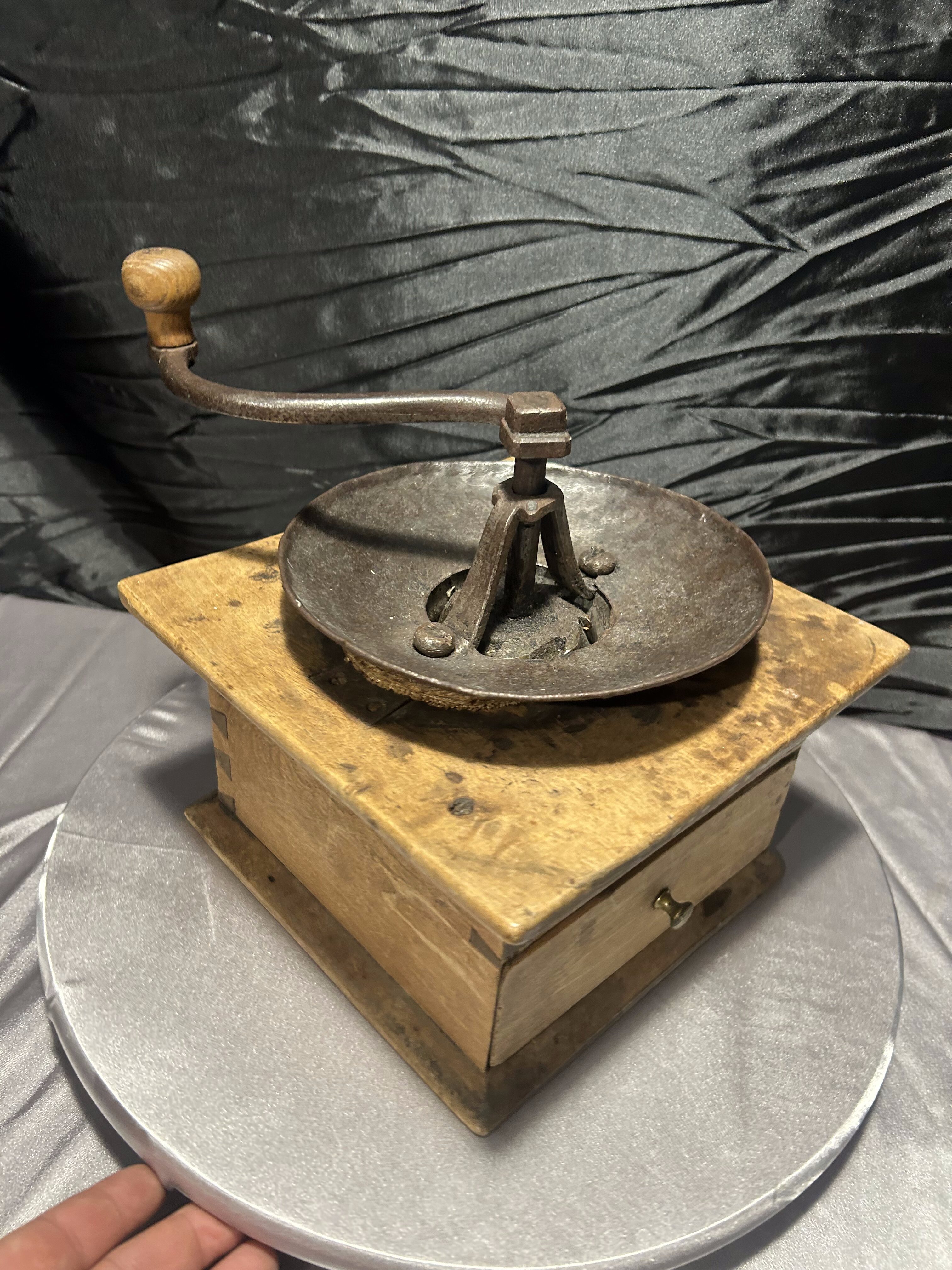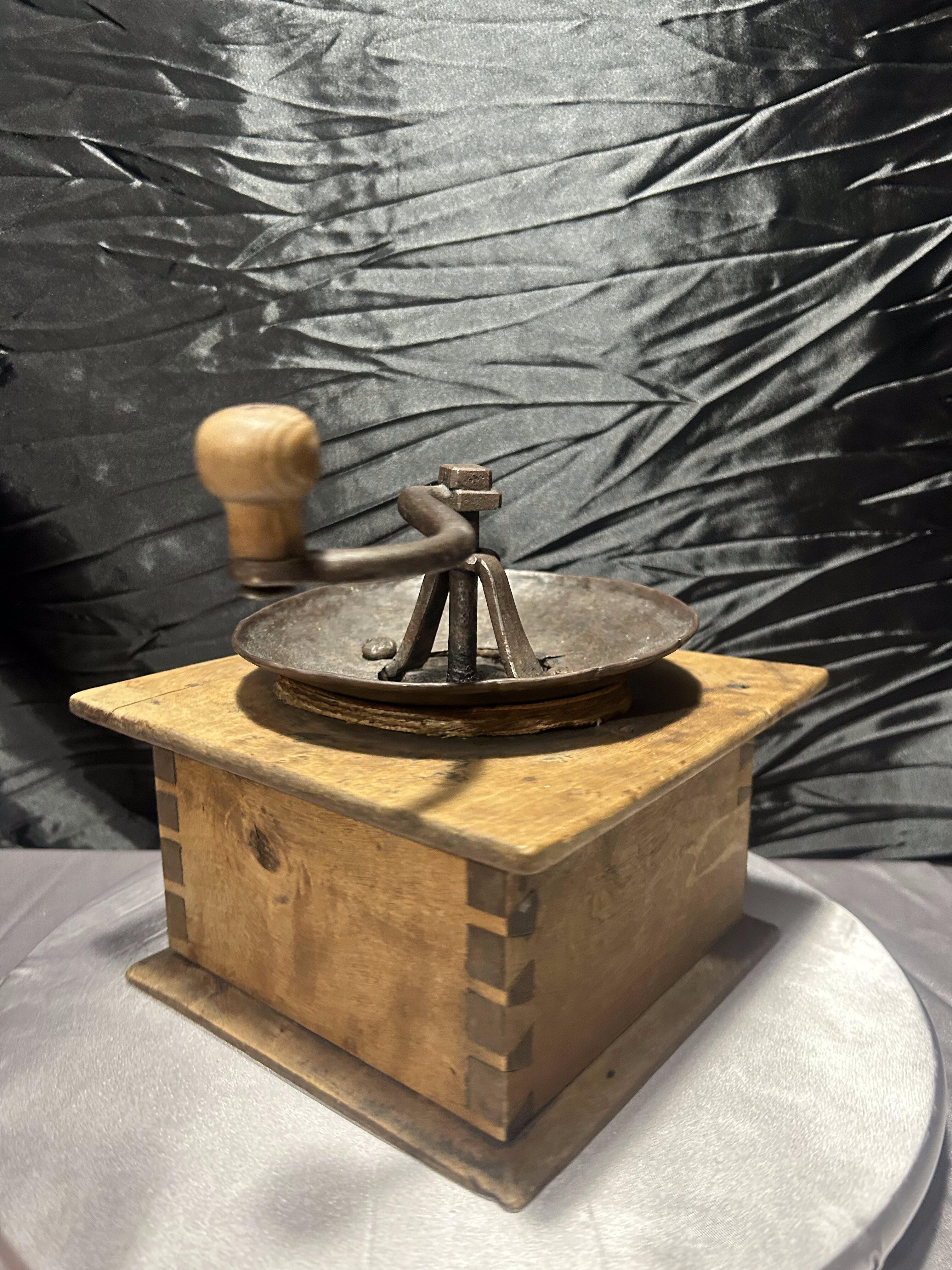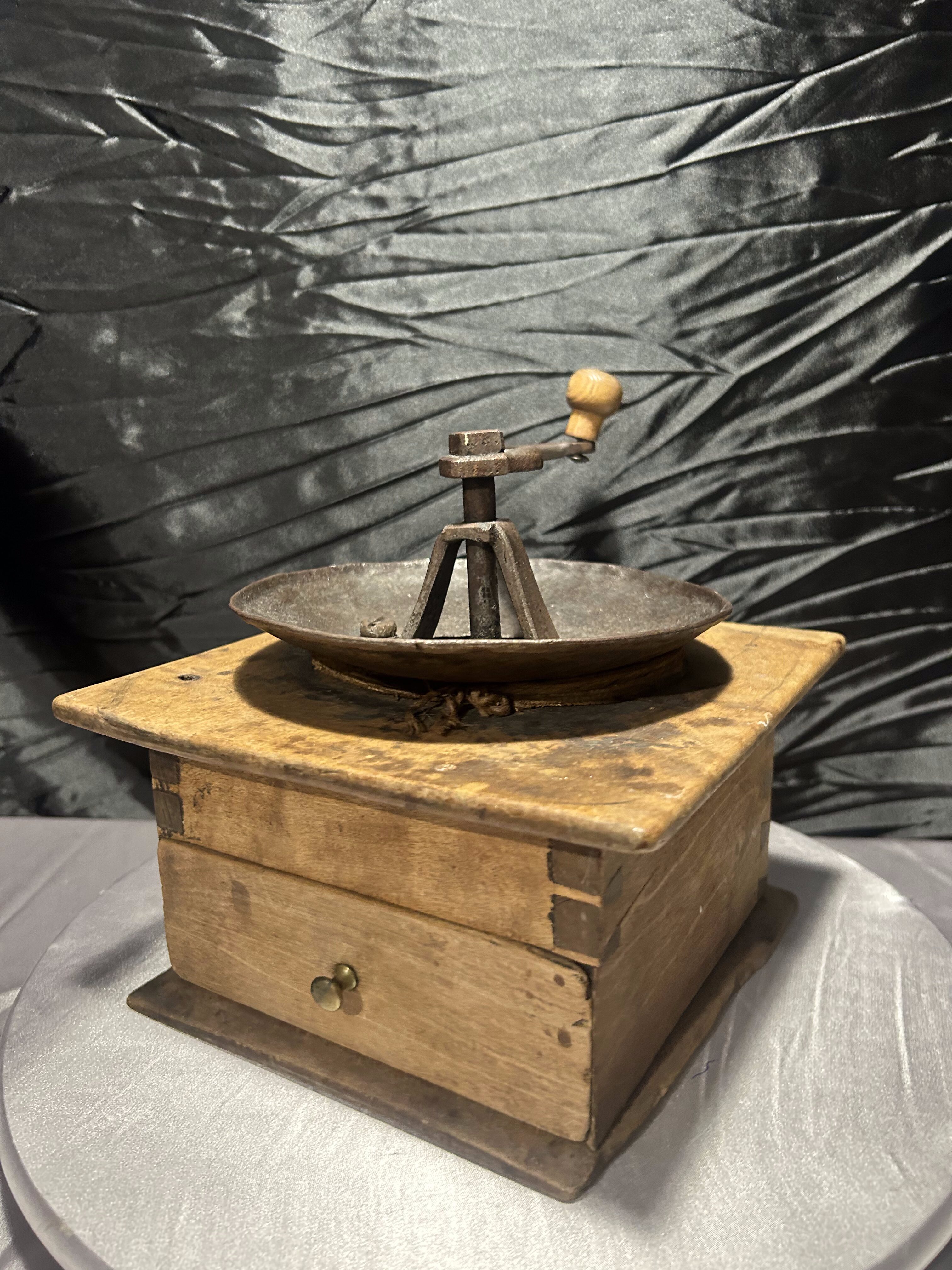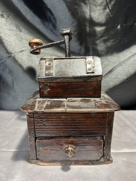 Imponujący, duży młynek do kawy typu XXL, wykonany z naturalnego drewna z metalowym mechanizmem mielącym. To klasyczny przykład dawnych młynków w stylu rustykalnym, których solidna konstrukcja i surowe wykończenie nadają im wyjątkowego charakteru.