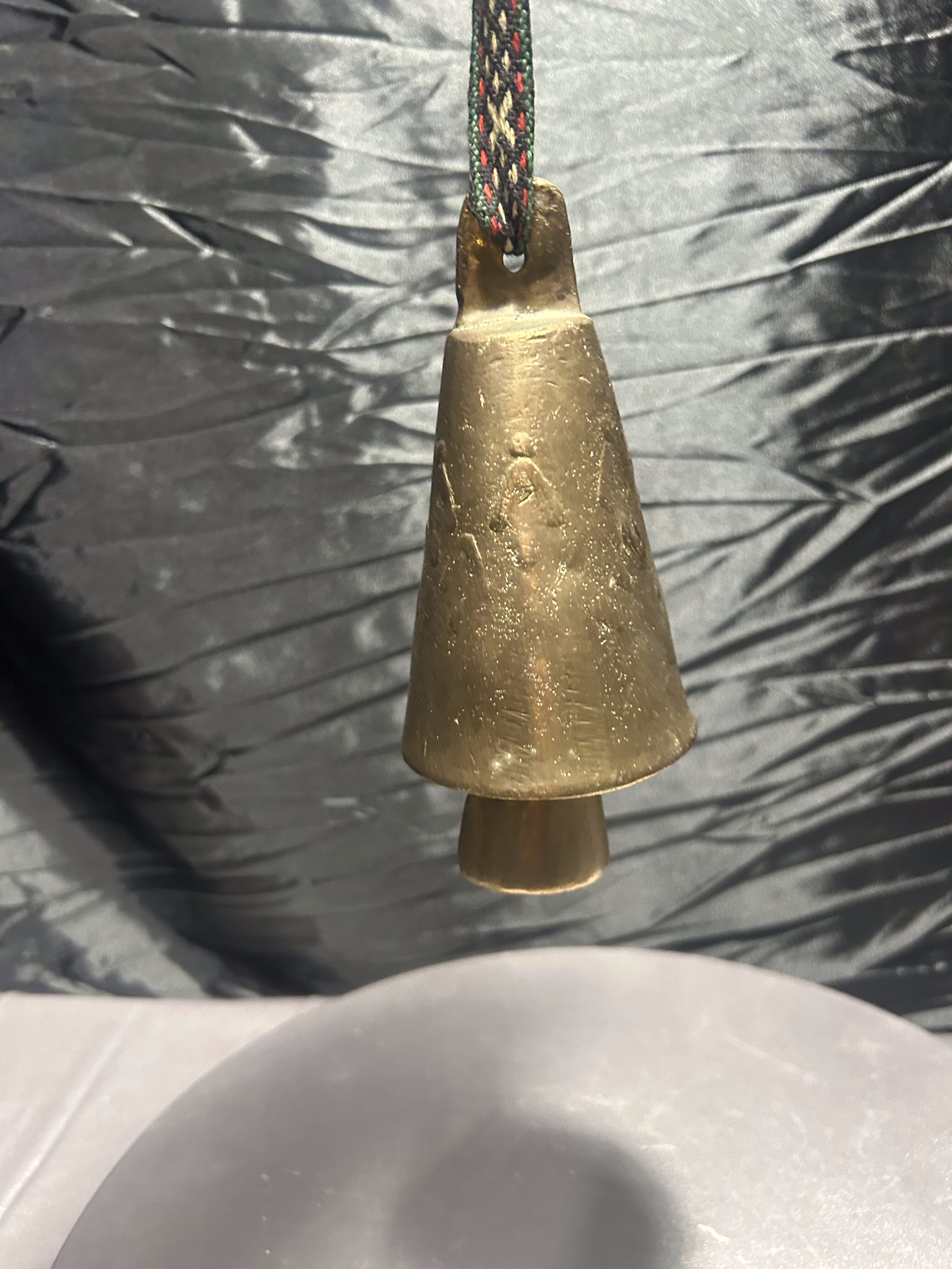 Oryginalny mosiężny dzwonek o masywnej formie, wykonany z pełnego metalu, zawieszony na dekoracyjnym, plecionym pasku w stylu skandynawskim. Prosty, a zarazem elegancki kształt oraz naturalna patyna na powierzchni nadają mu wyjątkowego charakteru.