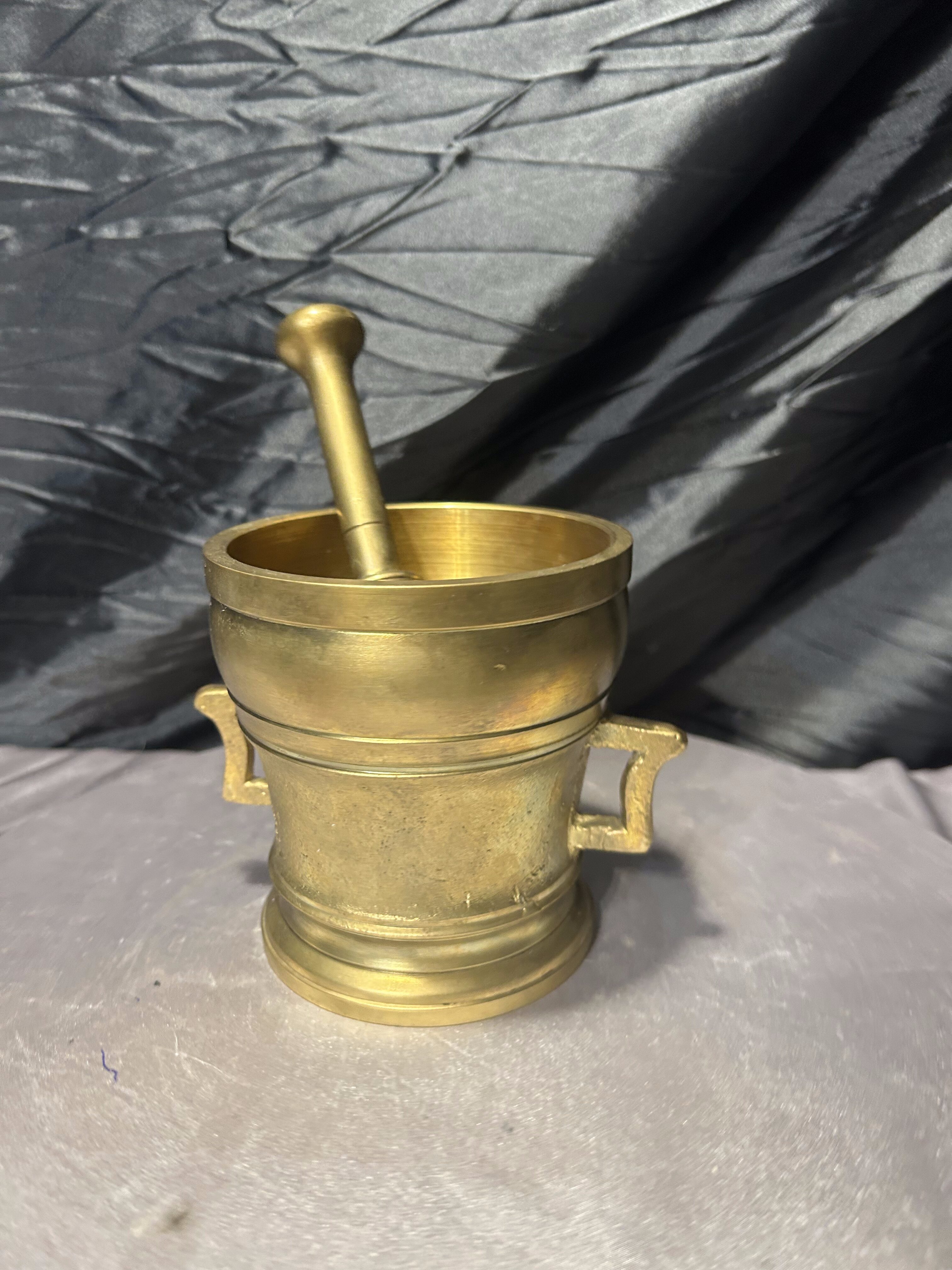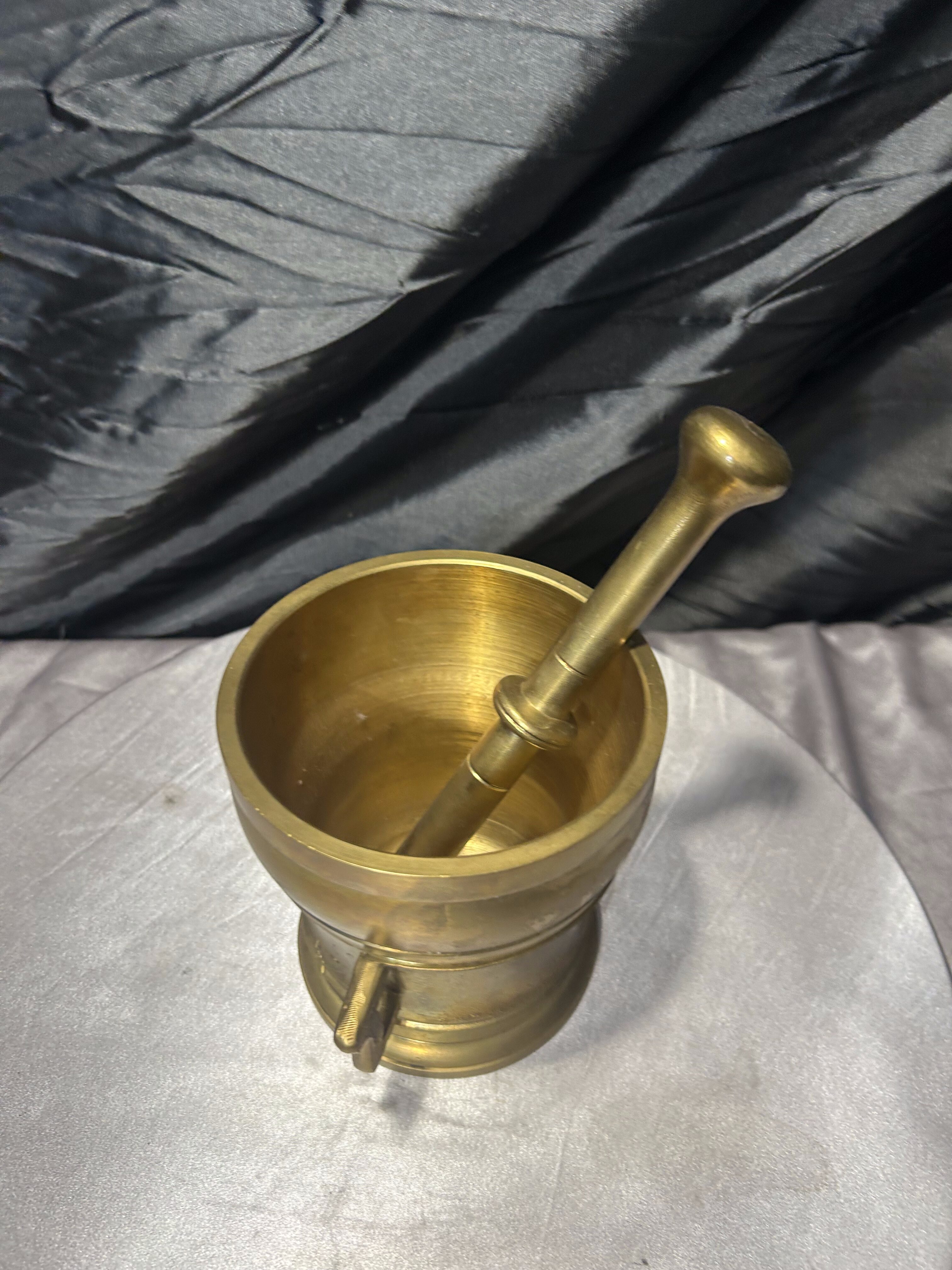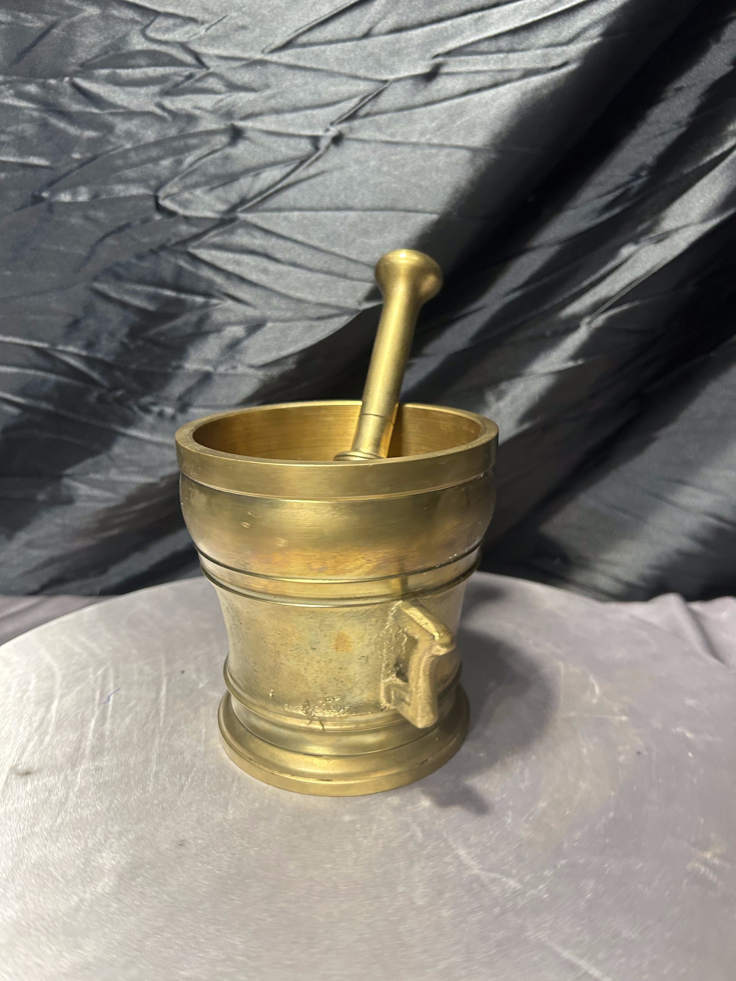 Imponujący, bardzo duży i ciężki moździerz wykonany z mosiądzu, wyposażony w oryginalny tłuczek. To solidny, klasyczny egzemplarz o wyraźnie użytkowym charakterze, który jednocześnie doskonale prezentuje się jako element dekoracyjny. Grube ścianki, stabilna podstawa oraz boczne uchwyty świadczą o przeznaczeniu do intensywnej pracy, a naturalna patyna podkreśla autentyczność i wiek przedmiotu.