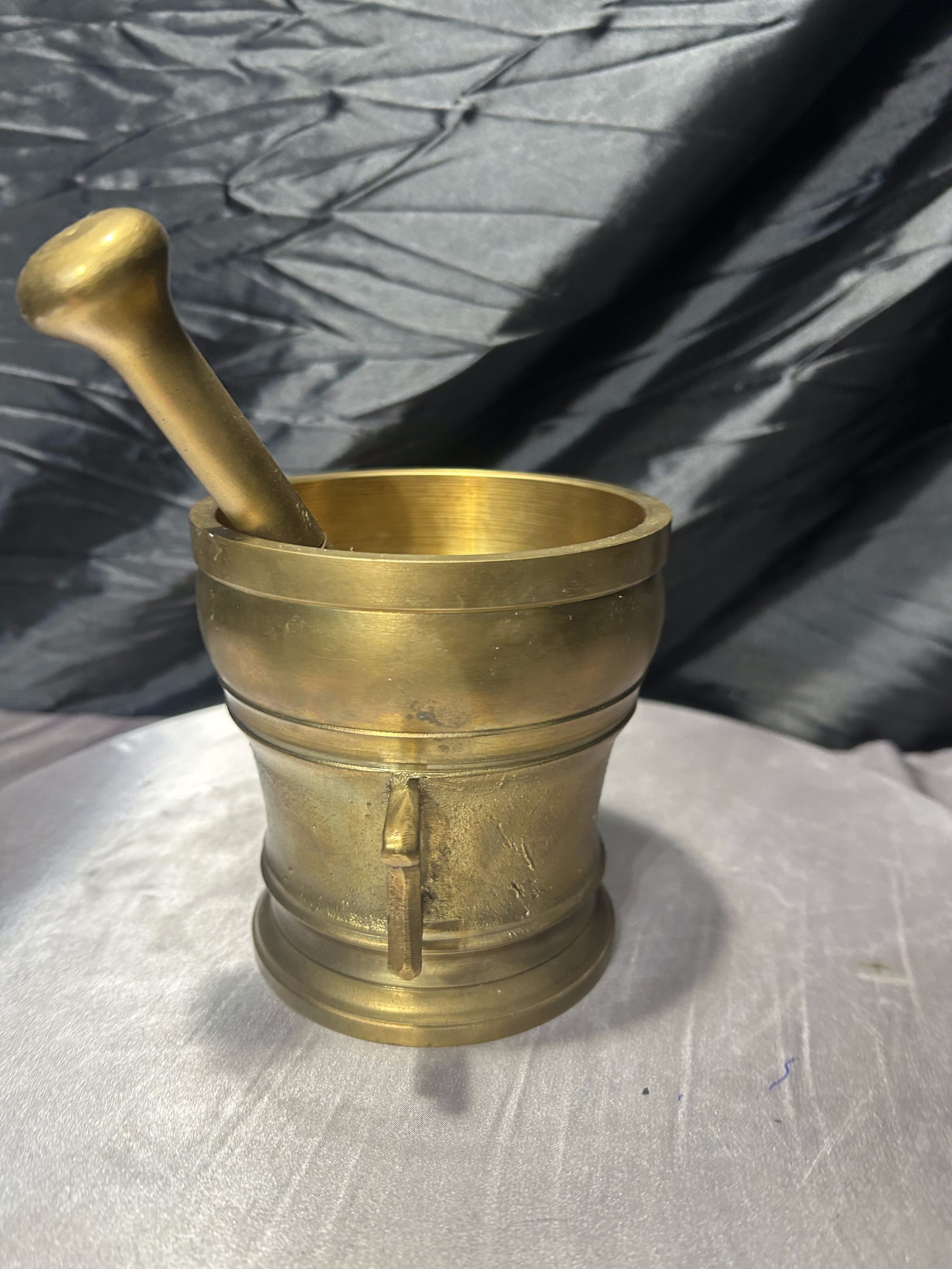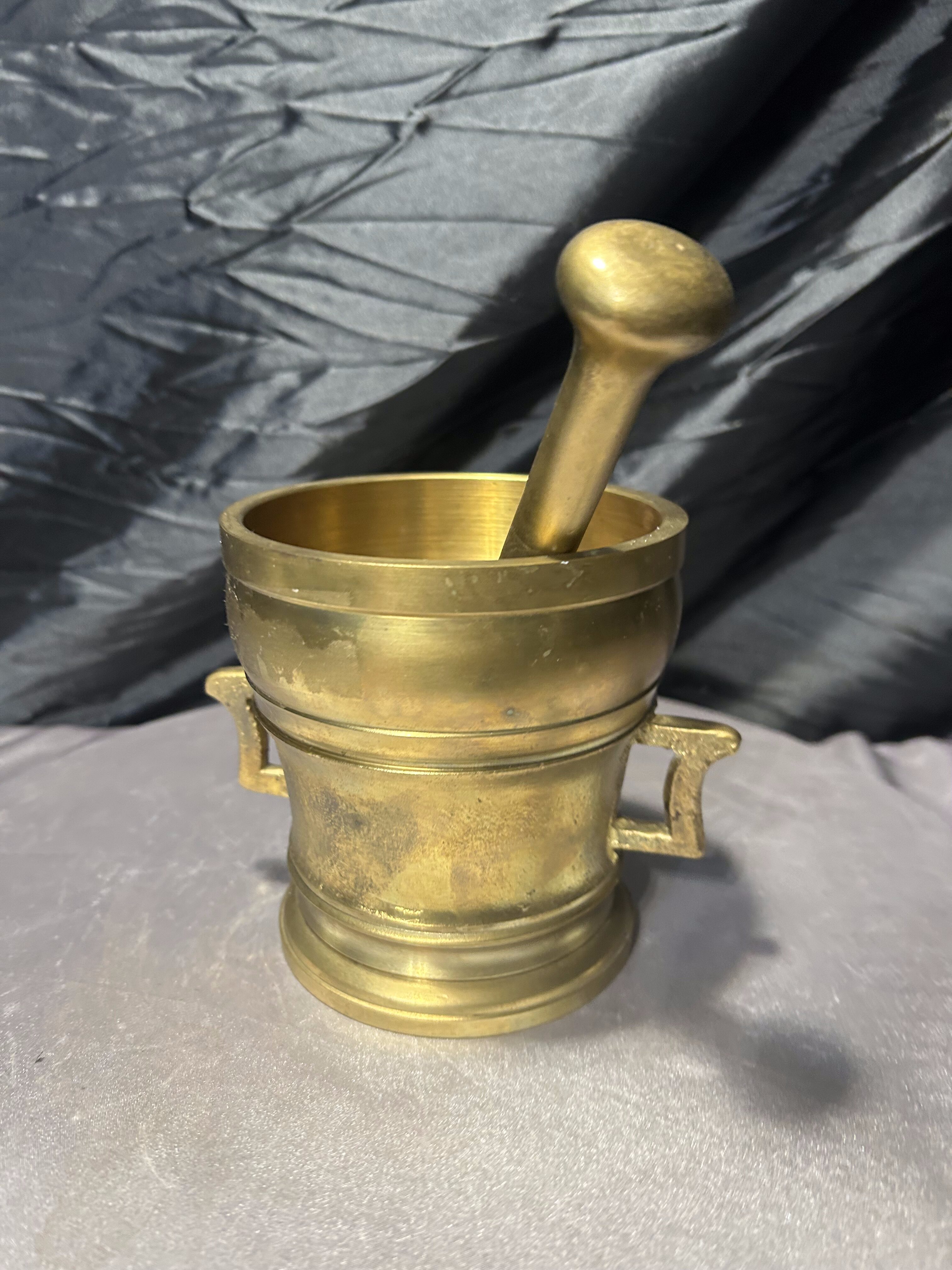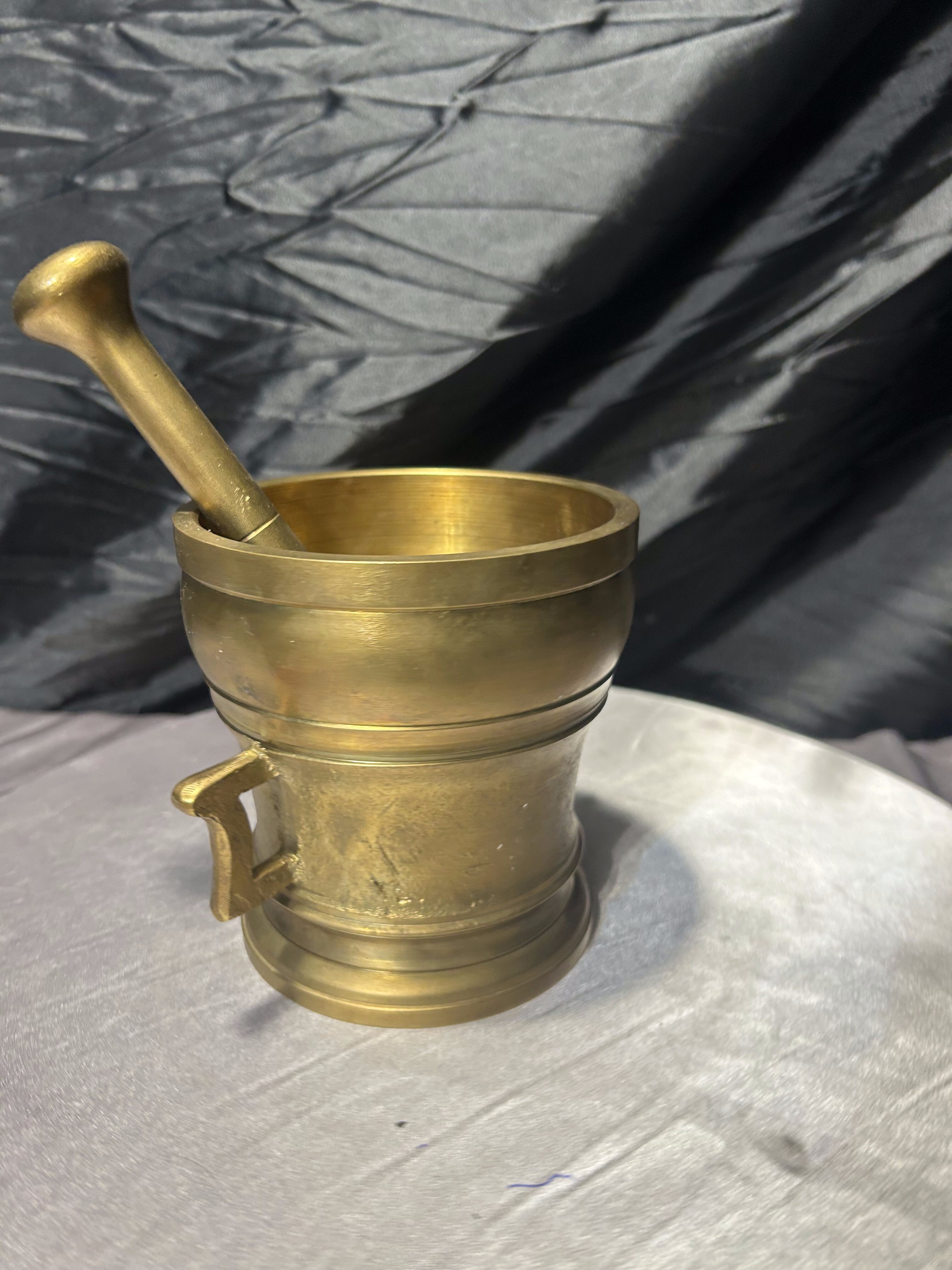 Imponujący, bardzo duży i ciężki moździerz wykonany z mosiądzu, wyposażony w oryginalny tłuczek. To solidny, klasyczny egzemplarz o wyraźnie użytkowym charakterze, który jednocześnie doskonale prezentuje się jako element dekoracyjny. Grube ścianki, stabilna podstawa oraz boczne uchwyty świadczą o przeznaczeniu do intensywnej pracy, a naturalna patyna podkreśla autentyczność i wiek przedmiotu.