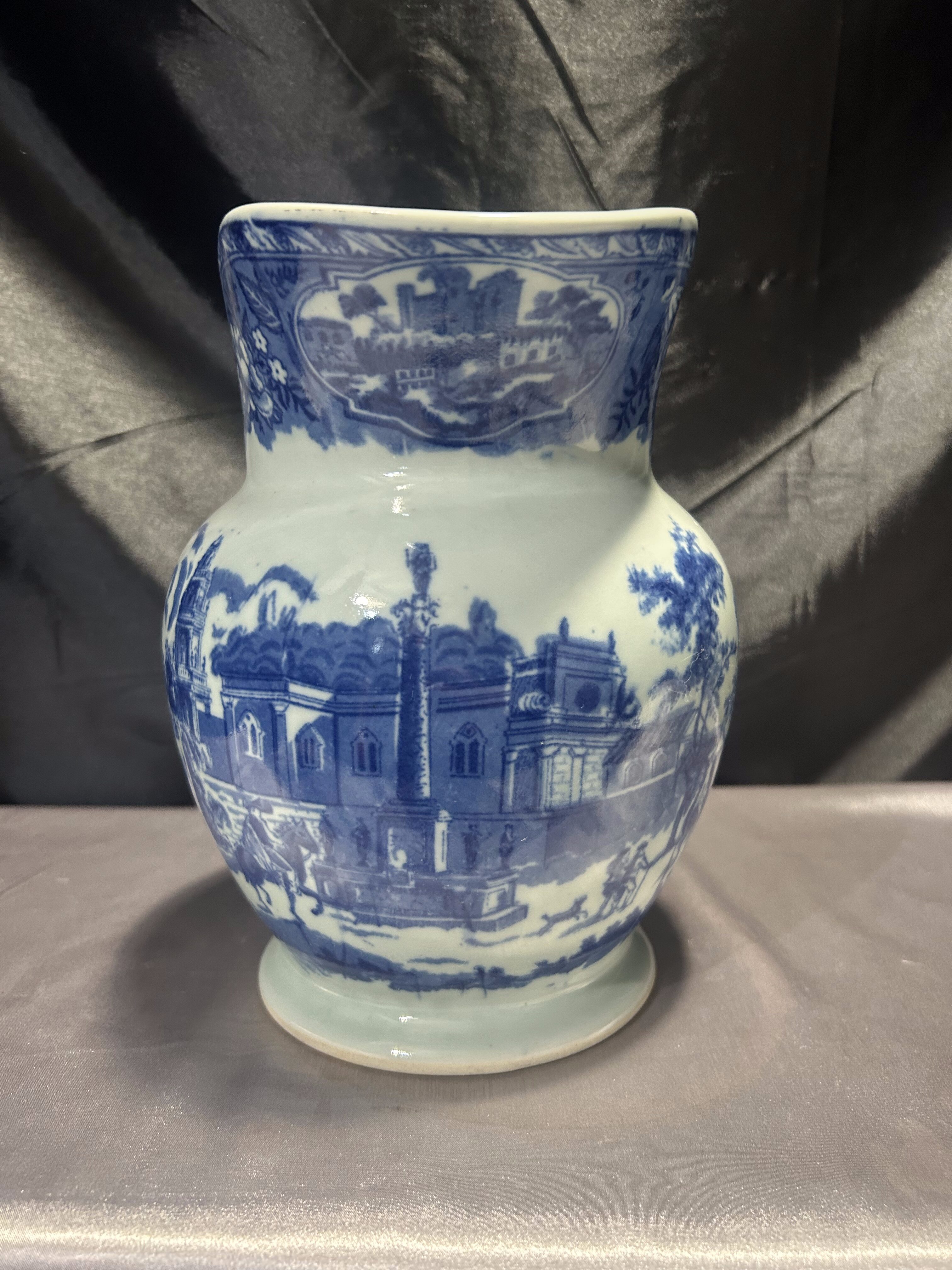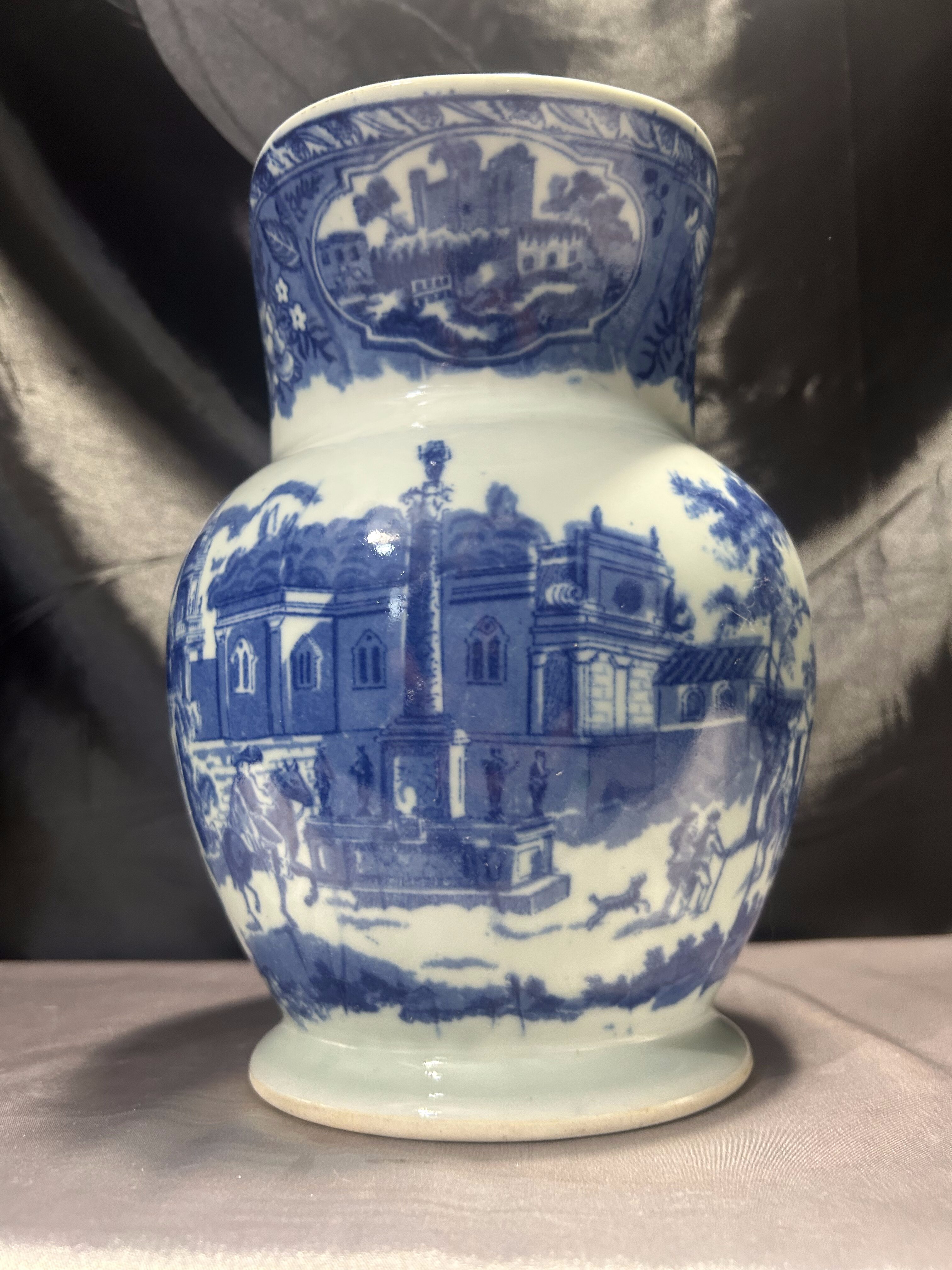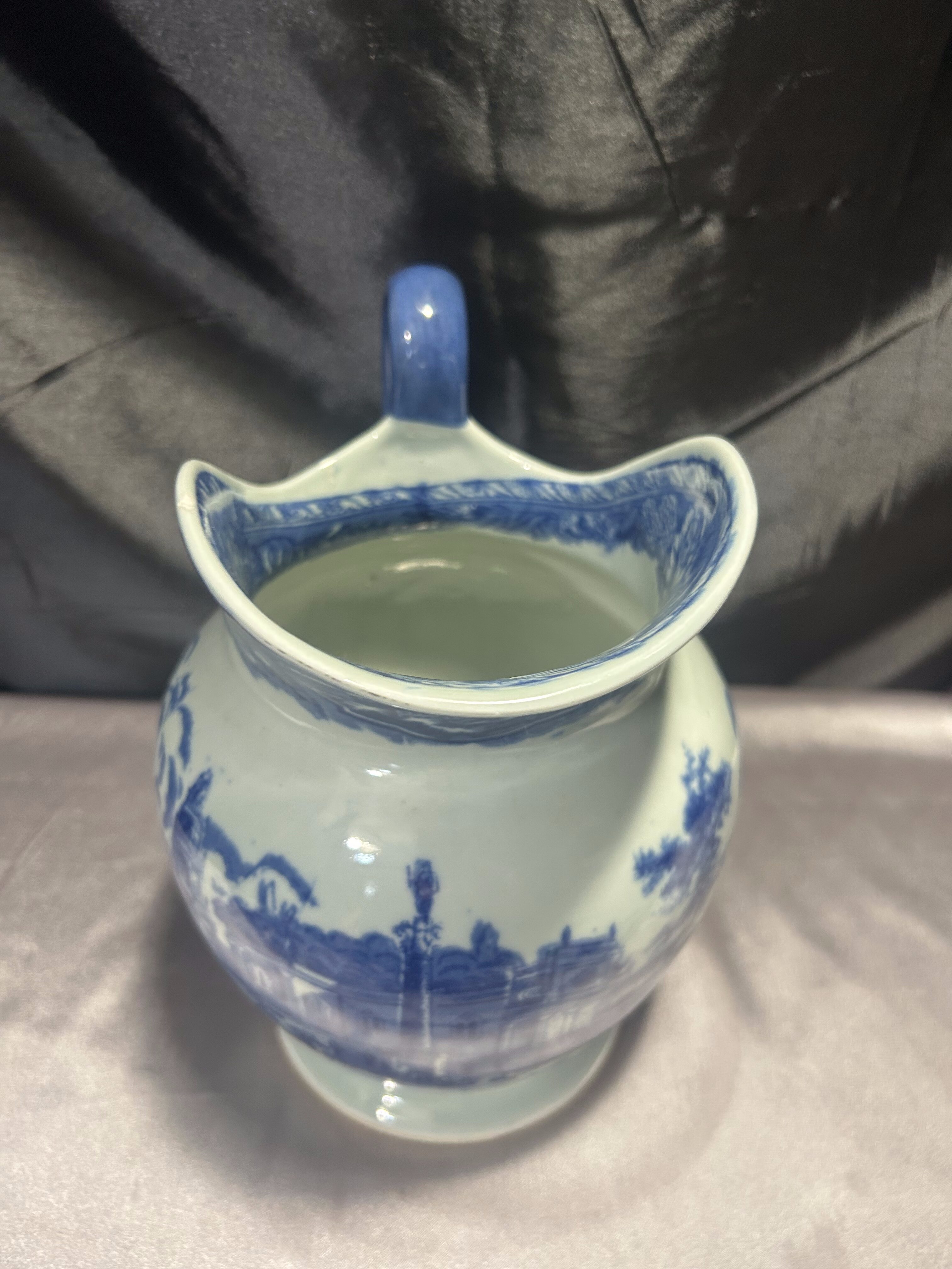 Elegancki dzban ceramiczny typu ironstone, wykonany w charakterystycznym stylu blue & white. Ozdobiony motywem transferowym przedstawiającym romantyczną scenę architektoniczno-roślinną oraz florystycznym bordiurem przy rancie. Sygnowany stemplem Victoria Ware – Ironstone oraz herbem królewskim z lwem i jednorożcem, co wskazuje na angielskie pochodzenie naczynia.