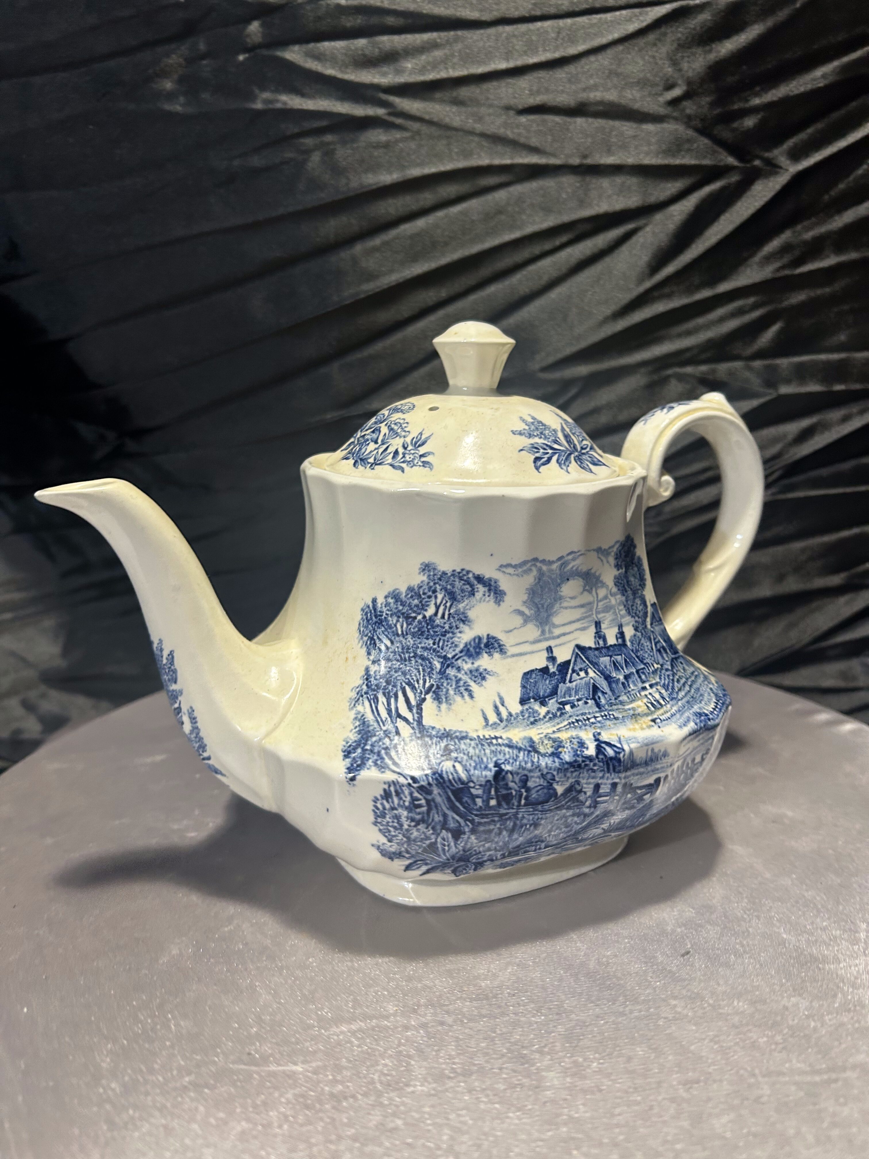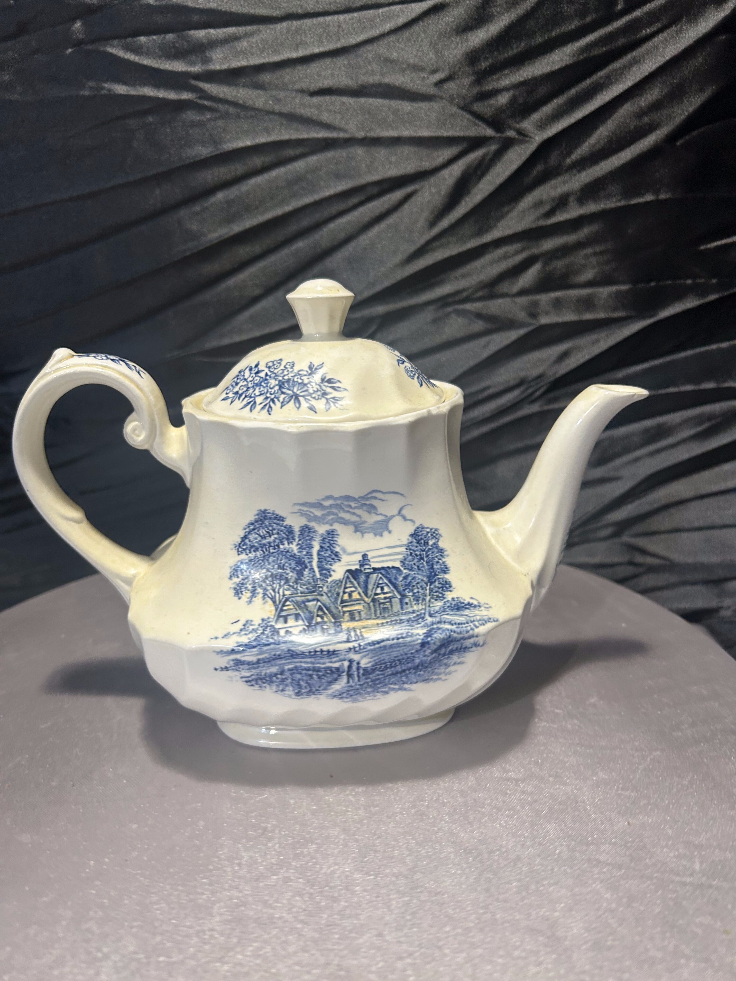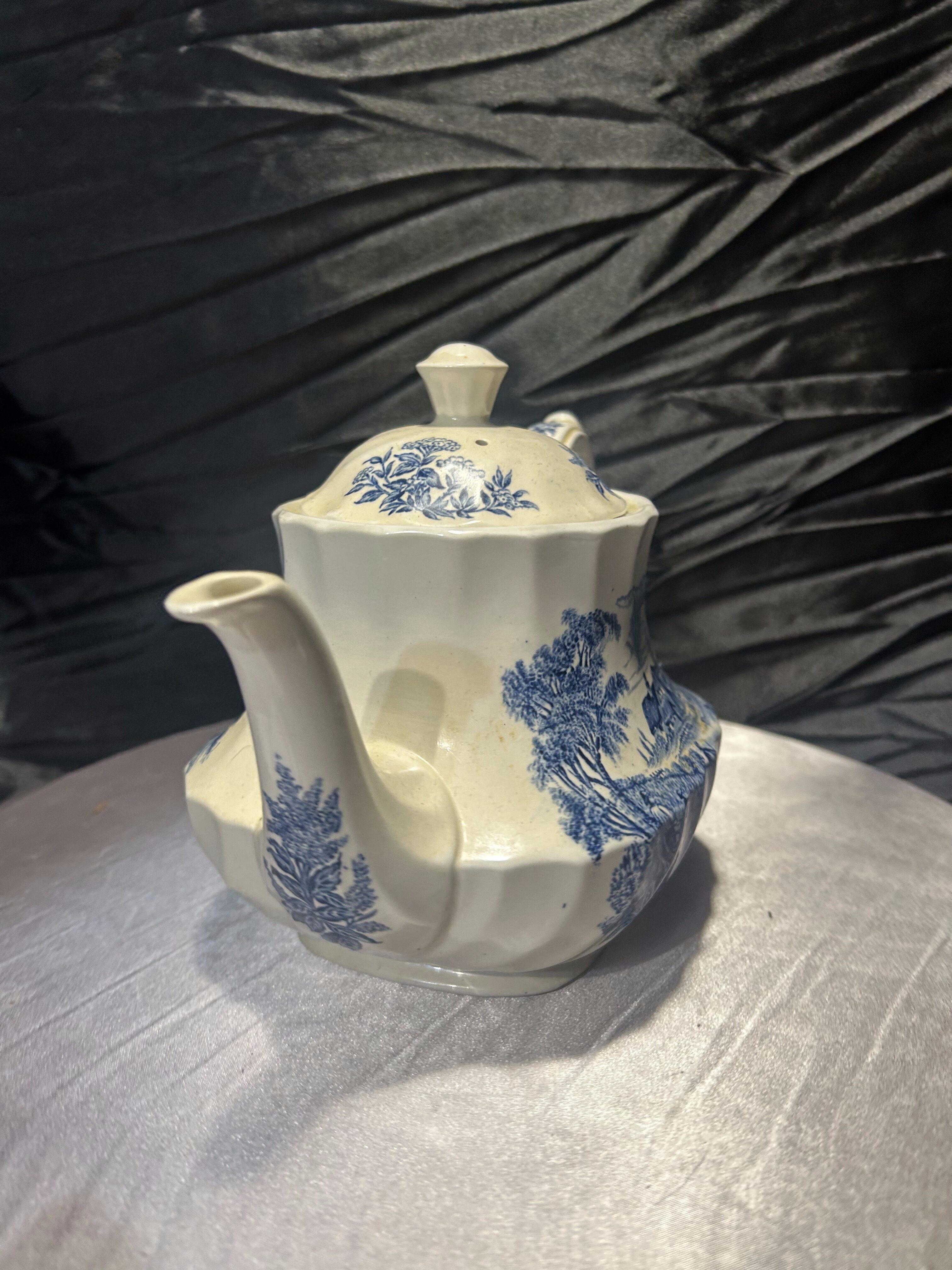Subtelny i pełen uroku dzbanek do herbaty sygnowany marką Ridgway (wzór Meadowsweet), ozdobiony nostalgicznie-angielskim, niebieskim motywem krajobrazowym na białym tle. Elegancki, delikatnie zaokrąglony kształt, stylowe uchwyty i dekiel sprawiają, że nadaje się zarówno do uroczystej porcelanowej filiżanki, jak i jako dekoracja na półce.