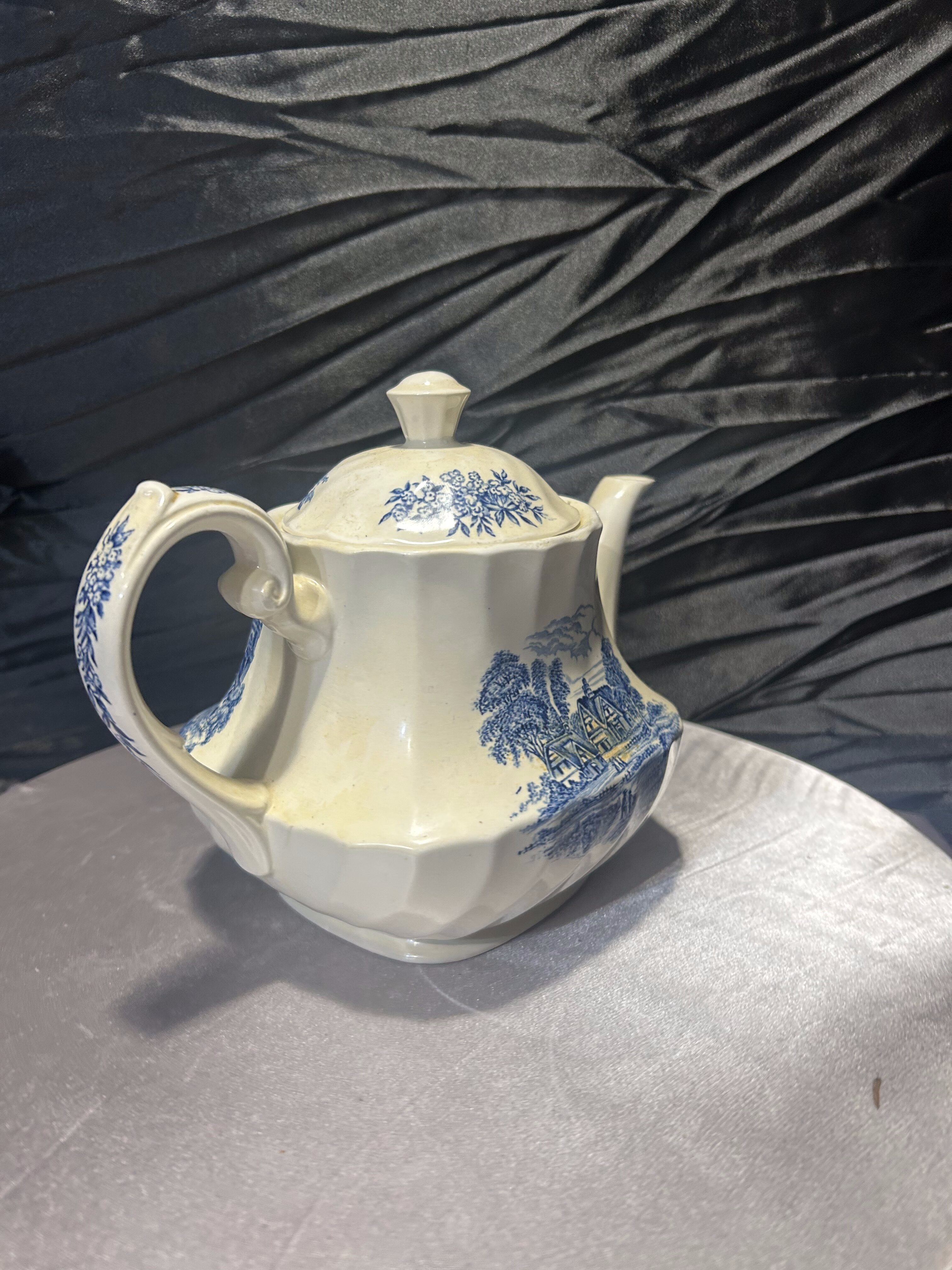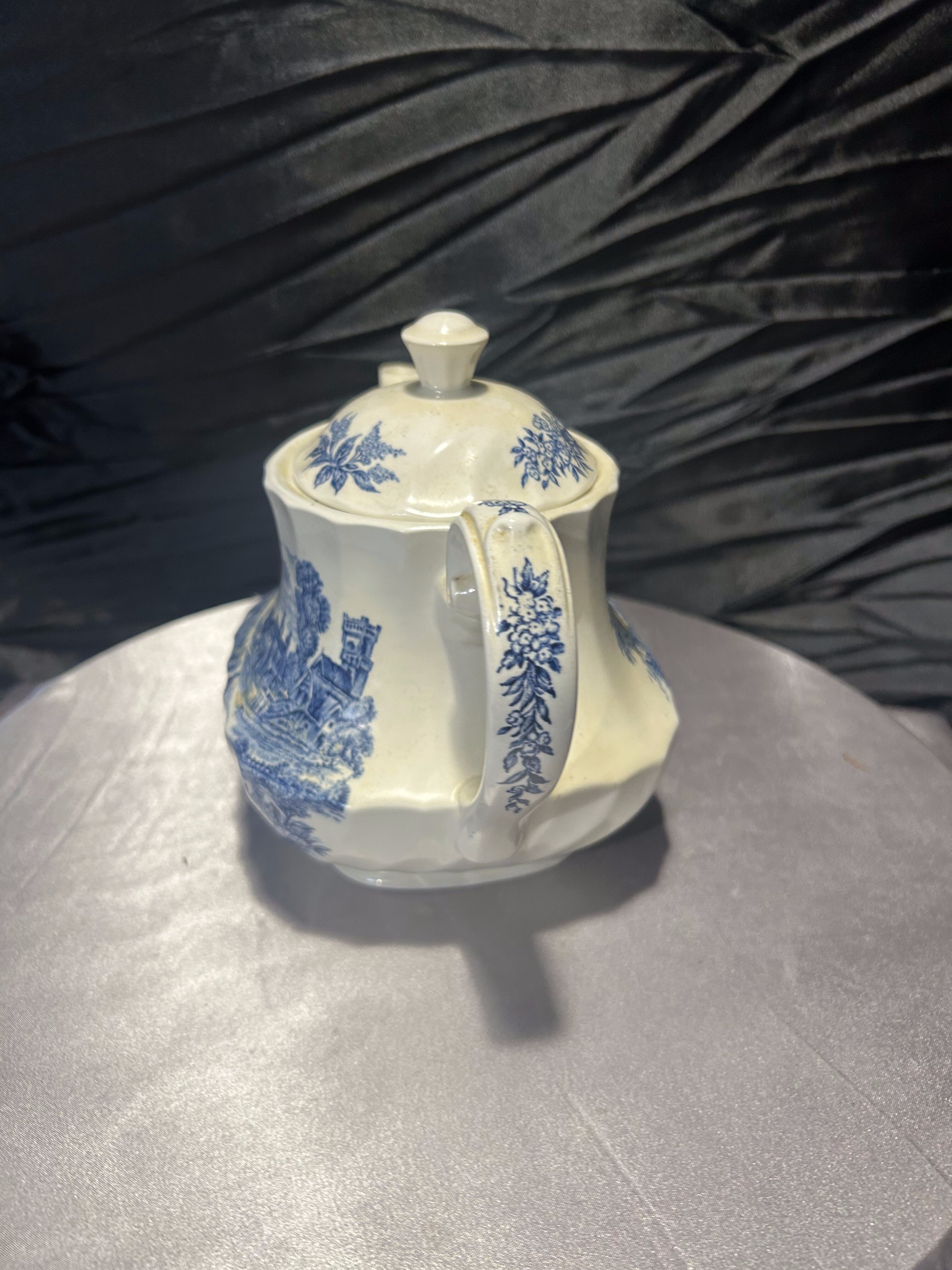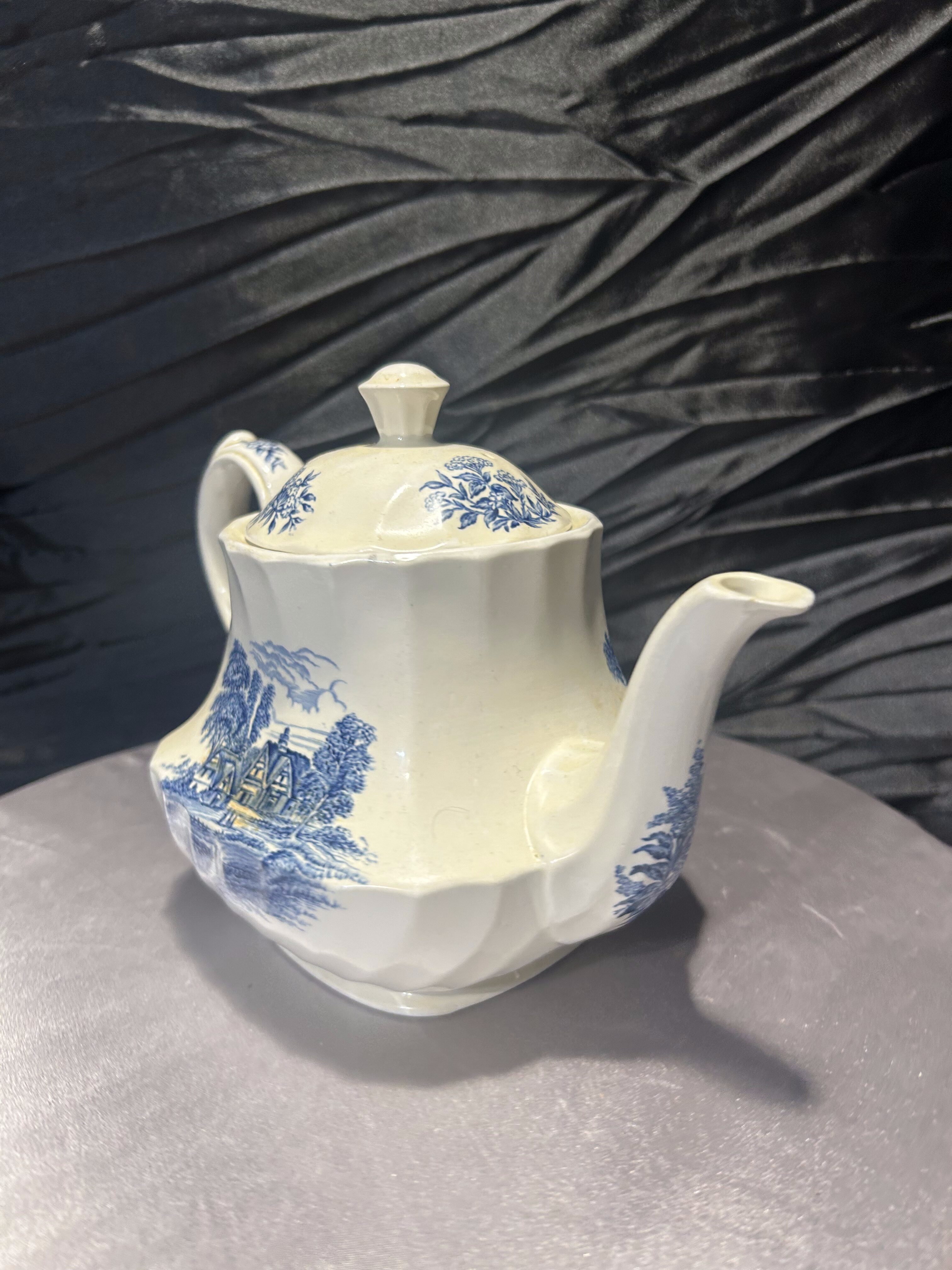 Subtelny i pełen uroku dzbanek do herbaty sygnowany marką Ridgway (wzór Meadowsweet), ozdobiony nostalgicznie-angielskim, niebieskim motywem krajobrazowym na białym tle. Elegancki, delikatnie zaokrąglony kształt, stylowe uchwyty i dekiel sprawiają, że nadaje się zarówno do uroczystej porcelanowej filiżanki, jak i jako dekoracja na półce.