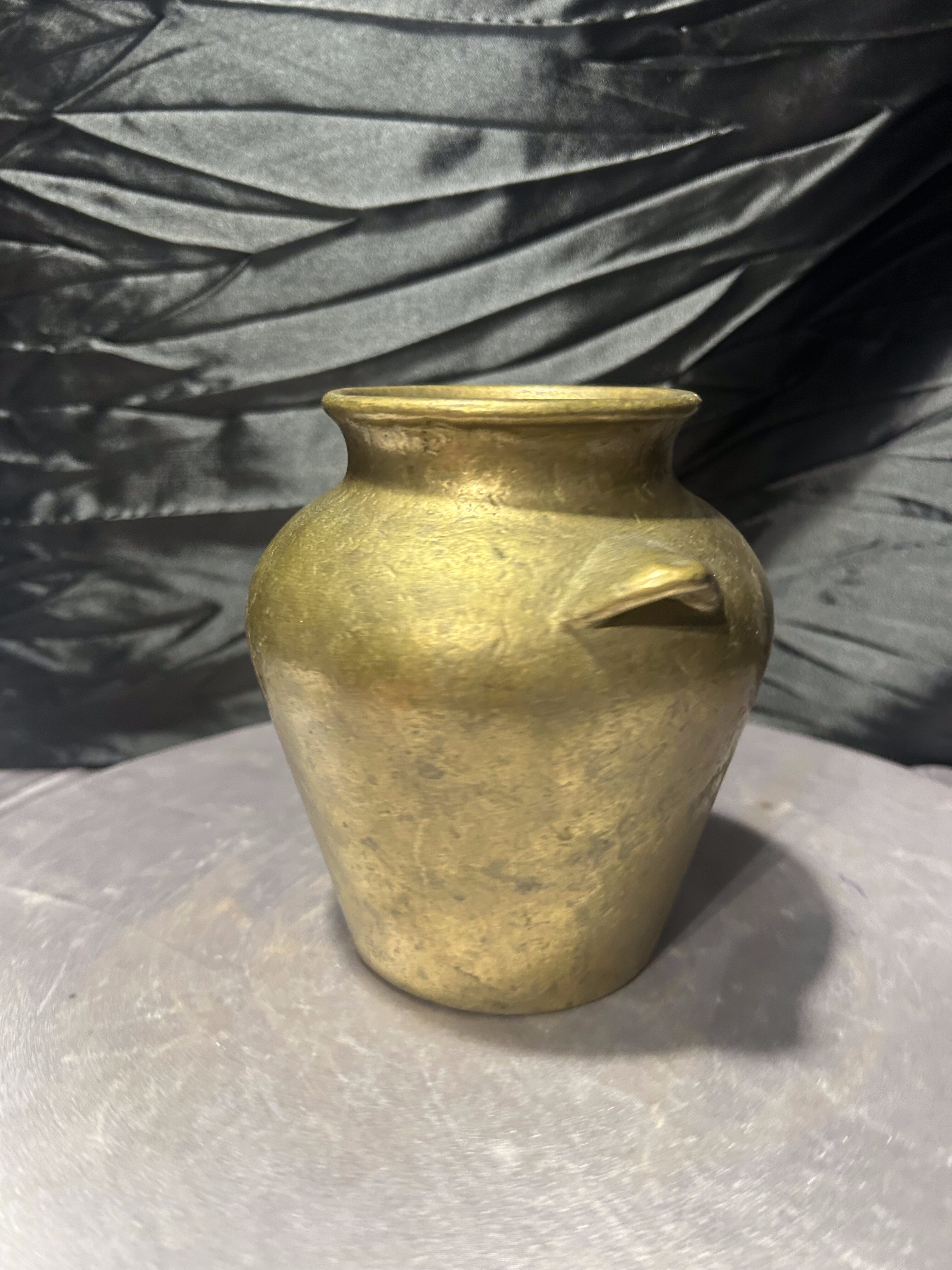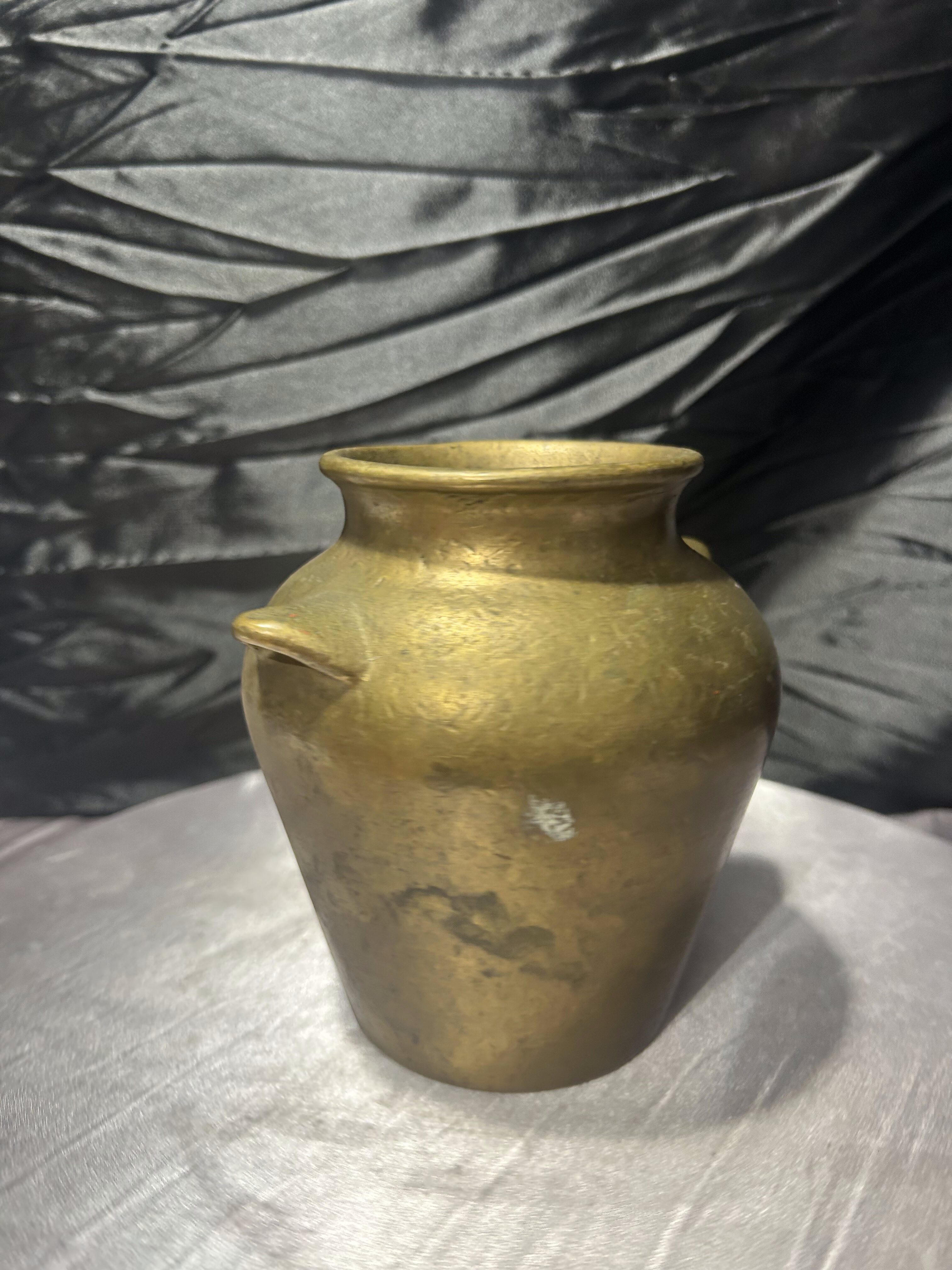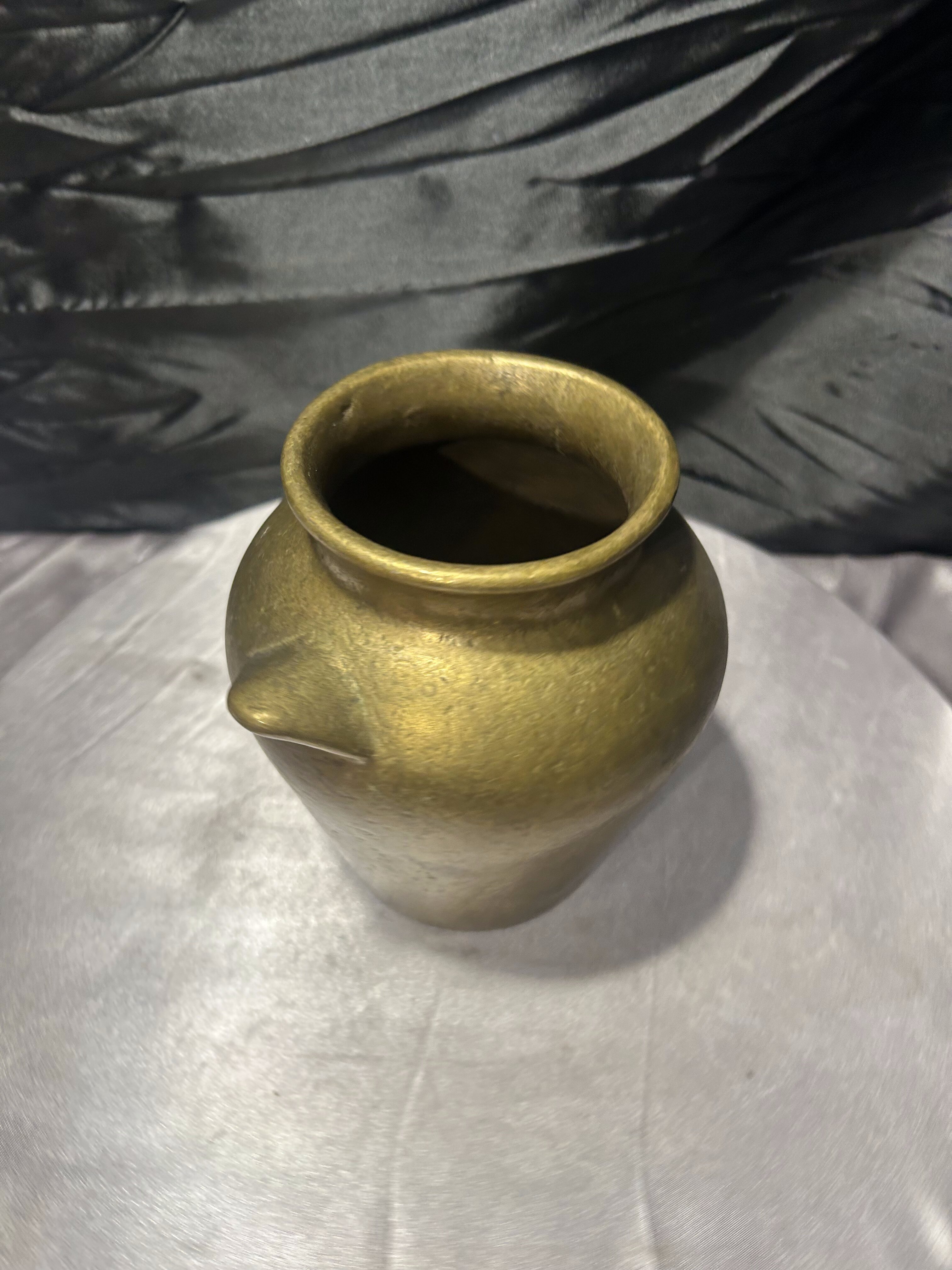 Masywny dzbanek mosiężny o klasycznej, urnowej formie, nawiązującej do dawnych naczyń użytkowych i dekoracyjnych. Proporcjonalna bryła, delikatnie rozszerzana ku górze, z krótkimi uchwytami po bokach, nadaje mu ponadczasowy charakter. Ciężar i grubość materiału świadczą o solidnym wykonaniu oraz wysokiej jakości stopu.