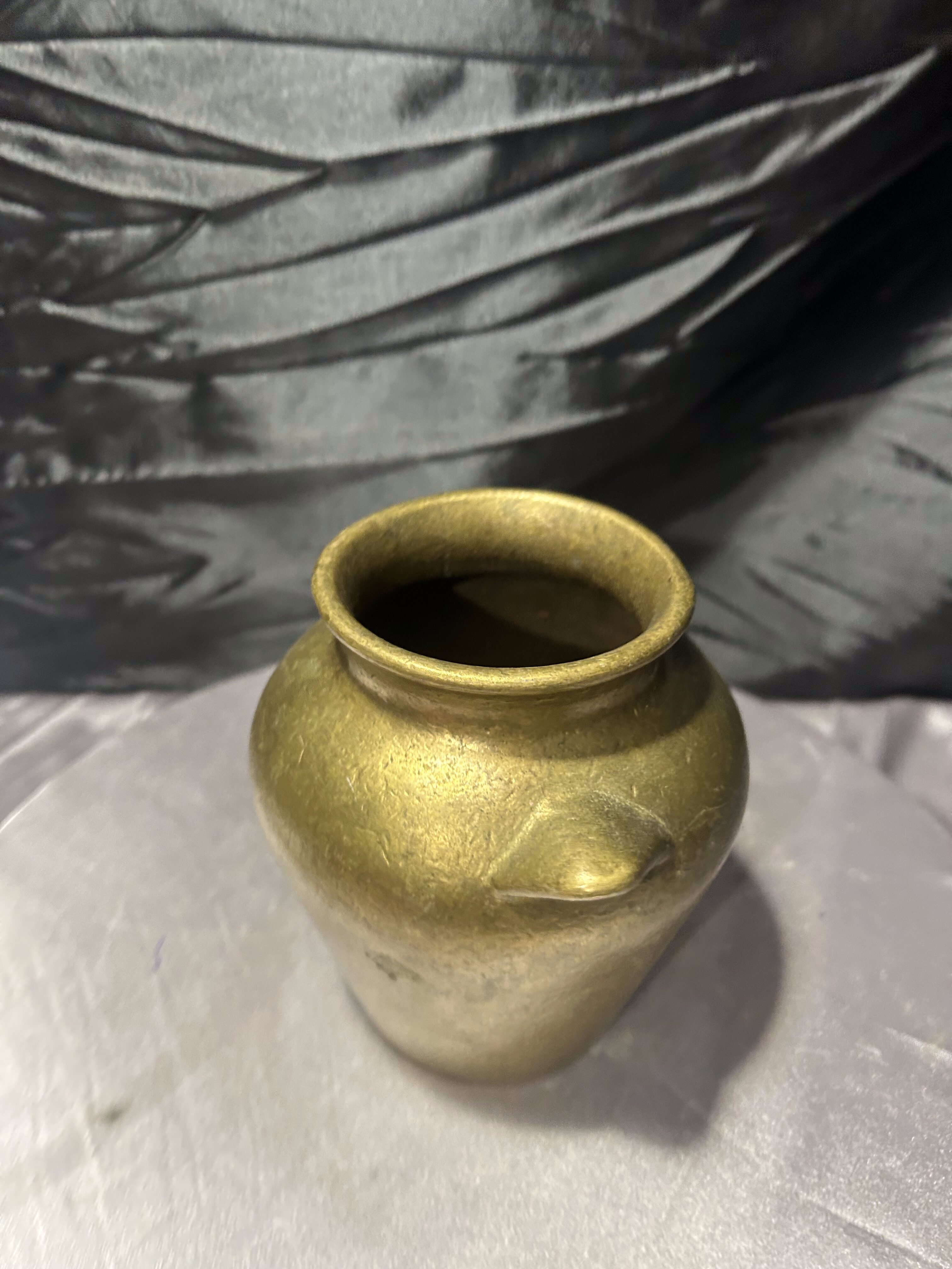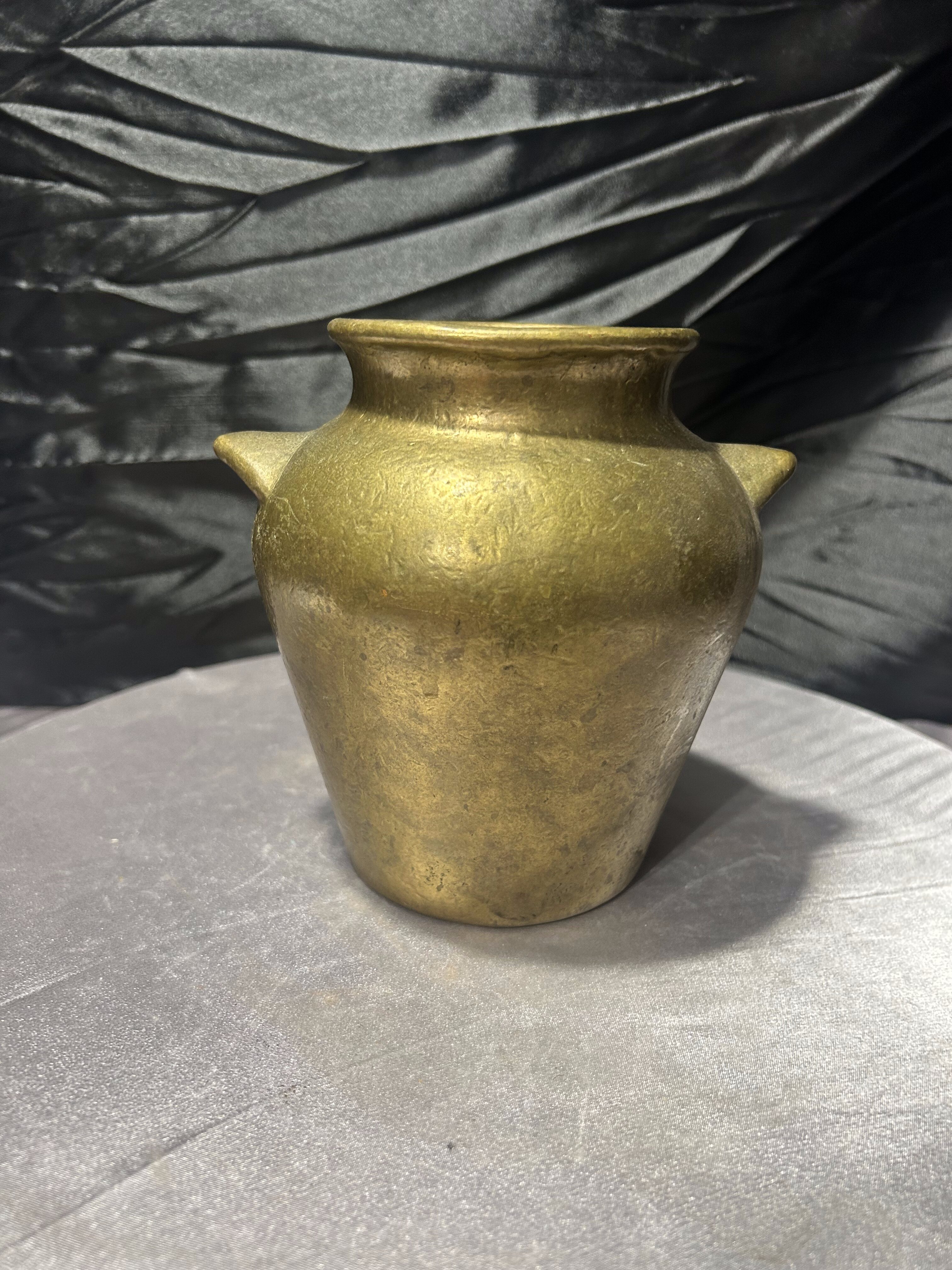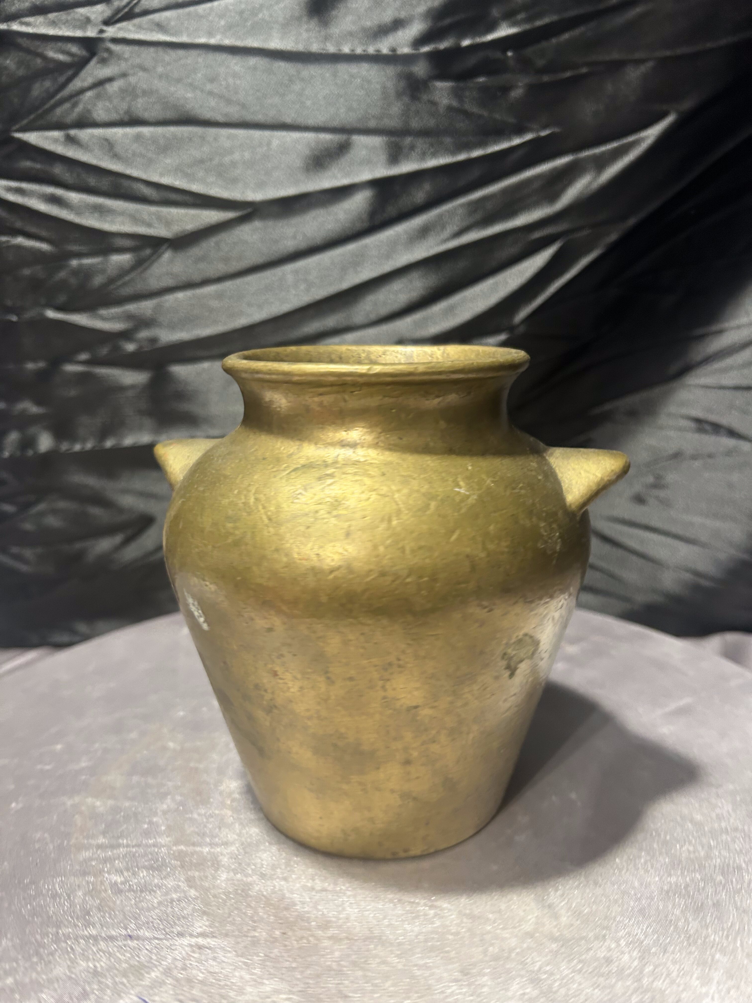 Masywny dzbanek mosiężny o klasycznej, urnowej formie, nawiązującej do dawnych naczyń użytkowych i dekoracyjnych. Proporcjonalna bryła, delikatnie rozszerzana ku górze, z krótkimi uchwytami po bokach, nadaje mu ponadczasowy charakter. Ciężar i grubość materiału świadczą o solidnym wykonaniu oraz wysokiej jakości stopu.
