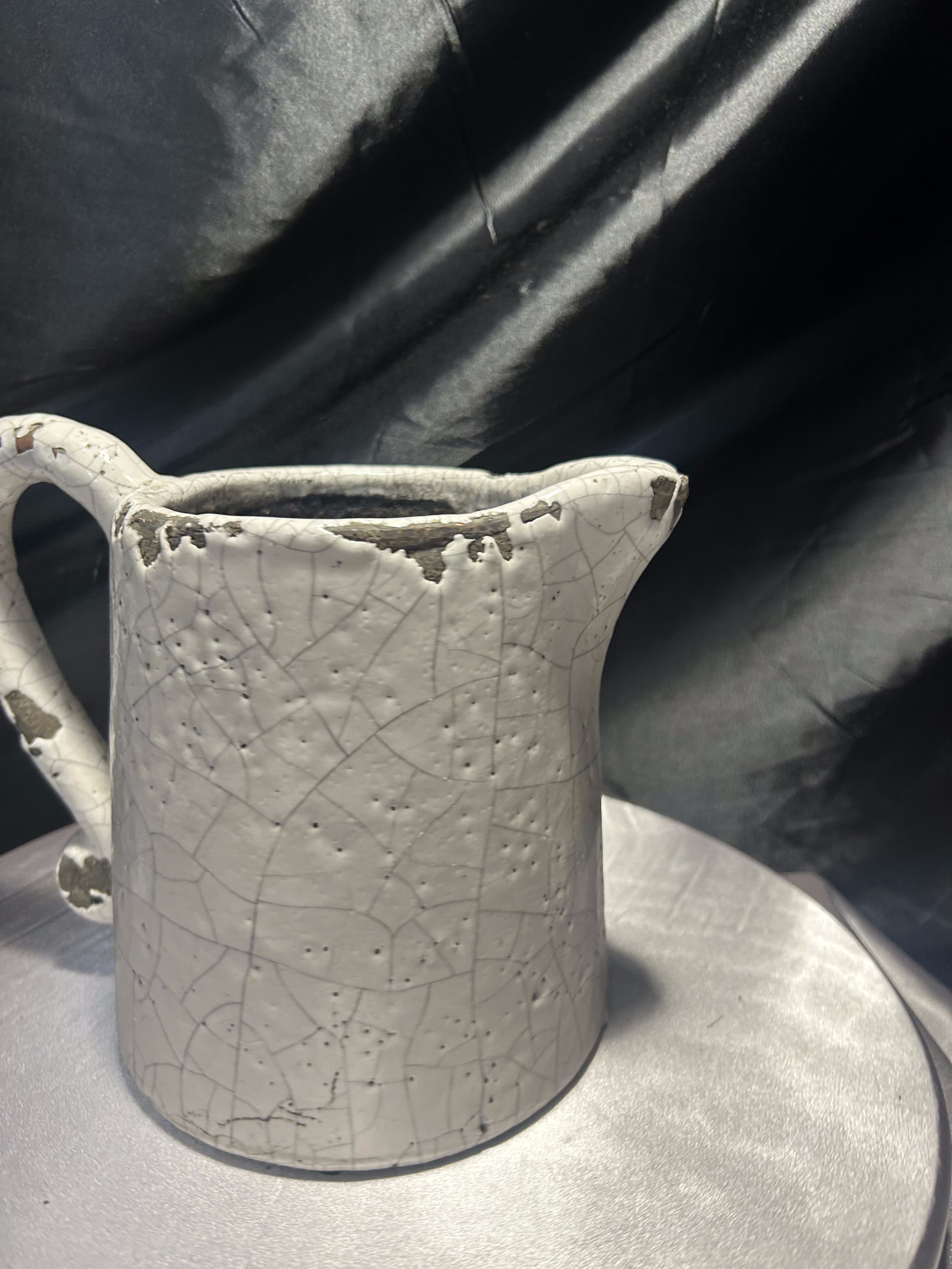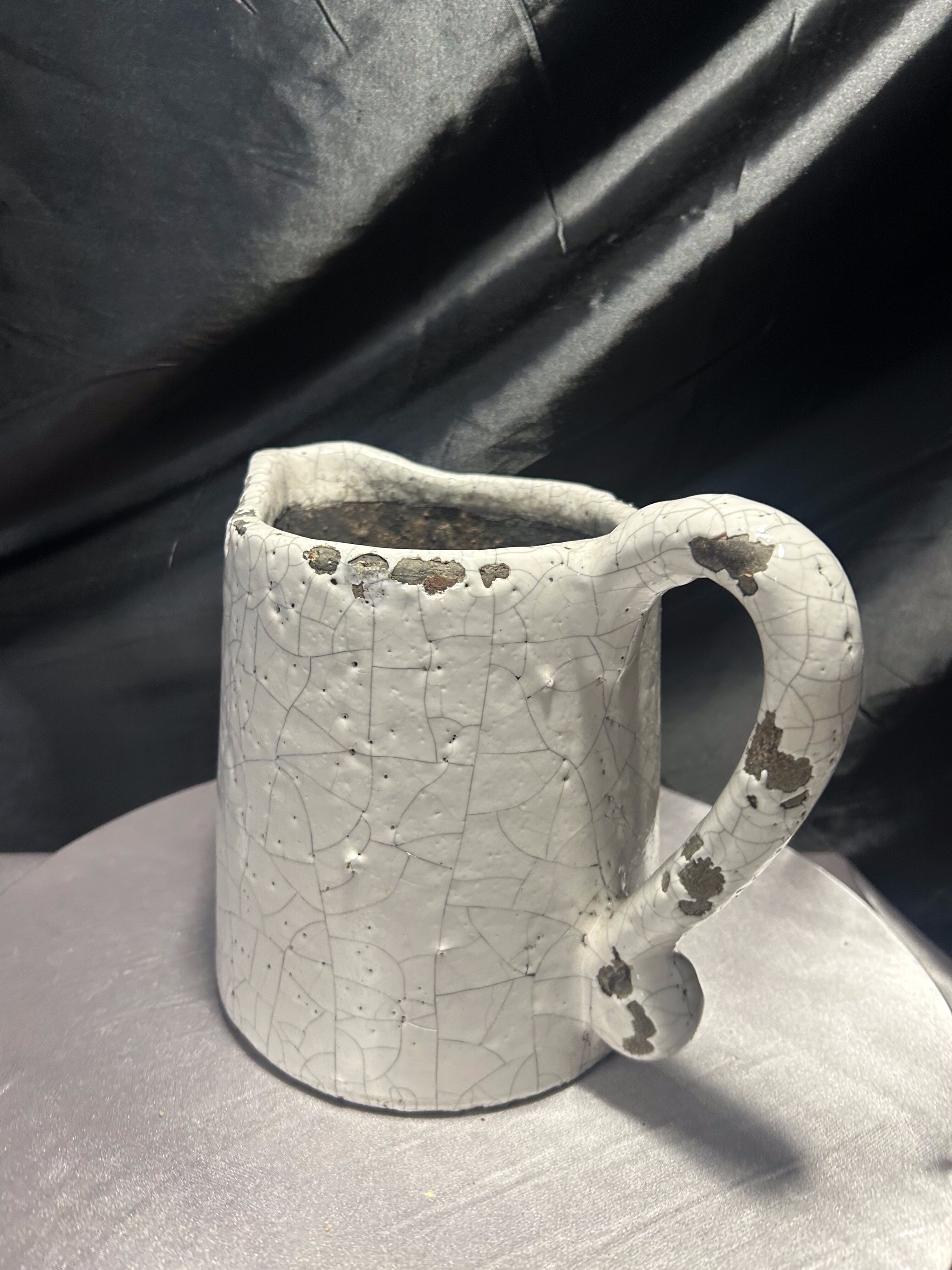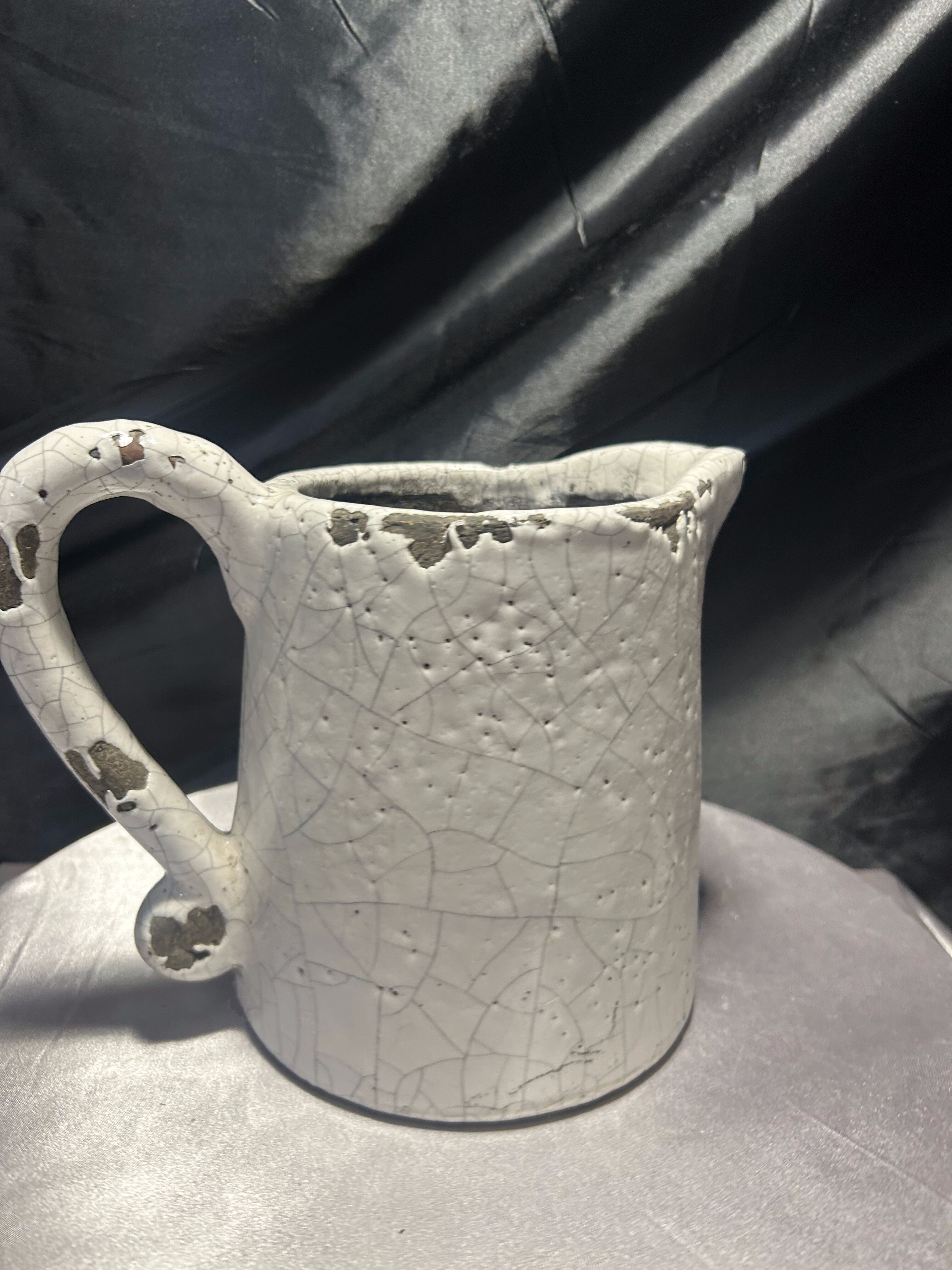 Dzbanek z charakterem – szorstki, popękany, a jednocześnie piękny w swojej niedoskonałości. Może pełnić funkcję wazonu na suche kwiaty, pojemnika dekoracyjnego lub oryginalnego akcentu na regale. To ceramika, która opowiada swoją historię – niepowtarzalna i pełna uroku.