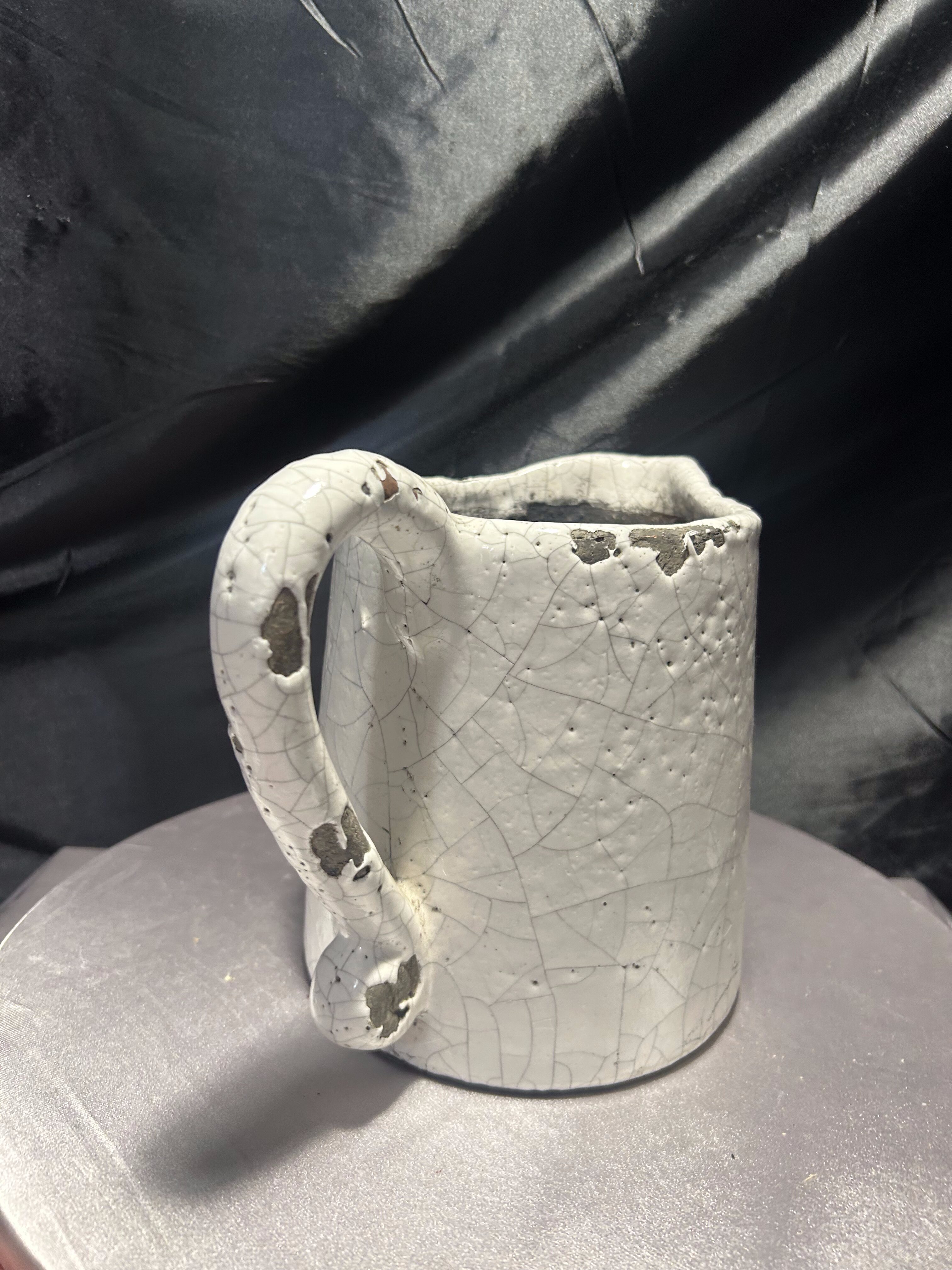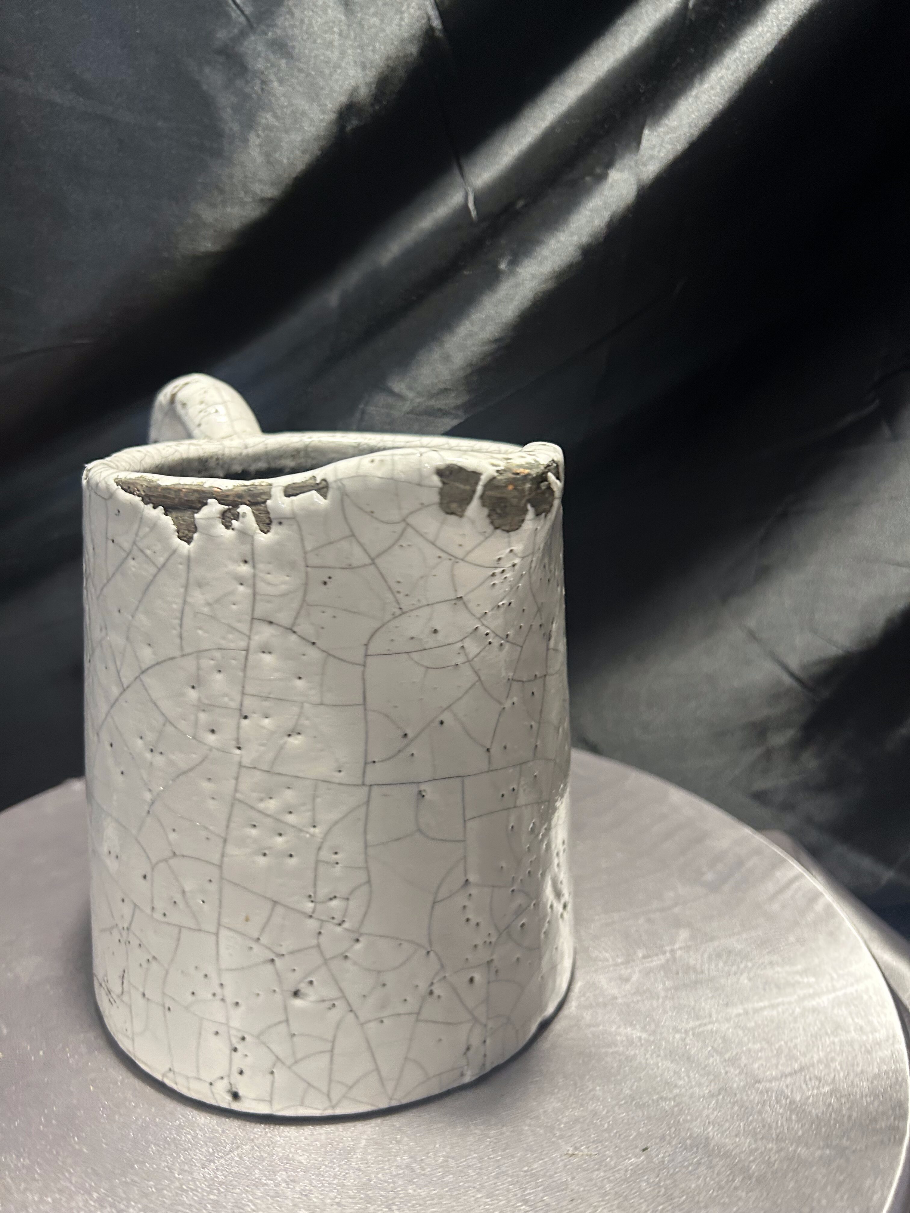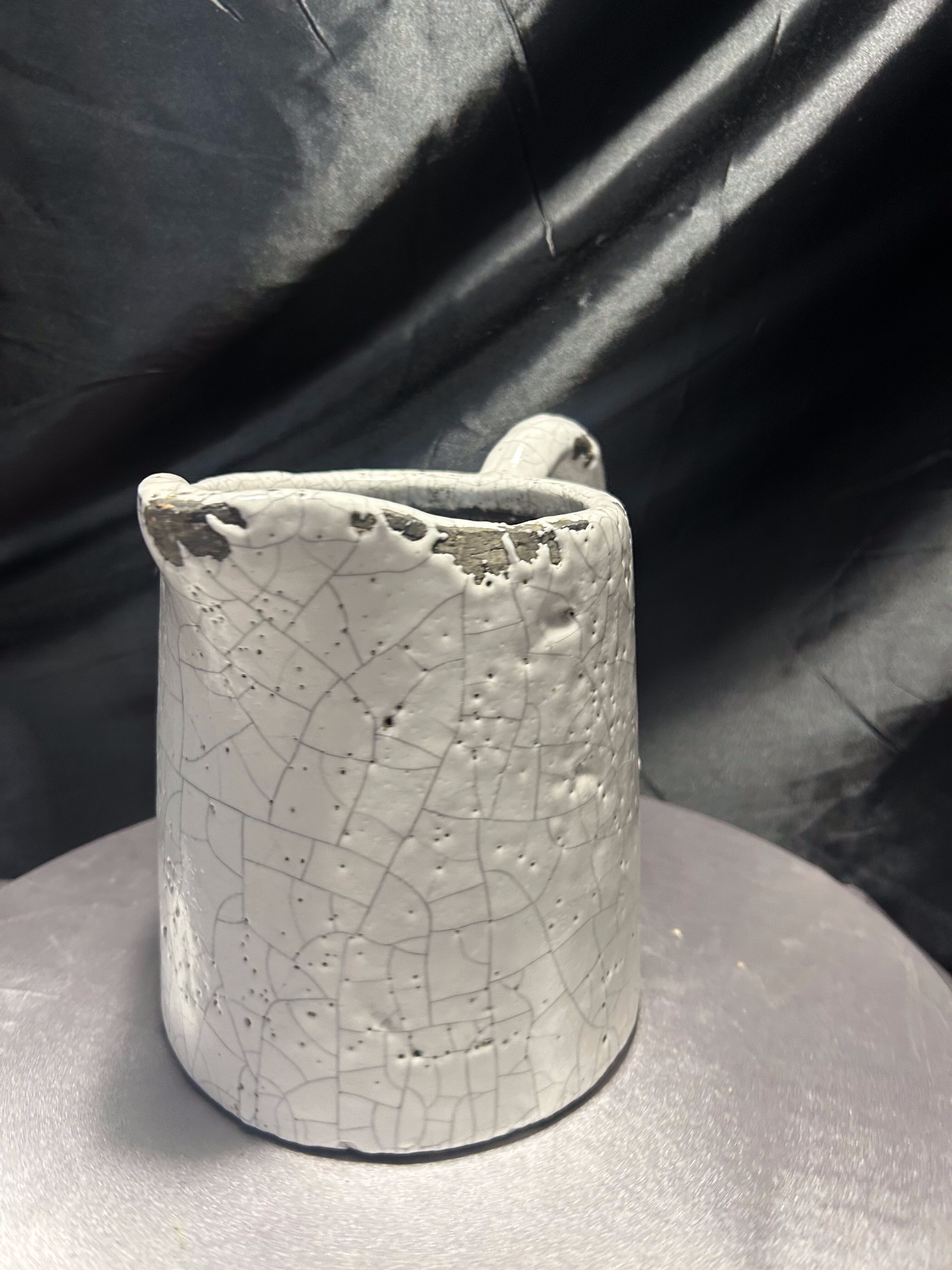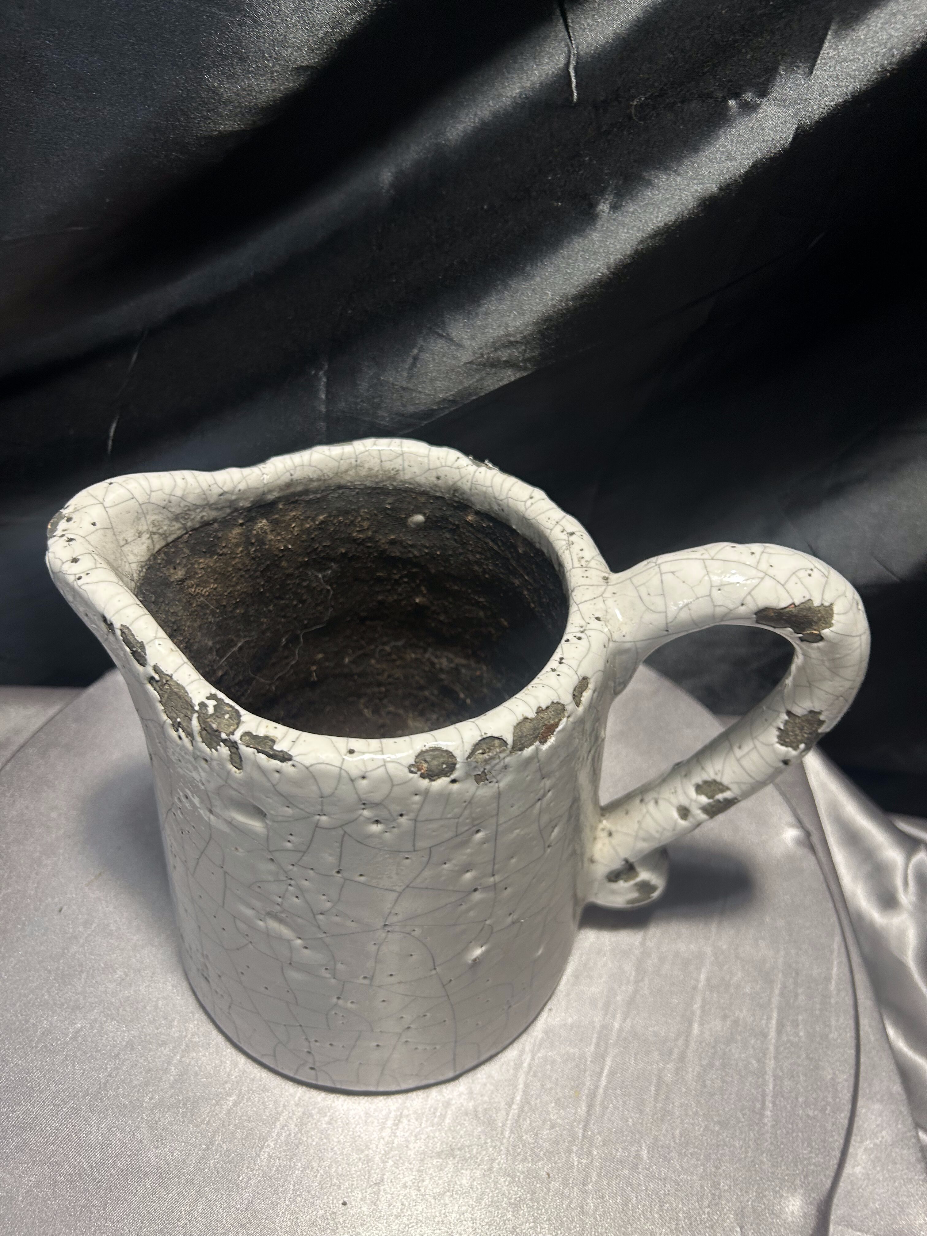 Dzbanek z charakterem – szorstki, popękany, a jednocześnie piękny w swojej niedoskonałości. Może pełnić funkcję wazonu na suche kwiaty, pojemnika dekoracyjnego lub oryginalnego akcentu na regale. To ceramika, która opowiada swoją historię – niepowtarzalna i pełna uroku.