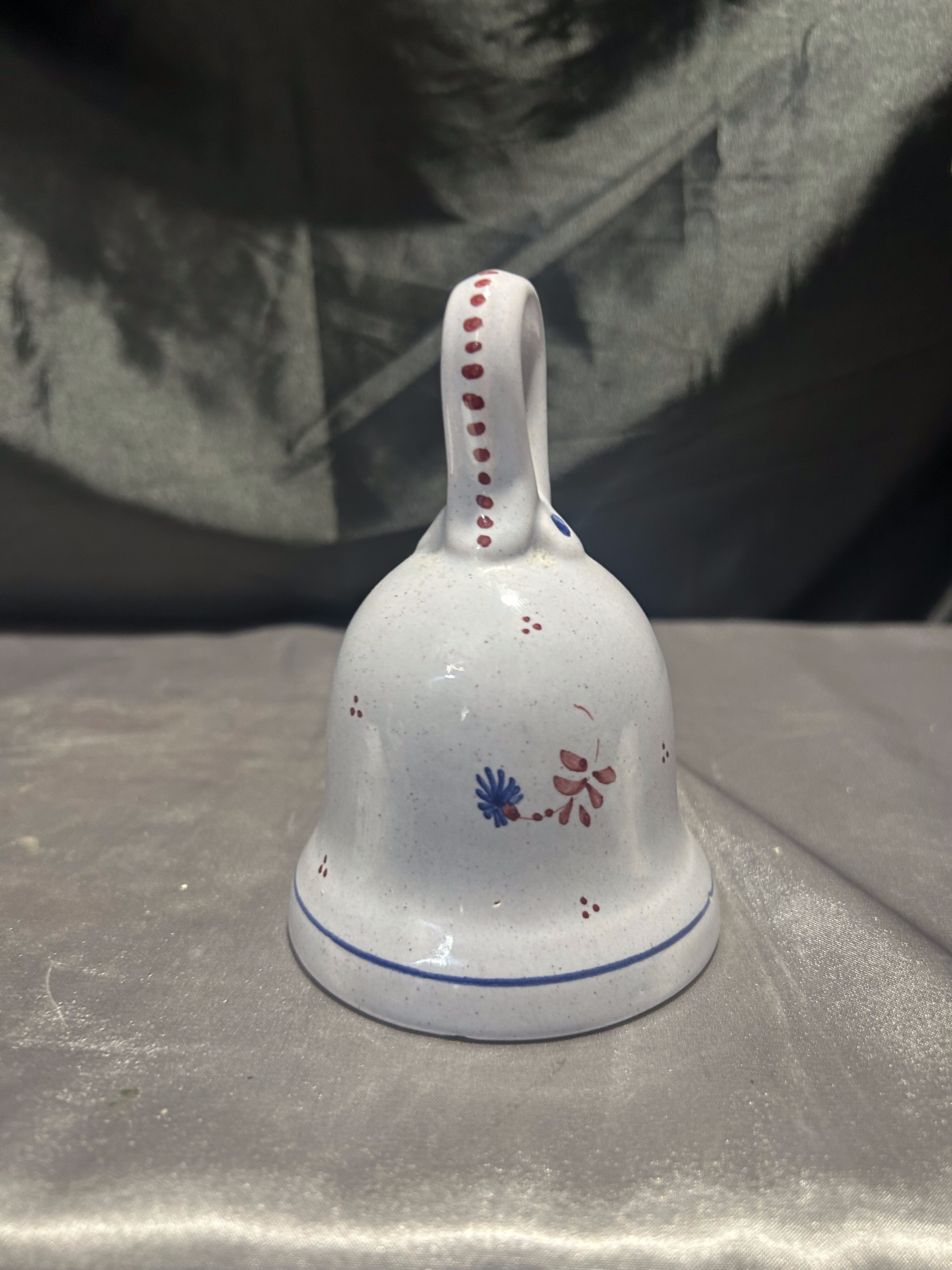 Subtelny, ręcznie malowany dzwonek ceramiczny z napisem „Taromina” – prawdopodobnie pamiątka z południa Europy. Wykonany z jasnej ceramiki o delikatnym nakrapianiu i ozdobiony drobnym kwiatowym motywem w tonacjach niebiesko-czerwonych.