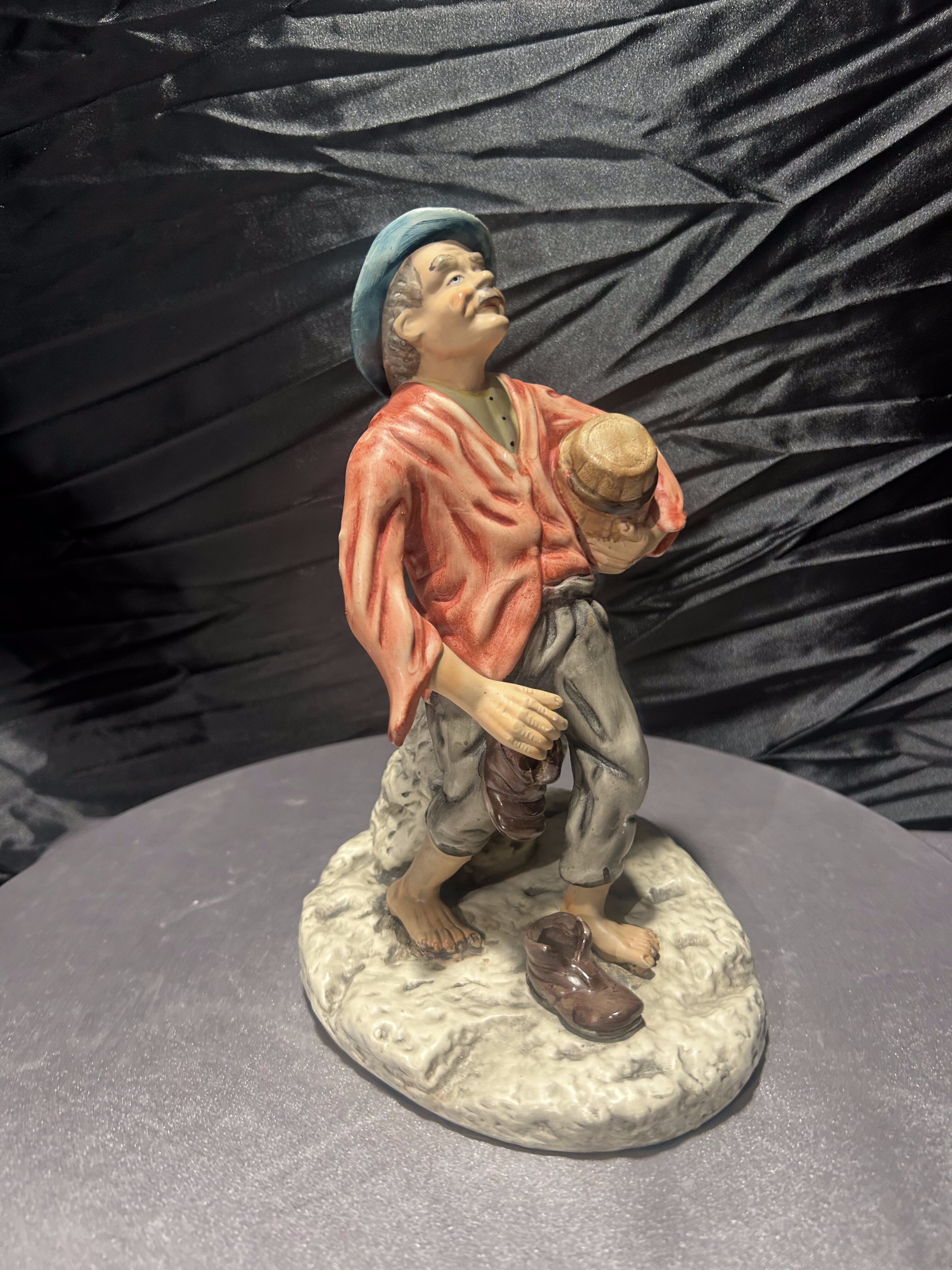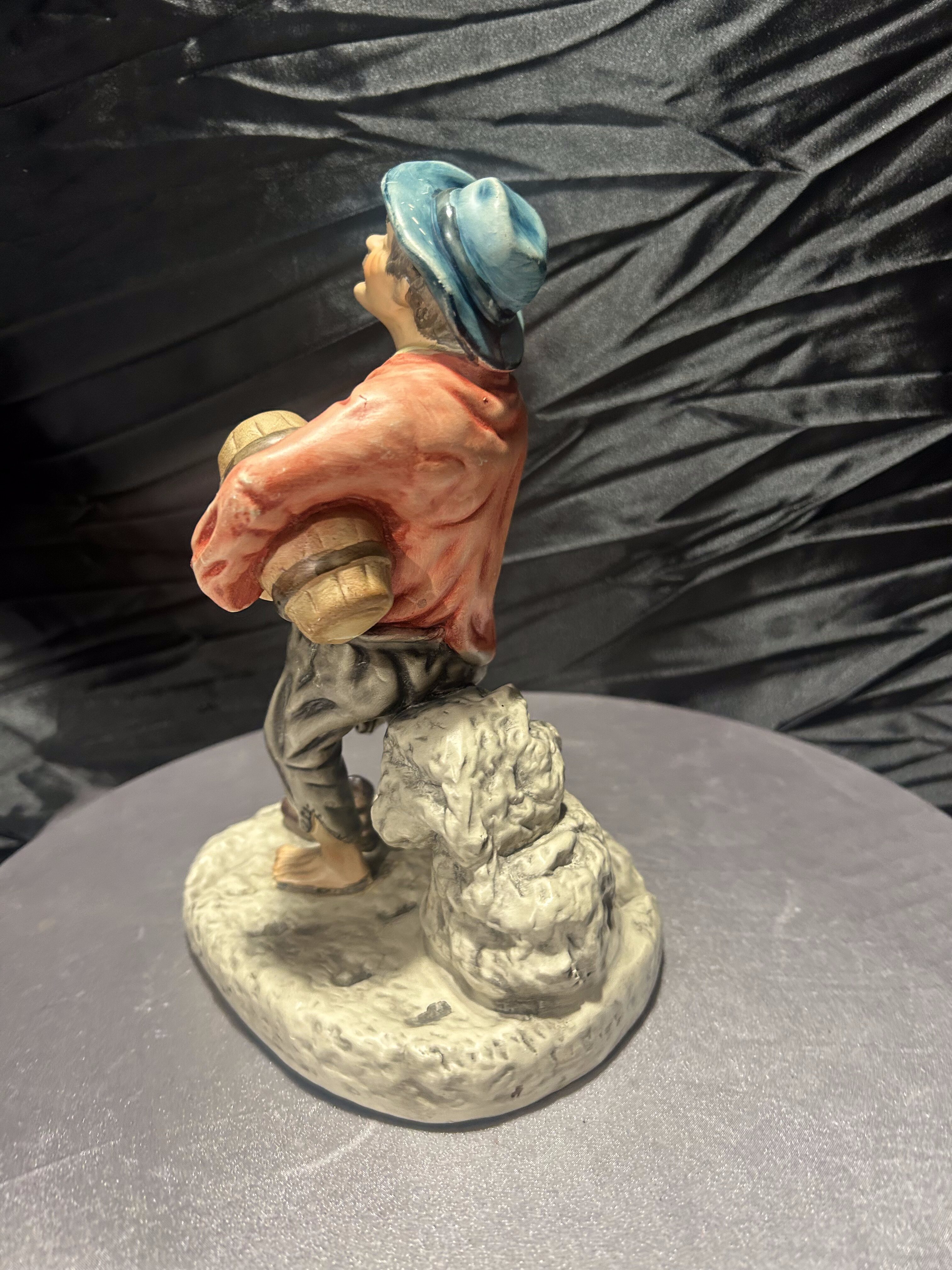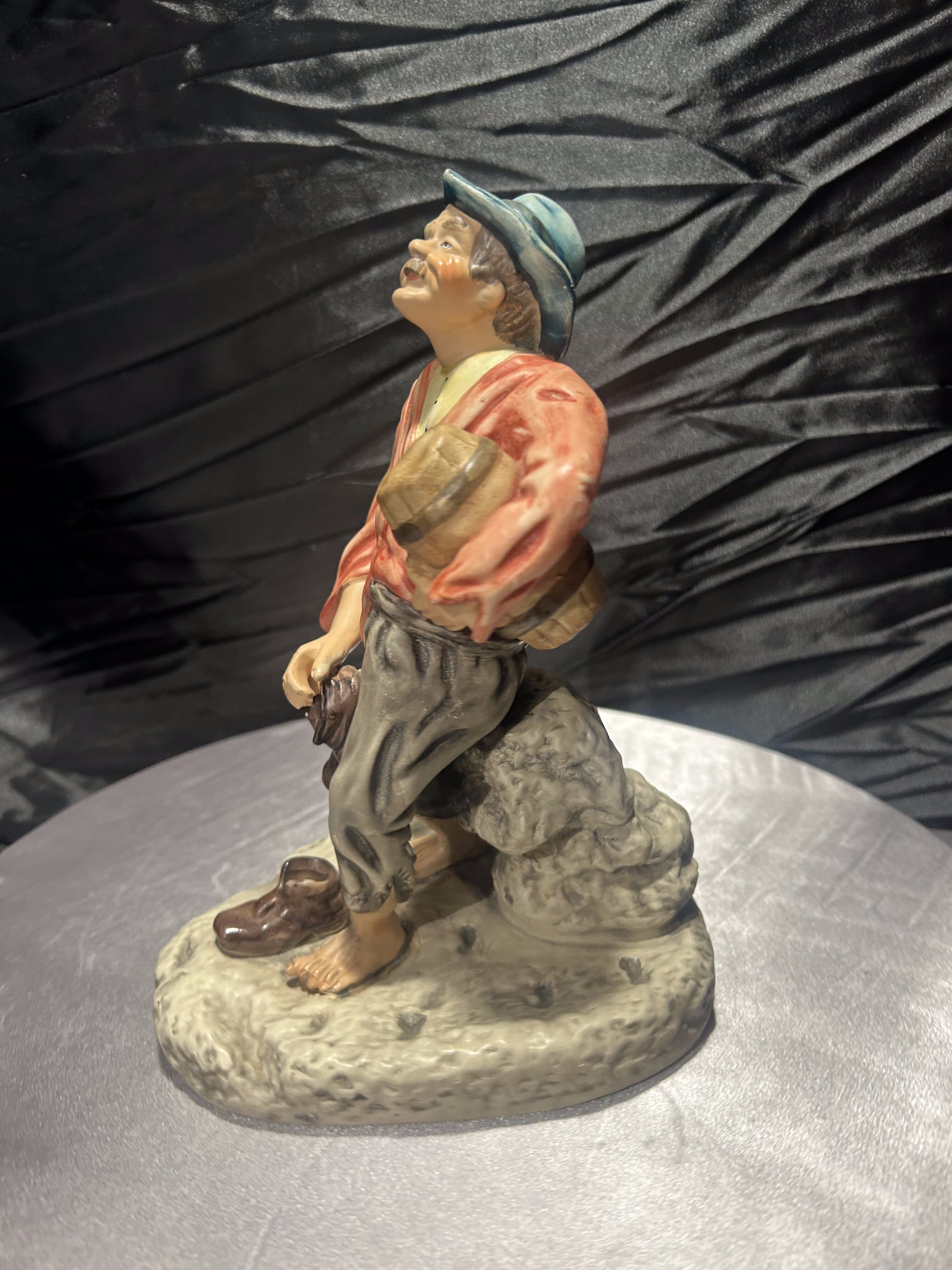 Kolorowa figurka ceramiczna przedstawiająca mężczyznę w czerwonej koszuli i niebieskim kapeluszu, niosącego beczkę pod pachą i buty w dłoni. Rzeźbiarsko opracowane detale, żywa kolorystyka oraz dynamiczna poza nadają całości wyjątkowego charakteru. Figurka przyciąga uwagę swoją ekspresją i humorem, a jednocześnie stanowi efektowny akcent dekoracyjny do wnętrza w stylu klasycznym lub kolekcjonerskim.