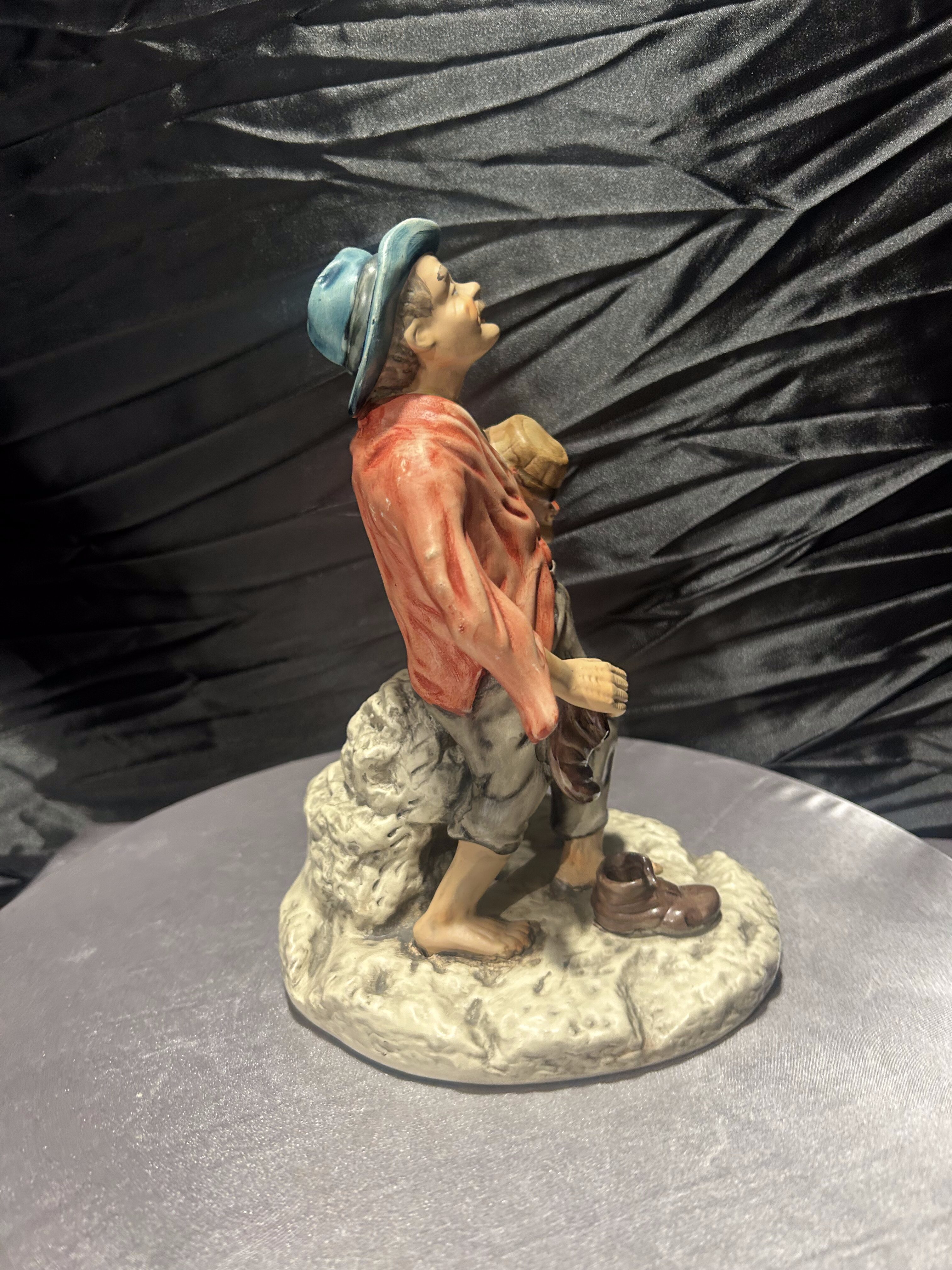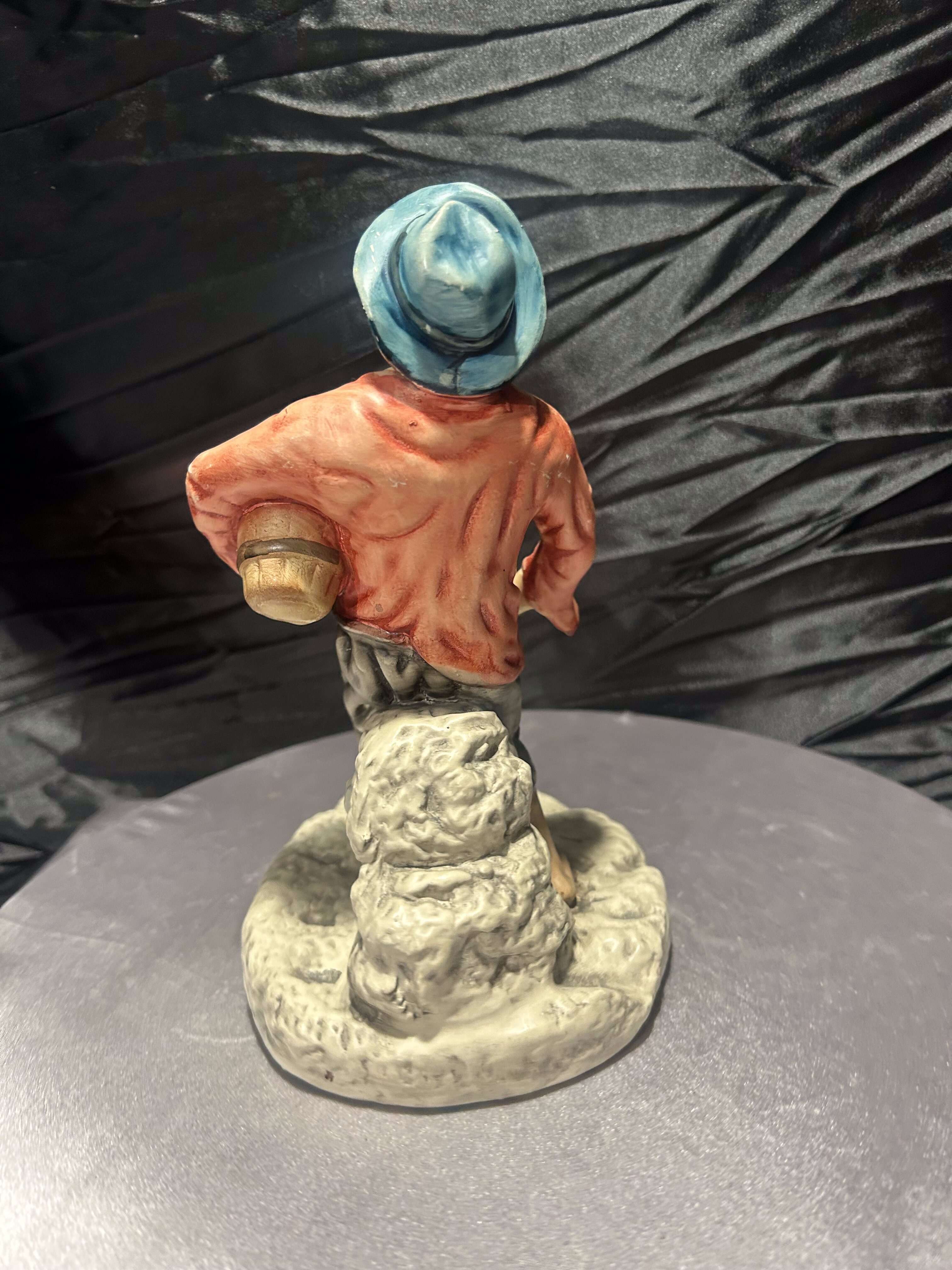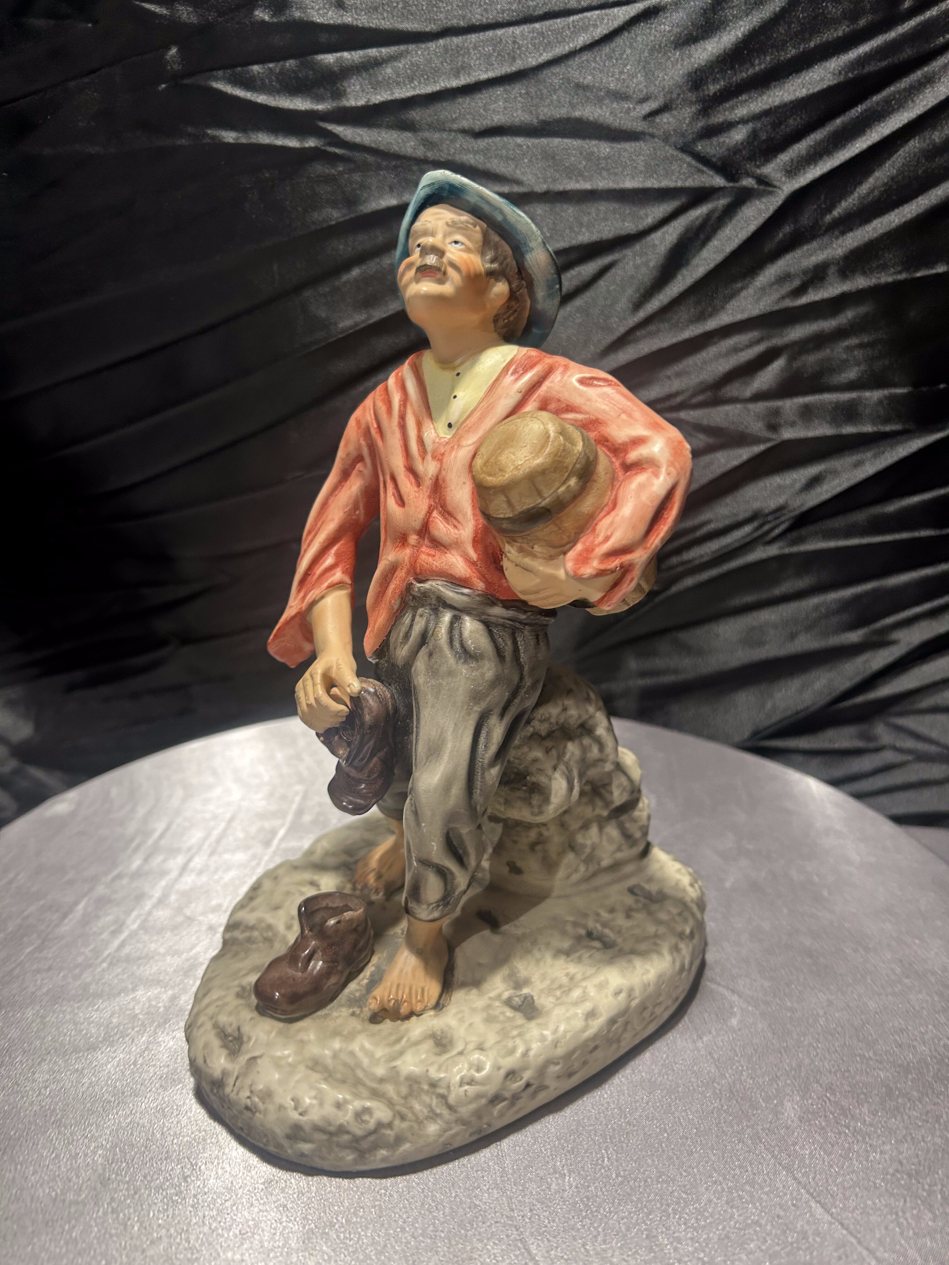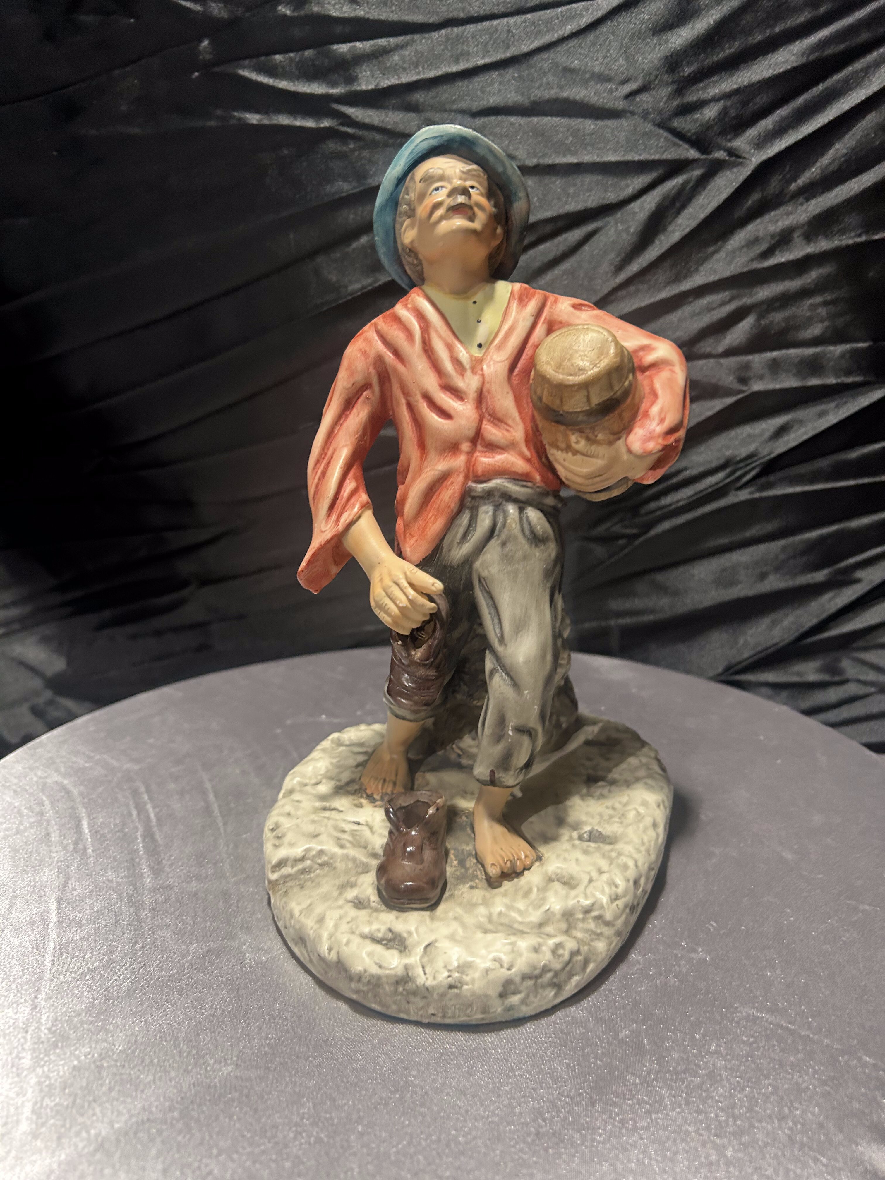 Kolorowa figurka ceramiczna przedstawiająca mężczyznę w czerwonej koszuli i niebieskim kapeluszu, niosącego beczkę pod pachą i buty w dłoni. Rzeźbiarsko opracowane detale, żywa kolorystyka oraz dynamiczna poza nadają całości wyjątkowego charakteru. Figurka przyciąga uwagę swoją ekspresją i humorem, a jednocześnie stanowi efektowny akcent dekoracyjny do wnętrza w stylu klasycznym lub kolekcjonerskim.