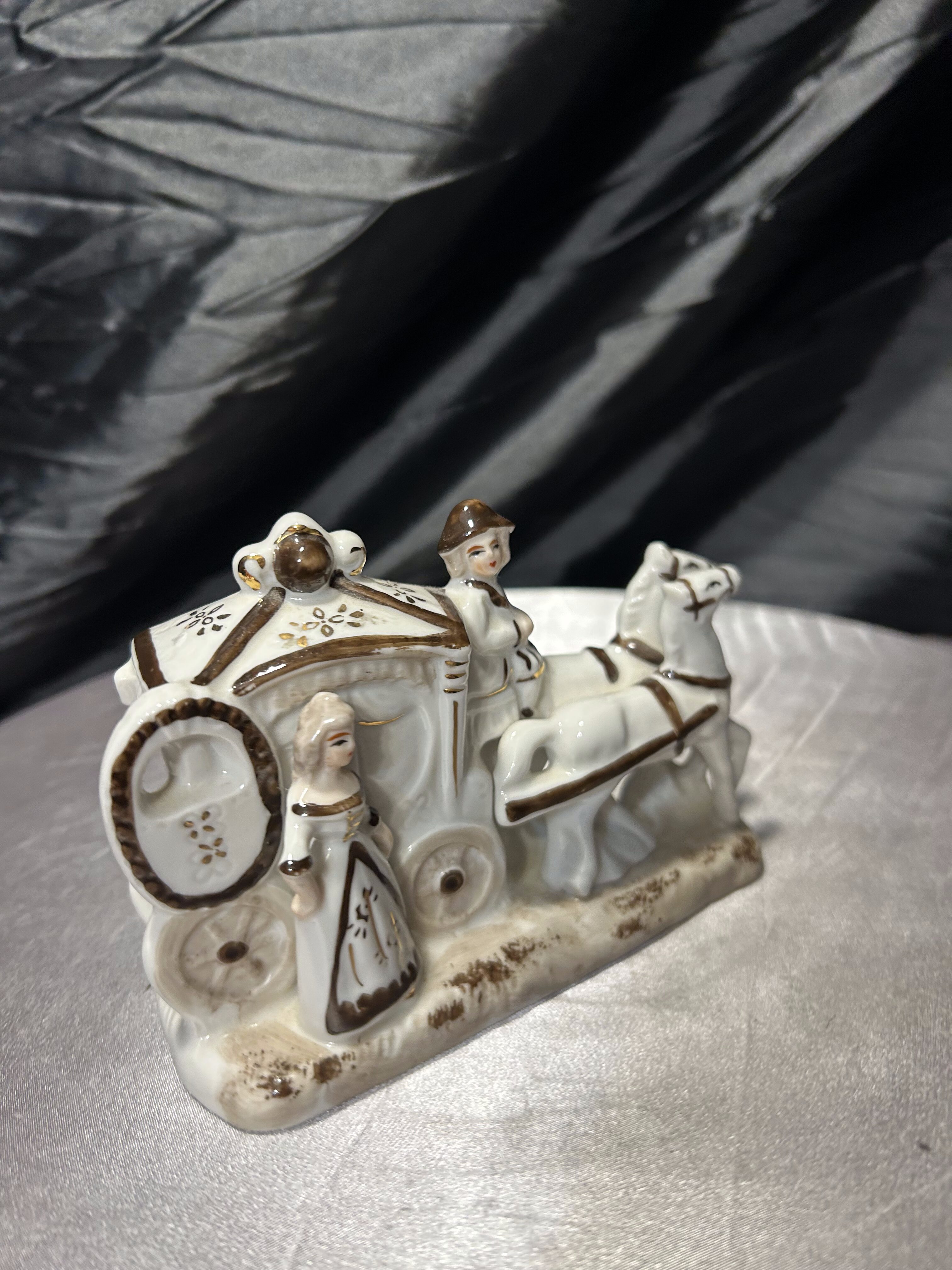 Elegancka figurka ceramiczna przedstawiająca scenę rodzajową z powozem, końmi, woźnicą oraz damą wsiadającą do pojazdu. Subtelna, klasyczna forma nawiązuje do stylistyki XIX-wiecznej, chętnie wykorzystywanej w skandynawskiej ceramice dekoracyjnej połowy XX wieku. Całość utrzymana w bieli z delikatnymi akcentami w odcieniach brązu i złota, nadającymi figurce szlachetnego charakteru.