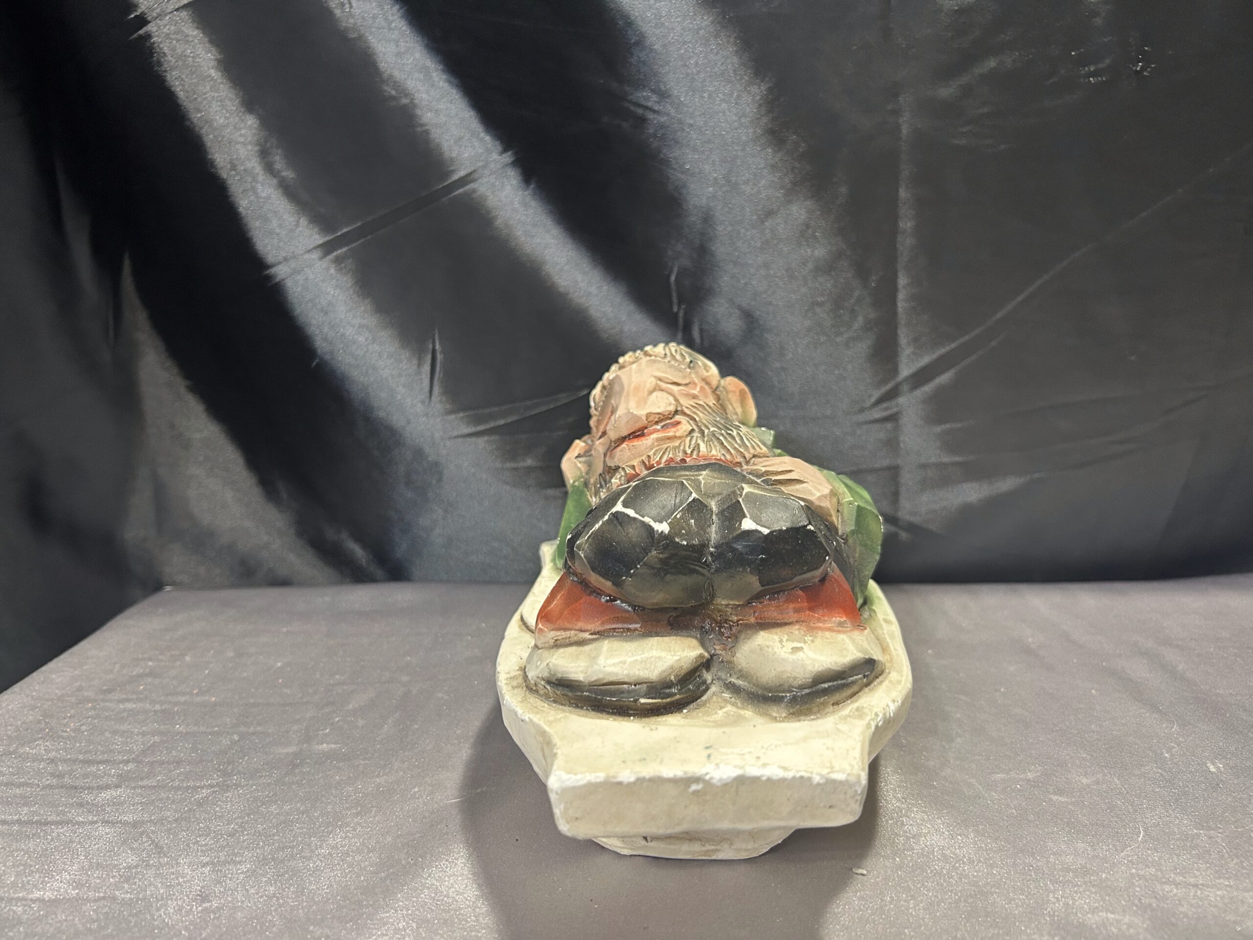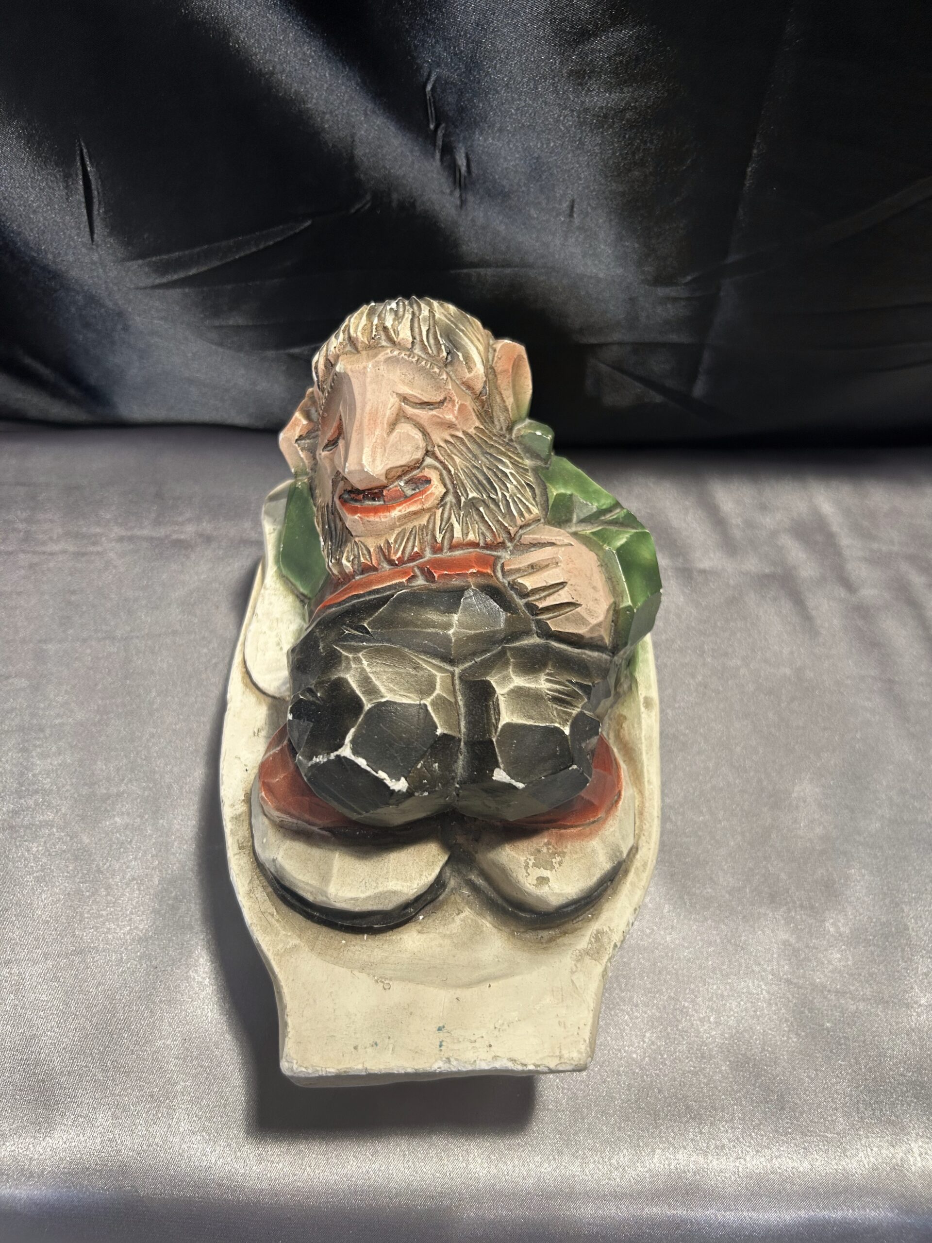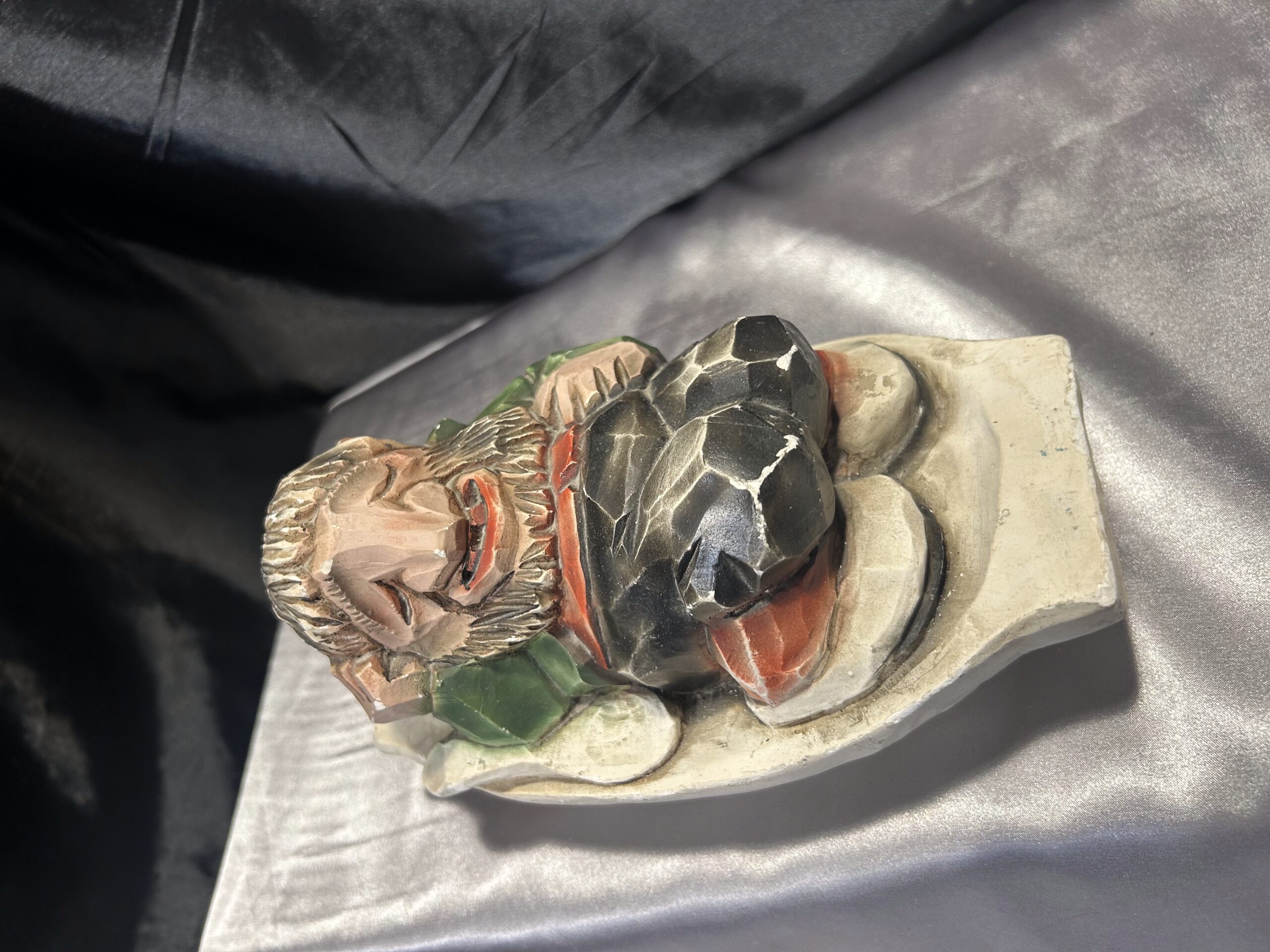 Przedstawiamy unikalną figurkę dziadka leżącego w łodzi, wykonaną z konglomeratu, lecz wyglądającą jak ciosana i ręcznie malowana rzeźba. Ten wyjątkowy przedmiot łączy w sobie rustykalny charakter z artystycznym wykończeniem, co czyni go interesującym elementem dekoracyjnym.