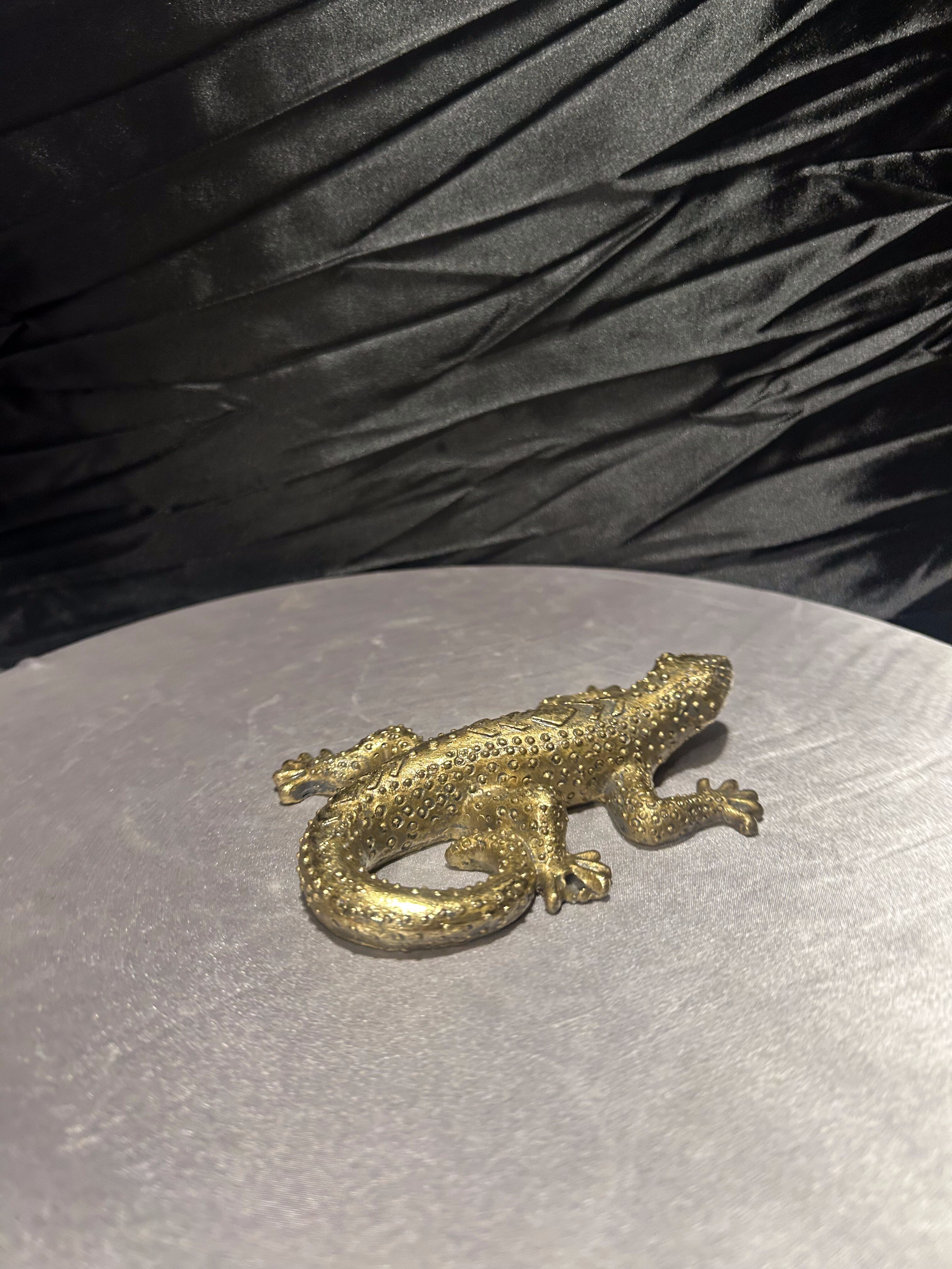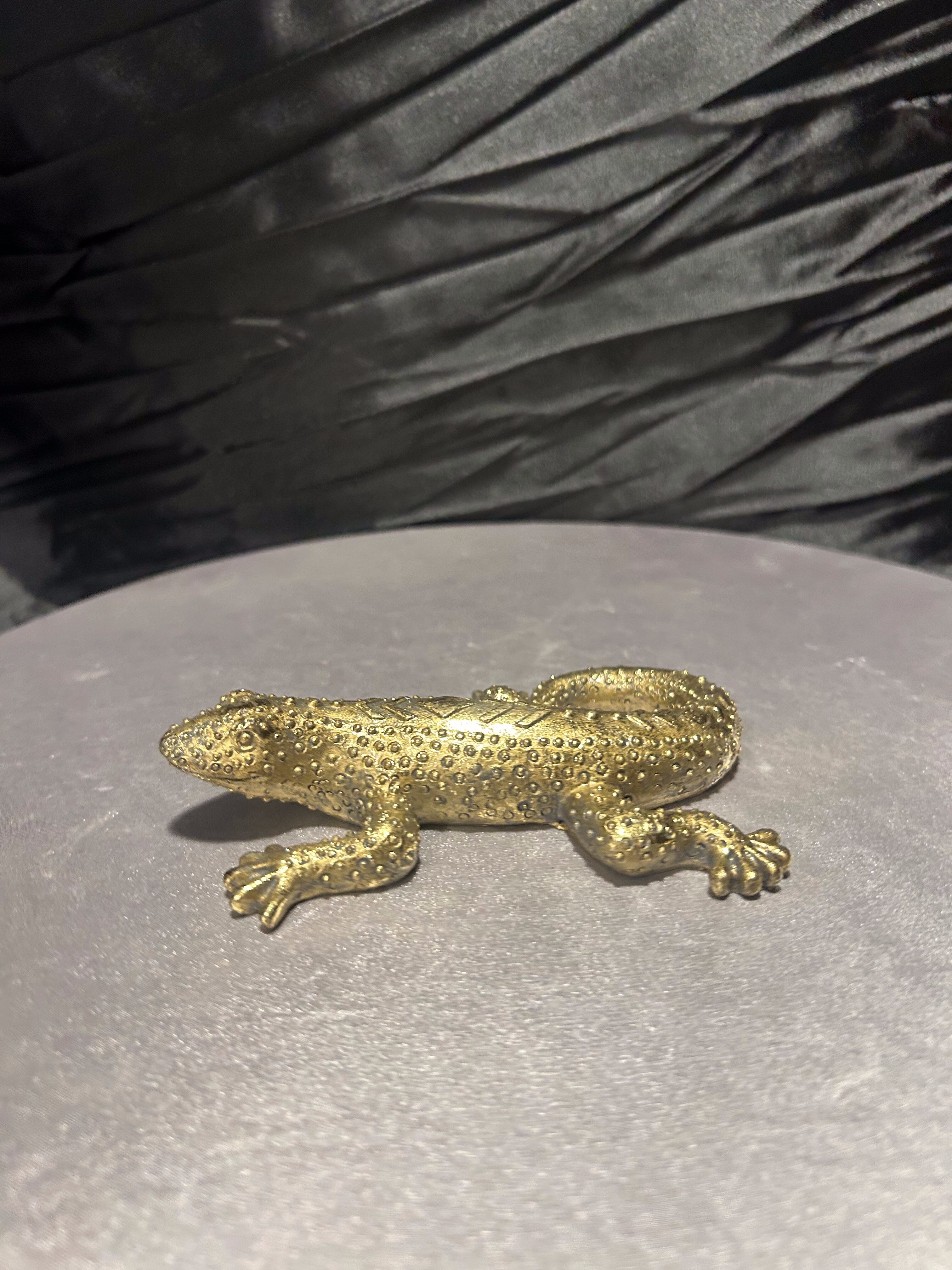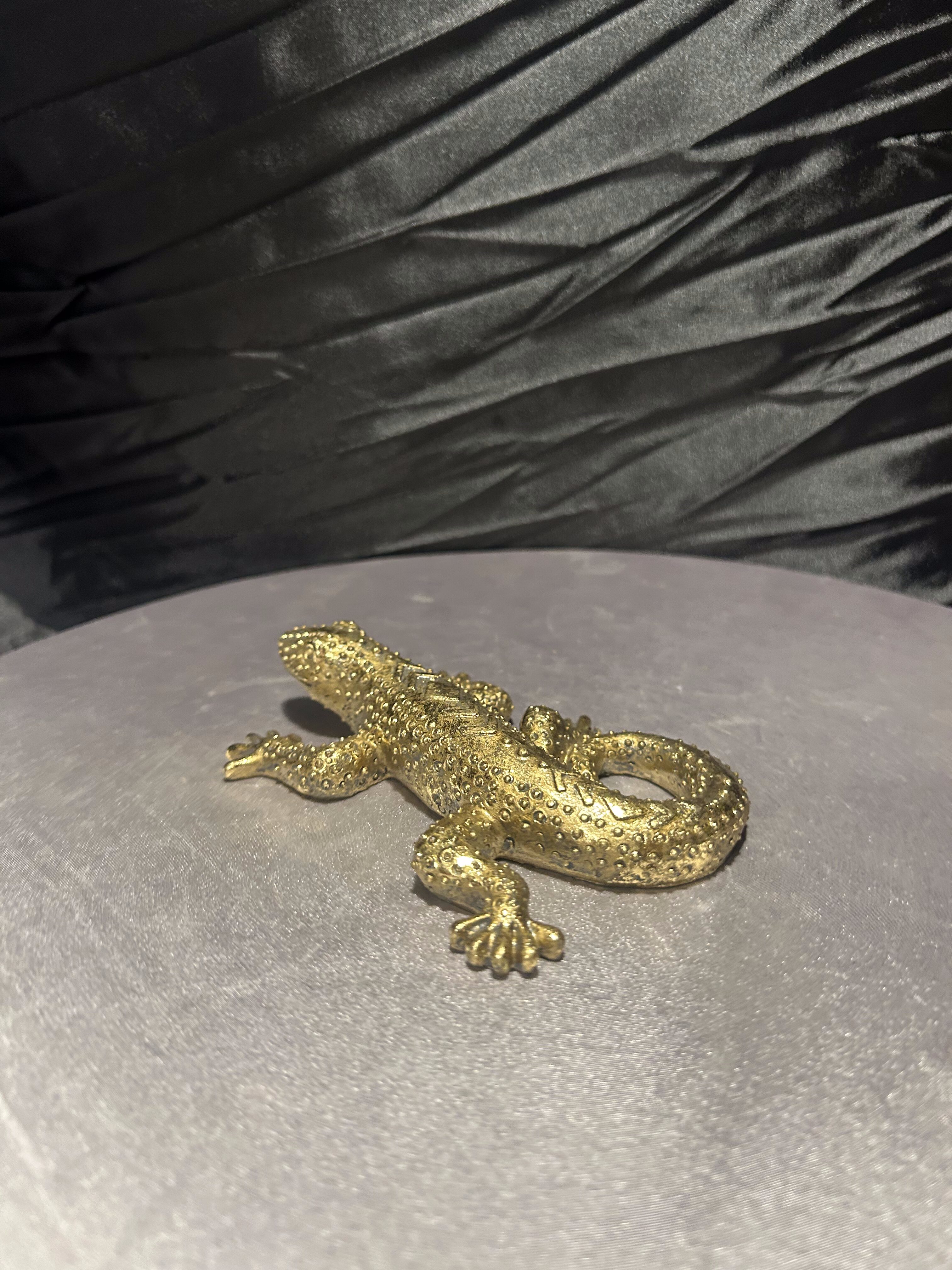 Ozdobna figurka przedstawiająca jaszczurkę w kolorze złotym. Realistycznie odwzorowane detale, takie jak łuski, pazurki i kształt sylwetki, nadają jej wyjątkowego charakteru i sprawiają, że stanowi atrakcyjny element dekoracyjny.