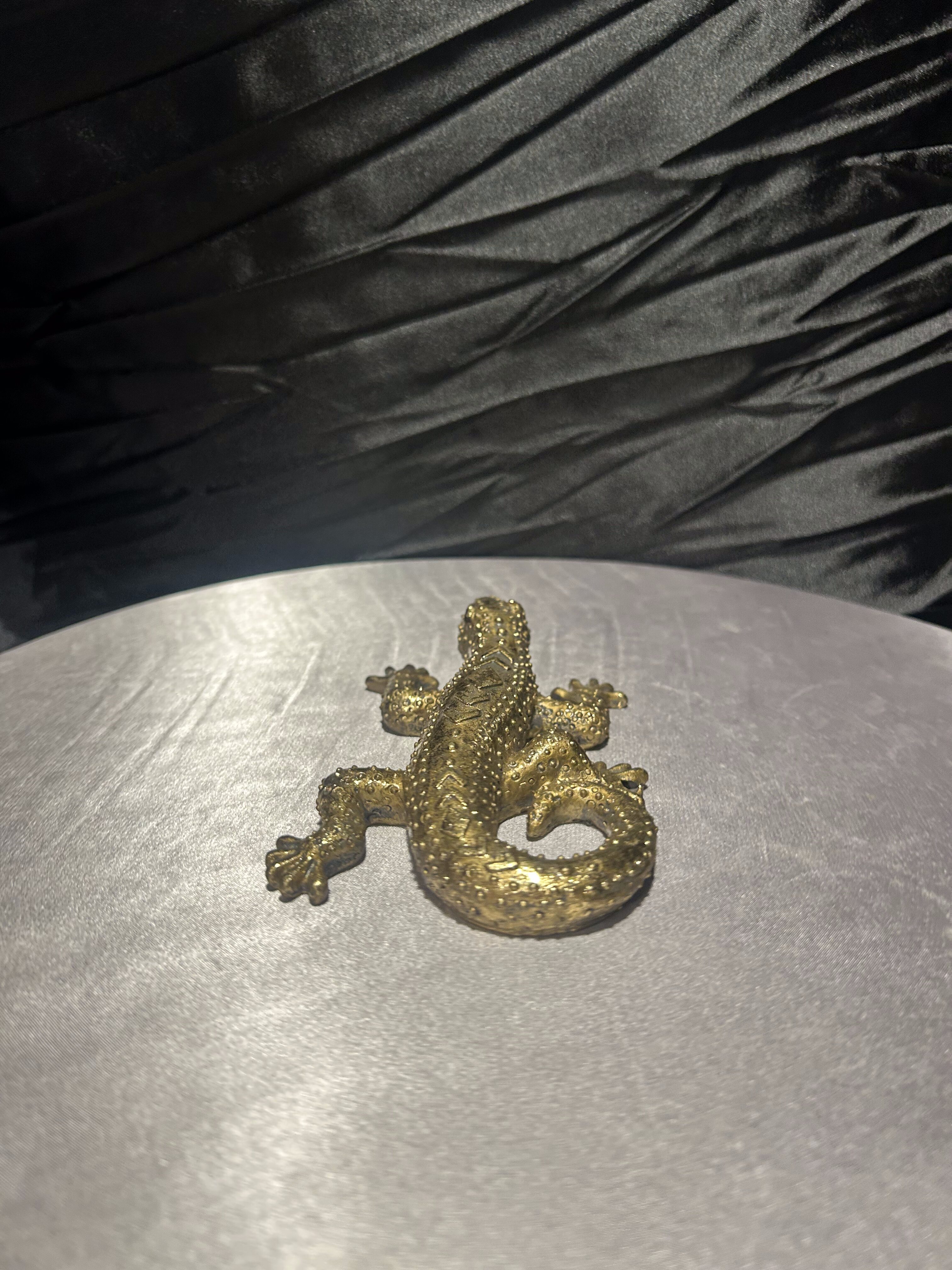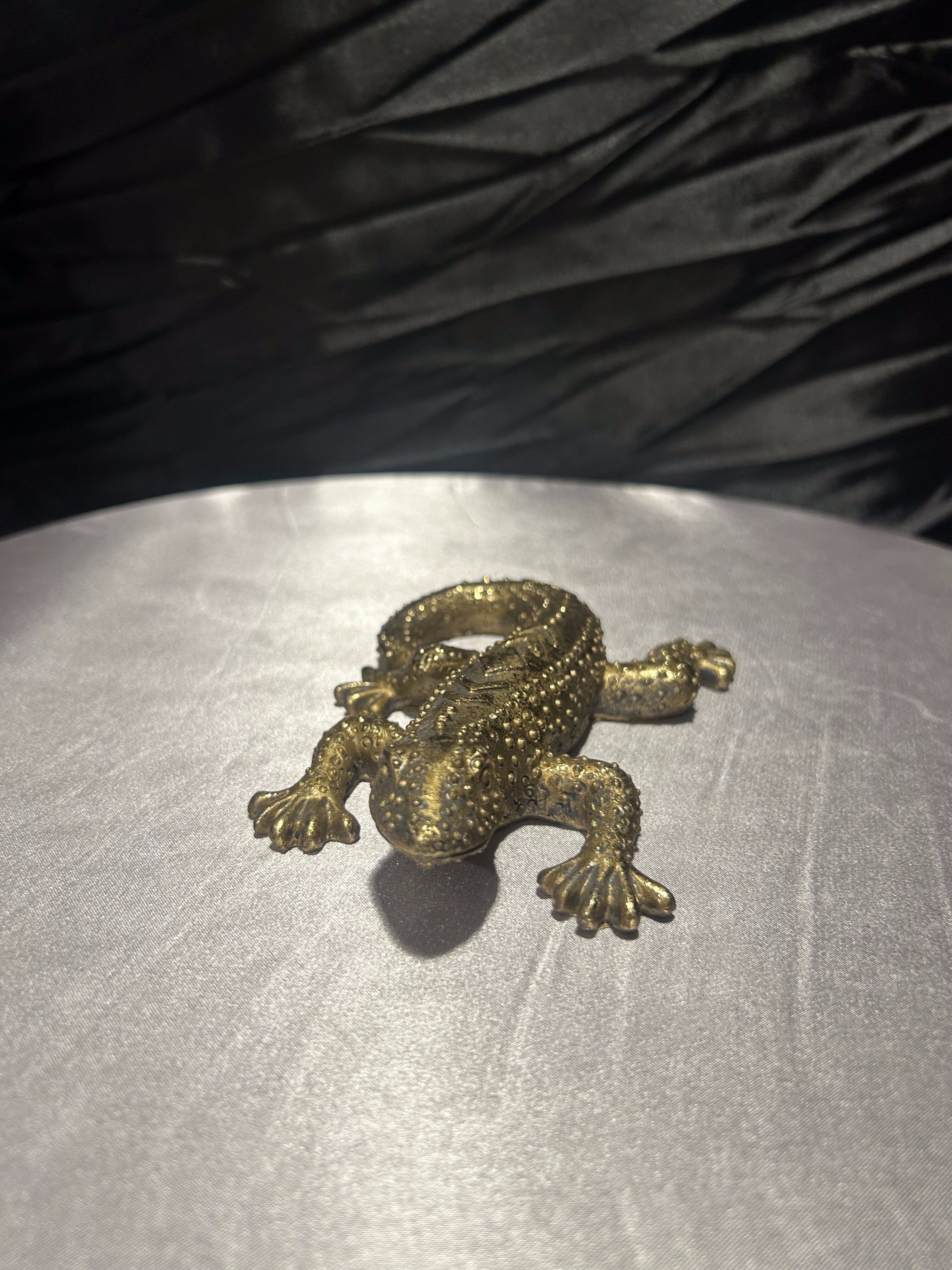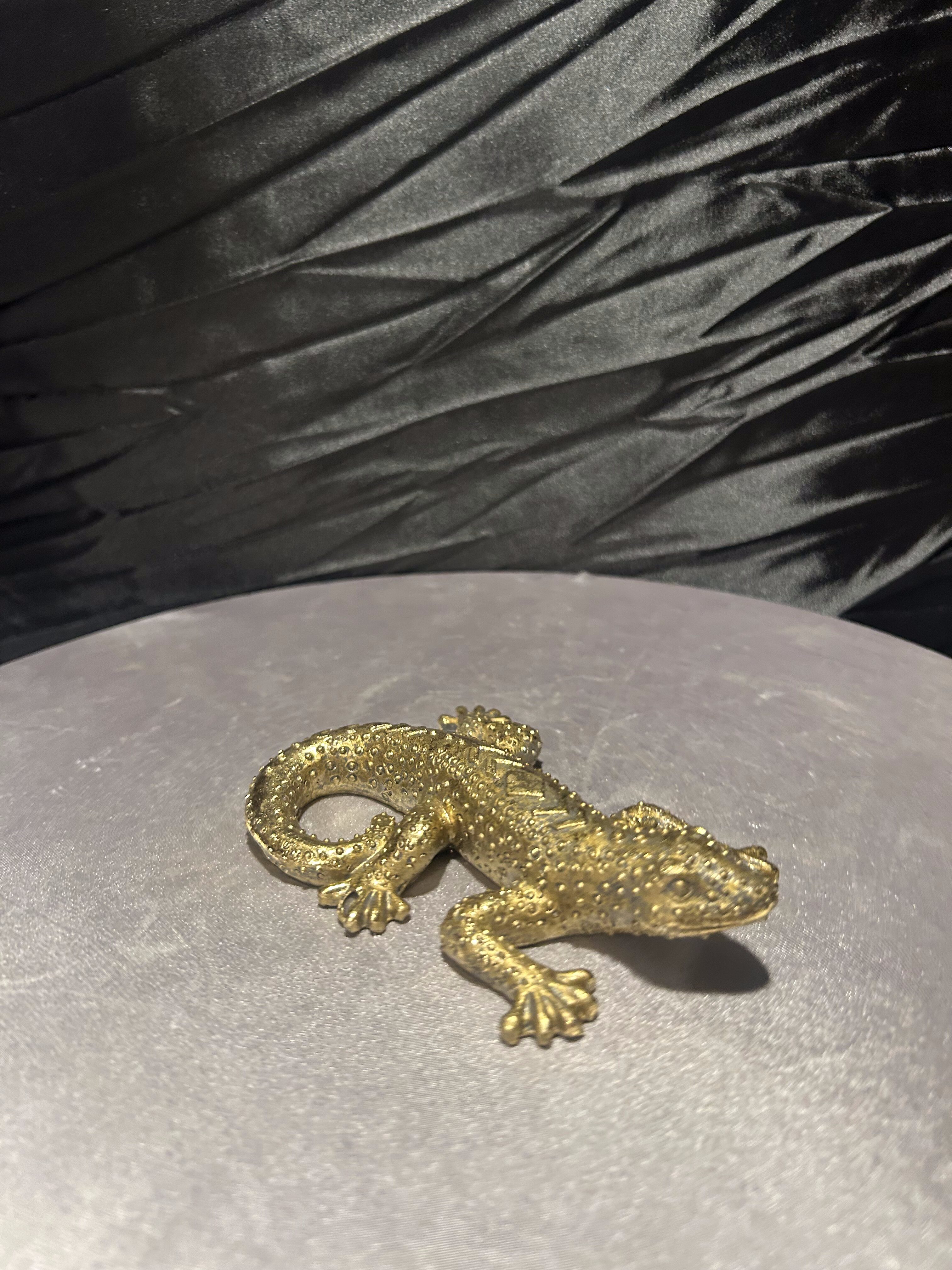 Ozdobna figurka przedstawiająca jaszczurkę w kolorze złotym. Realistycznie odwzorowane detale, takie jak łuski, pazurki i kształt sylwetki, nadają jej wyjątkowego charakteru i sprawiają, że stanowi atrakcyjny element dekoracyjny.