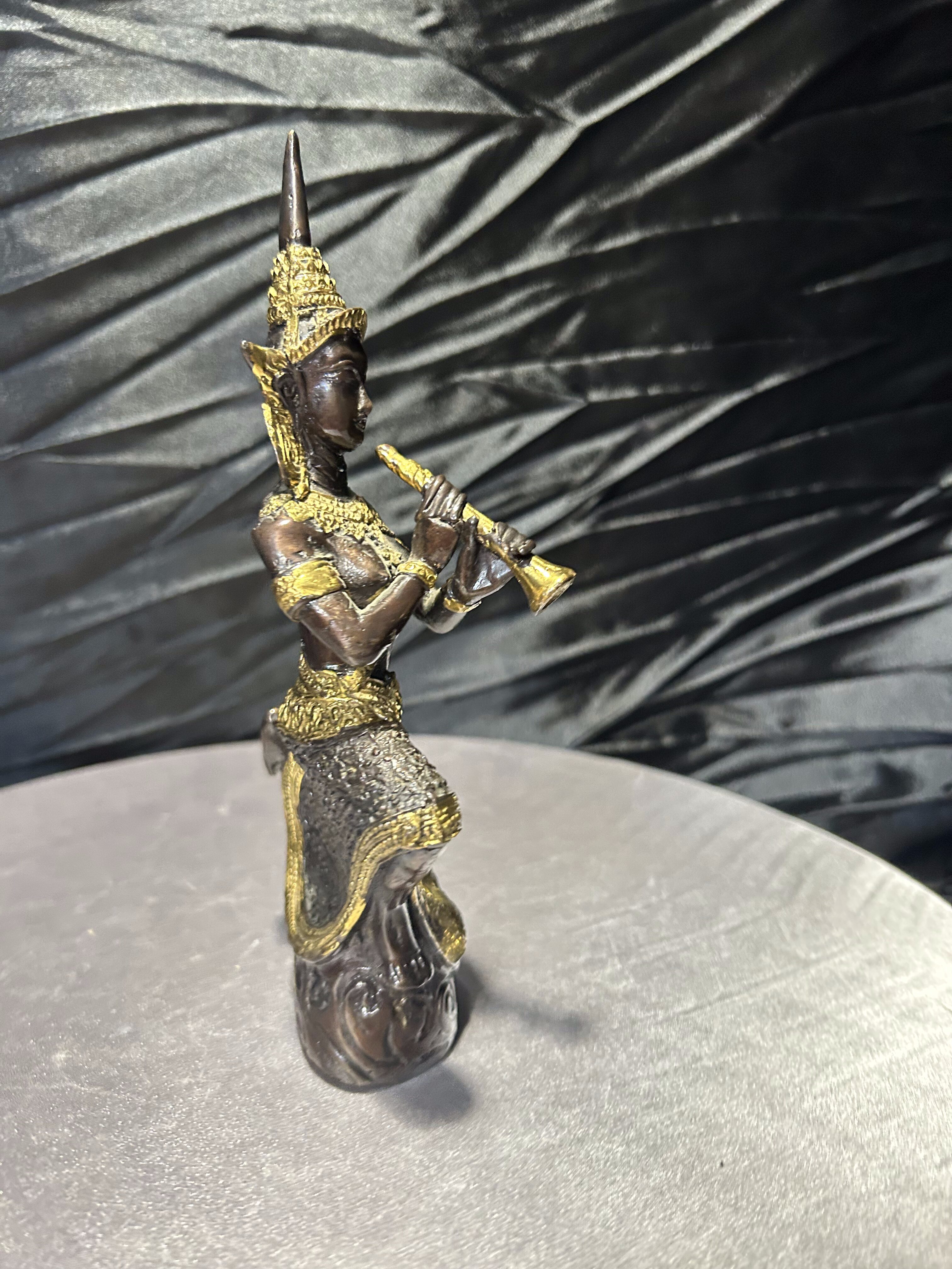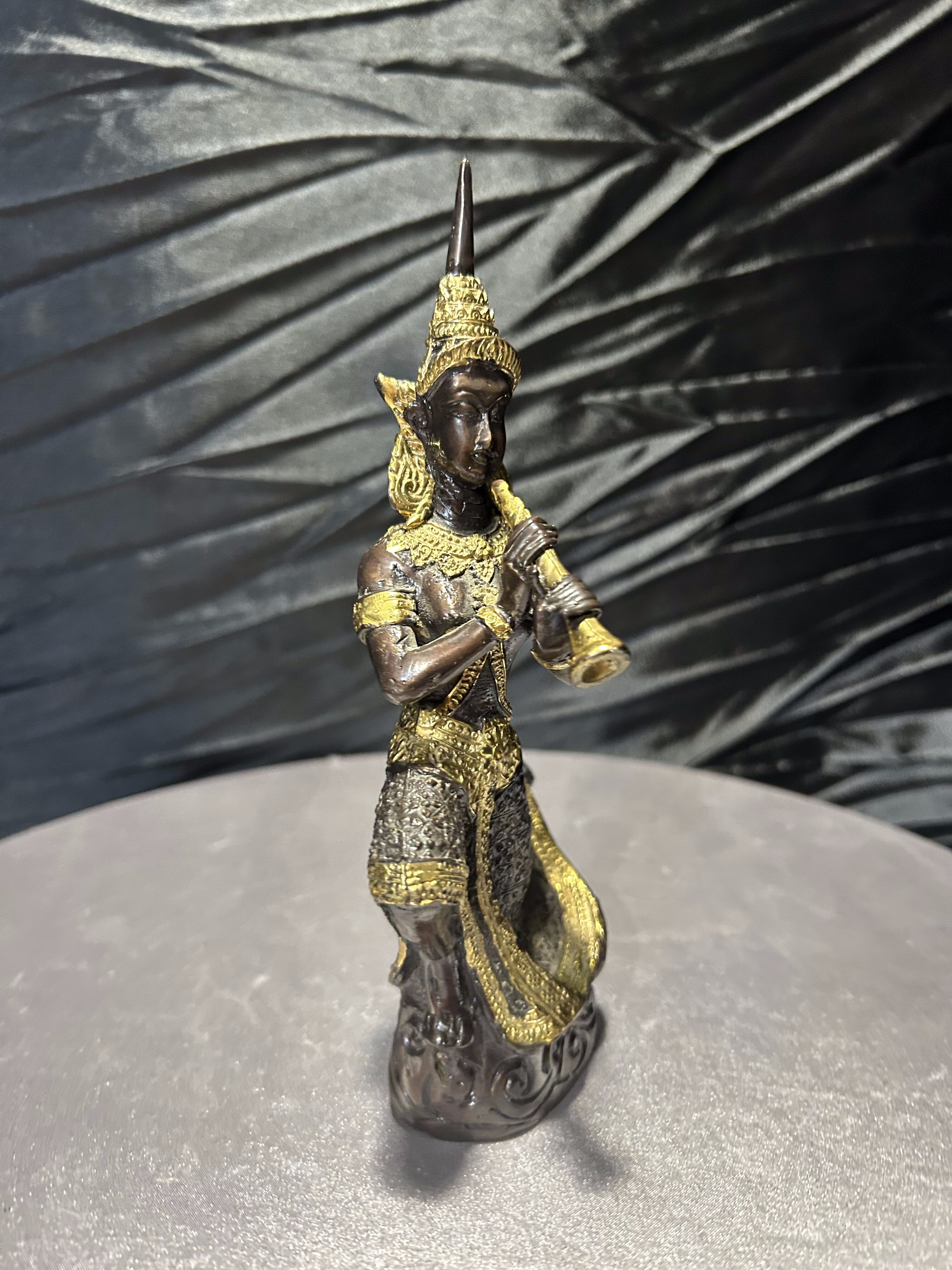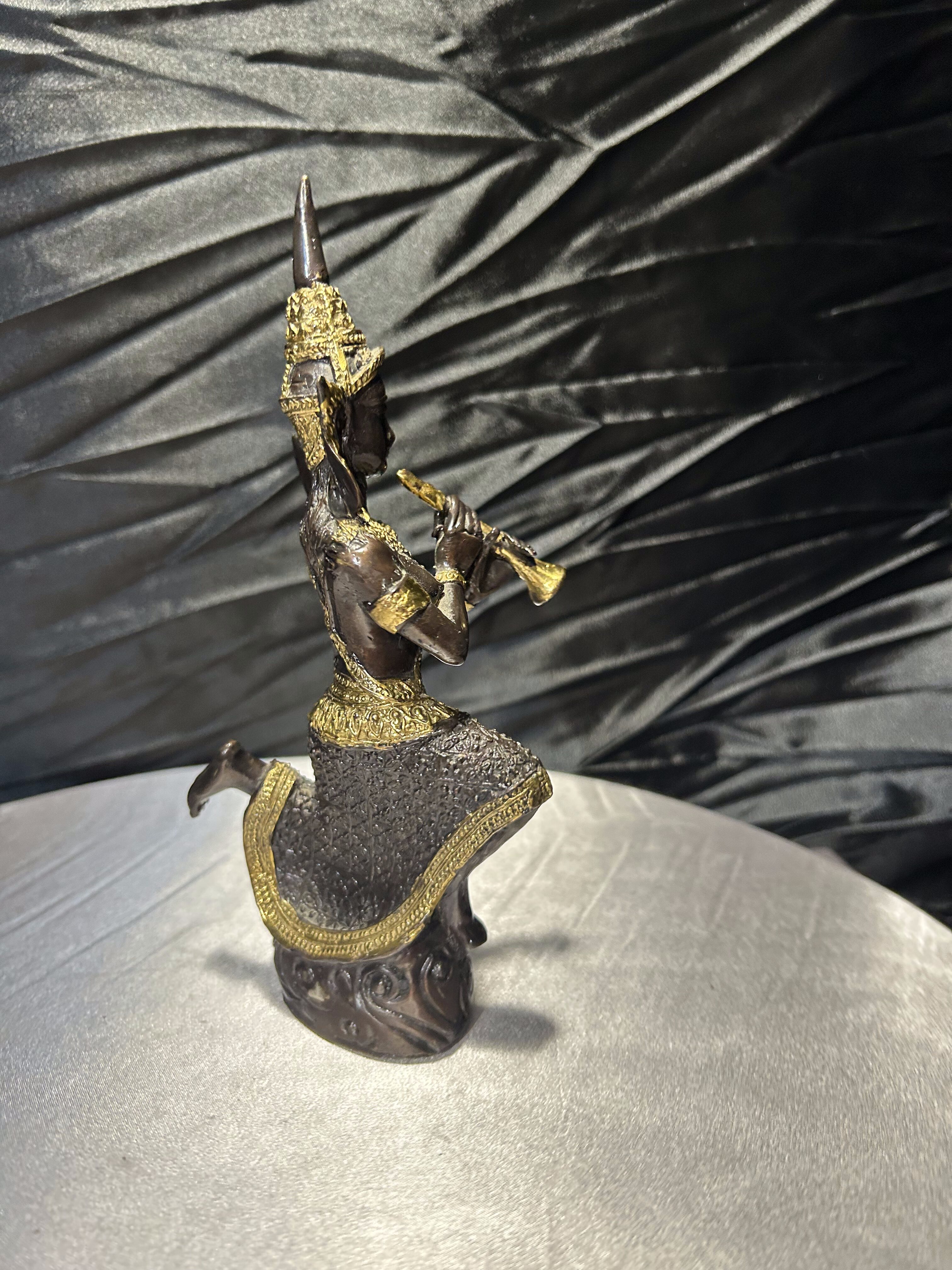 Postać została ukazana w dynamicznej pozie tanecznej, trzymając tradycyjny instrument dęty, co przywodzi na myśl dworskie przedstawienia i rytuały. Na głowie widoczny jest wysoki, spiczasty hełm chada, a całość stroju została wzbogacona złoceniami, typowymi dla sztuki królewskiej Tajlandii.