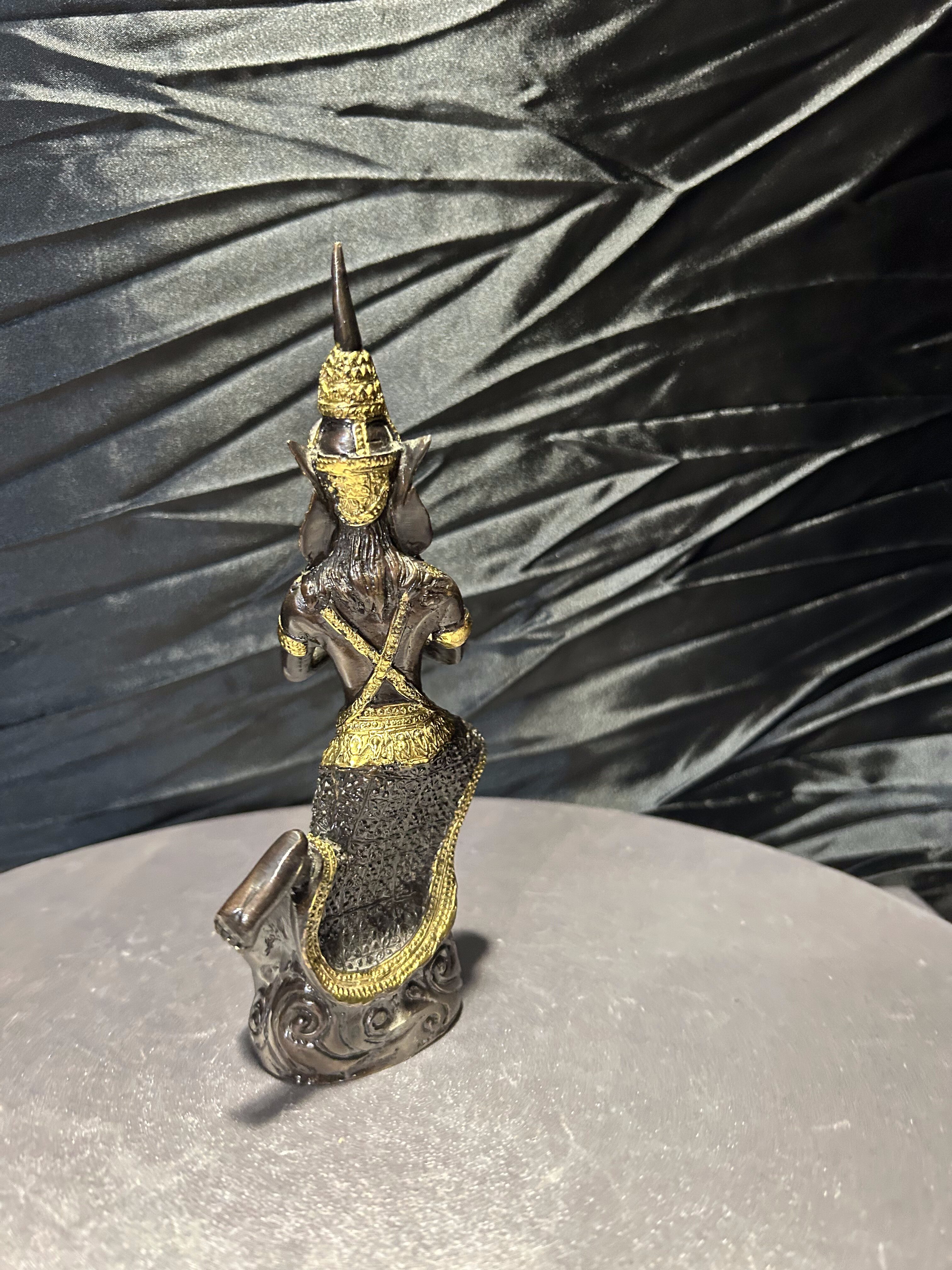 Wyjątkowa figurka z mosiądzu przedstawiająca postać kinnari – mitycznej istoty z tajskiej mitologii, będącej połączeniem kobiety i ptaka. W kulturze Tajlandii kinnari symbolizuje wdzięk, piękno oraz harmonię, a jej wizerunki często zdobią świątynie i królewskie pałace.